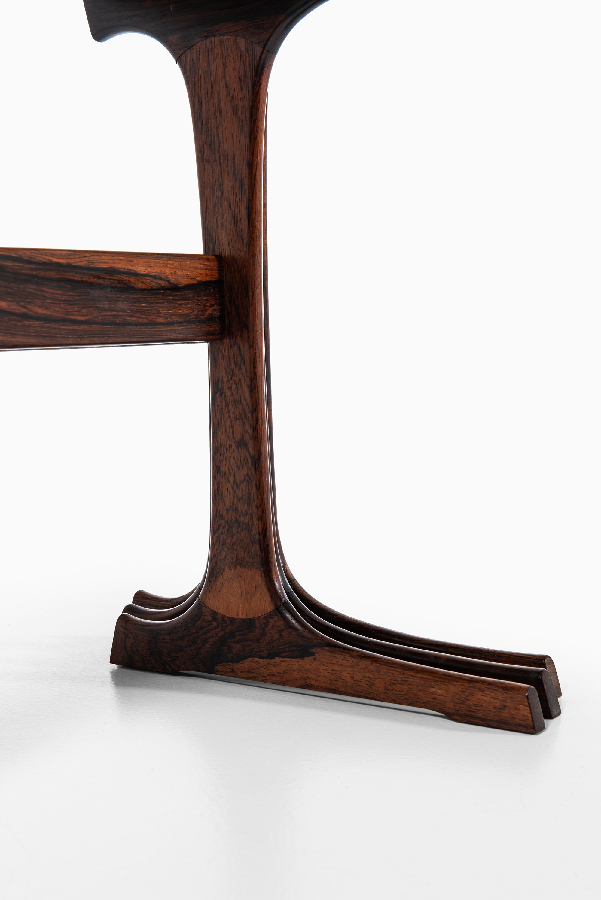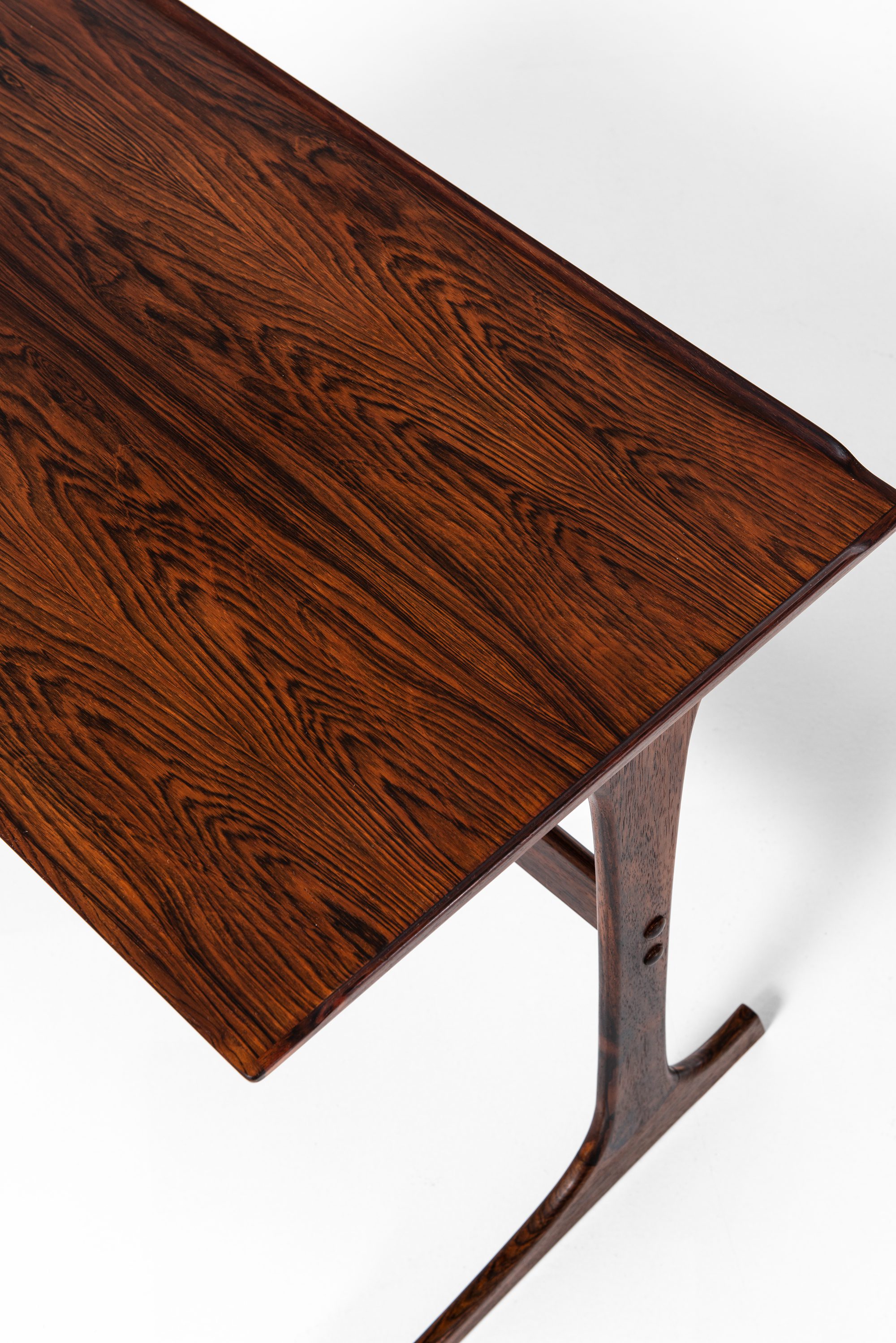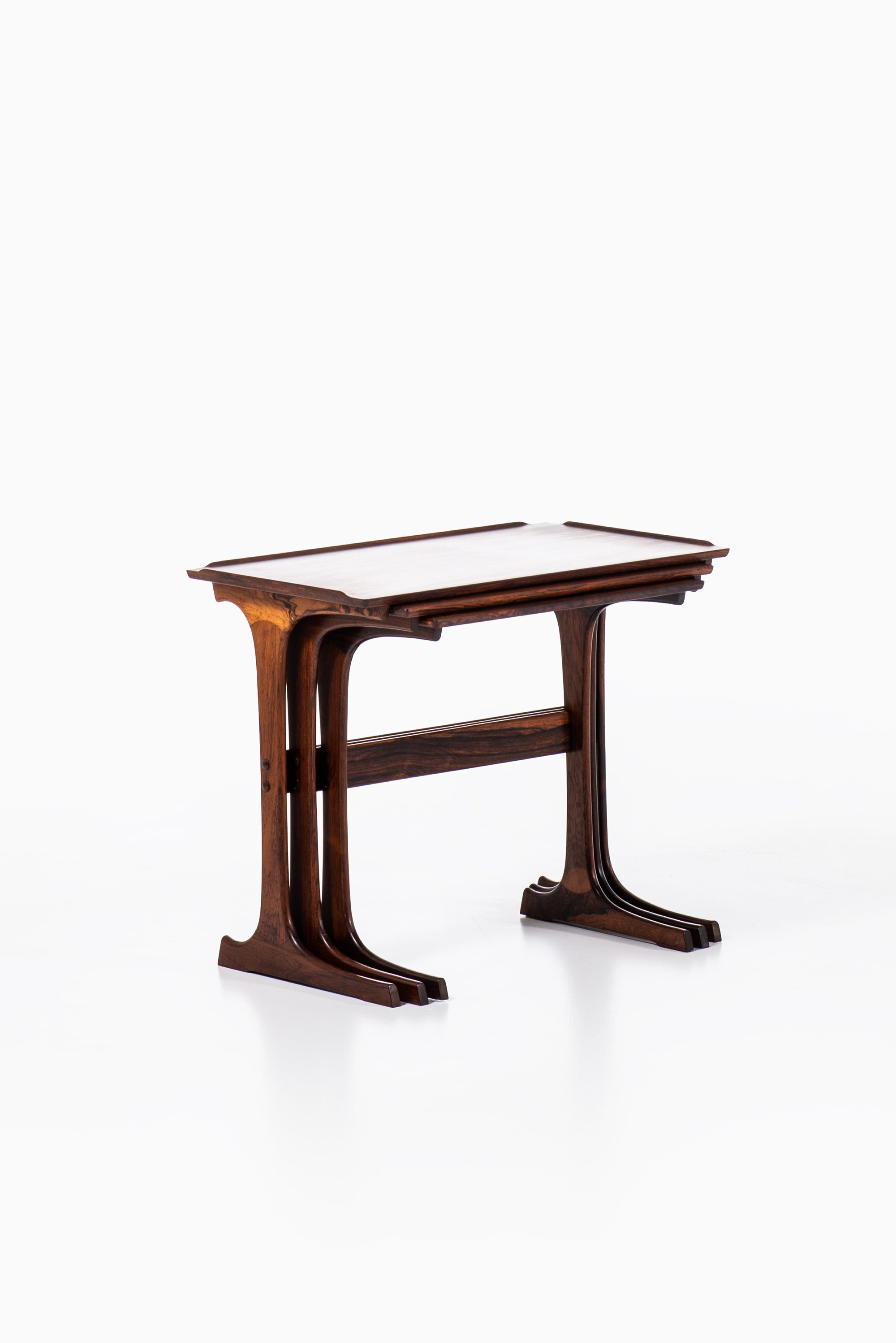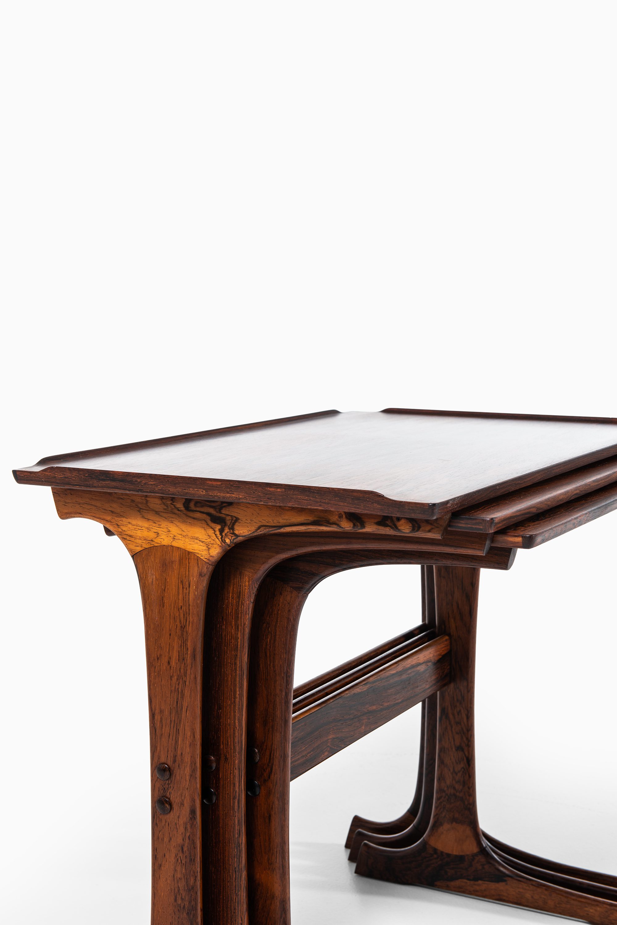 This rare set of nesting tables was designed by Johannes Andersen and produced by CFC Silkeborg in Denmark during the 1960s. The tables are executed in rosewood, a material widely used in Scandinavian mid-century furniture for its durability and richly figured grain. The surfaces display warm brown tones with darker streaks, enhancing the sculptural qualities of the design. Each table is designed to fit seamlessly under the next, creating a flexible and space-saving solution typical of the era.