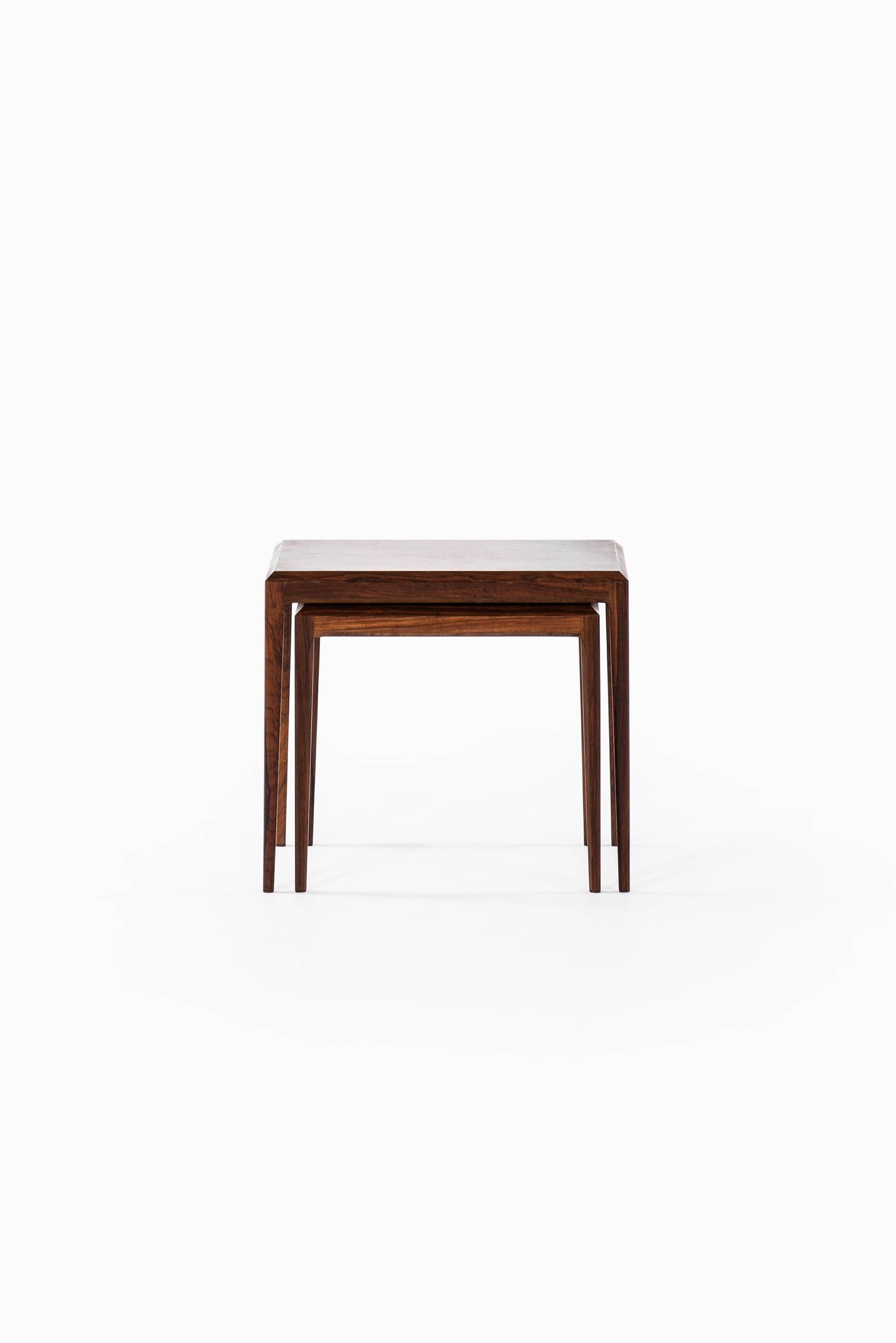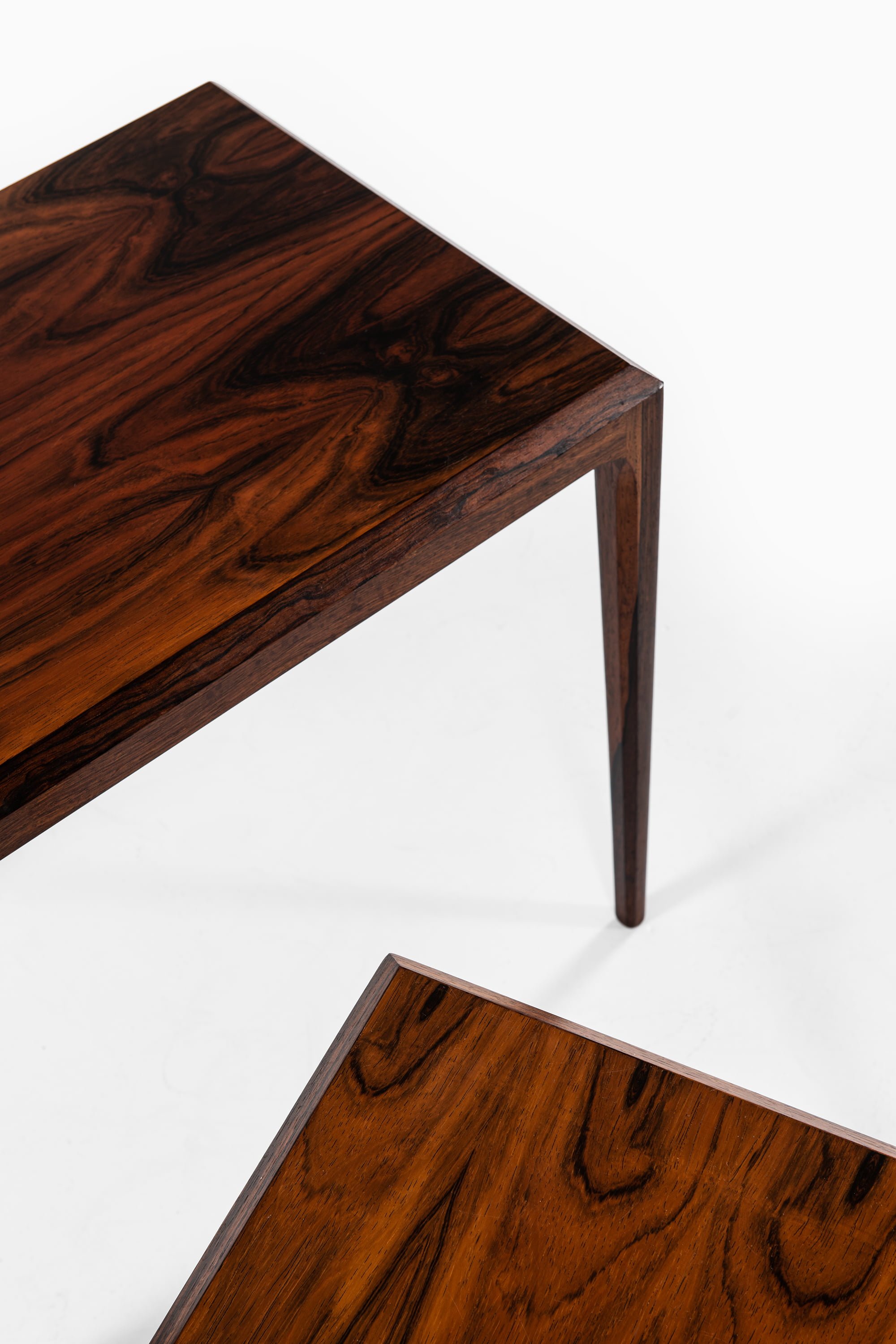 Crafted from rich rosewood, these tables display the depth and warmth typical of mid-century Danish furniture. The natural grain of the wood runs fluidly across the surfaces, showcasing the organic patterns that make rosewood so highly prized. The tables feature gently tapered legs and precise joinery, reflecting Andersen’s focus on elegant proportions and technical perfection. Their nesting construction offers flexible functionality — they can be arranged individually or stacked together to save space.
