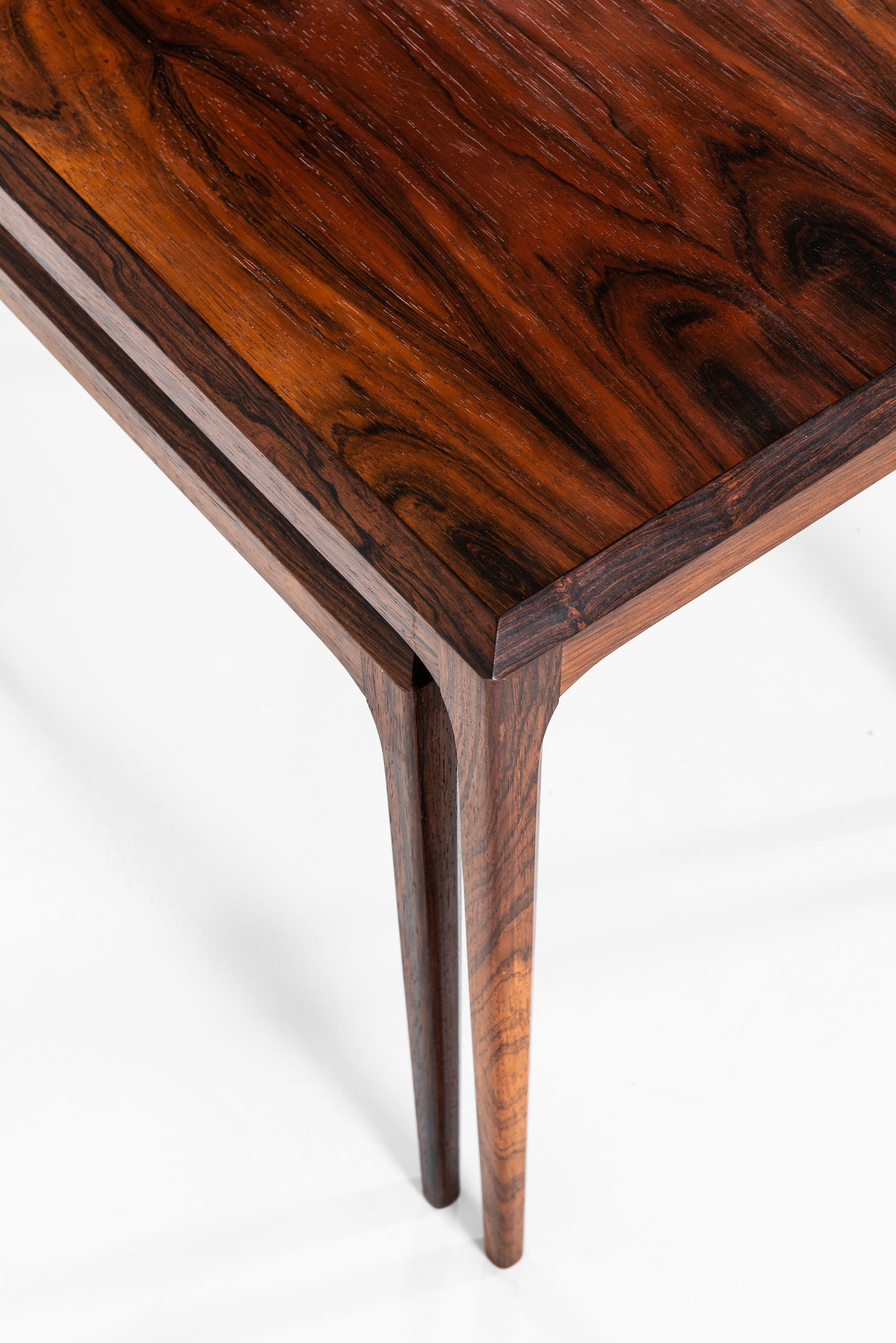 This elegant set of nesting tables was designed by Danish furniture designer Johannes Andersen and produced by CFC Silkeborg in Denmark during the 1960s. Andersen was known for his refined approach to Scandinavian modernism, characterized by sculptural lines, seamless joinery, and a dedication to craftsmanship. His work often combined functional simplicity with graceful detailing, making his designs both practical and visually striking.