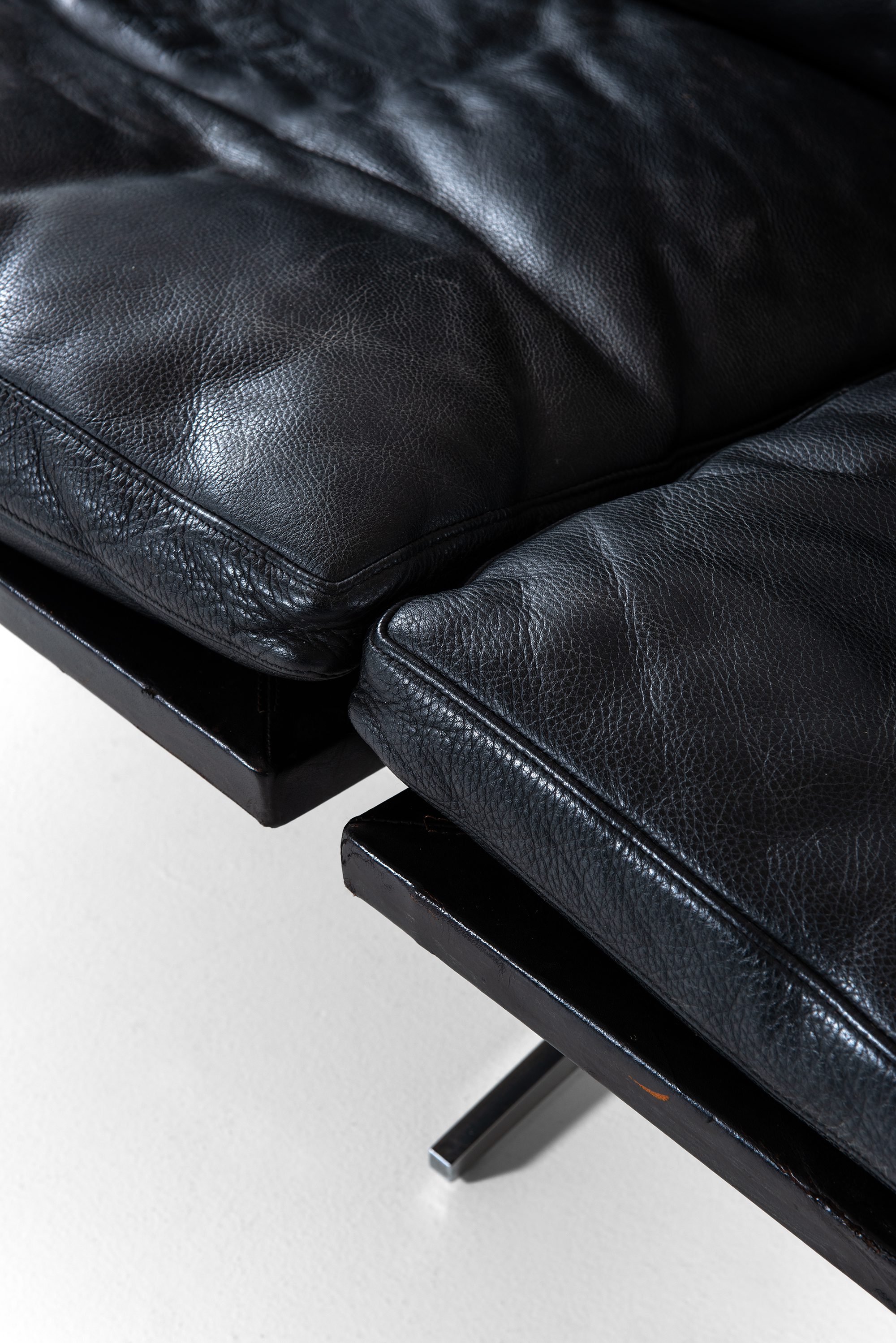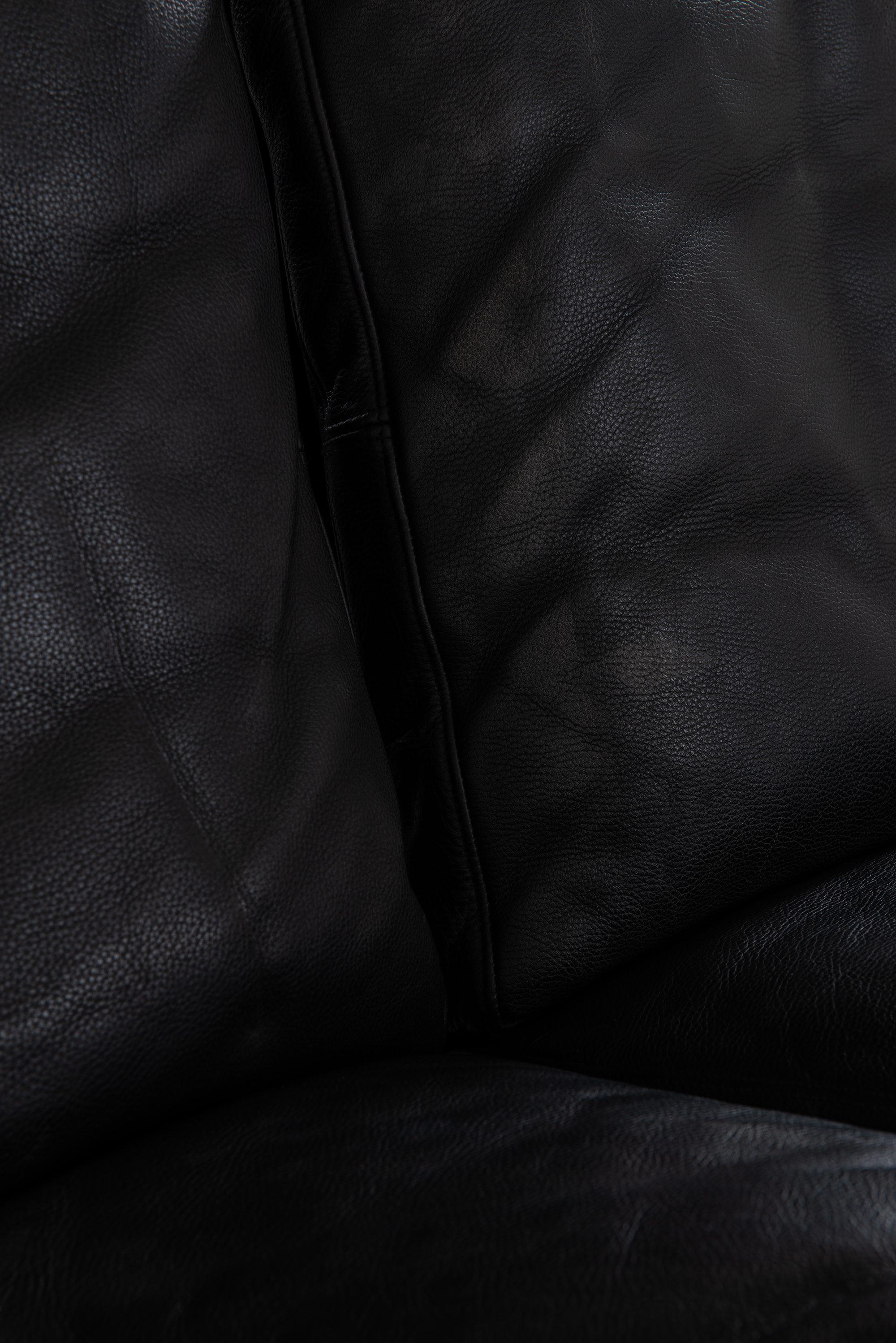 The sofa features a minimalist yet robust construction with a steel frame and original black leather upholstery. Its design is both elegant and functional, emphasizing clean lines and geometric balance. The low profile and deep seat offer exceptional comfort, while the sleek frame and slim silhouette maintain a refined aesthetic. The original leather has aged beautifully, developing a subtle patina that enhances its vintage character and authenticity.