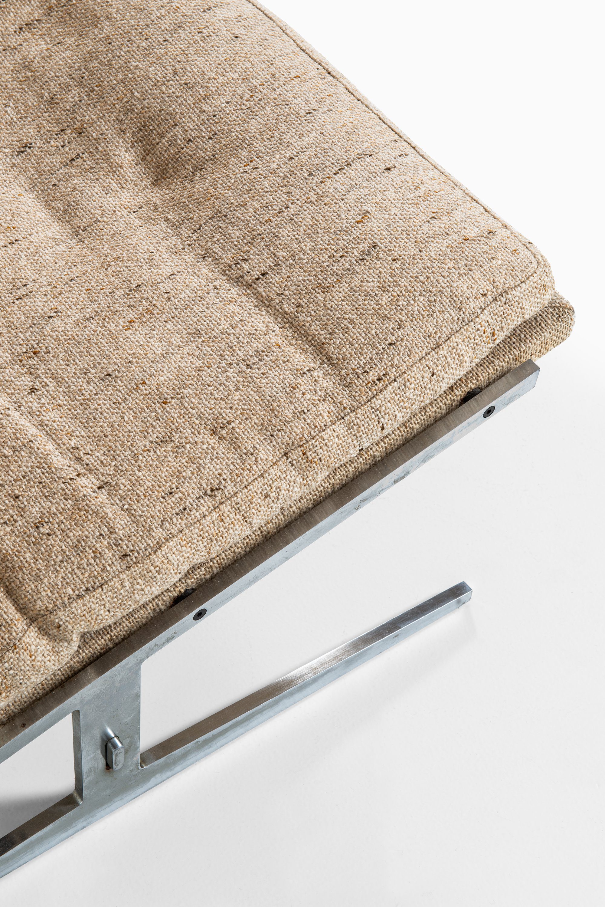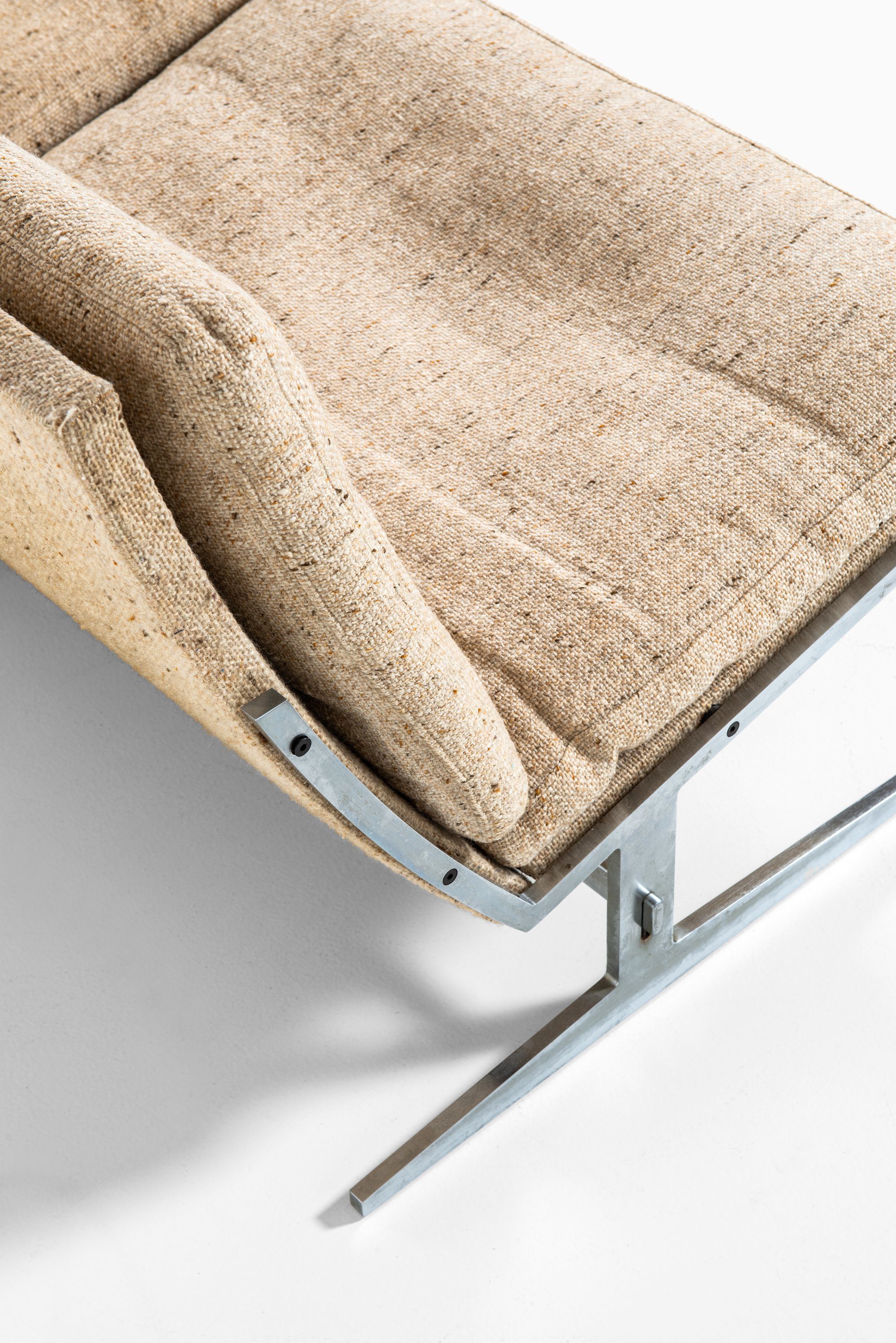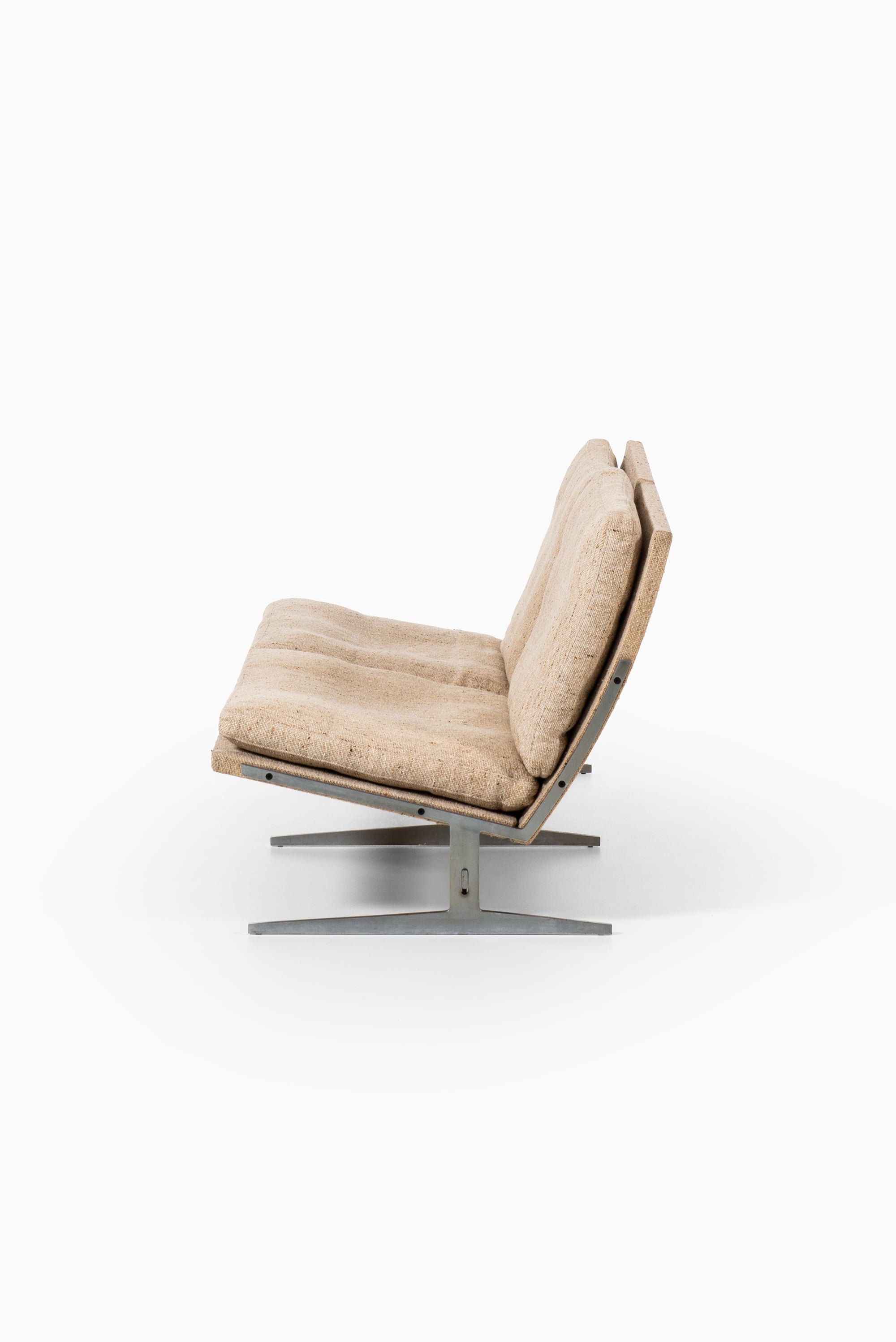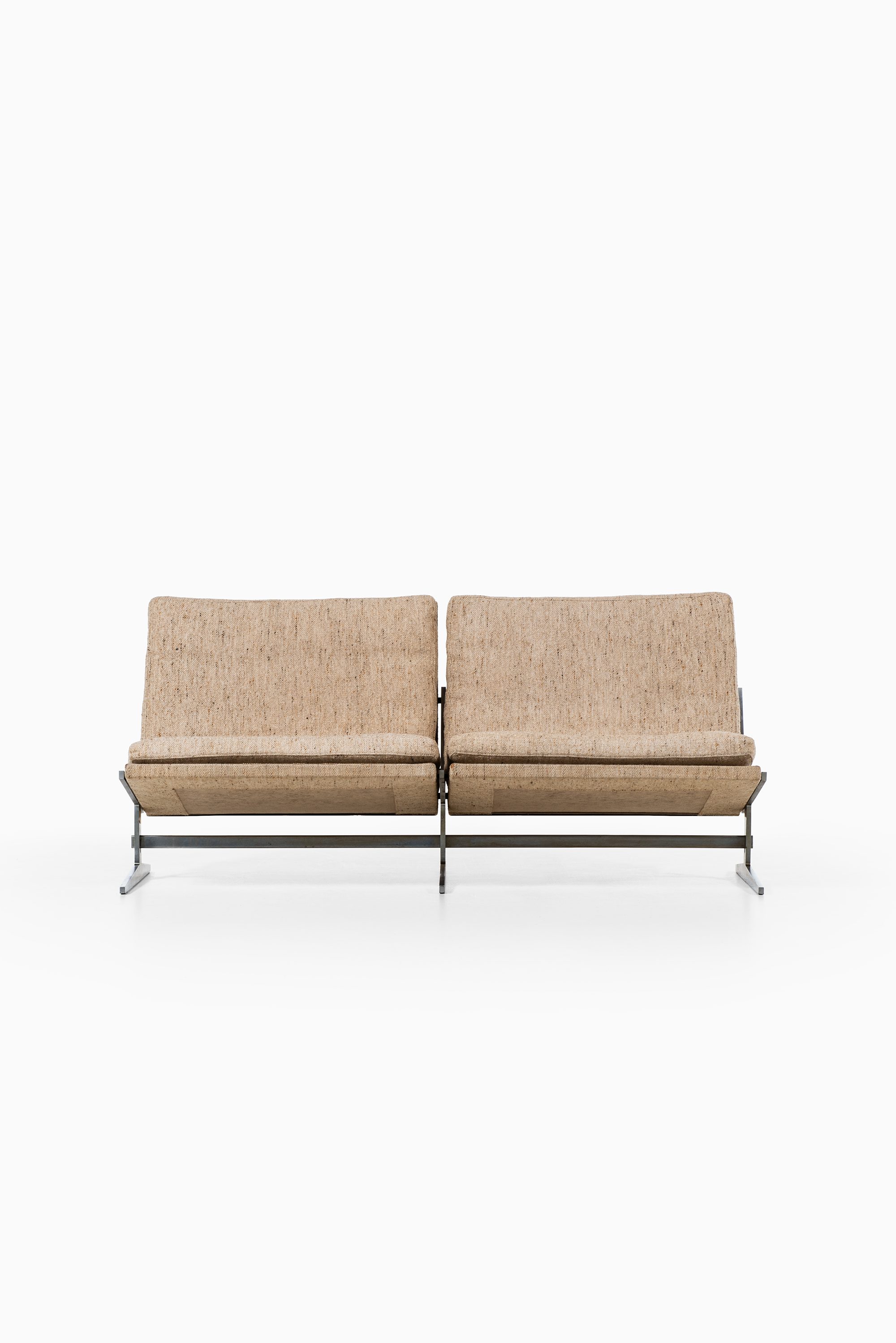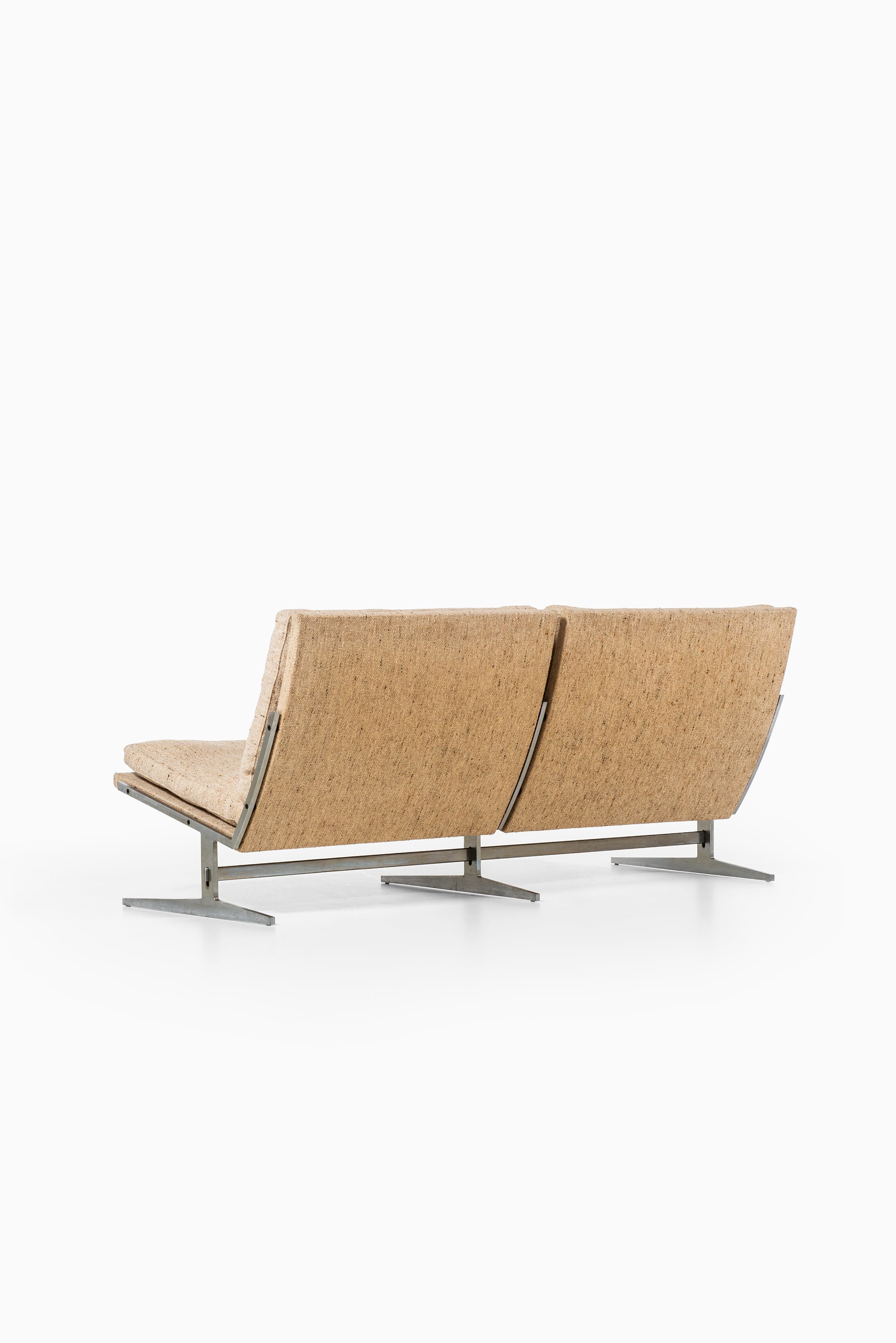 This rare two-seat sofa, model Bo-582, was designed by Jørgen Kastholm and Preben Fabricius and produced by Bo-Ex in Denmark during the 1960s. The piece is constructed with a sleek steel frame and retains its original textured fabric upholstery in a warm beige tone. The design demonstrates the duo’s refined approach to modernism — merging architectural precision with elegant simplicity and an emphasis on honest materials.