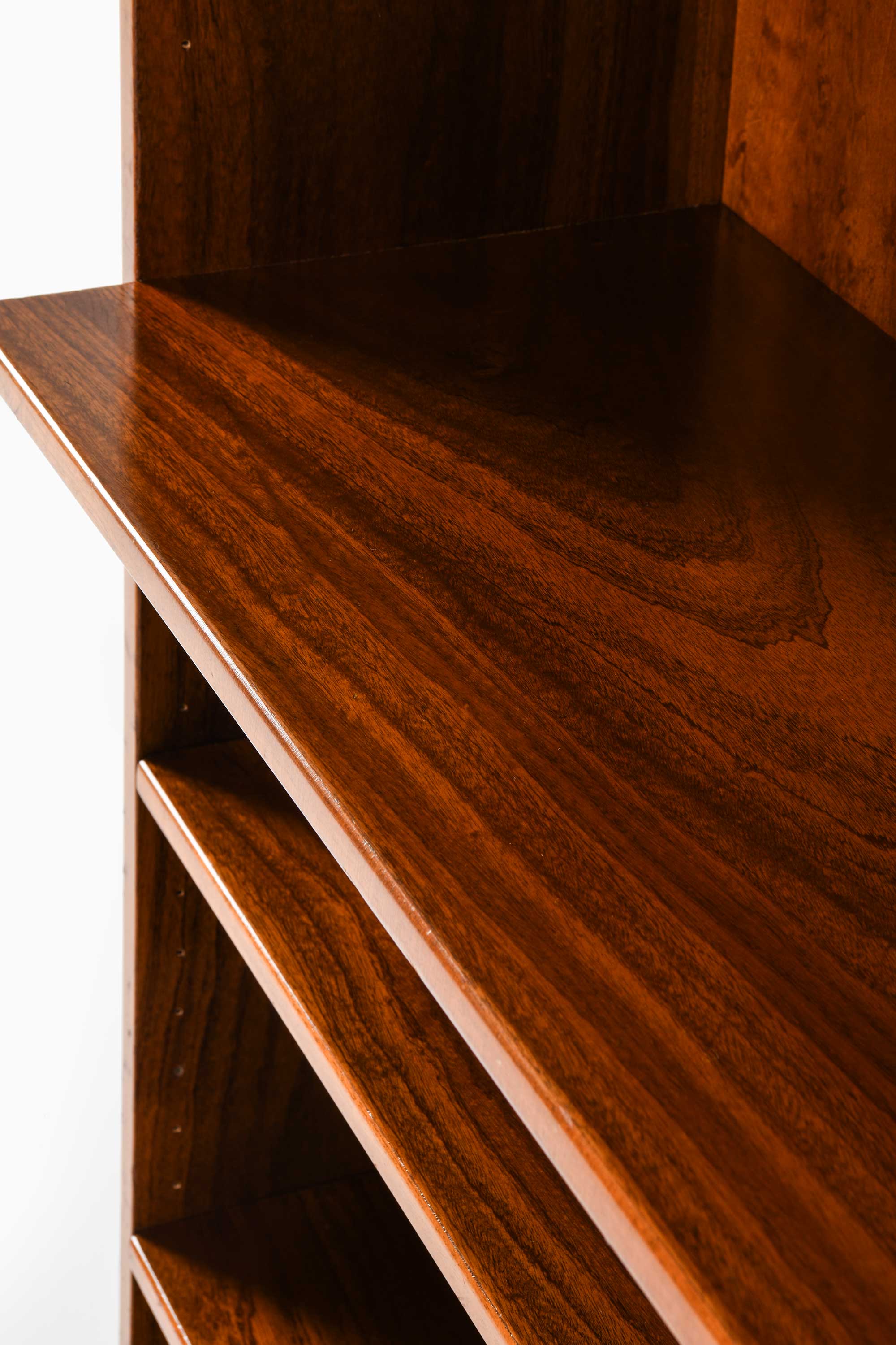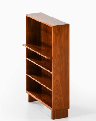 The design is rectilinear and free of ornamentation, characteristic of the functionalist movement, yet the material choice and proportioning reflect Josef Frank’s commitment to humanized modernism. The front-facing surfaces are flat and flush, with lightly rounded edges that soften the geometric form. The case rests on solid mahogany block legs that lift it subtly from the floor, enhancing the vertical rhythm. It includes four fixed shelves offering a balanced layout ideal for books or display objects. One of the shelves is placed slightly higher, creating asymmetry that supports Frank’s belief in informal elegance.