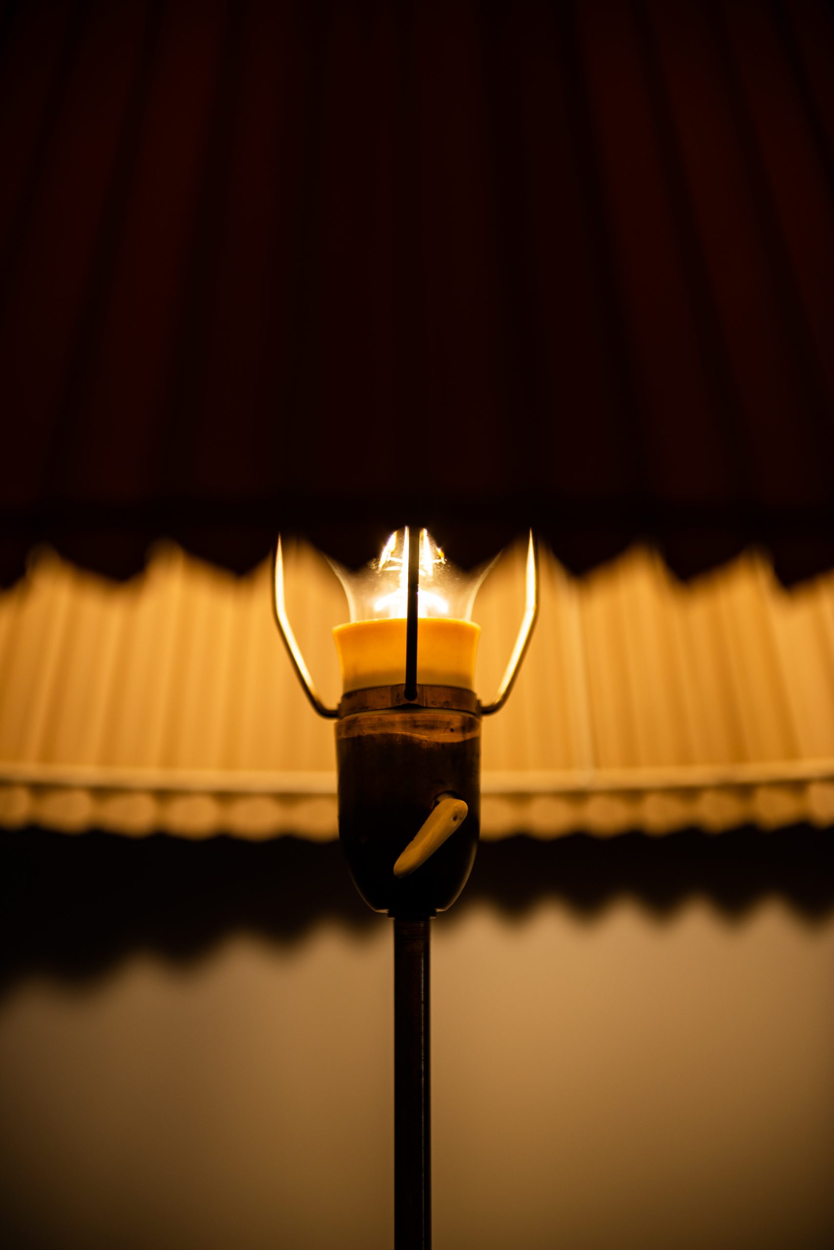 Crowning the lamps are the original off-white pleated fabric shades, which have aged to a slightly yellowed tone. Their conical shape and evenly spaced pleats diffuse light softly, producing an ambient glow upward and downward. The integrated toggle switch in the socket remains original.