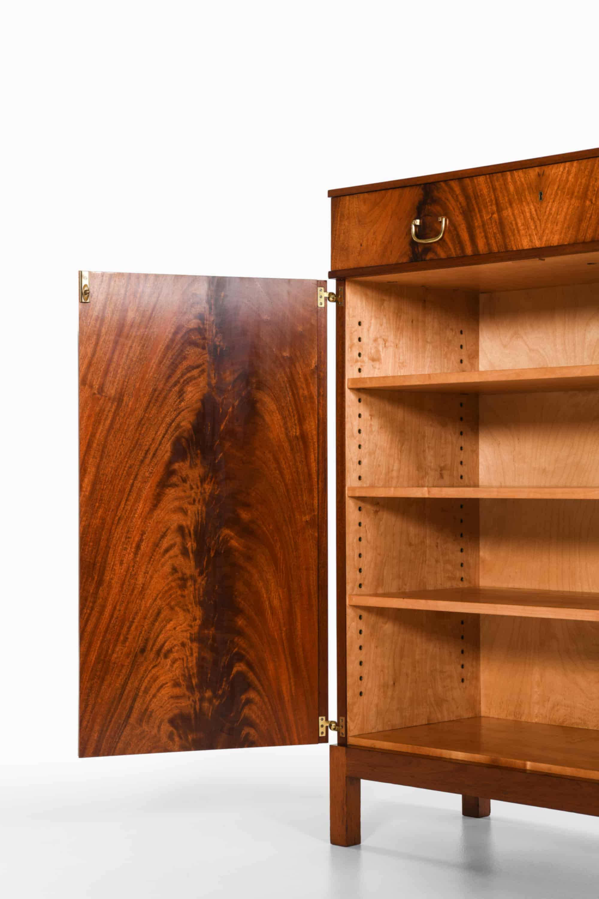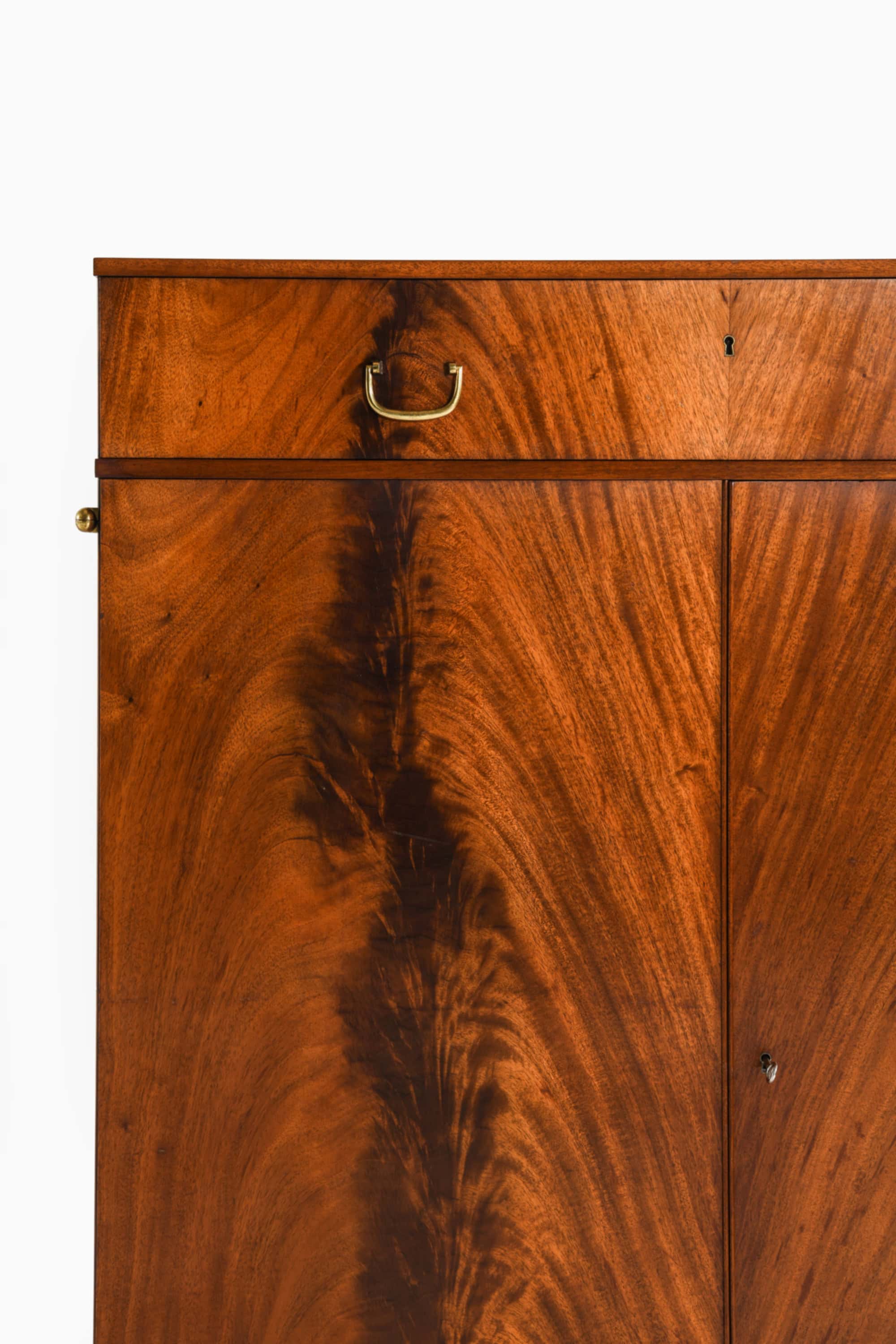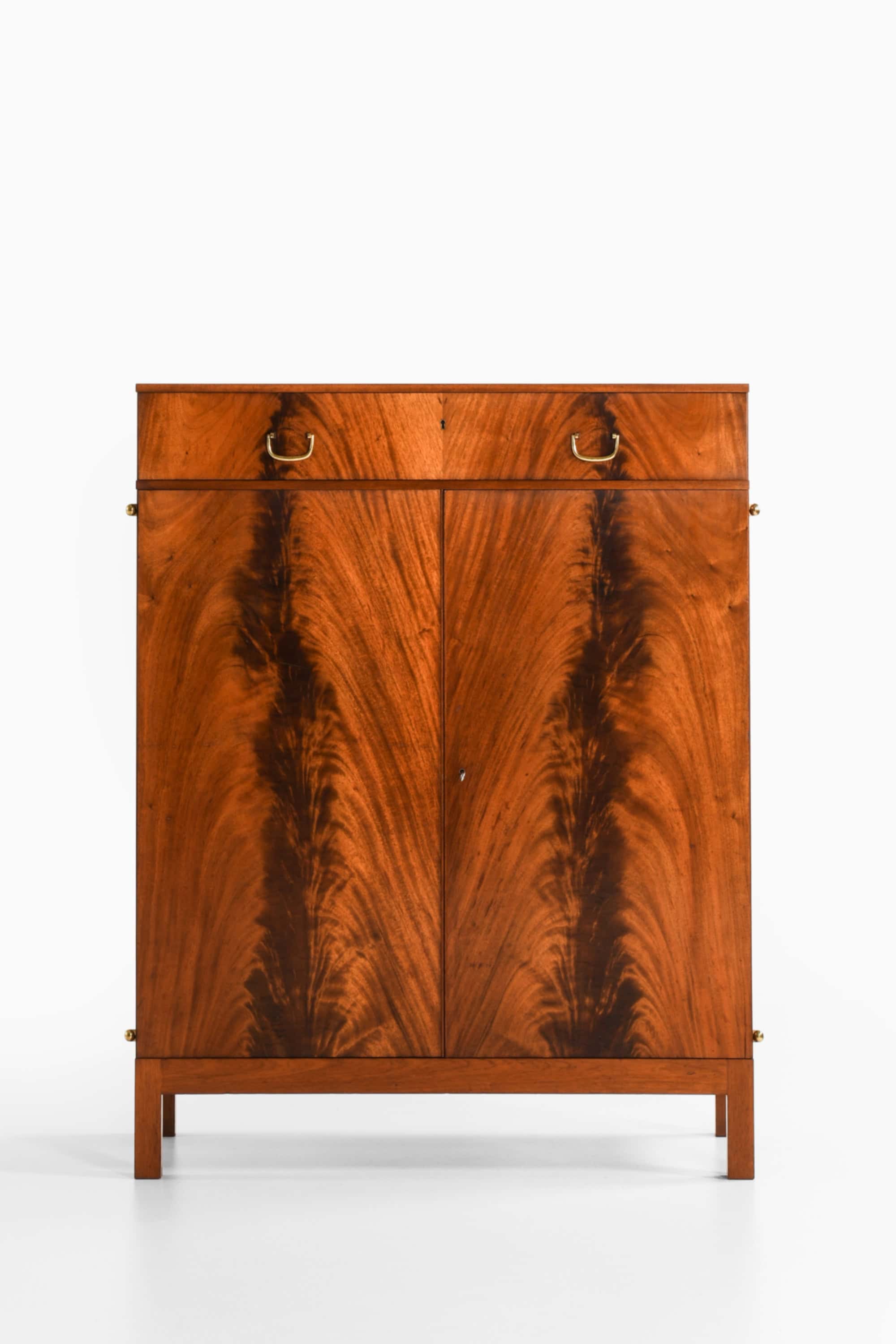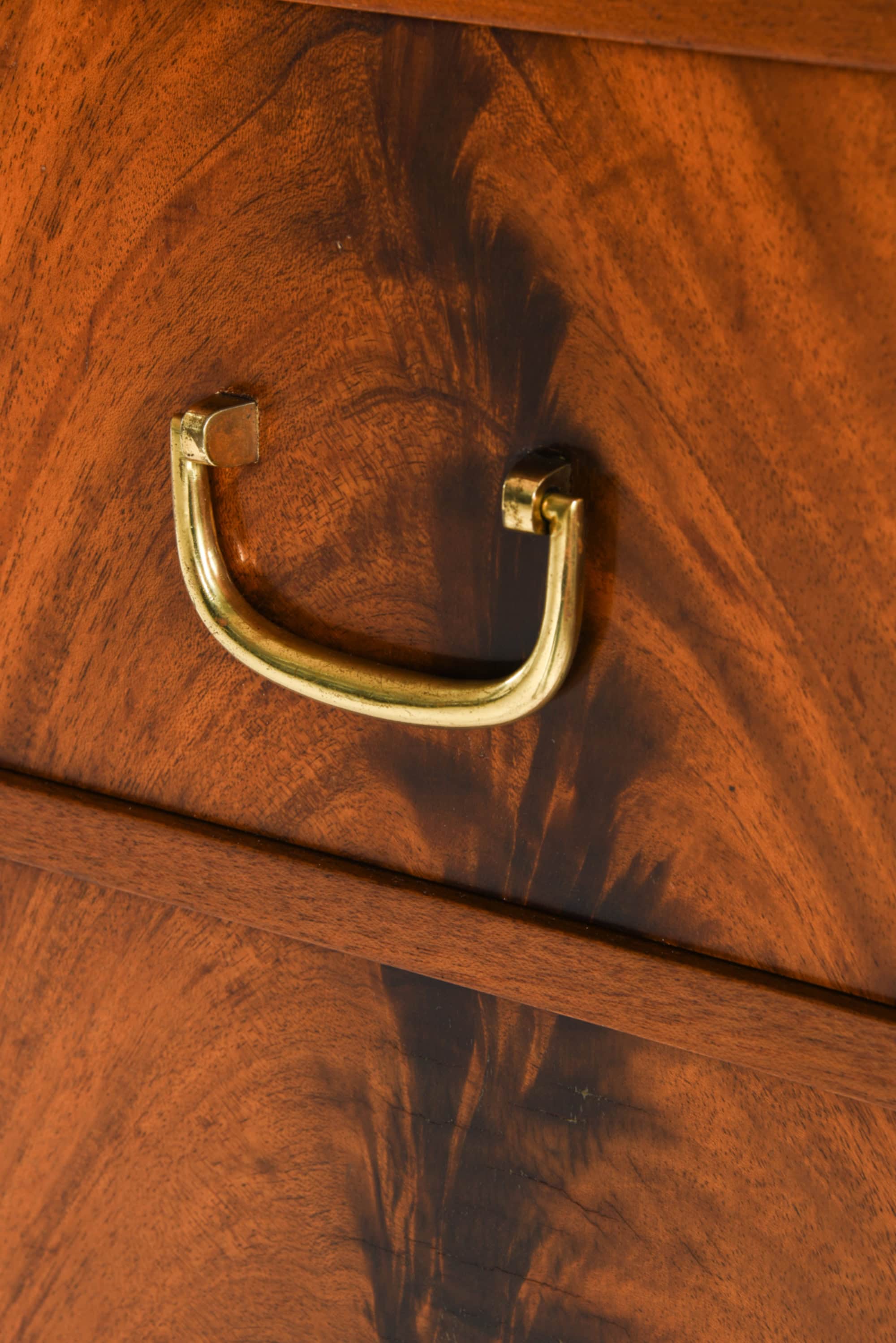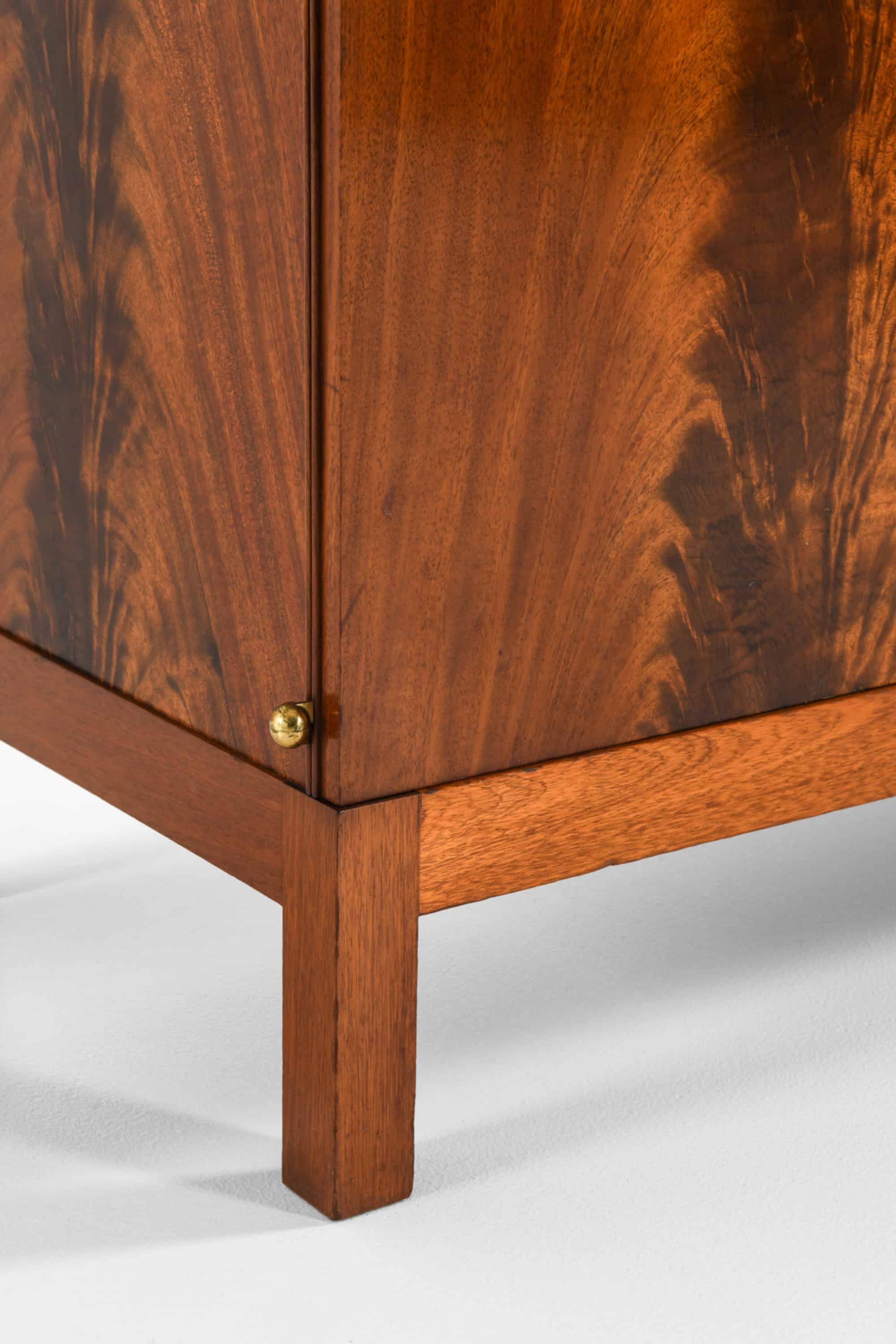 This cabinet, designed by Josef Frank and produced by Svenskt Tenn in Sweden during the 1940s, is executed in pyramid mahogany with brass fittings. The exterior surface presents a striking veneer pattern characteristic of pyramid mahogany, where the grain forms symmetrical, flame-like figures that emphasize the natural depth and variation of the wood. The color ranges from warm reddish brown to deeper, darker tonal shifts, giving the cabinet a vivid and dynamic appearance. The structure is rectilinear, with a calm and balanced silhouette elevated on straight legs and a recessed lower frame that lightens the overall proportions.