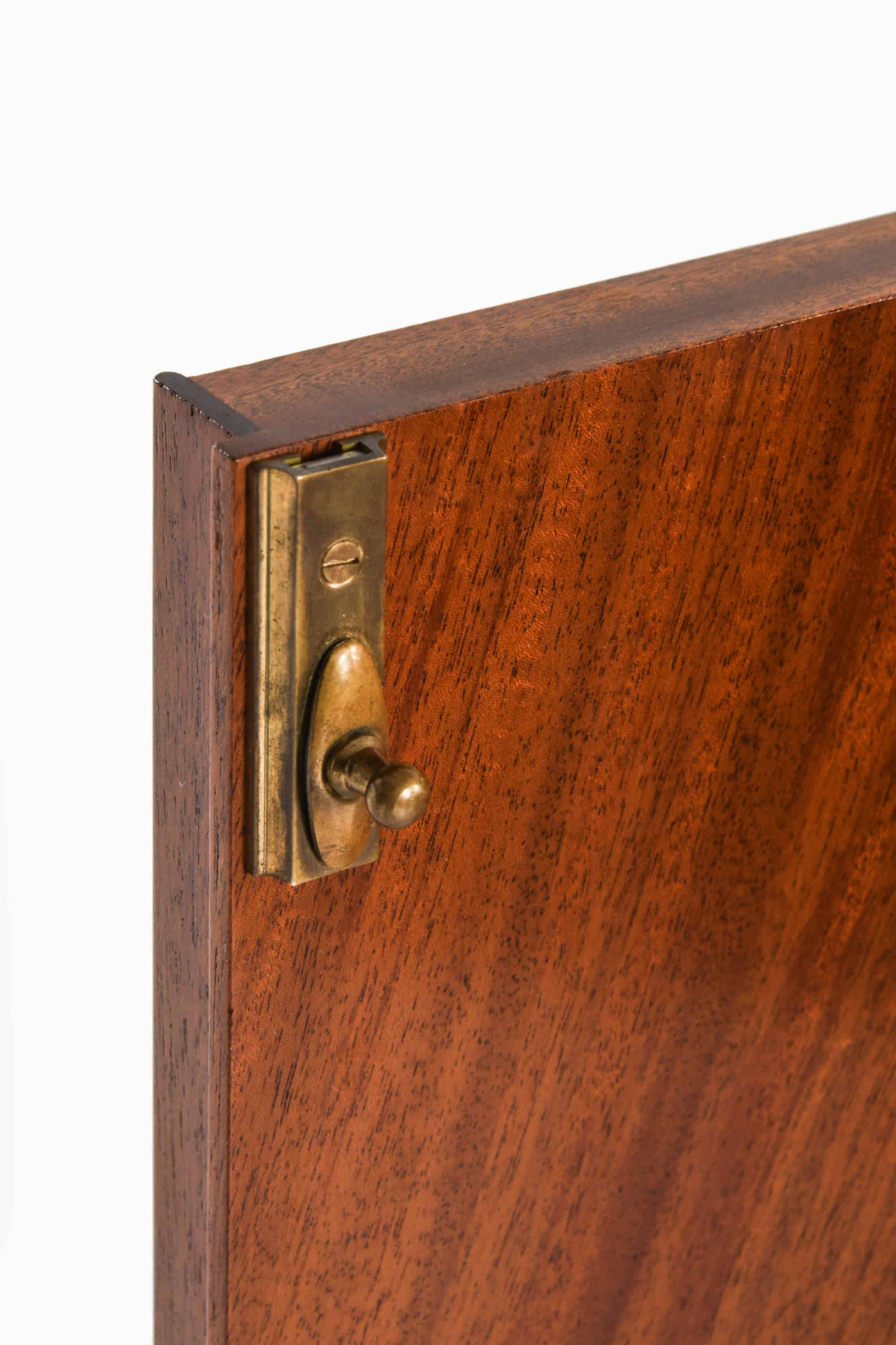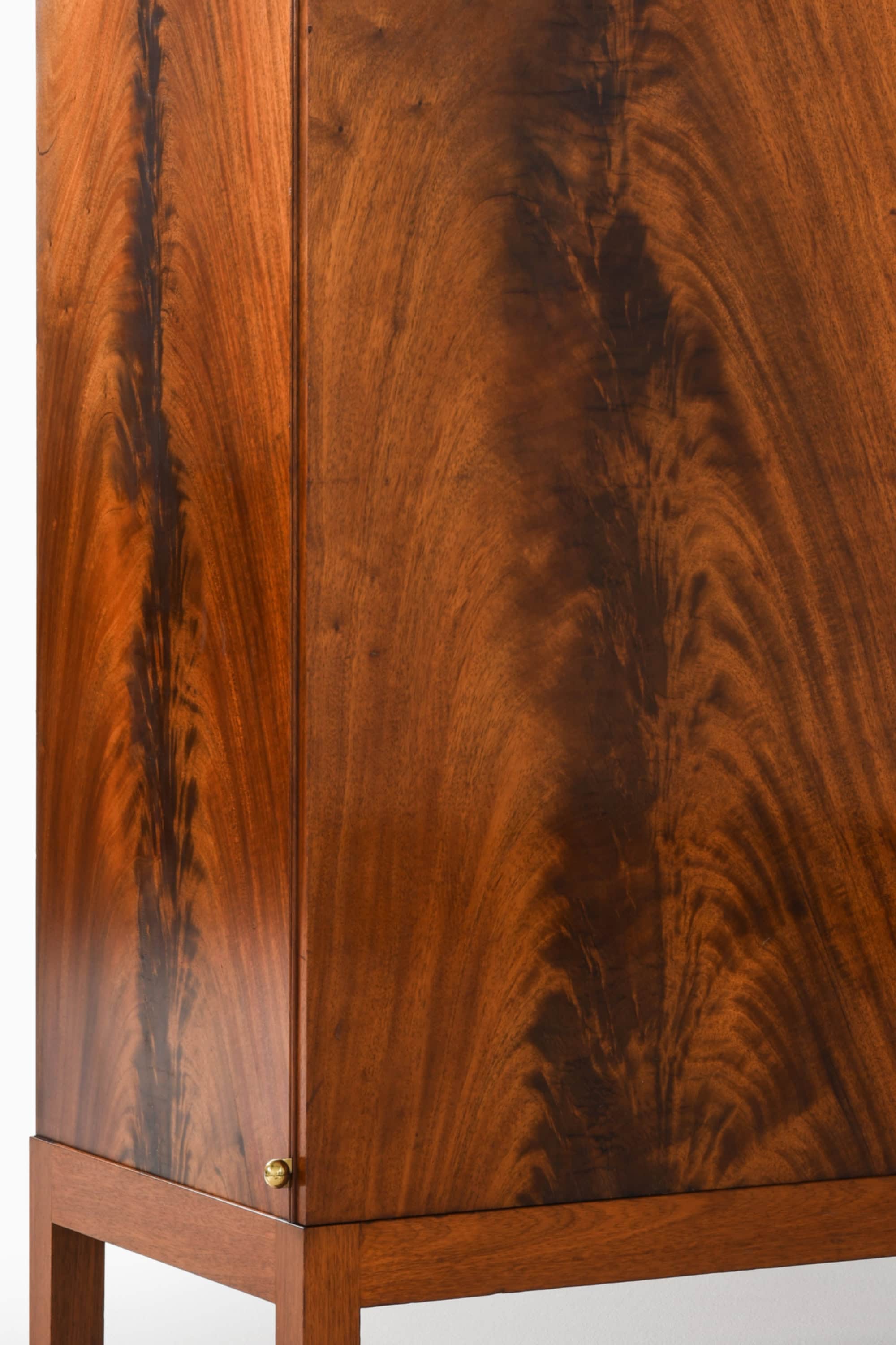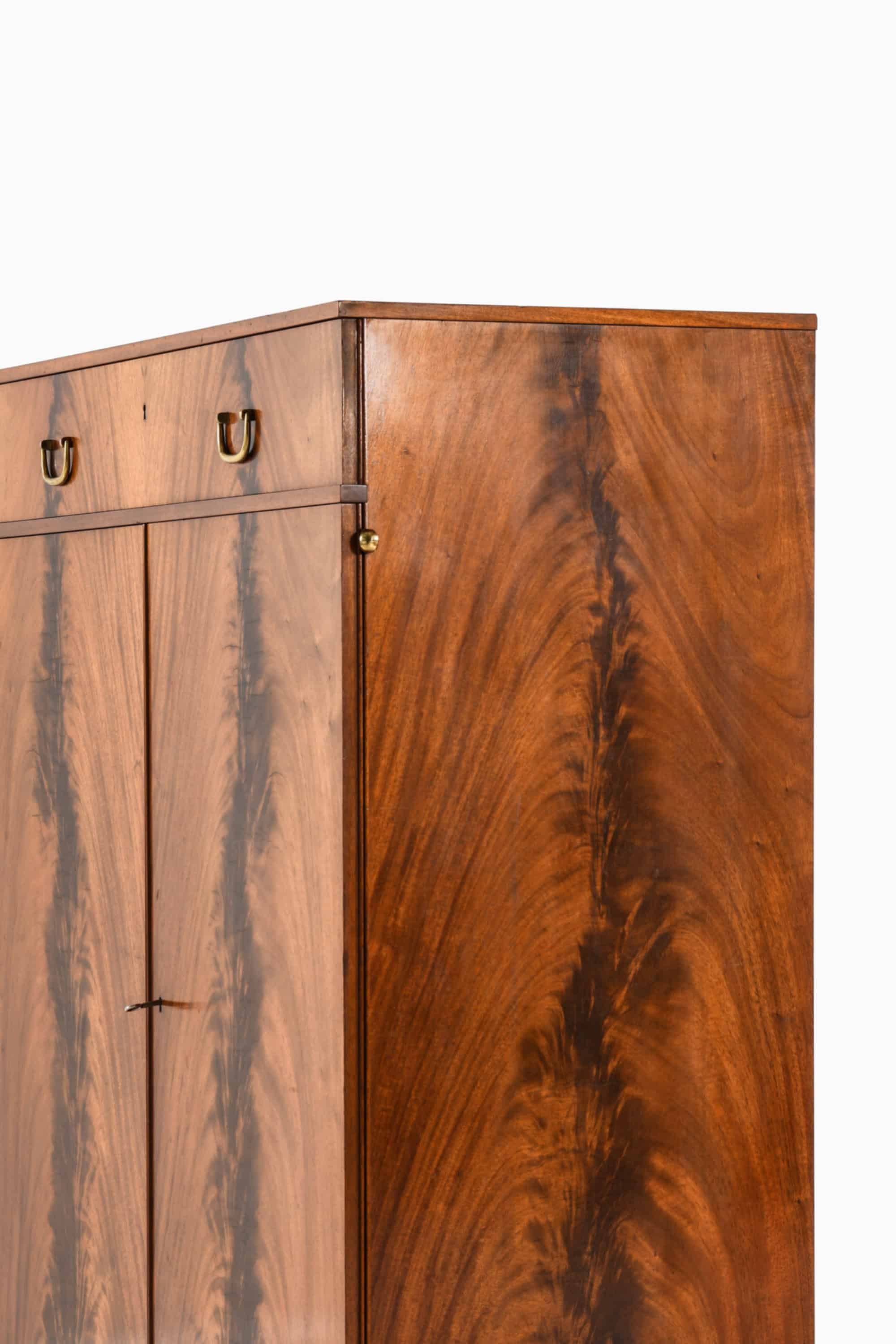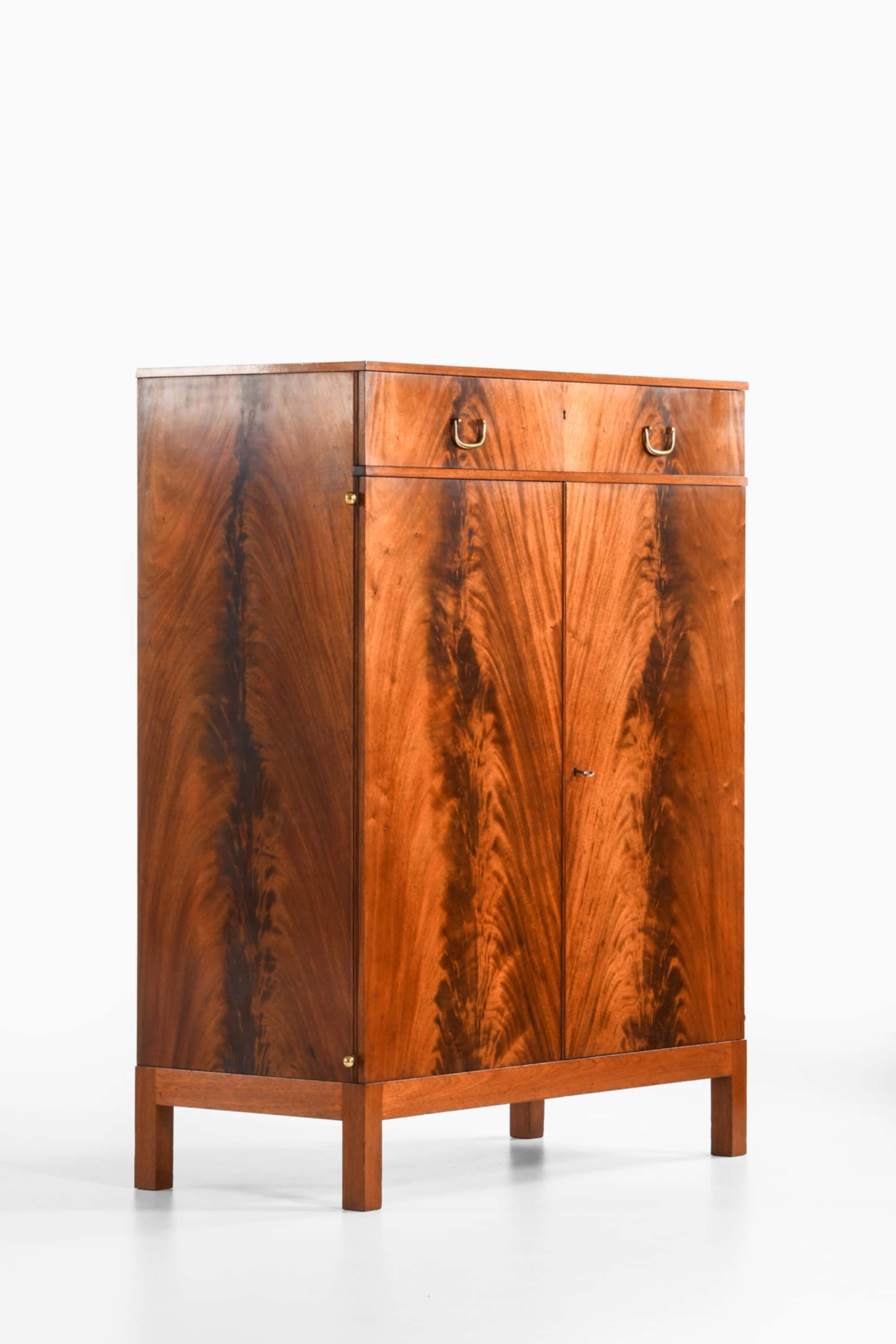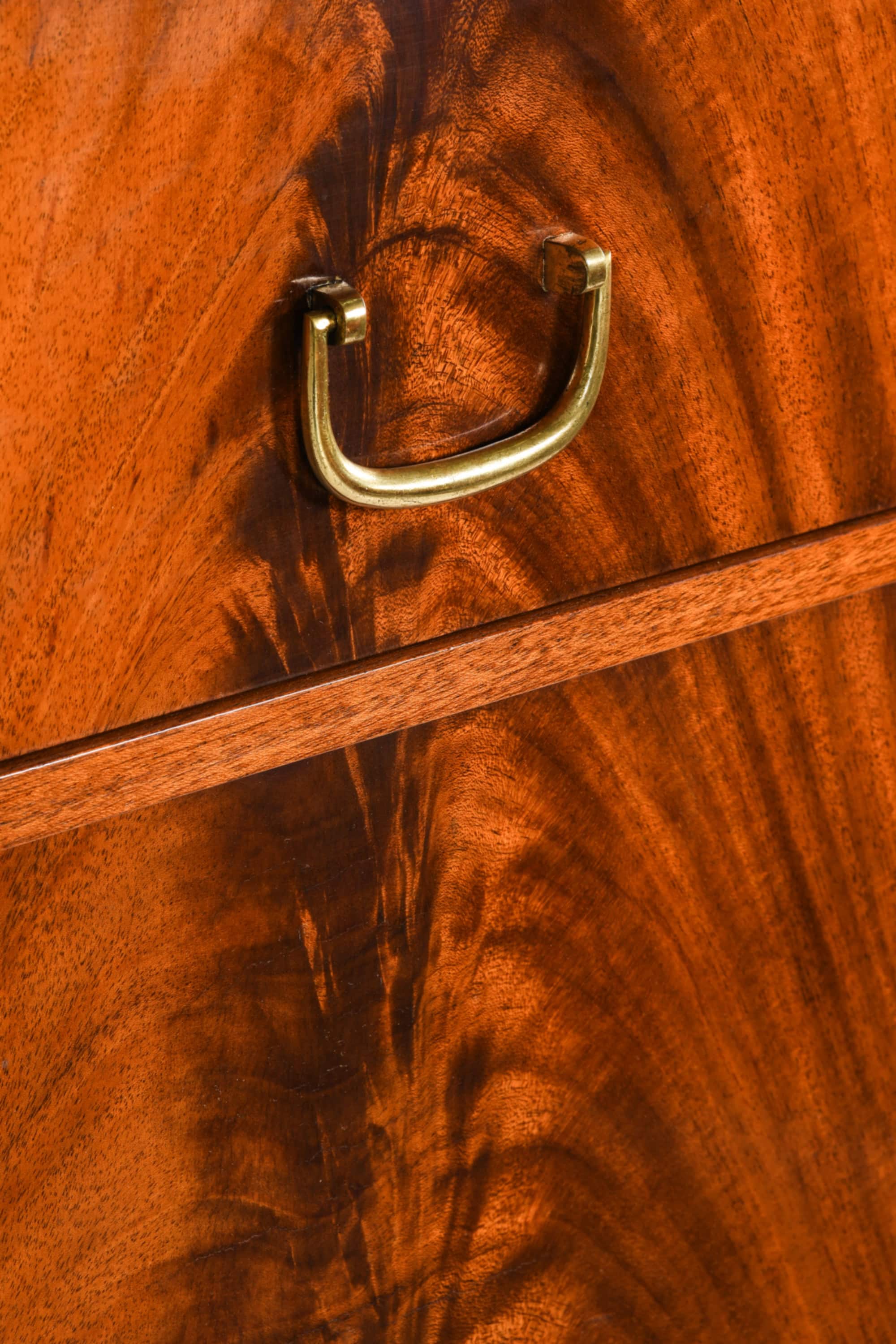 This cabinet, designed by Josef Frank and produced by Svenskt Tenn in Sweden during the 1940s, is executed in pyramid mahogany with brass fittings. The exterior surface presents a striking veneer pattern characteristic of pyramid mahogany, where the grain forms symmetrical, flame-like figures that emphasize the natural depth and variation of the wood. The color ranges from warm reddish brown to deeper, darker tonal shifts, giving the cabinet a vivid and dynamic appearance. The structure is rectilinear, with a calm and balanced silhouette elevated on straight legs and a recessed lower frame that lightens the overall proportions.