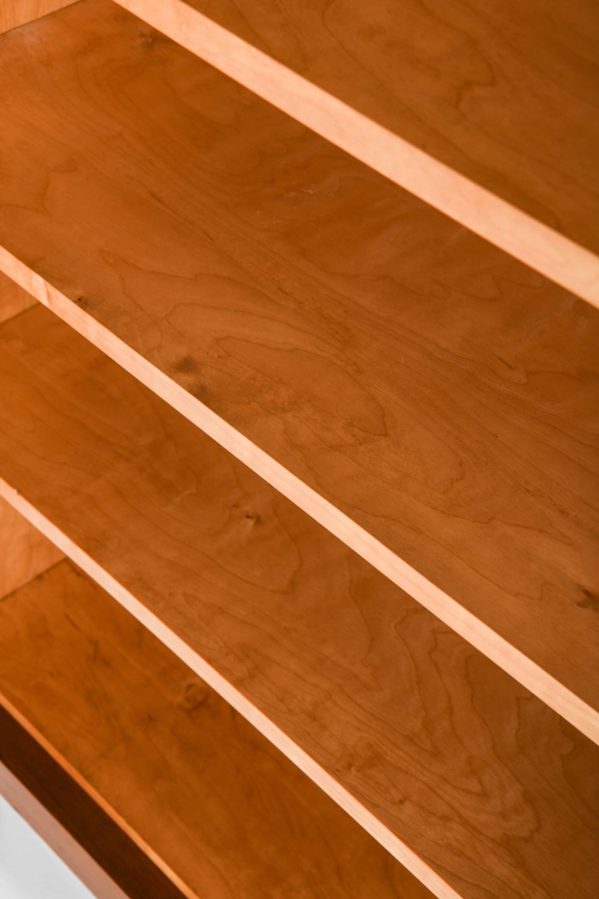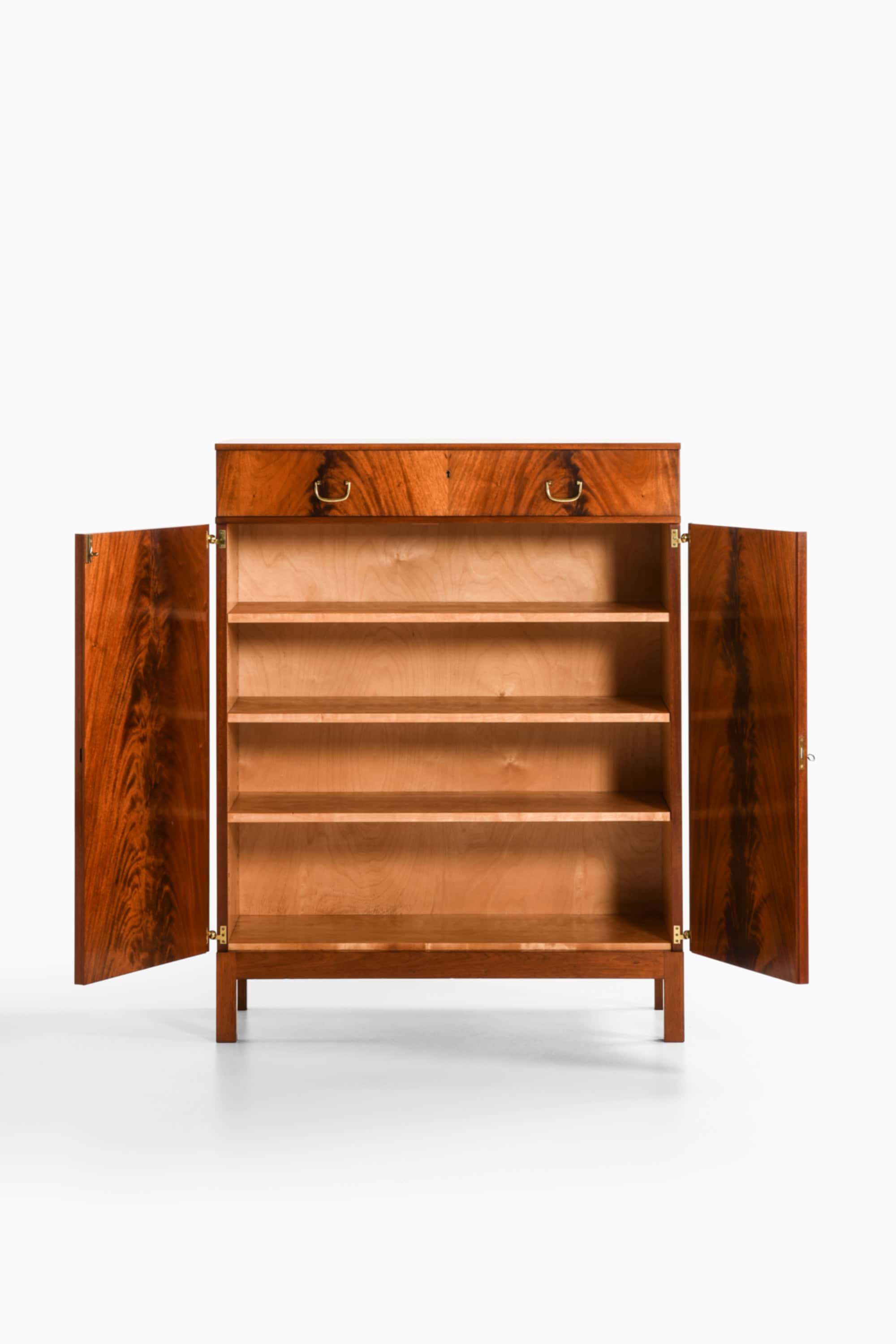 The cabinet features one drawer over the double doors, fitted with brass hardware. The handles and small brass knobs are simple yet refined, typical of Frank’s understated approach to ornamentation. The craftsmanship is visible in the precise veneer matching and the clean junctions between structural components. Inside, the cabinet is fitted with birch or similar light-toned wood, offering adjustable shelving supported by pegged holes along the interior sides. The hinges and locks are executed in brass, displaying both functionality and an attention to detail consistent with Svenskt Tenn’s production standards.