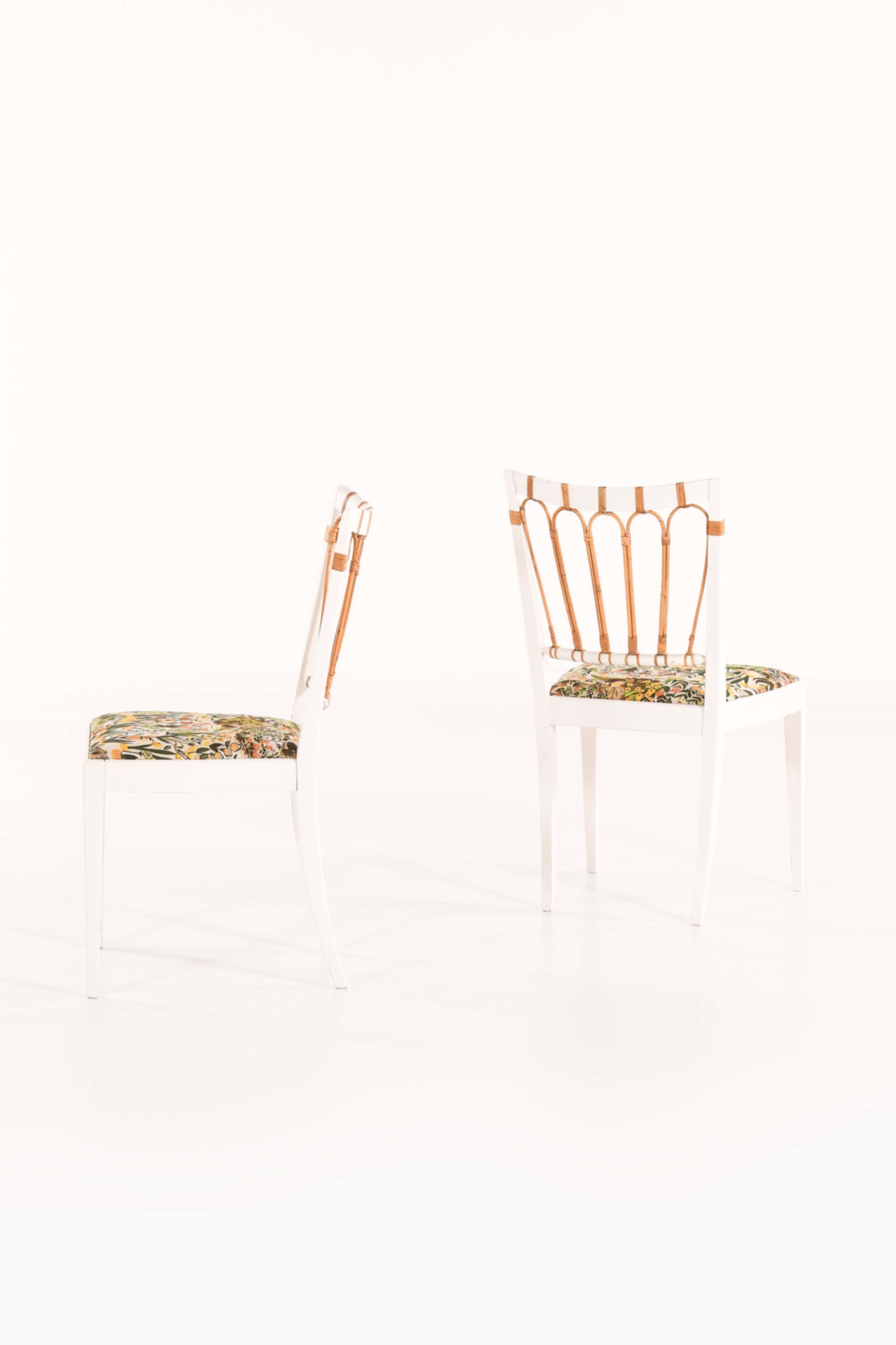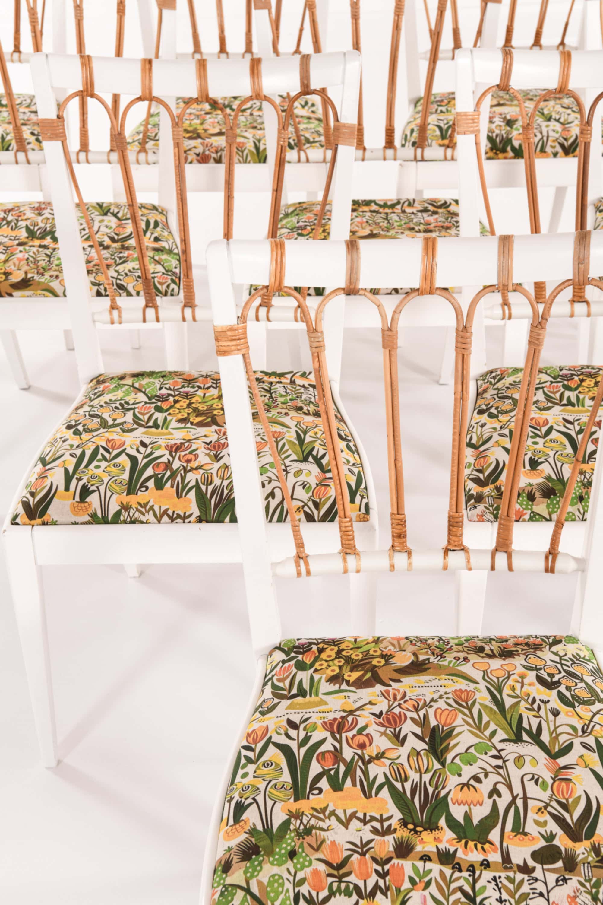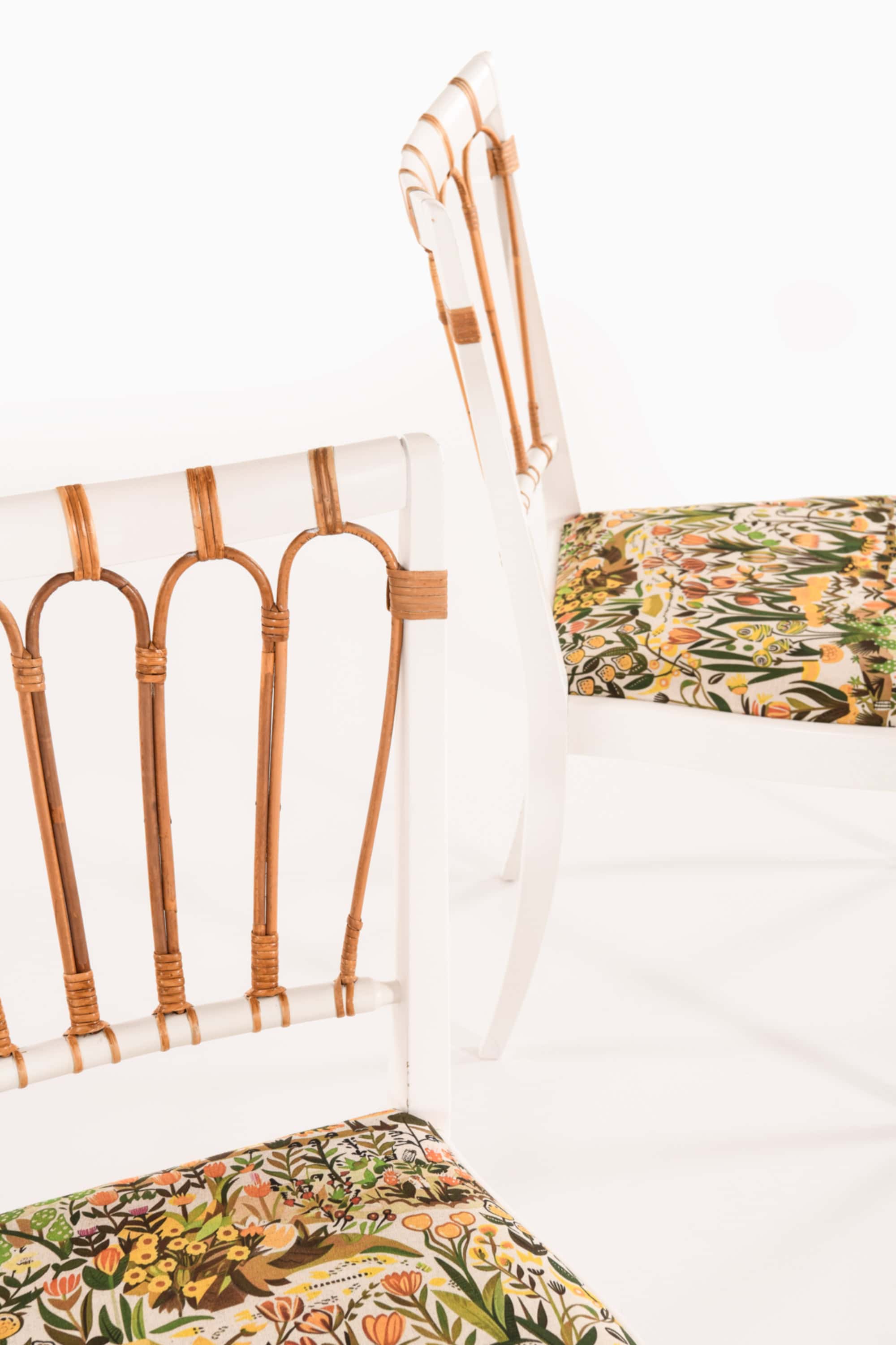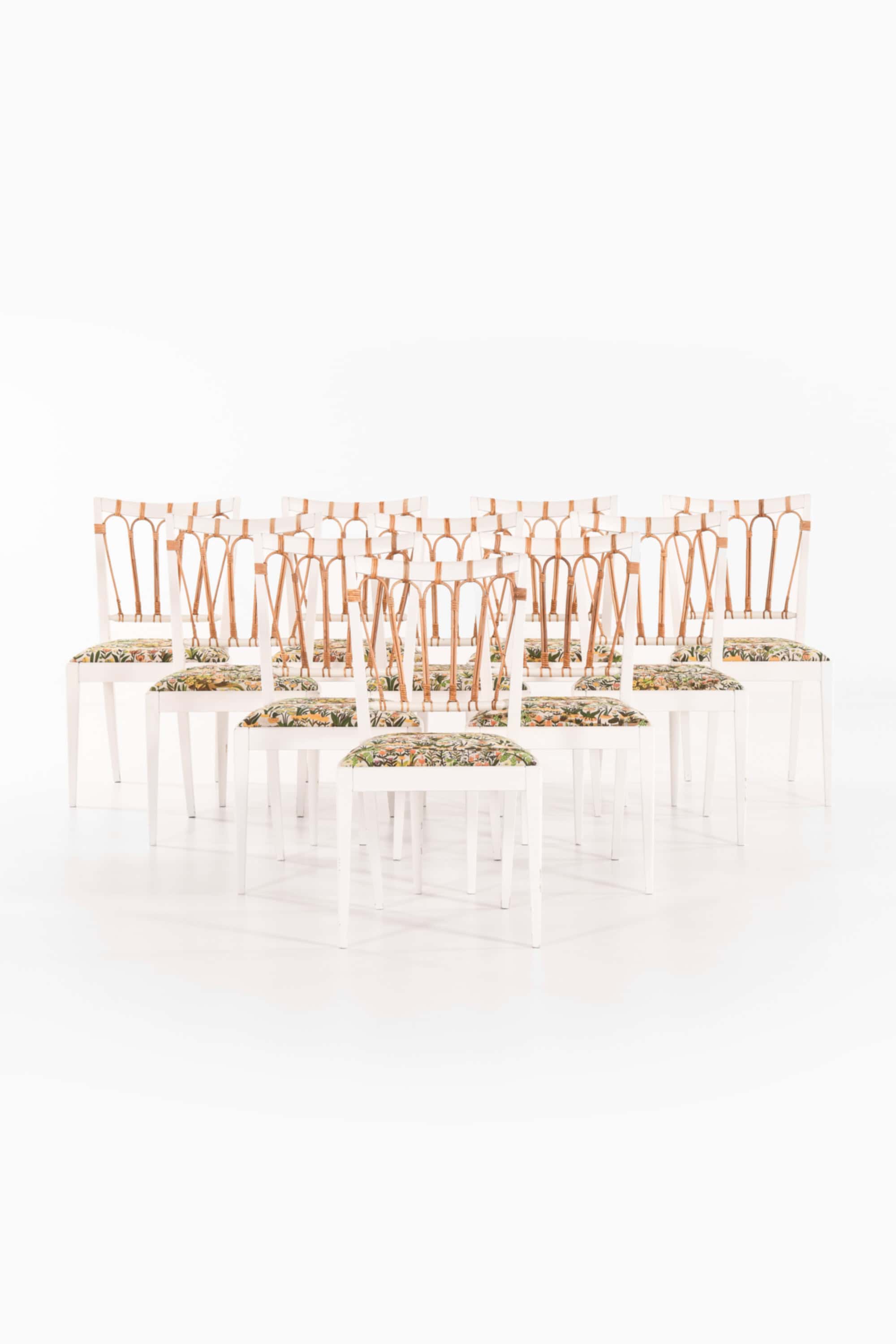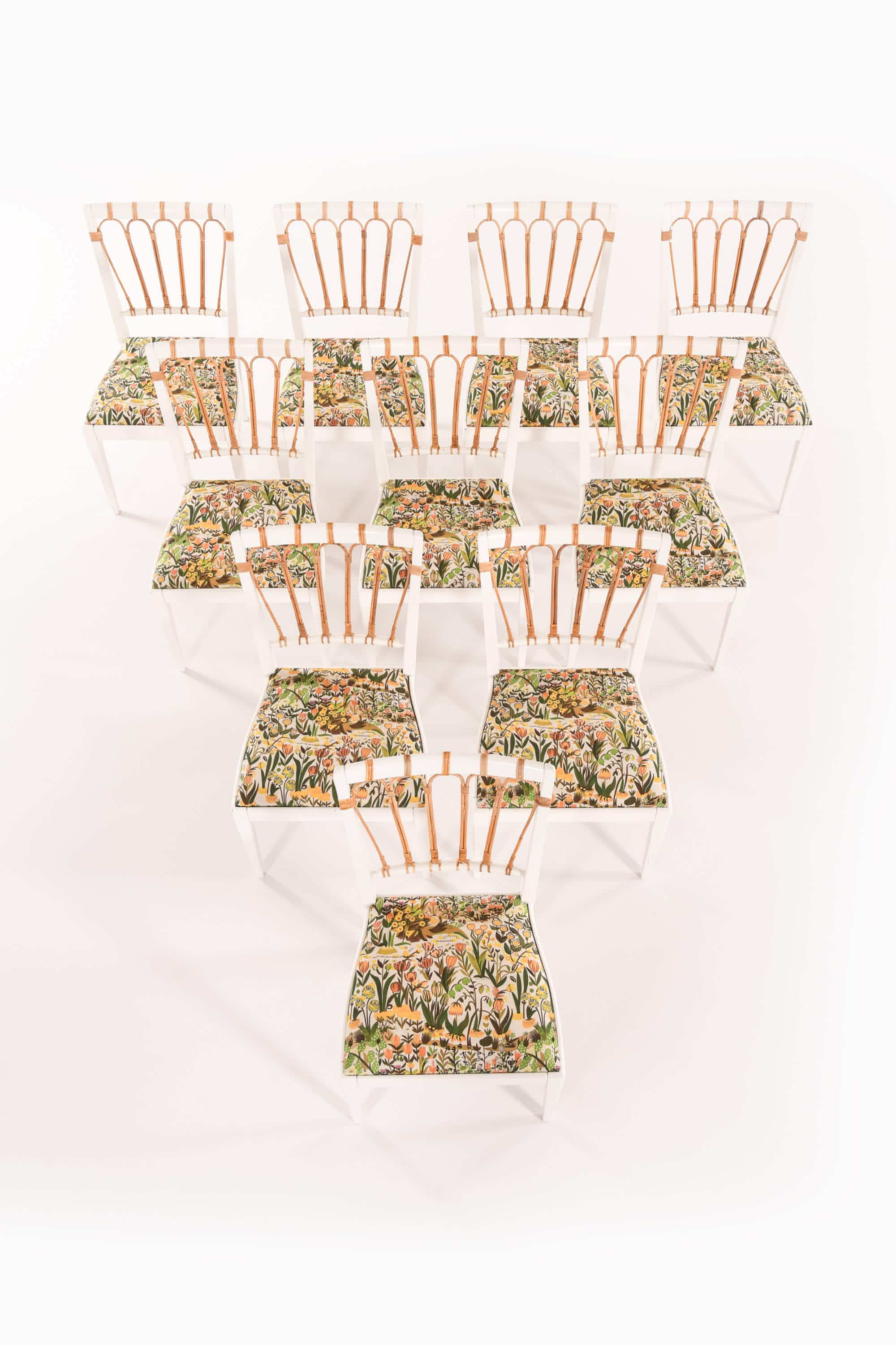 Set of ten dining chairs, model 1165, designed by Josef Frank and produced by Svenskt Tenn in Sweden in 1947. The chairs are constructed from solid painted wood and feature backs of finely bent rattan and cane, revealing a combination of craftsmanship and lightness typical of Frank’s design philosophy. The frames are painted in white, forming a visual contrast with the natural tones of the rattan that softens the linear geometry of the structure.