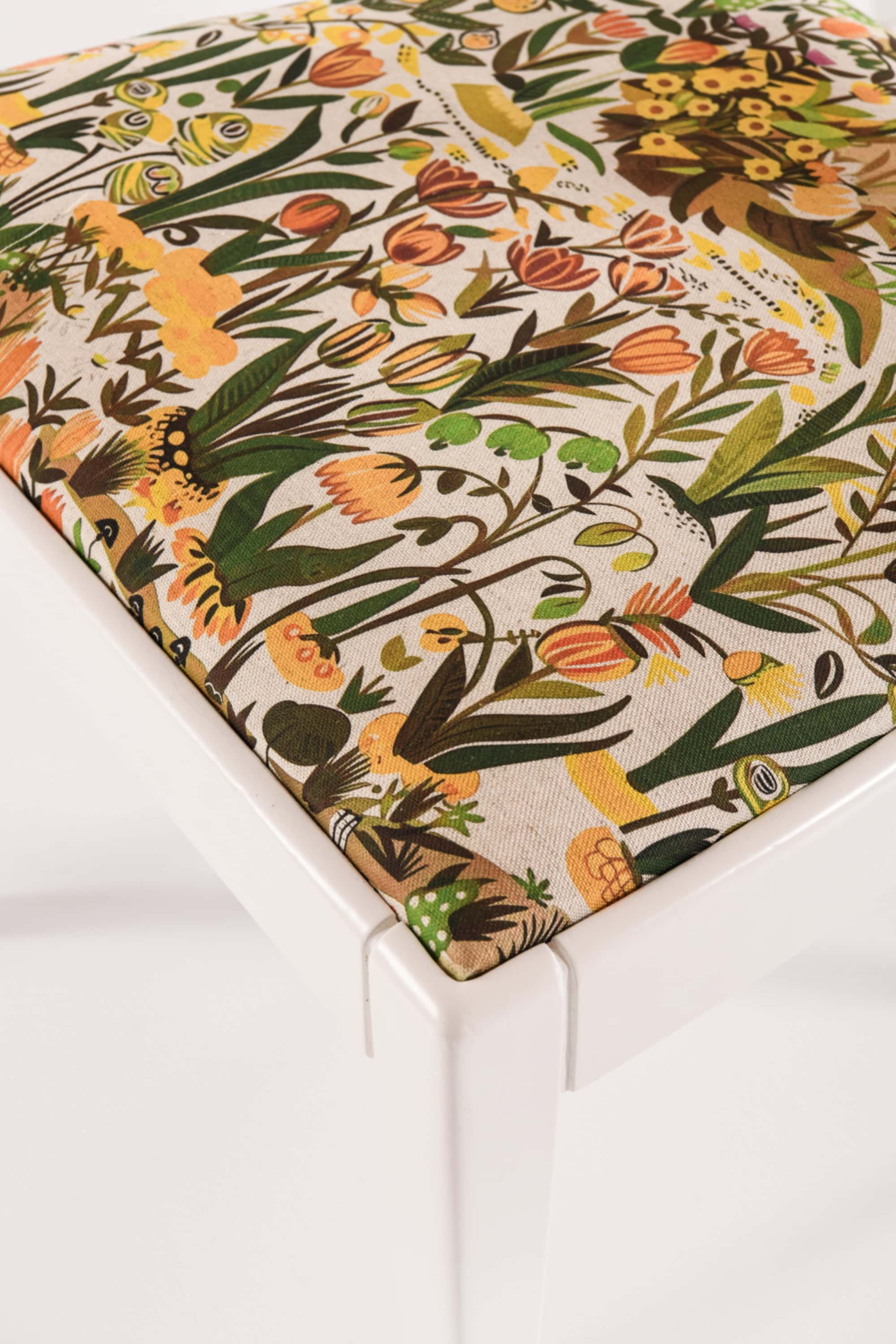 The seat upholstery presents a vibrant floral fabric in shades of green, yellow, orange, and brown, a characteristic motif within Josef Frank’s textile designs for Svenskt Tenn. The organic and rhythmic floral patterns evoke his vision of harmony between function, comfort, and the natural world.