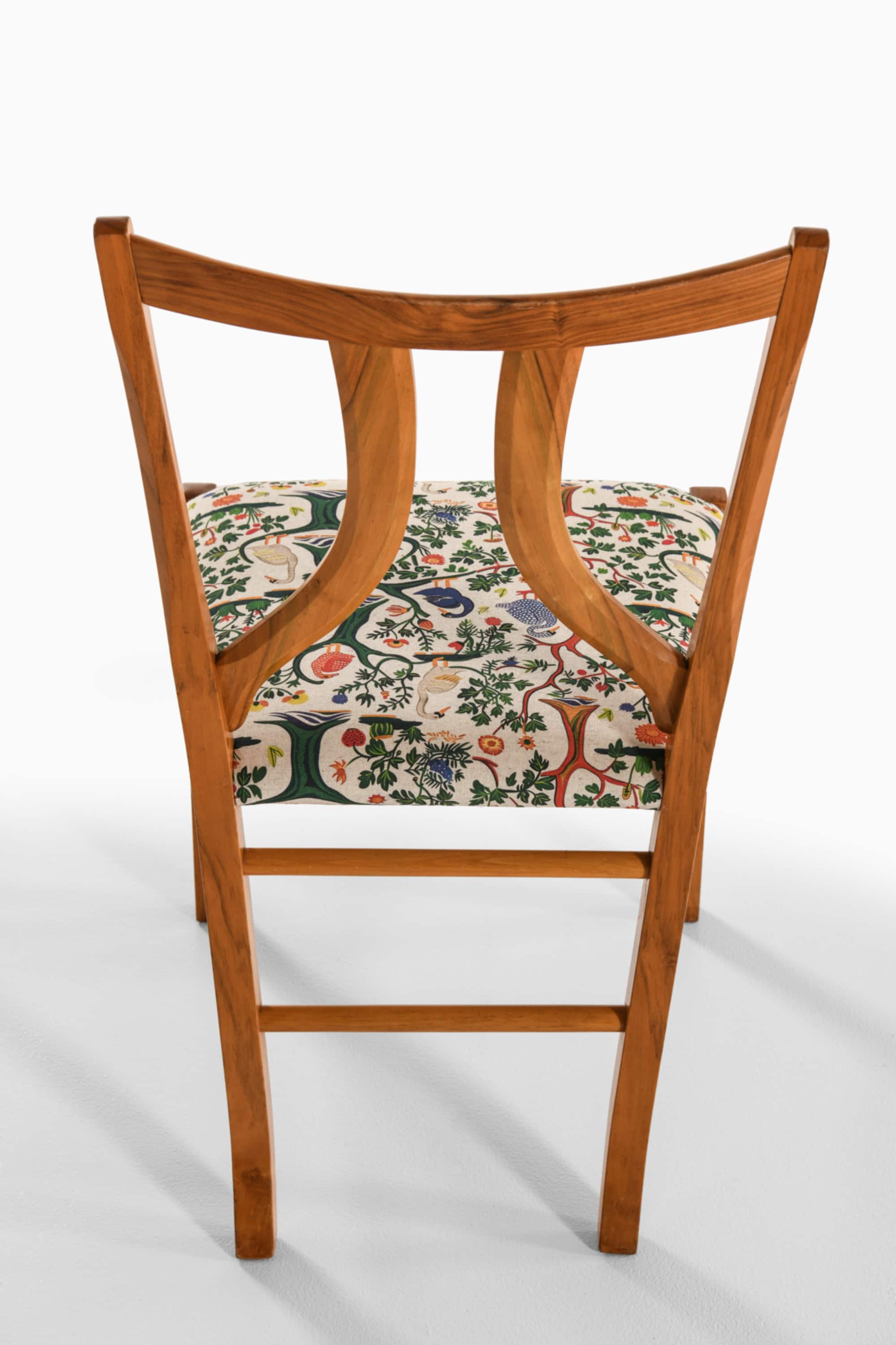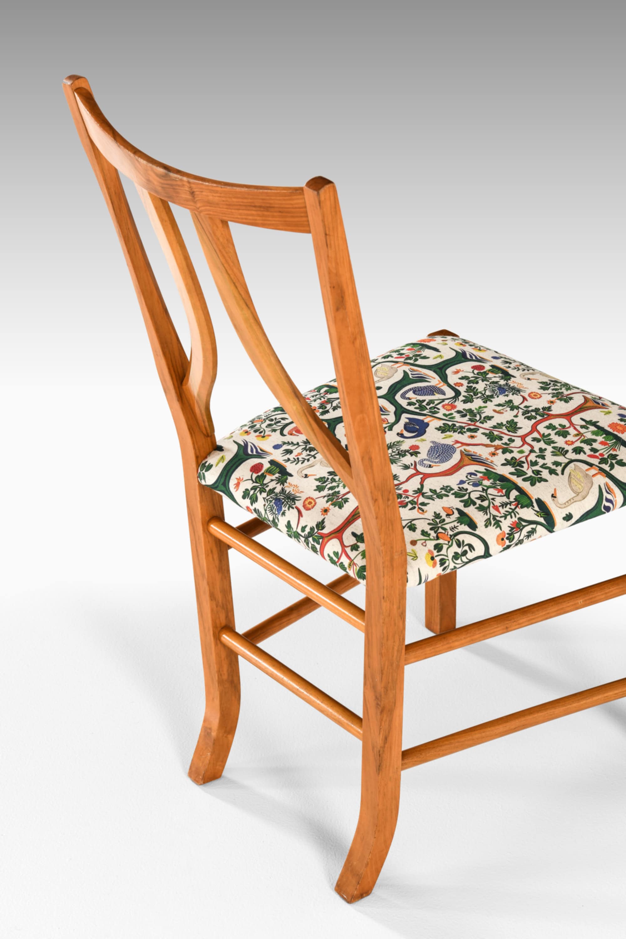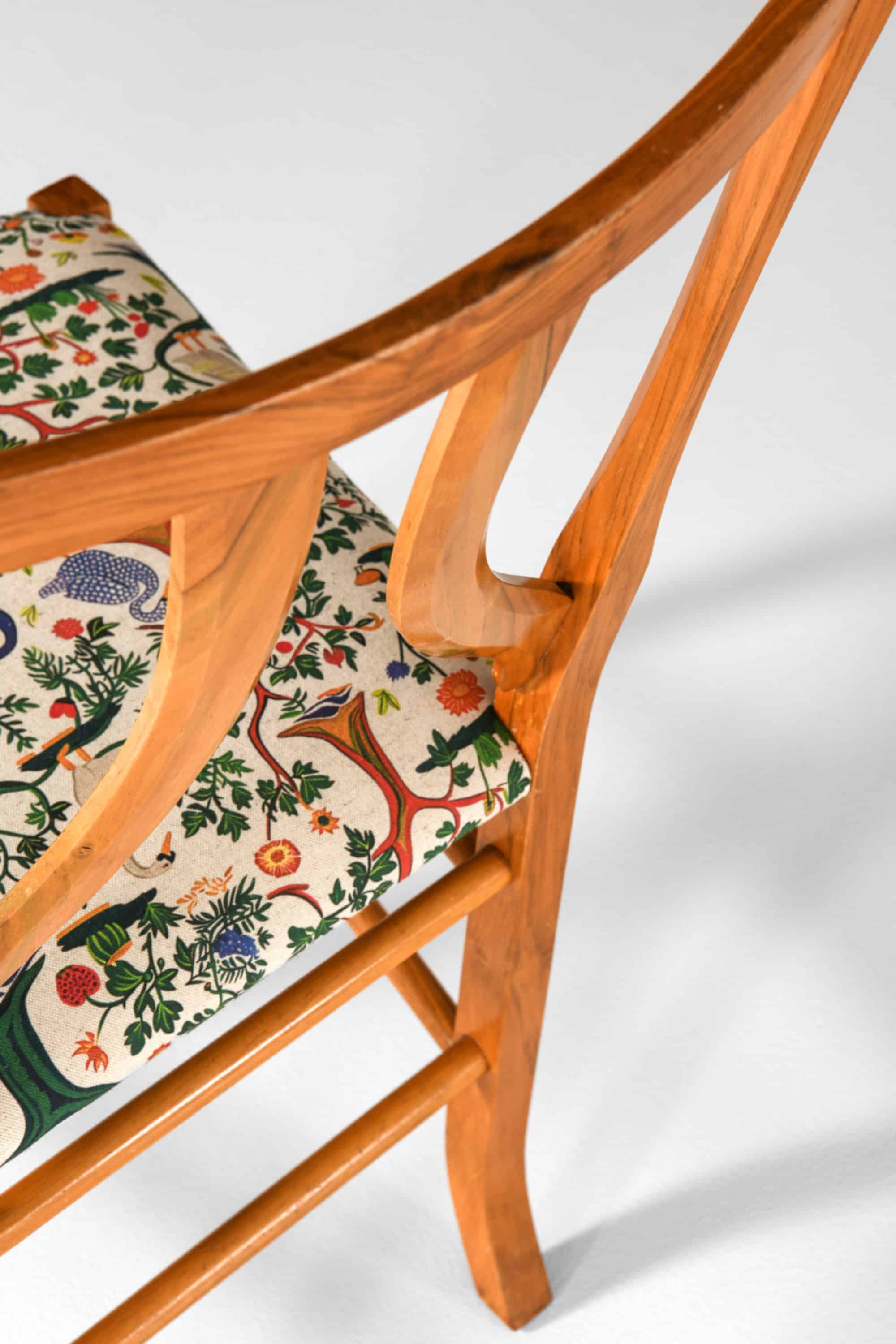 The upholstered seats retain a floral textile consistent with Svenskt Tenn’s decorative language. The pattern features stylized foliage, birds, and organic forms rendered in vivid colors on a neutral ground. This textile reflects Josef Frank’s interest in botanical and imaginative motifs, which he used to soften modern interiors and create environments defined by warmth and visual richness. The padding provides a firm yet comfortable seating surface suitable for daily use.