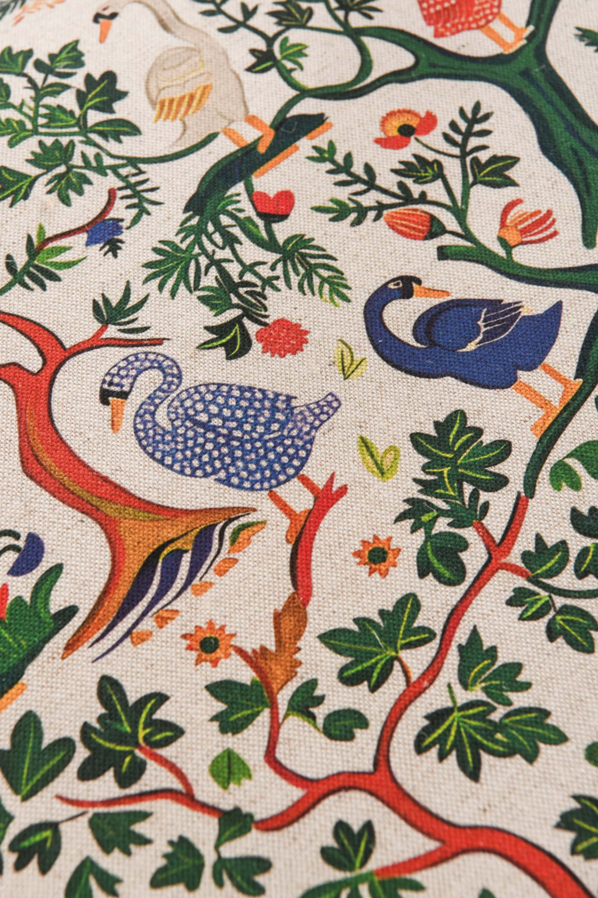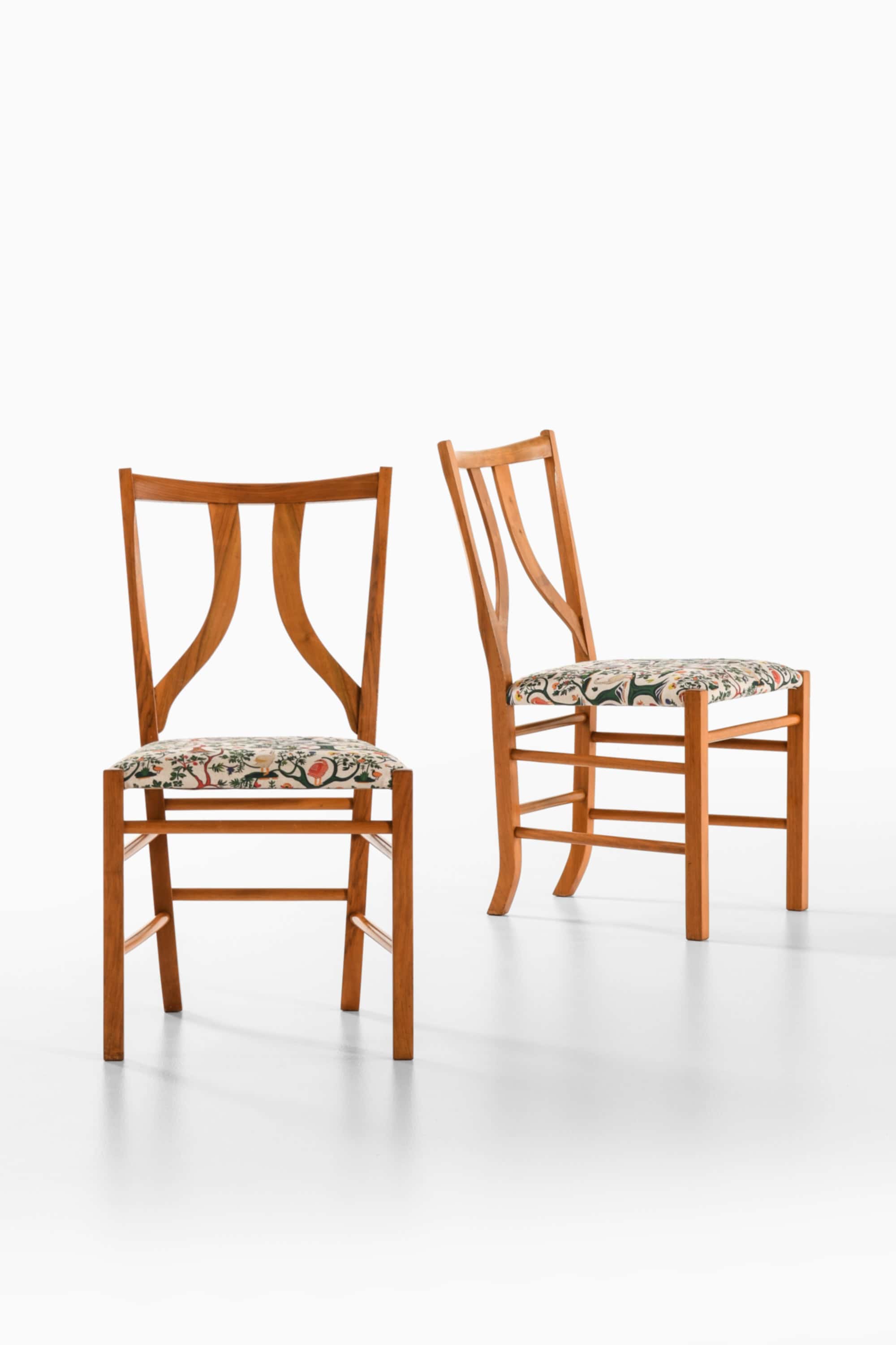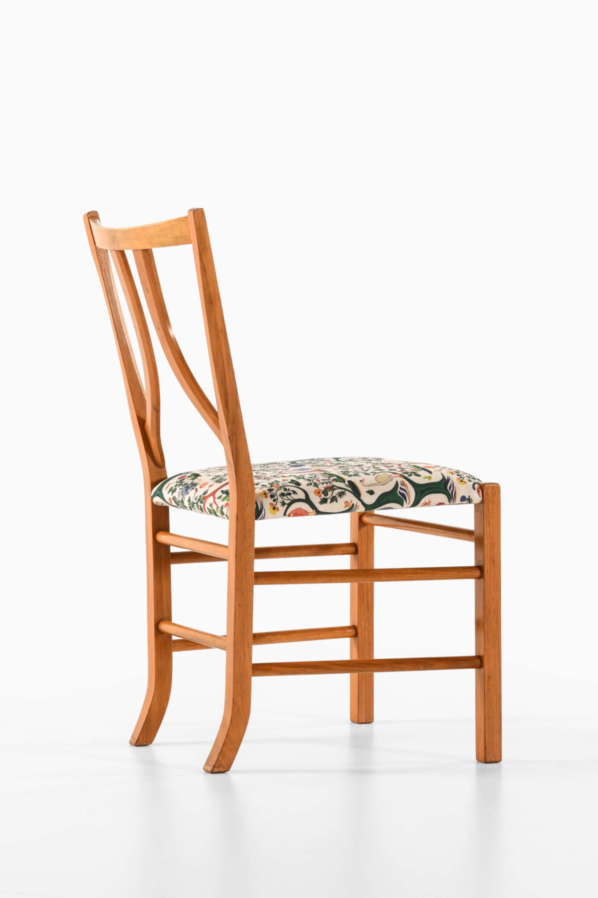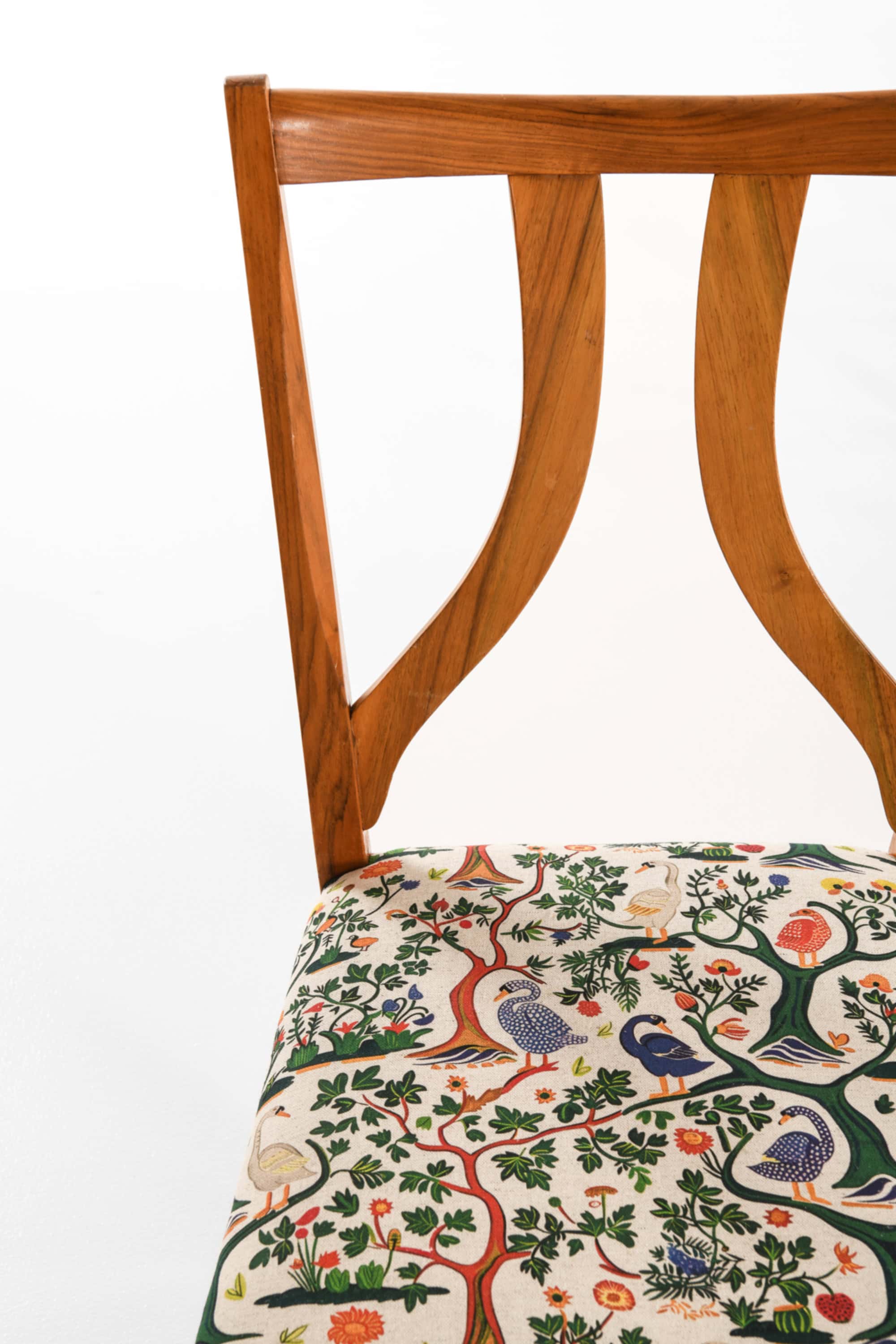 The upholstered seats retain a floral textile consistent with Svenskt Tenn’s decorative language. The pattern features stylized foliage, birds, and organic forms rendered in vivid colors on a neutral ground. This textile reflects Josef Frank’s interest in botanical and imaginative motifs, which he used to soften modern interiors and create environments defined by warmth and visual richness. The padding provides a firm yet comfortable seating surface suitable for daily use.