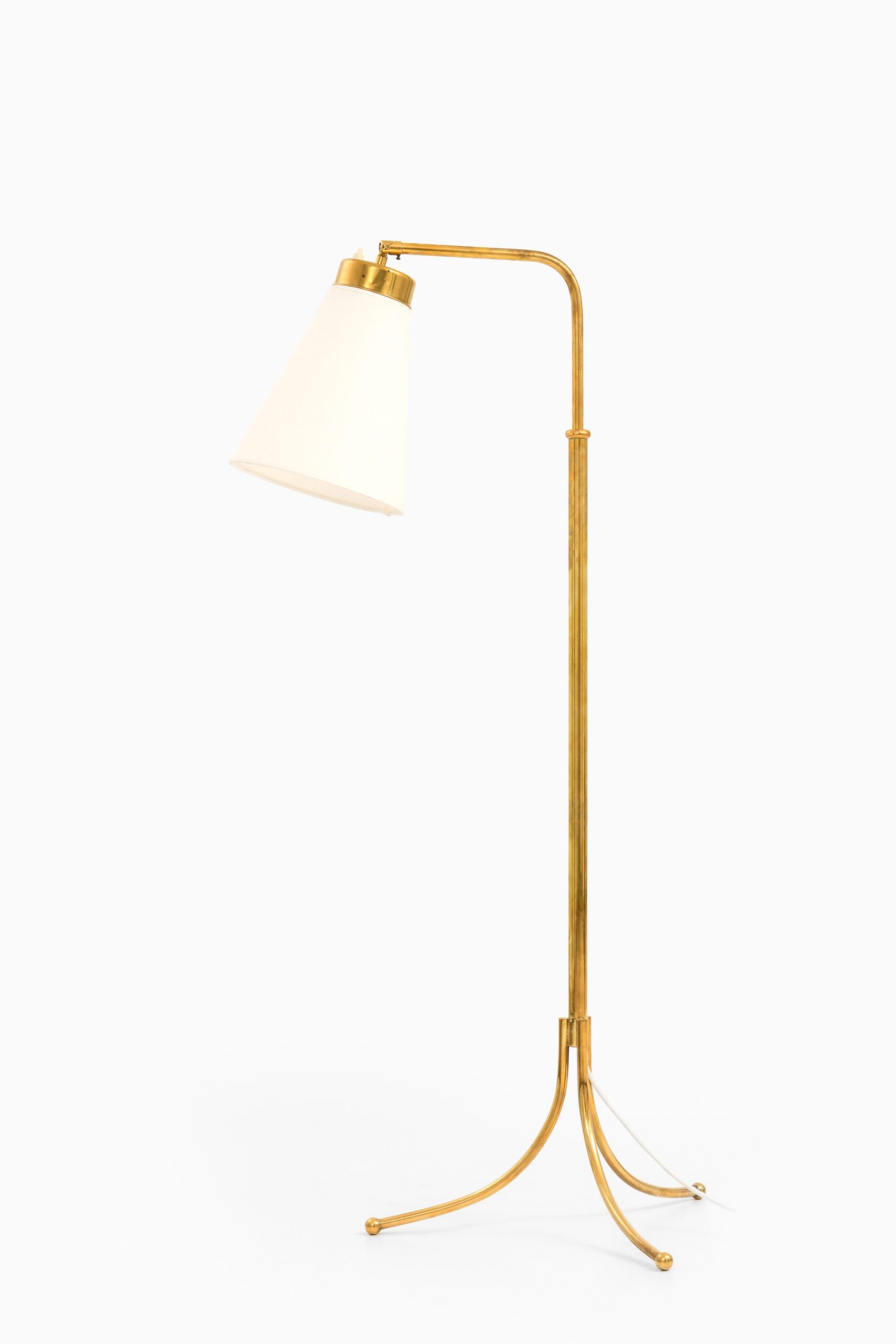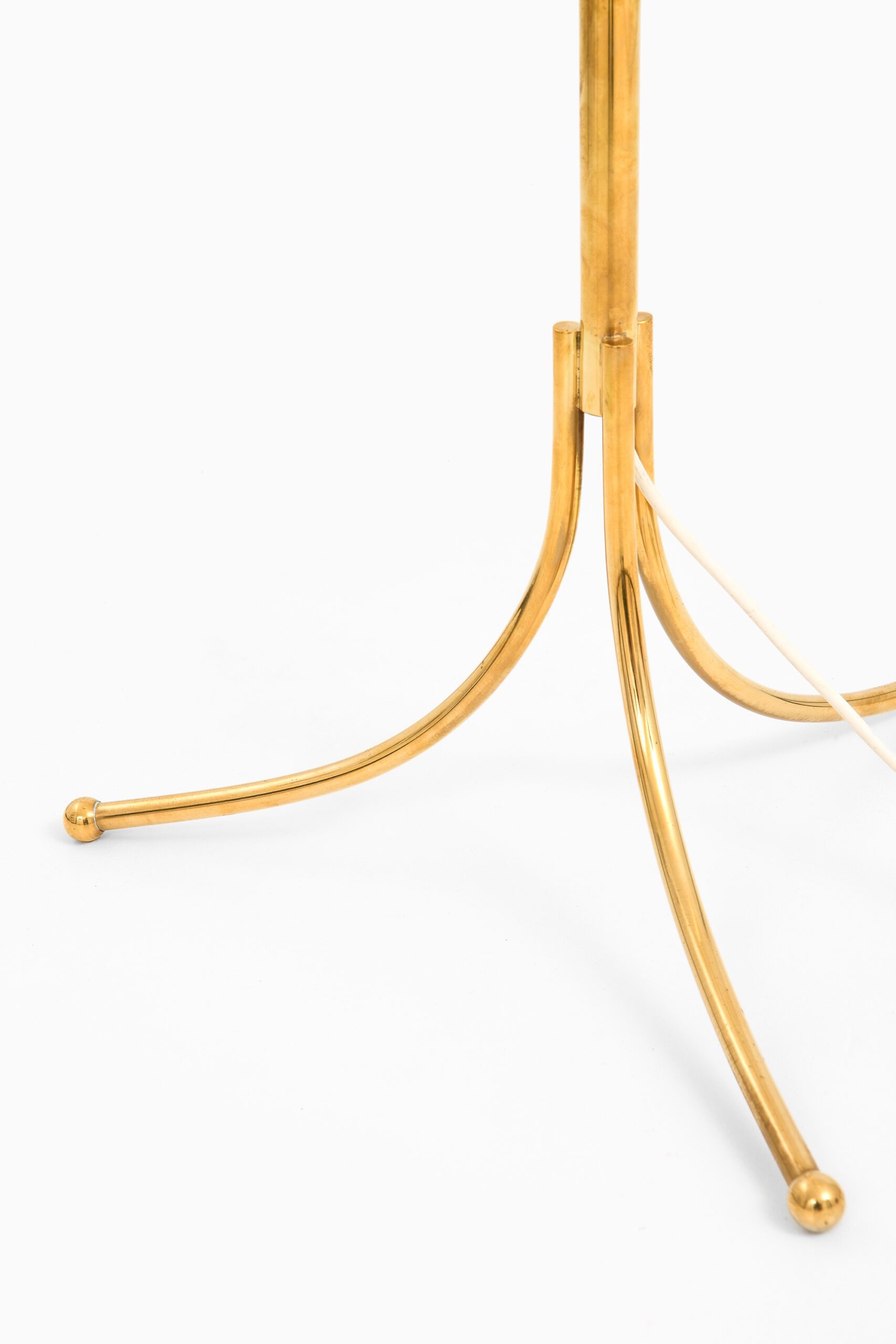 This floor lamp, model 1842, was designed by Josef Frank and produced by Svenskt Tenn in Sweden during the 1950s. Crafted entirely from brass, the lamp exemplifies the elegant yet functional aesthetic central to Scandinavian mid-century design. Its structure features a slender central rod with a gracefully curved upper section that supports the lampshade holder. Stability and sculptural refinement are provided by a base composed of four outwardly curved legs ending in small rounded feet.