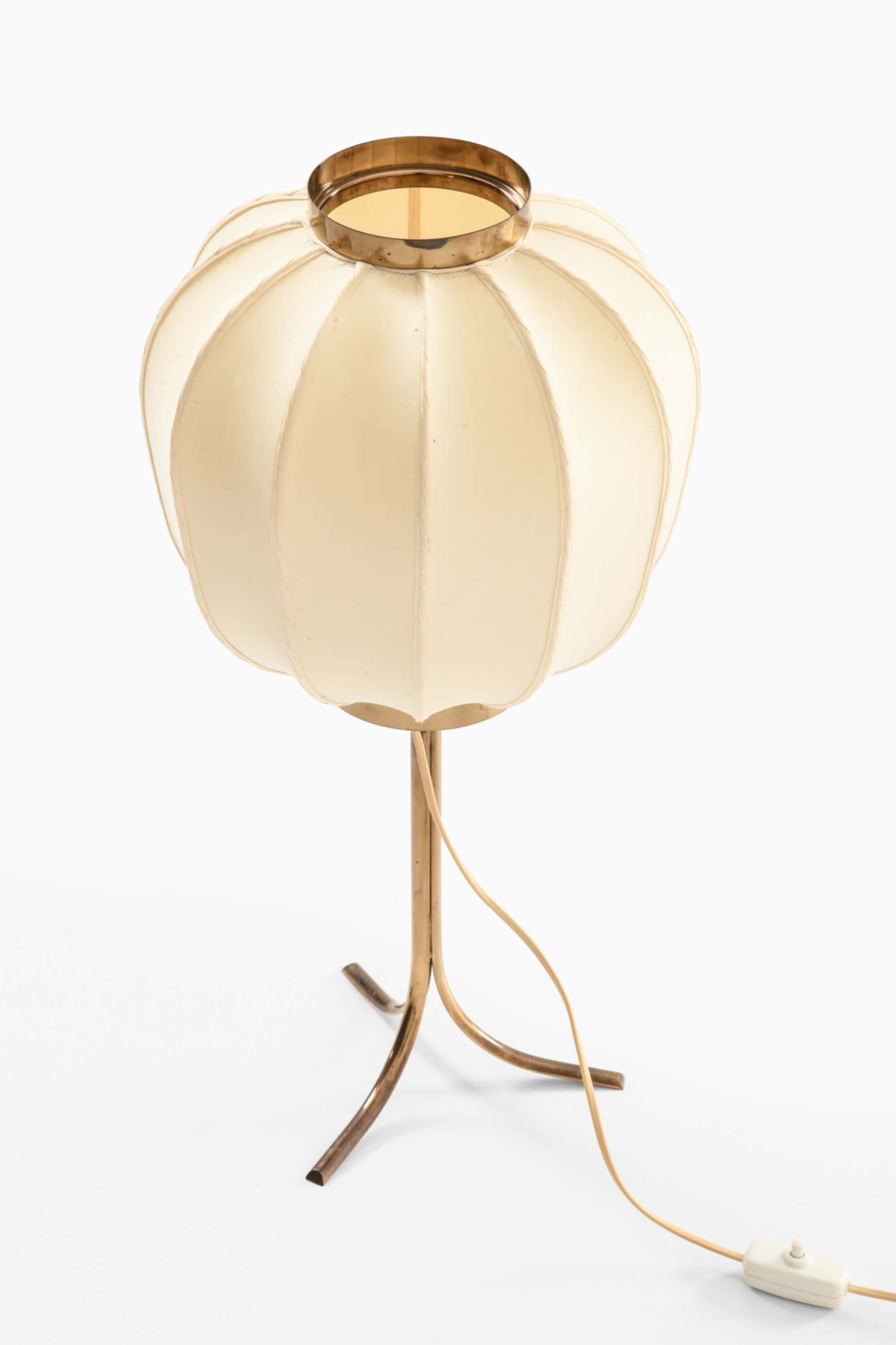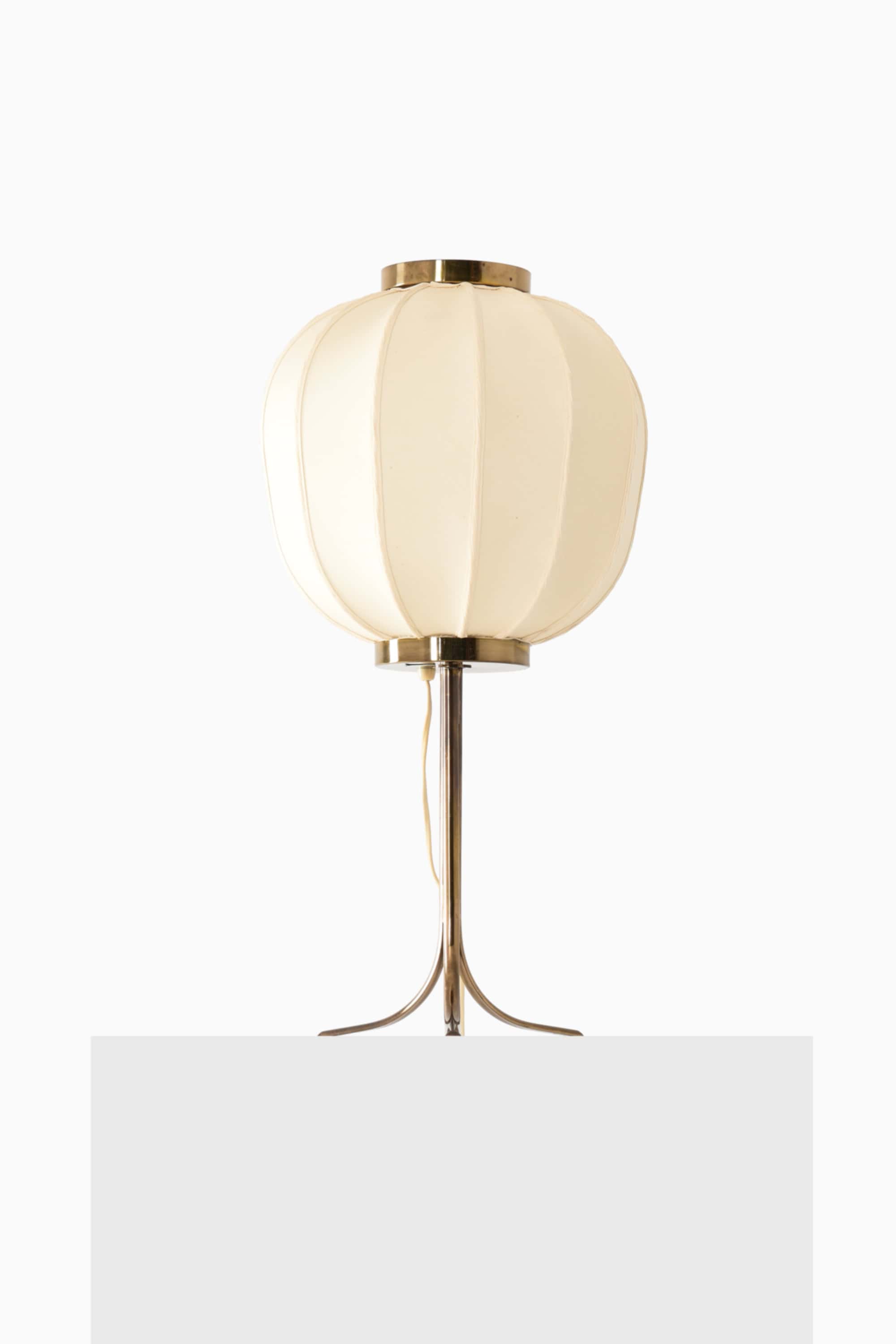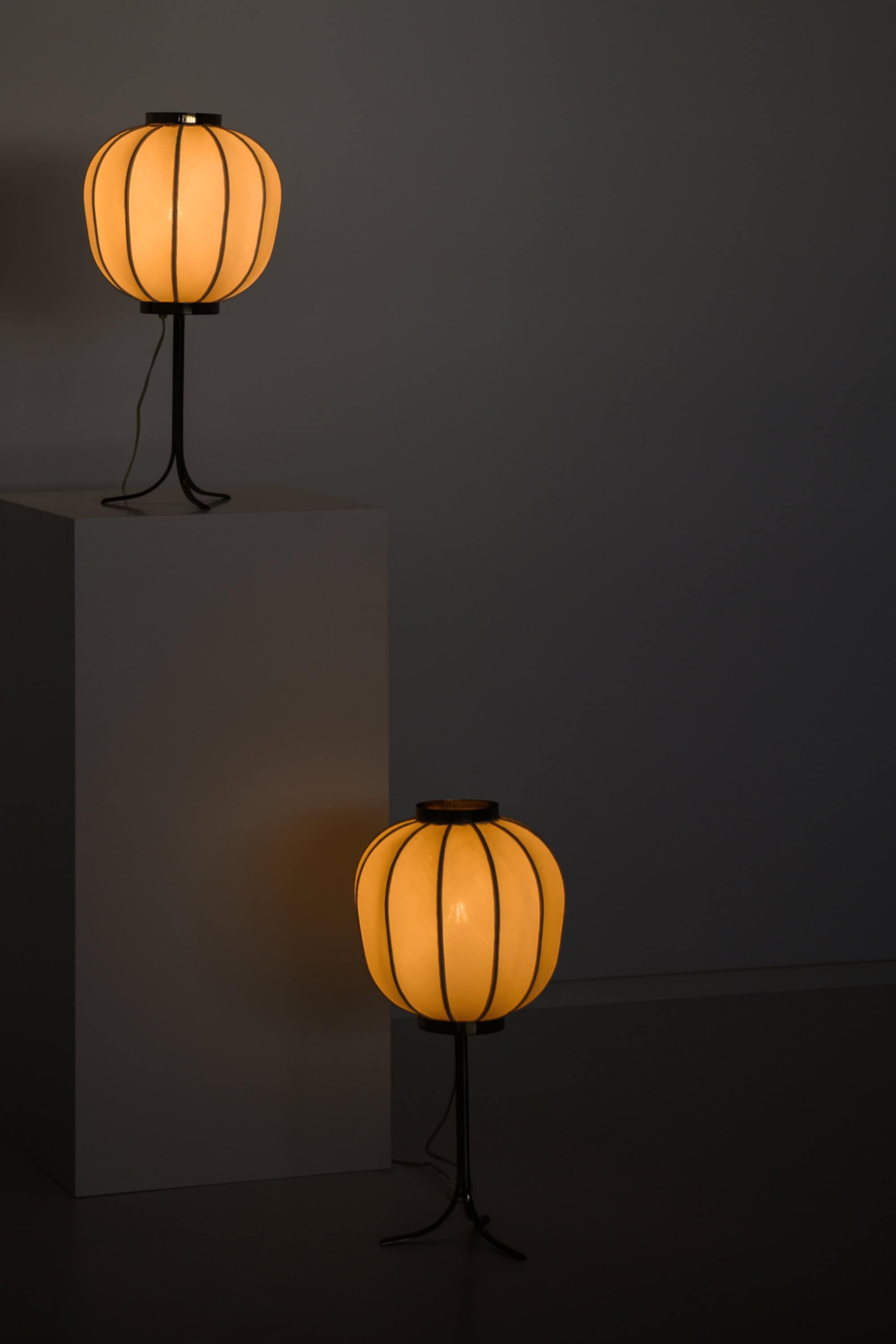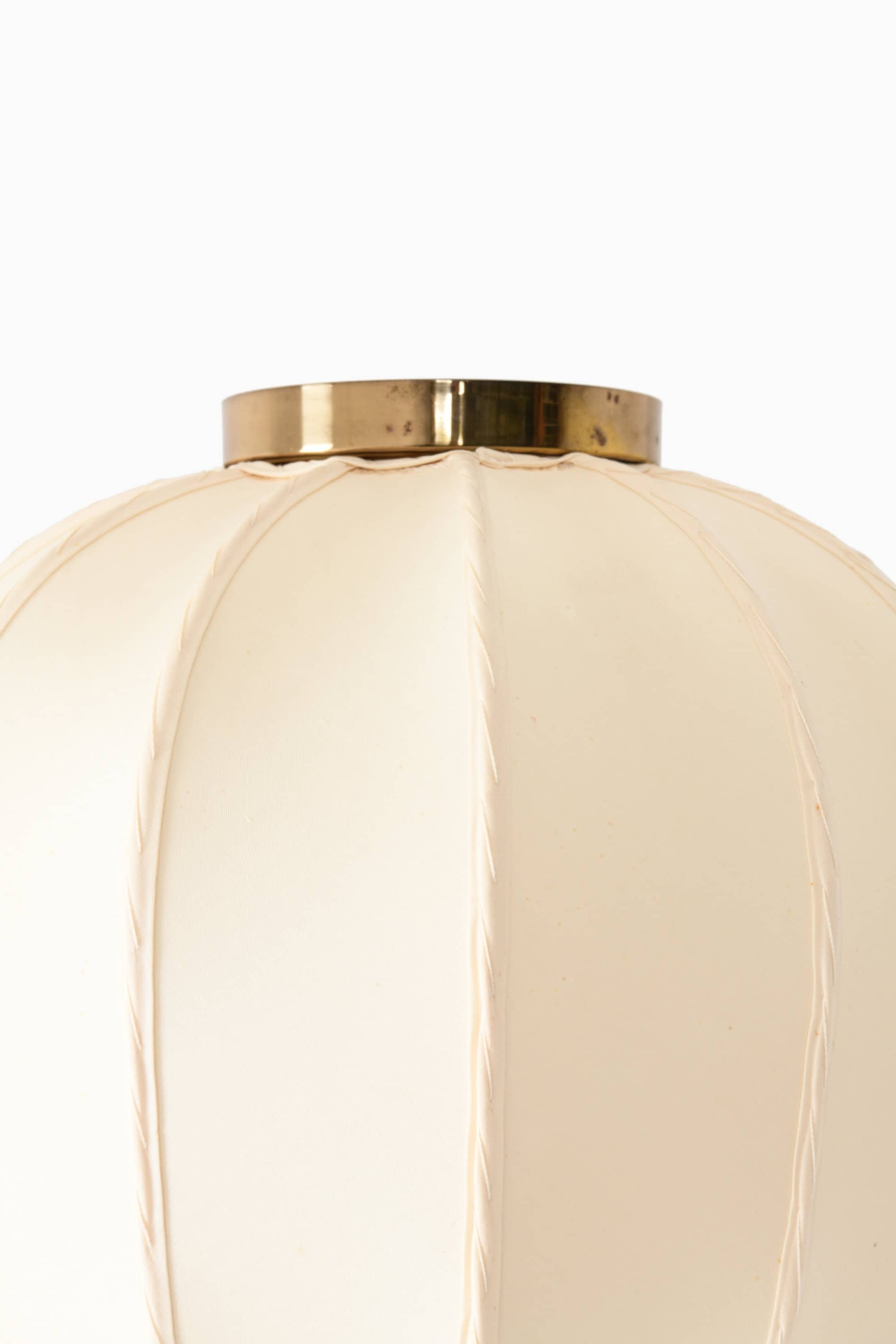 Each lamp has a rounded, lantern-like shade formed by gently curved vertical seams that define the silhouette. The cream-colored silk is stretched over an internal frame and detailed with delicate piping along each segment, producing a sculptural form that diffuses light evenly. The brass elements, including the upper and lower rings and the slender tripod base, show a natural patina consistent with age and use. The design demonstrates Josef Frank’s sensitivity to organic form and his belief that lighting should create a warm and intimate atmosphere.