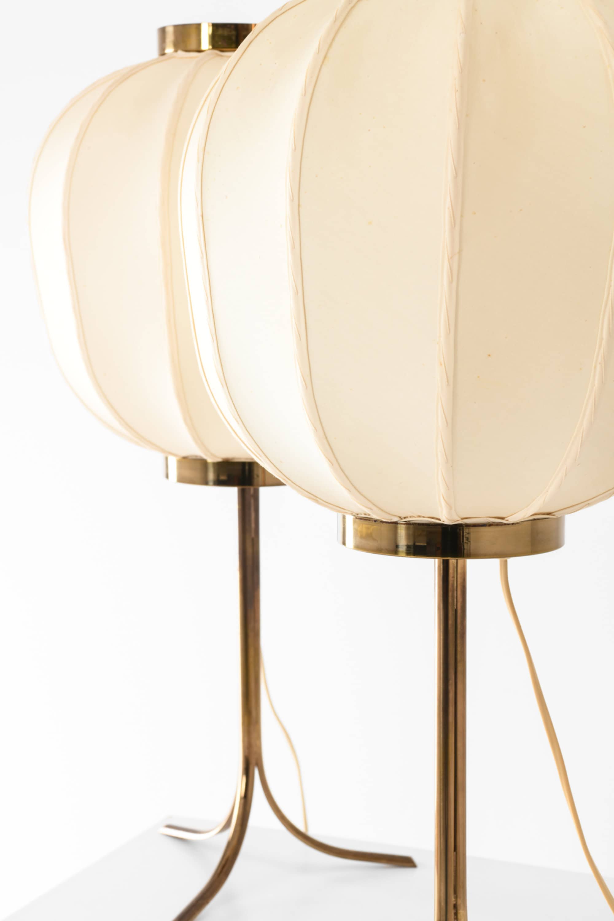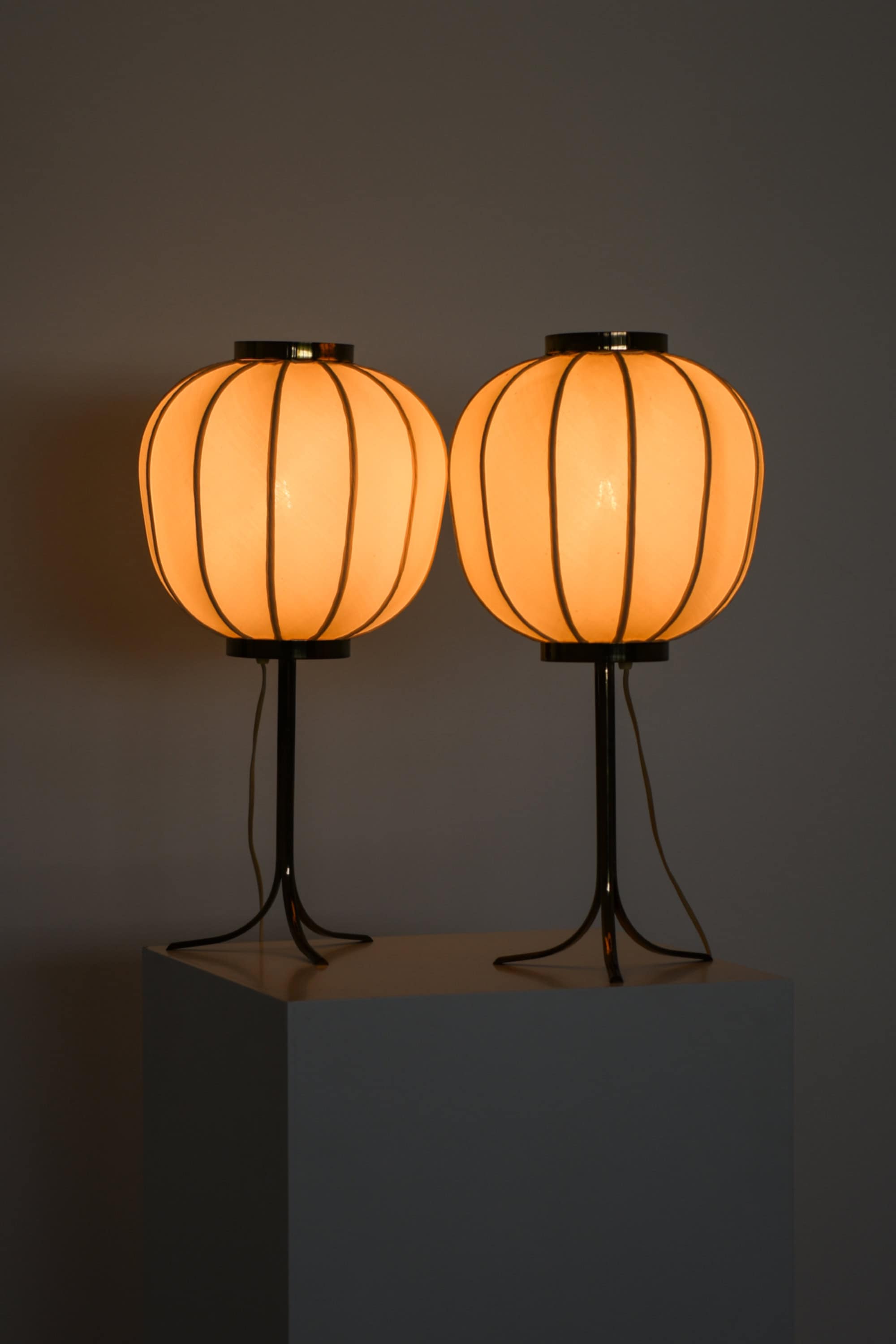 The lamps are in good vintage condition with signs of age and patina on the brass surfaces. The silk shades show minor, natural wear consistent with age but retain their original structure and tone. When lit, the lamps emit a warm, diffused glow that enhances their sculptural presence.