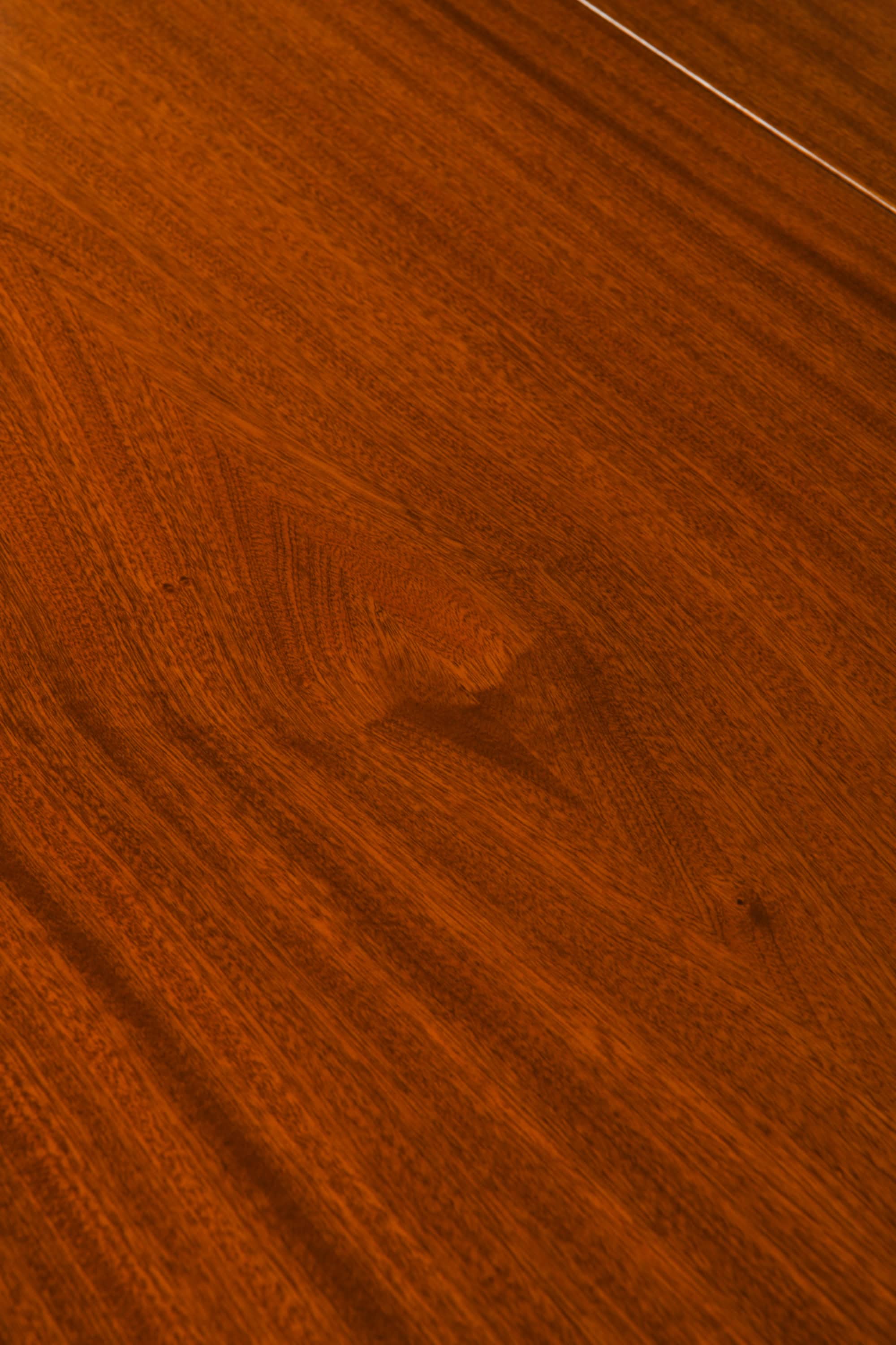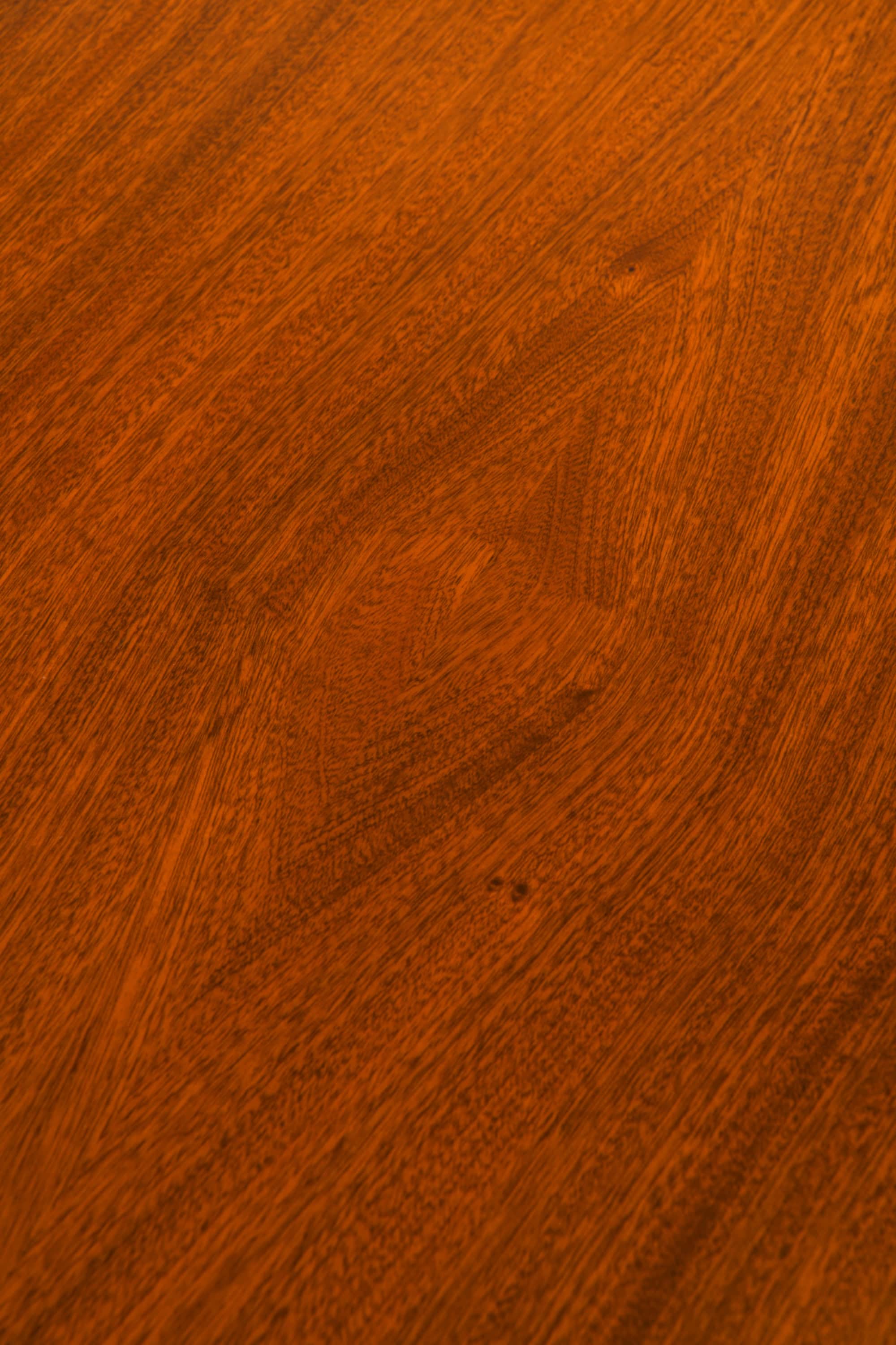 The table has been refinished in a matte lacquer that enhances the natural character of the mahogany while maintaining a historically appropriate surface. It is in good condition with signs of usage and patina consistent with age, including minor wear to edges and light surface markings.