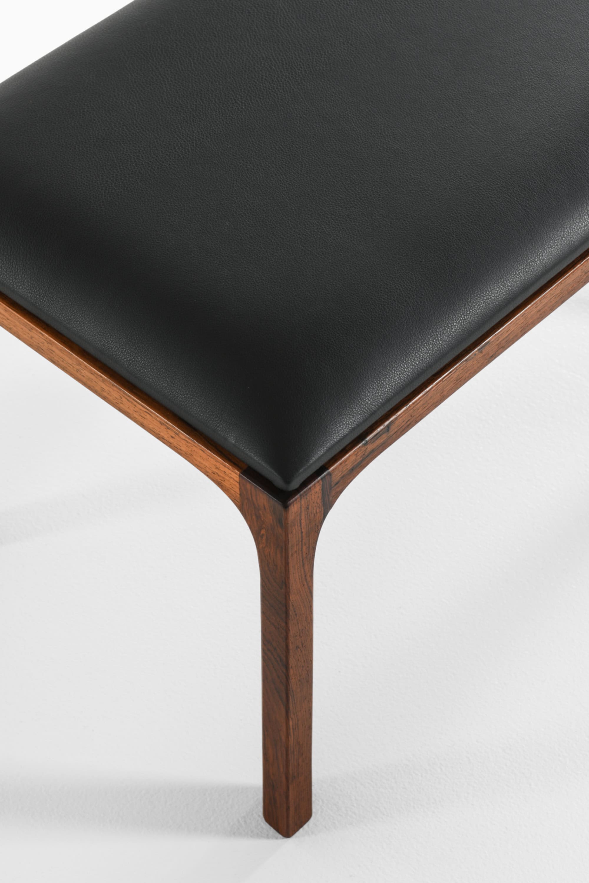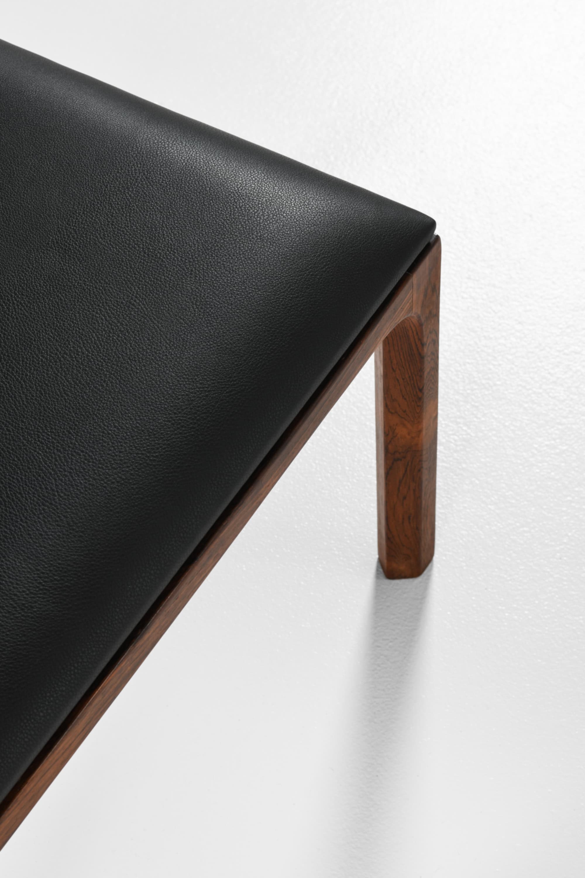 The frame is executed in rosewood, a material admired for its deep, variegated grain and rich reddish-brown color with darker linear patterns. The surface finish brings out the natural luster of the wood while maintaining a matte, tactile quality. The seat has been newly reupholstered in black leather, introducing a sleek contrast to the warmth of the rosewood. The upholstery is executed with clean edges and a slightly rounded seat profile that provides comfort while preserving the geometric clarity of the overall form.