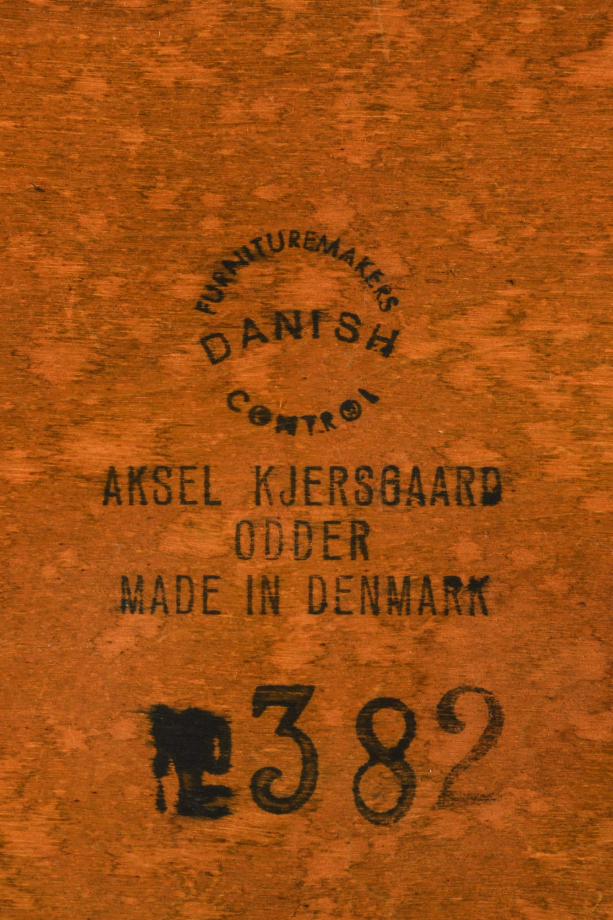 The stool’s structural design is marked by subtle curvature at the inner corners of the frame, a recurring feature in Kristiansen’s furniture that adds visual softness to an otherwise linear form. This detail demonstrates his sensitivity to both craftsmanship and ergonomics, aligning with the Danish design ethos of functional beauty. The piece bears the original branded marks beneath the frame, including “Aksel Kjersgaard, Odder, Made in Denmark” and the Danish Furnituremakers Control stamp, ensuring authenticity and quality verification. It is numbered 382, referring to the model designation within the Kjersgaard catalogue.
