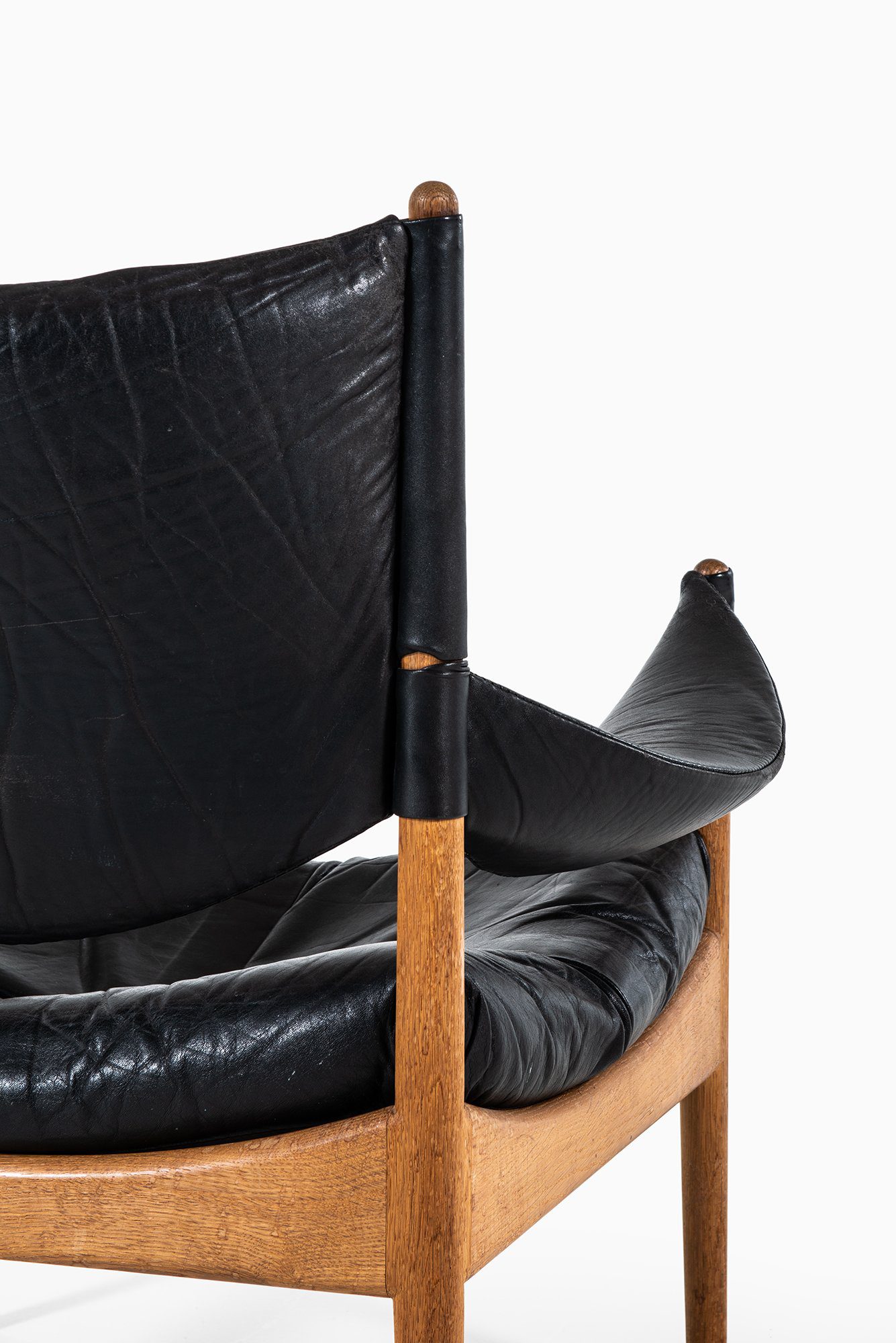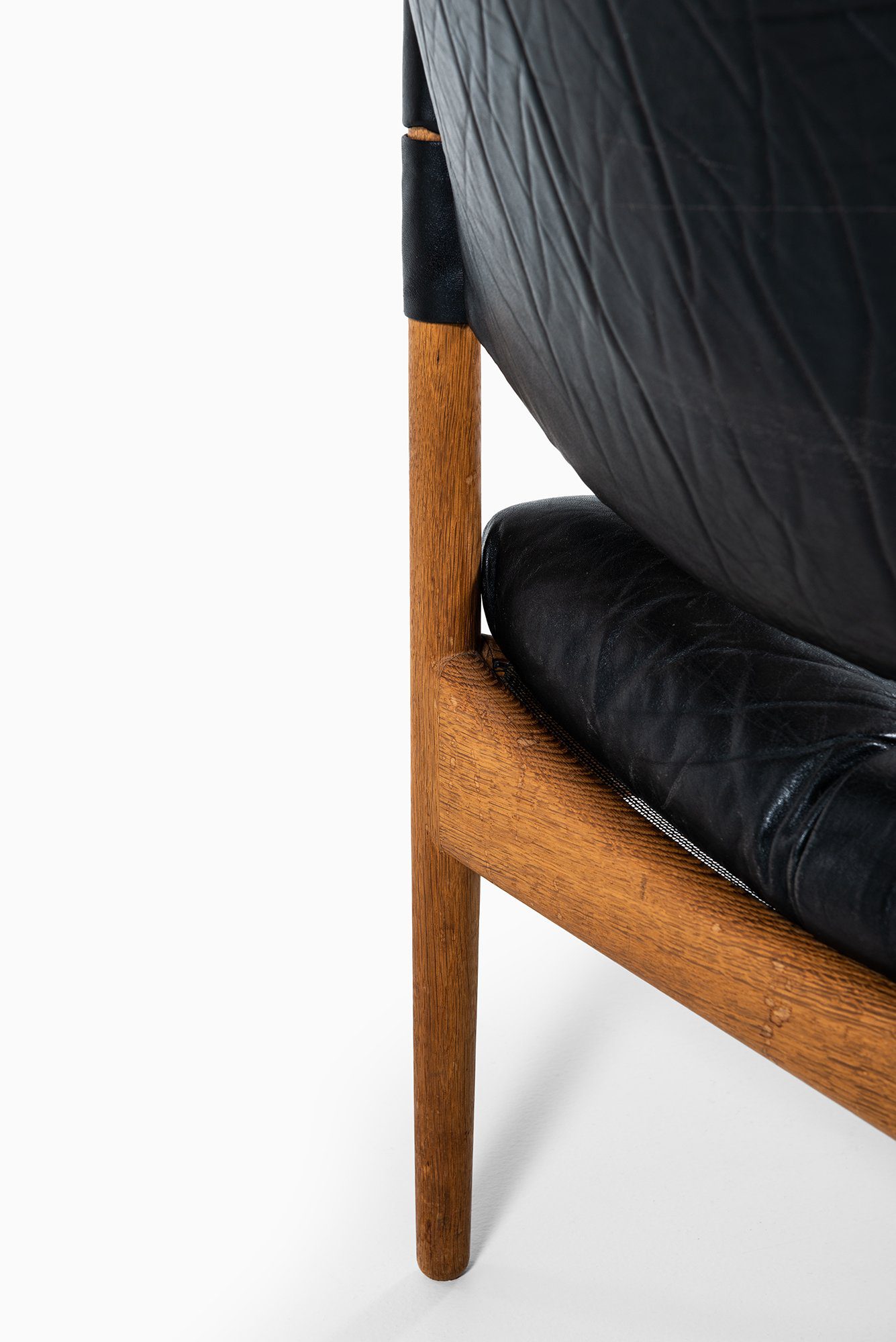 The chairs retain their original black leather upholstery, which has developed a natural patina consistent with age and use. The leather shows gentle creasing and surface wear, particularly in the seating areas, without tears or structural damage. The oak frames are in good vintage condition, with minor surface marks and a warm, even tone that highlights the grain. Overall, the chairs present as well-preserved examples with small signs of usage appropriate to their age.