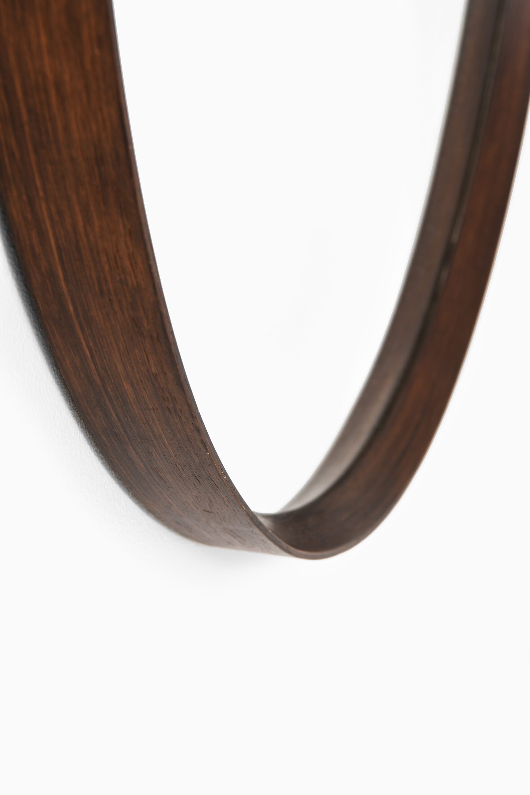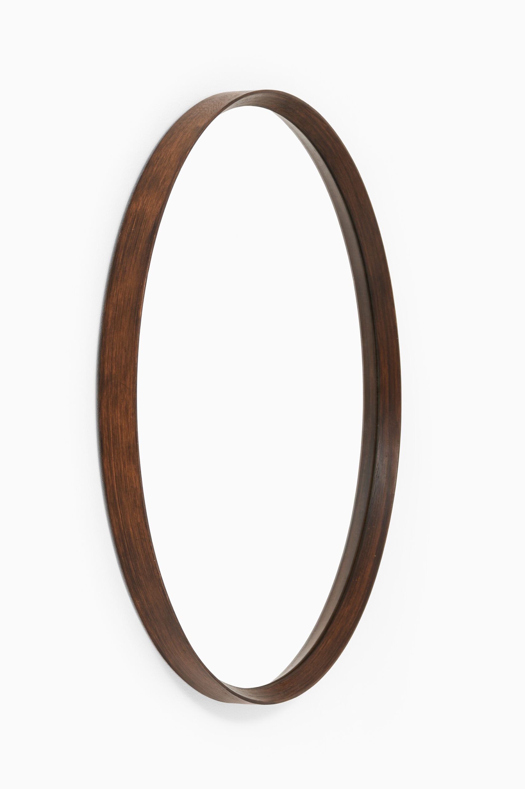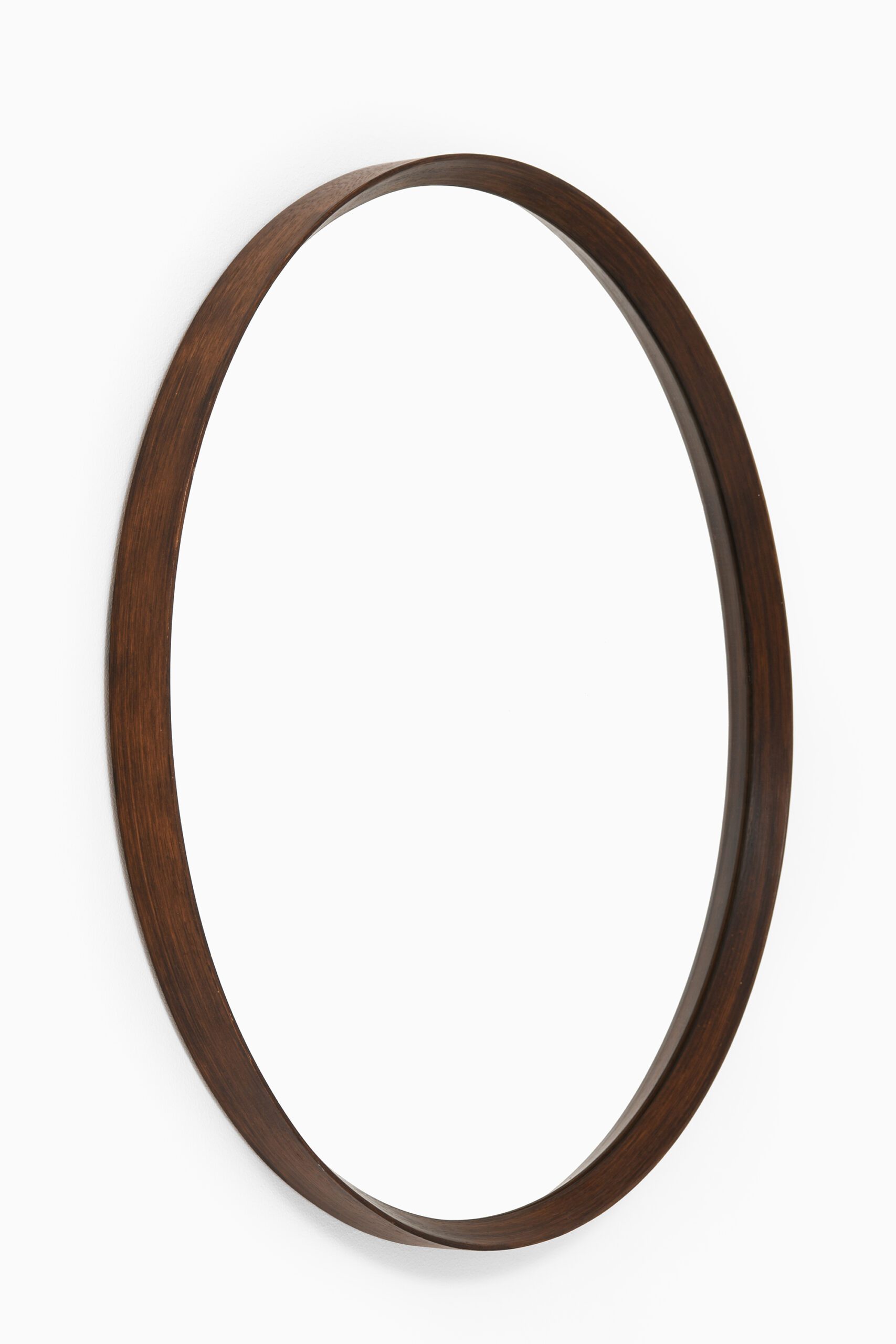 This large round mirror, produced in Denmark during the 1950s, is a notable example of mid-century Scandinavian design, emphasizing clean lines, quality materials, and functional simplicity. The frame is crafted from rosewood, a highly valued hardwood recognized for its rich color variations and distinctive grain patterns. Its gently curved, continuous form showcases the precision woodworking typical of Danish craftsmanship.