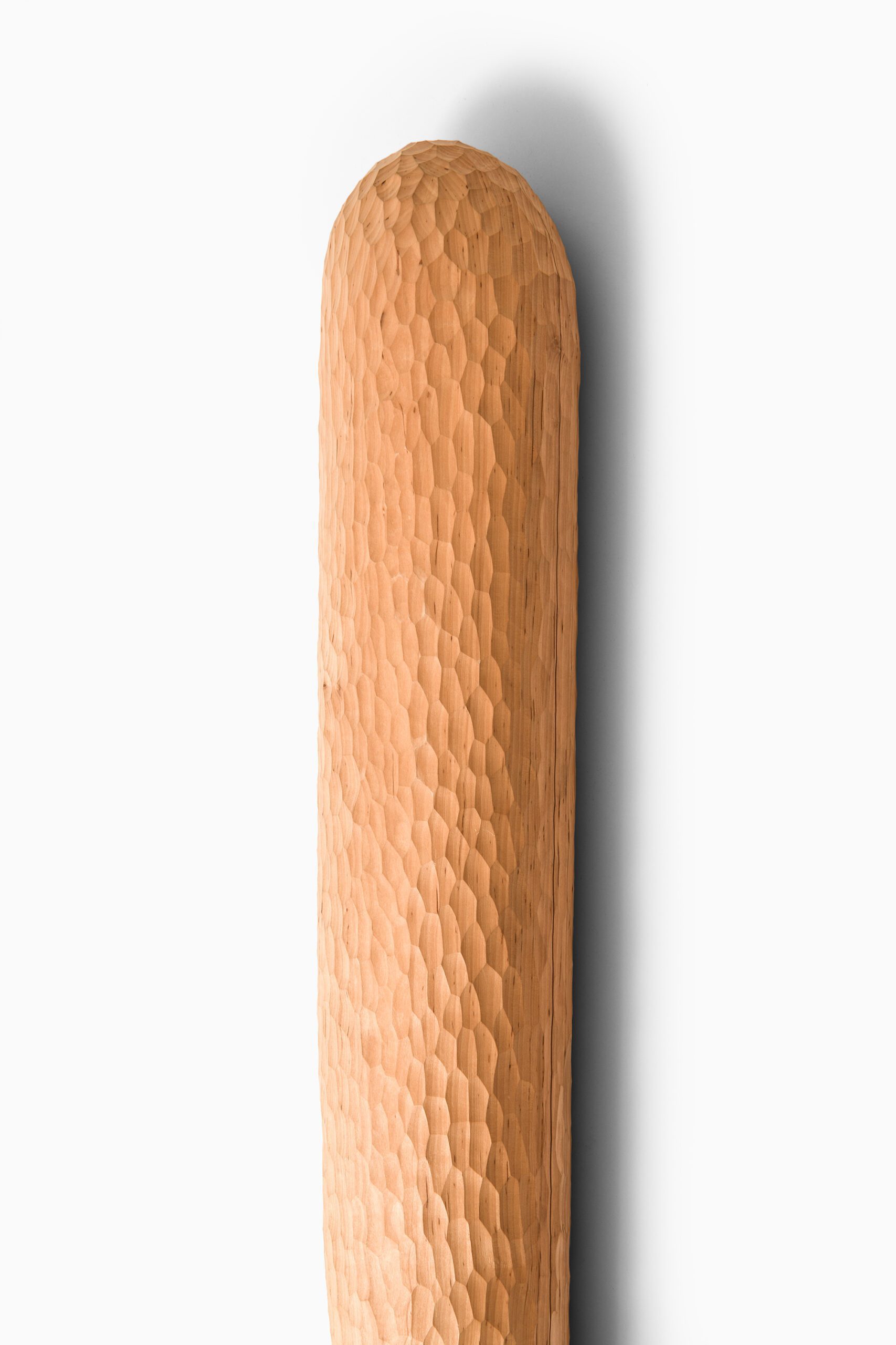 The exterior of the “Baelg” cabinet is defined by an elongated, capsule-shaped form, characterized by organic curves and a textured honeycomb-like surface. The hand-carved detailing adds a distinctive tactile element to the piece, making it visually captivating while also enhancing its natural, raw texture. The pale, natural hues of linden and alder contribute to a warm, subtle elegance, further accentuating the purity of Scandinavian design principles.