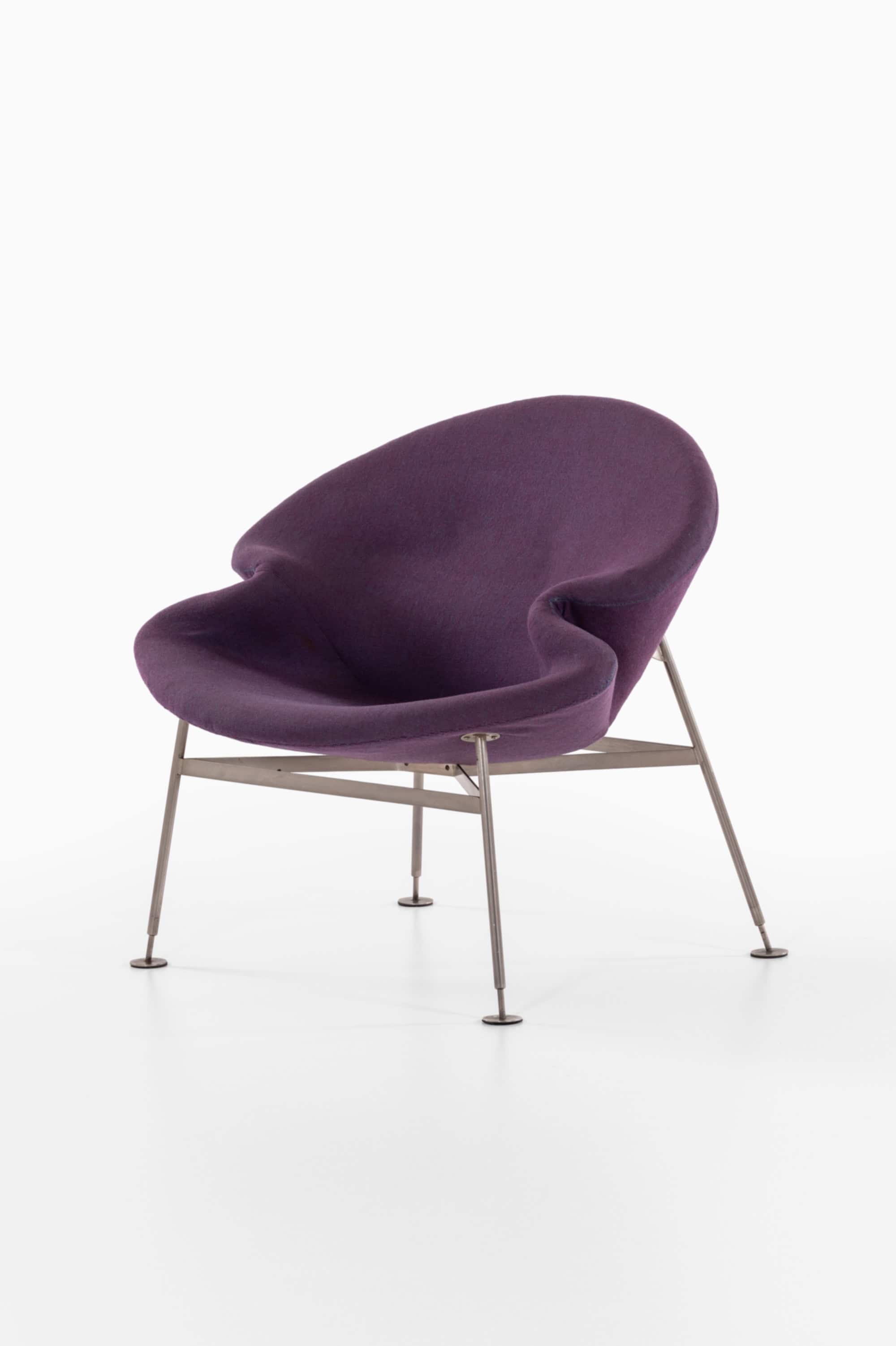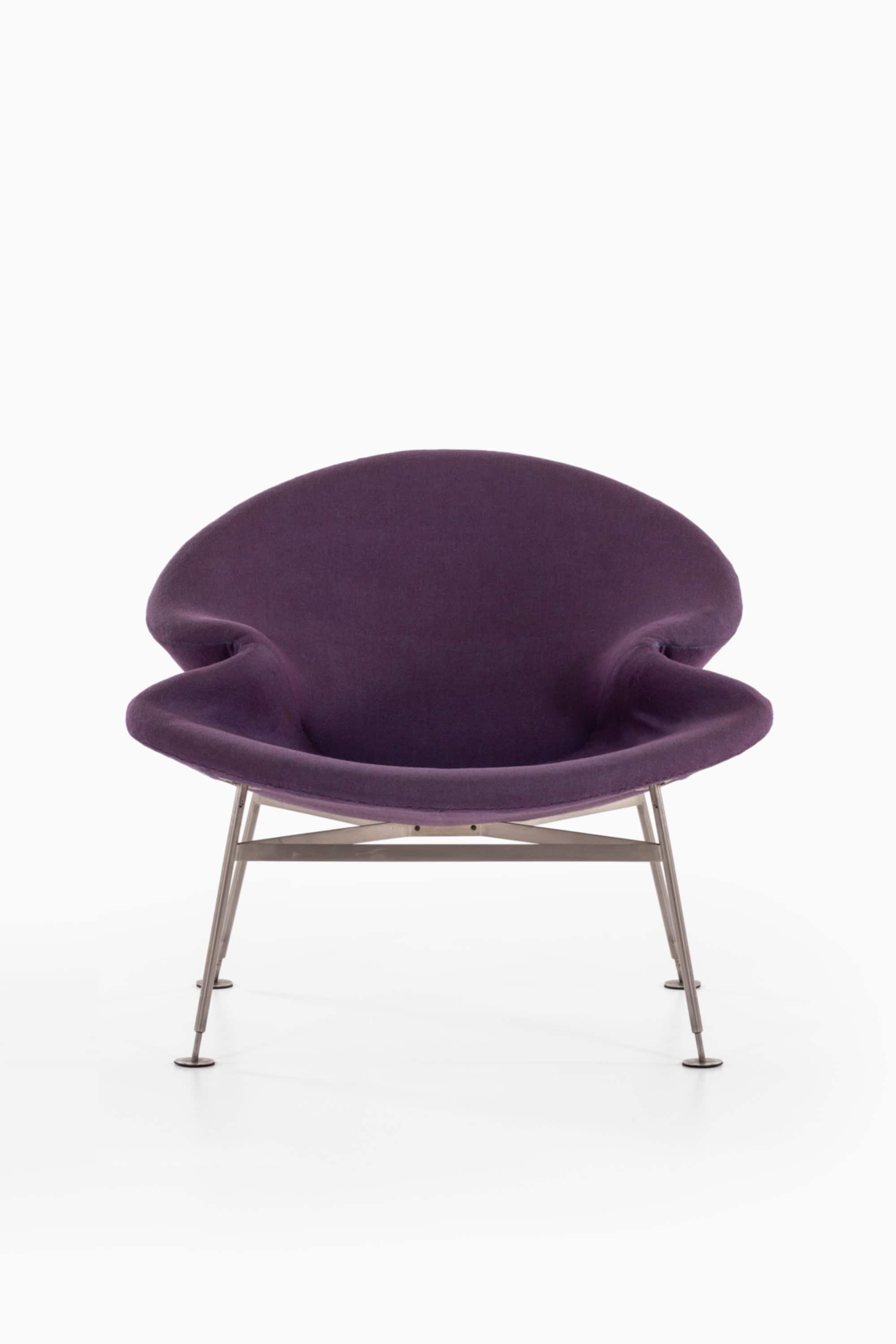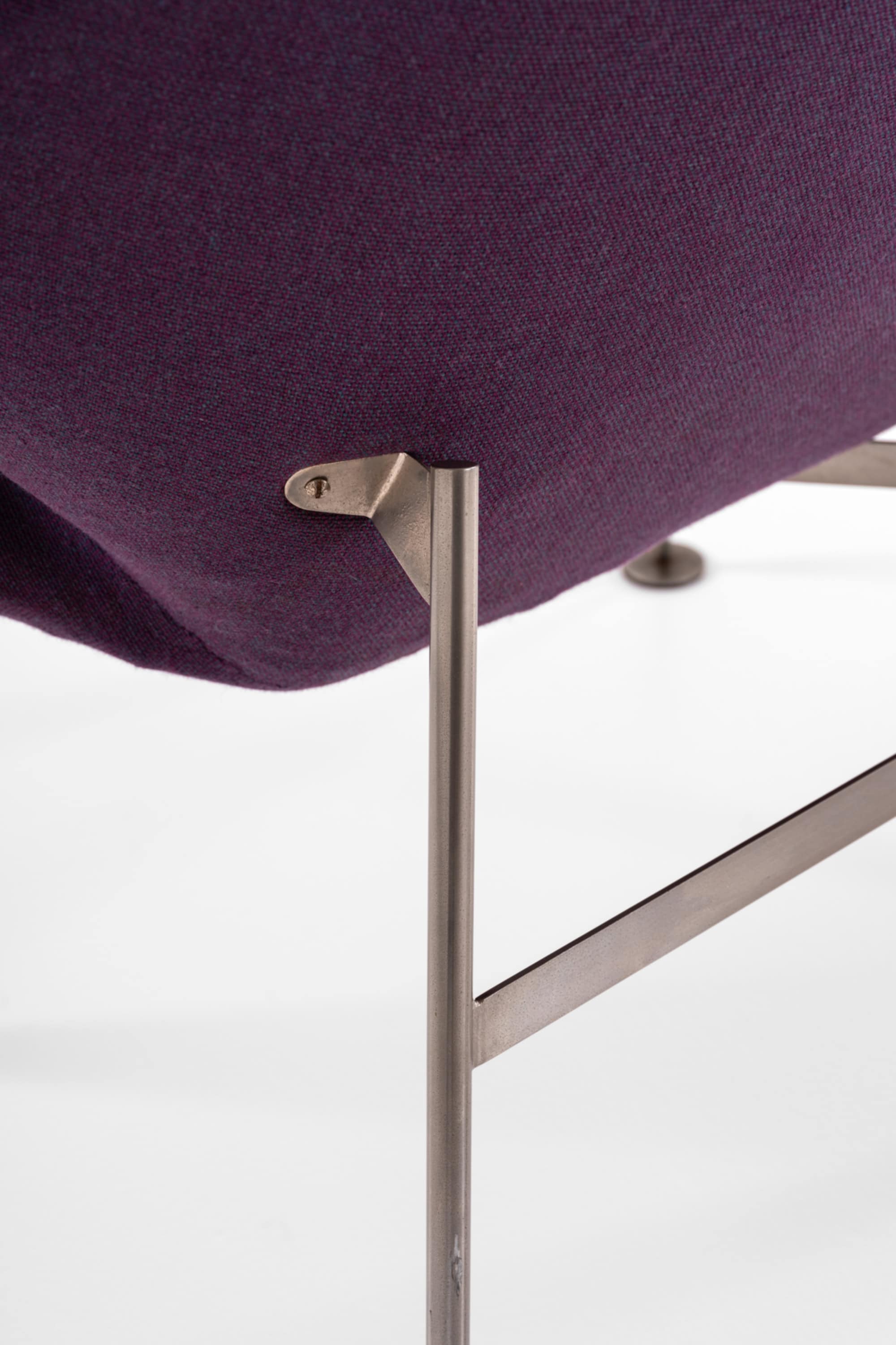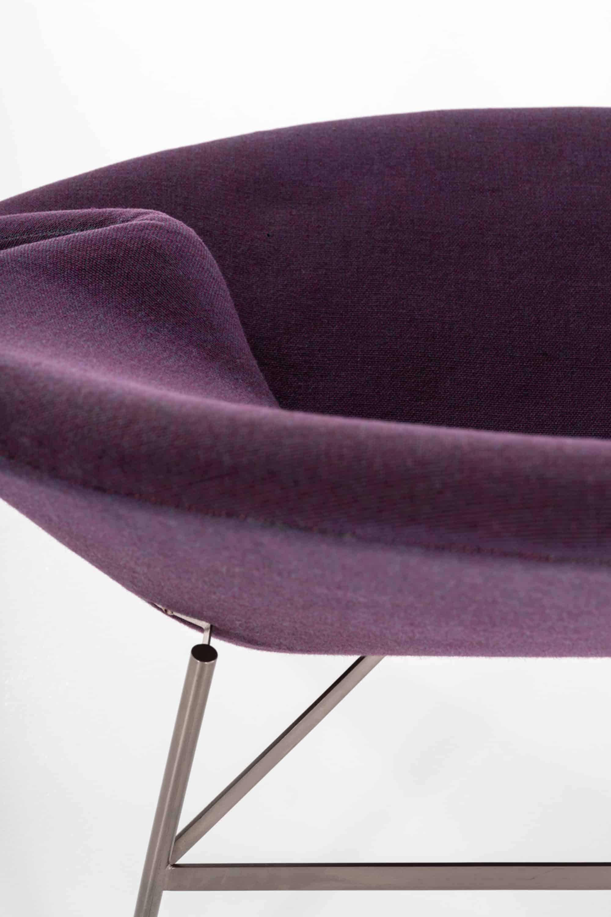 The seat is generously shaped with a softly curved, almost petal-like silhouette, giving the model its name. The flowing lines wrap around the sitter, forming integrated armrests that fold inward in a gentle, embracing gesture. The upholstery is executed in its original purple fabric, a rich and slightly muted tone that enhances the chair’s sculptural presence while adding depth and warmth. The textile shows a fine, even weave and a subtle texture that complements the rounded contours of the form.