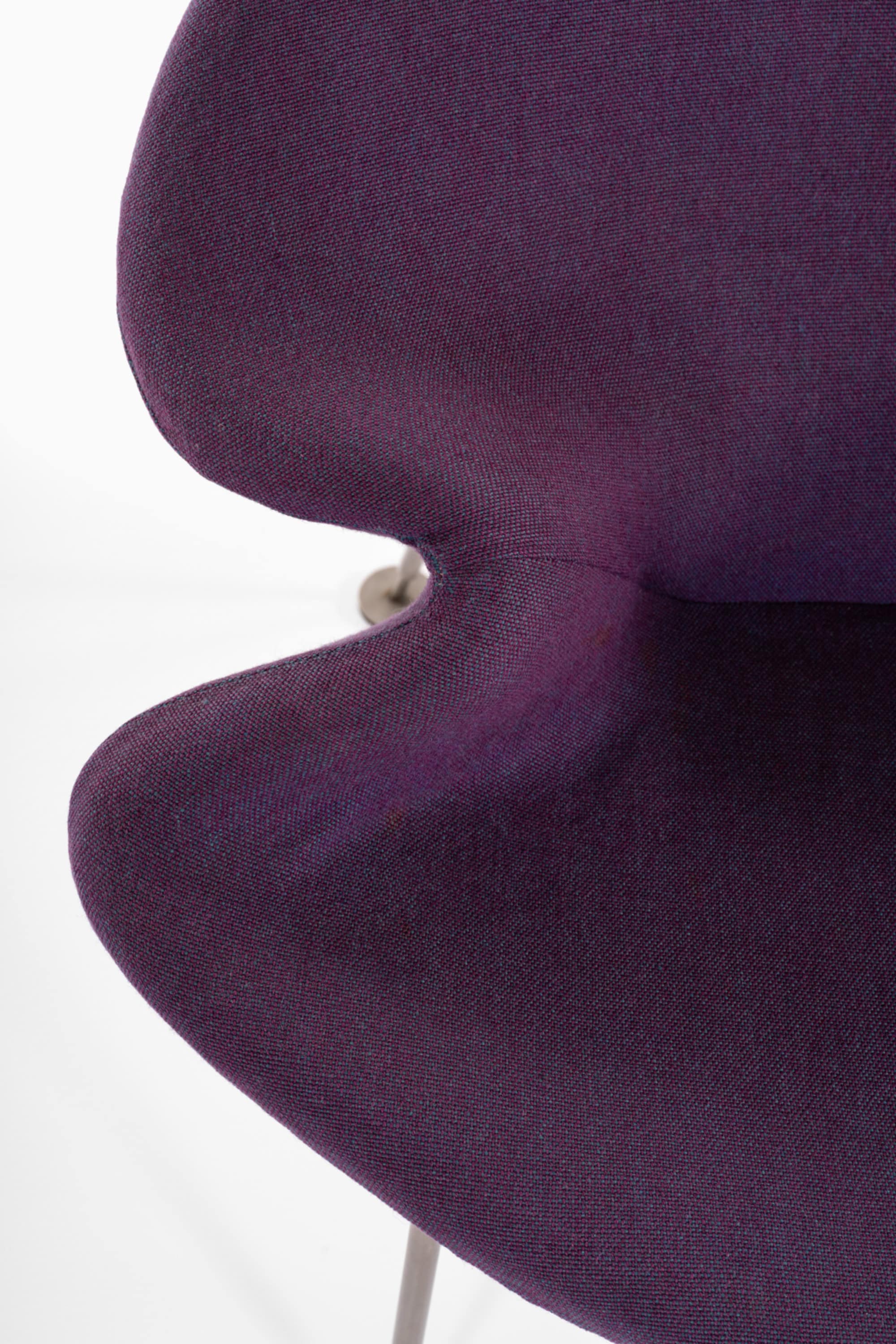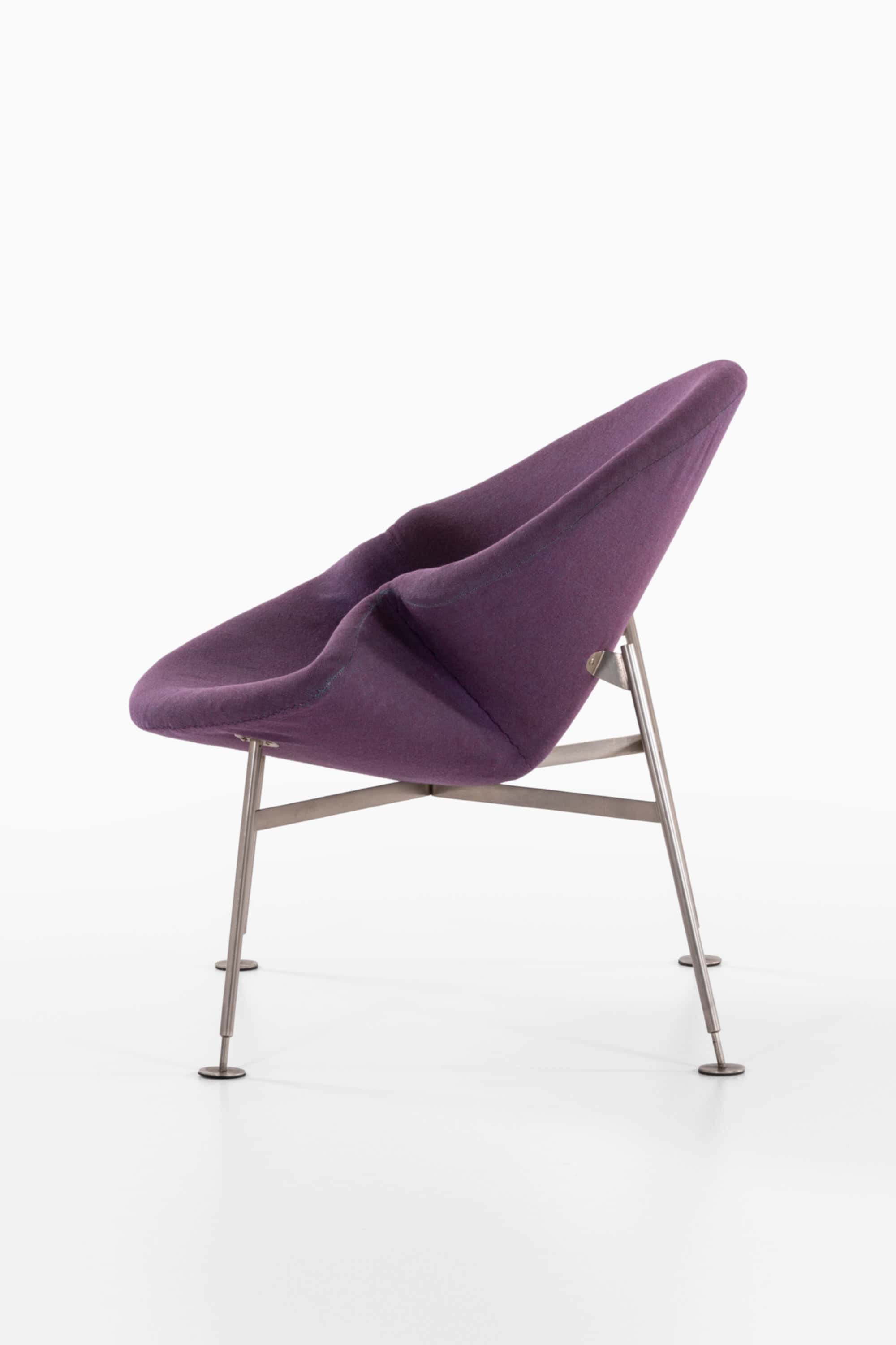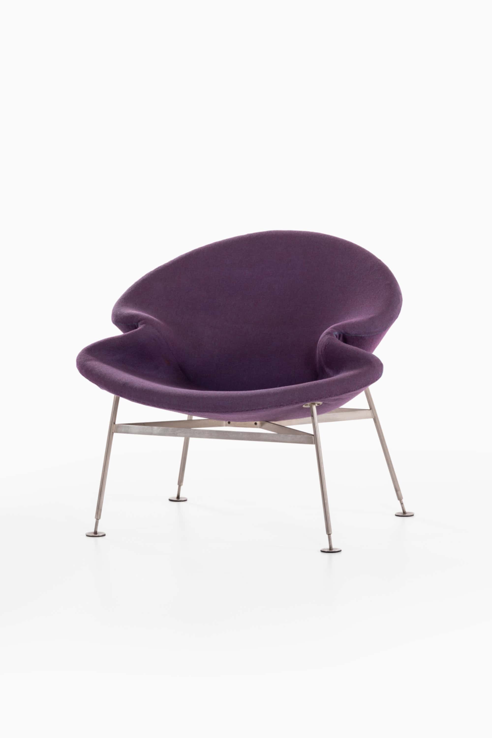 The seat is generously shaped with a softly curved, almost petal-like silhouette, giving the model its name. The flowing lines wrap around the sitter, forming integrated armrests that fold inward in a gentle, embracing gesture. The upholstery is executed in its original purple fabric, a rich and slightly muted tone that enhances the chair’s sculptural presence while adding depth and warmth. The textile shows a fine, even weave and a subtle texture that complements the rounded contours of the form.