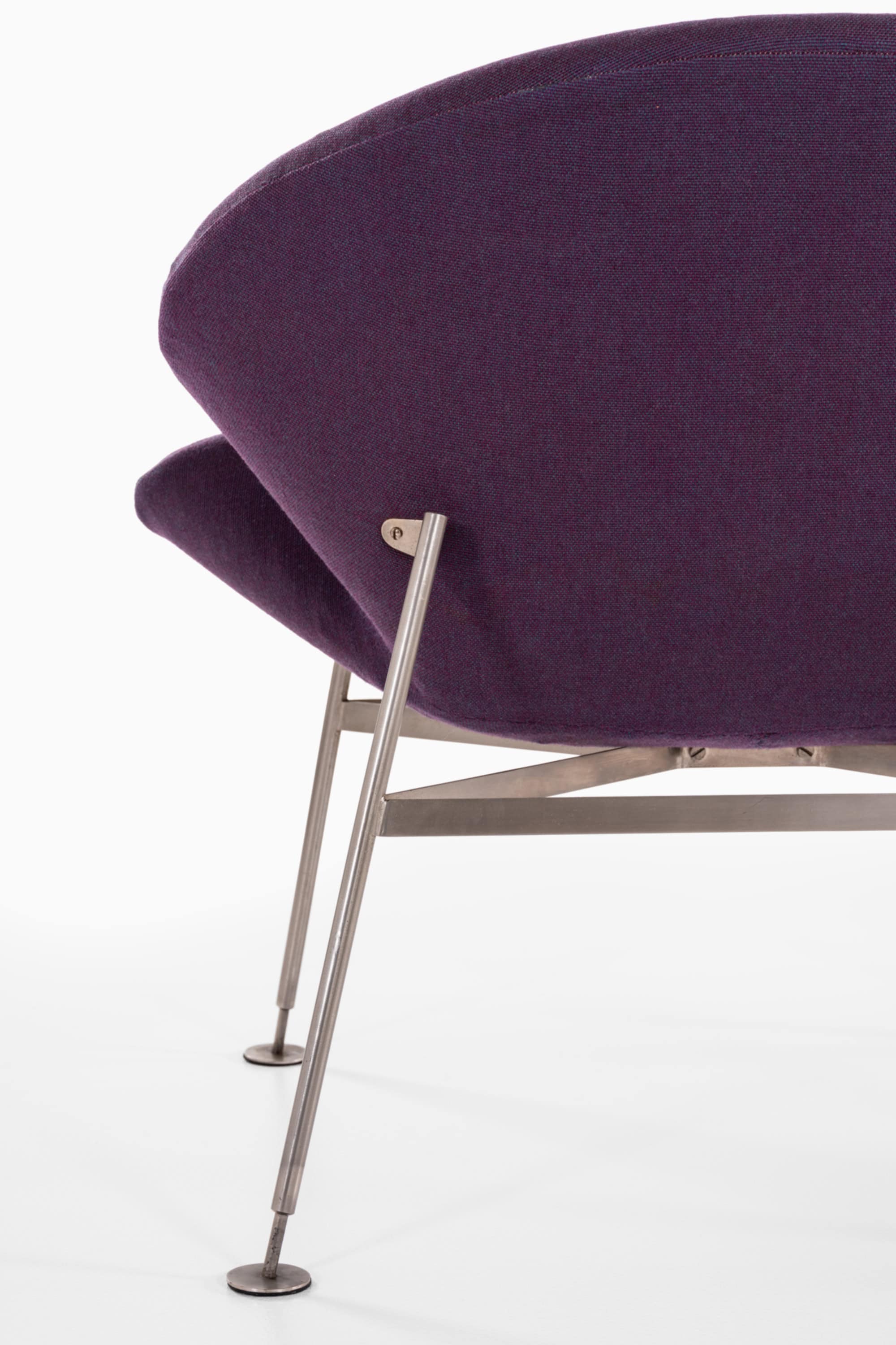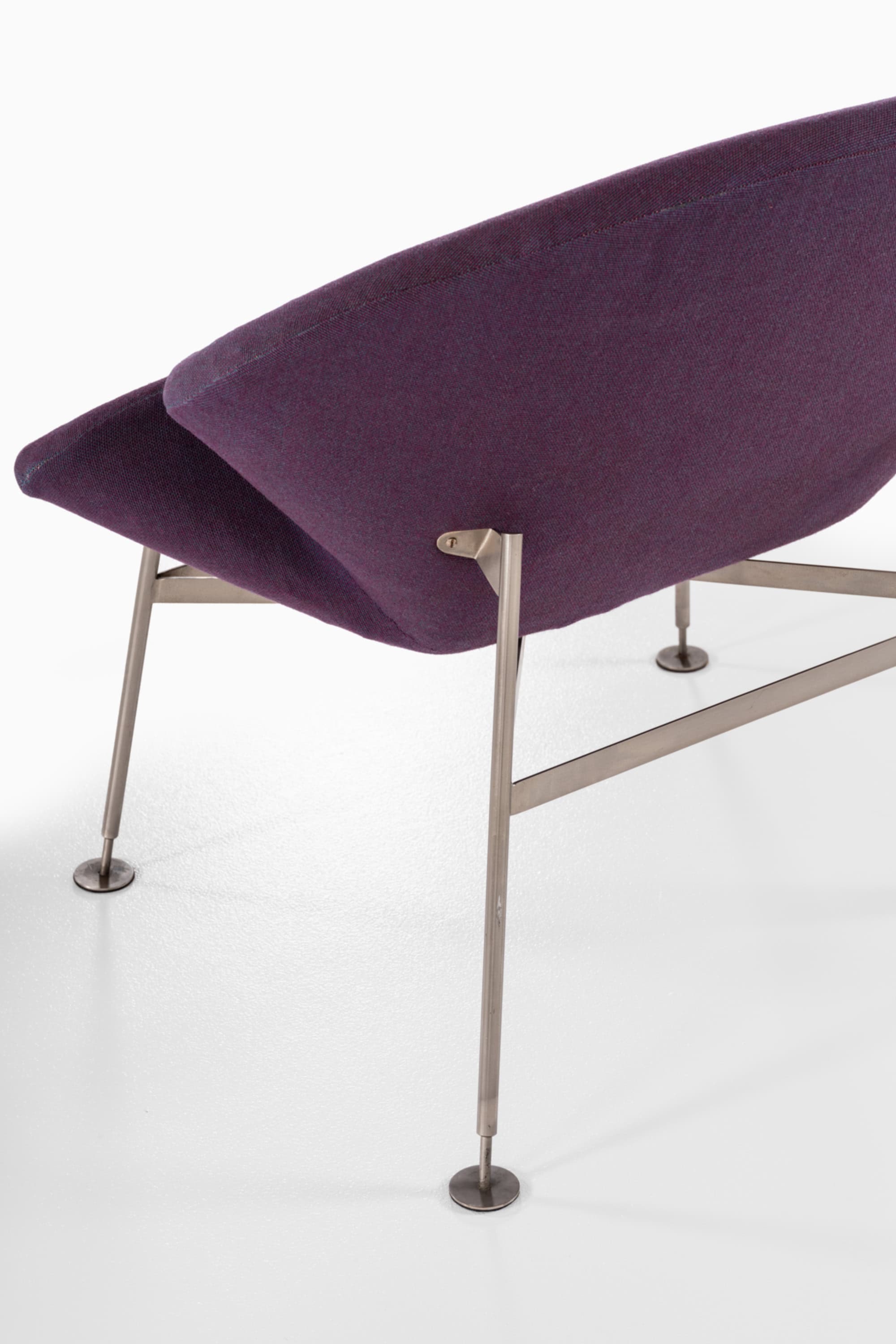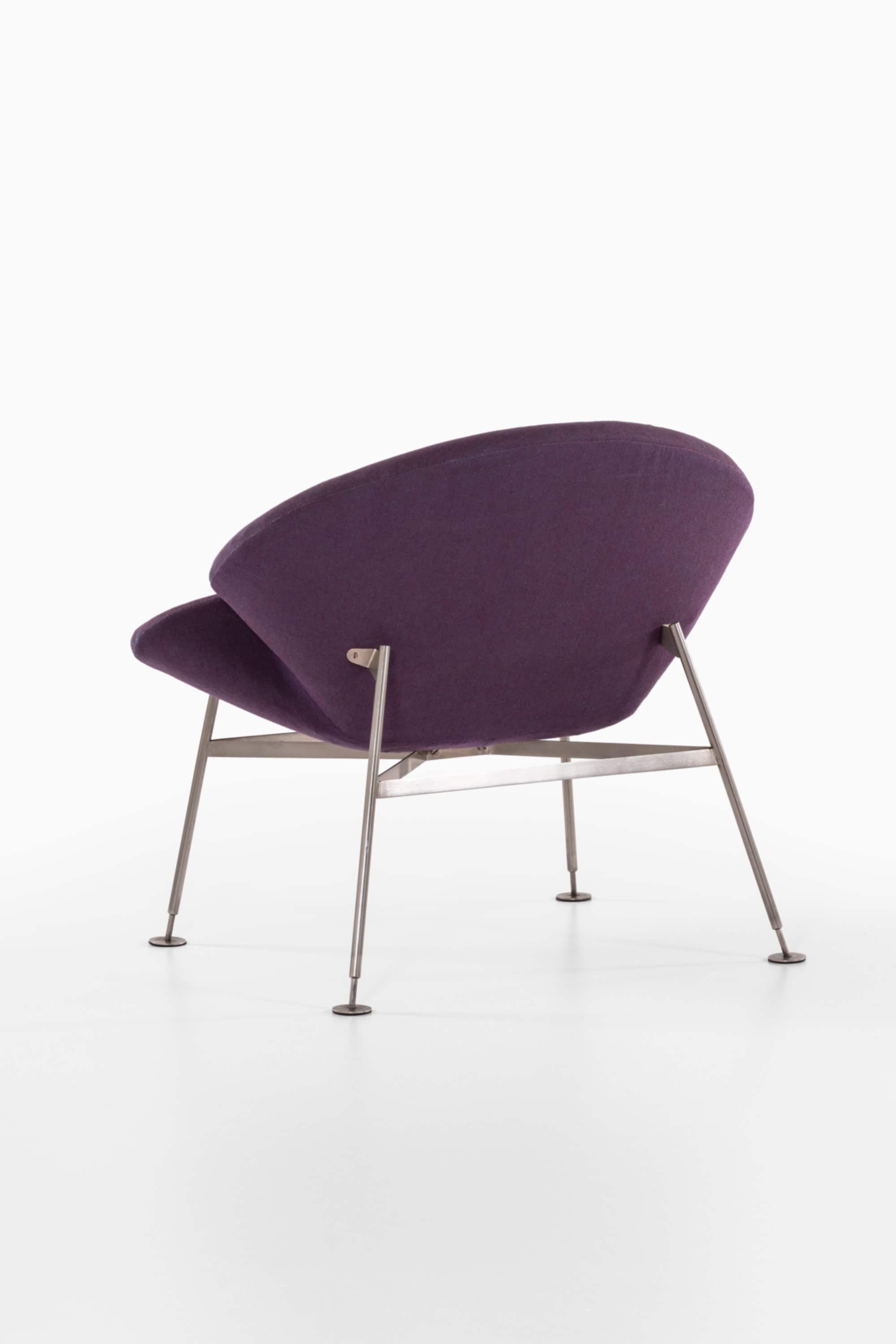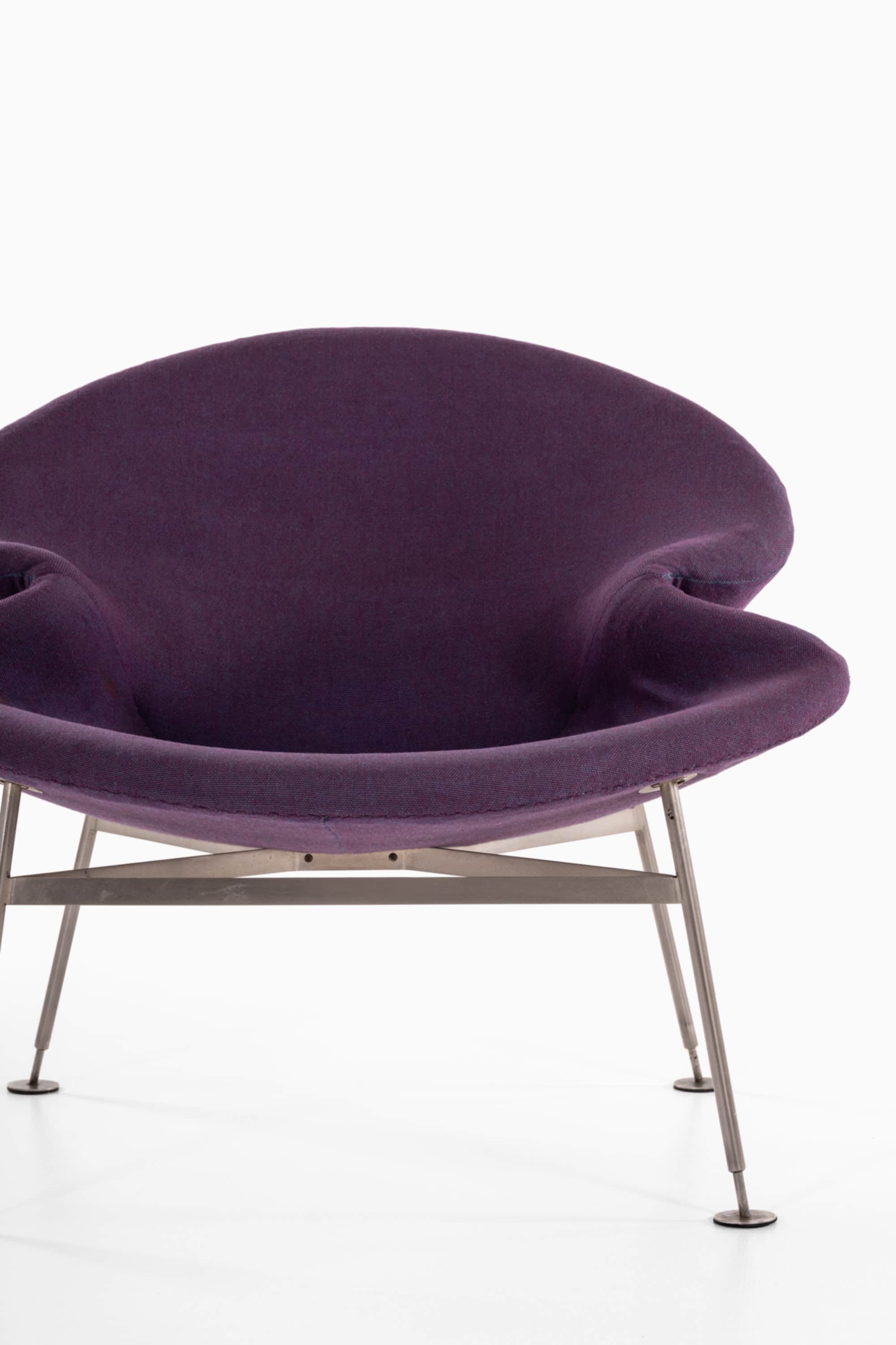 The seat is generously shaped with a softly curved, almost petal-like silhouette, giving the model its name. The flowing lines wrap around the sitter, forming integrated armrests that fold inward in a gentle, embracing gesture. The upholstery is executed in its original purple fabric, a rich and slightly muted tone that enhances the chair’s sculptural presence while adding depth and warmth. The textile shows a fine, even weave and a subtle texture that complements the rounded contours of the form.