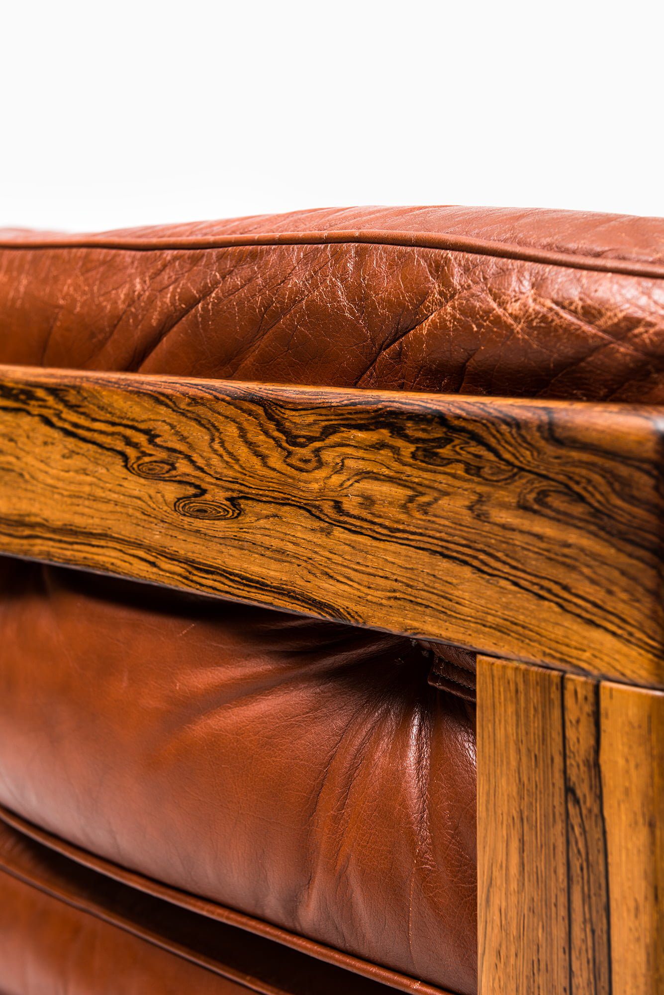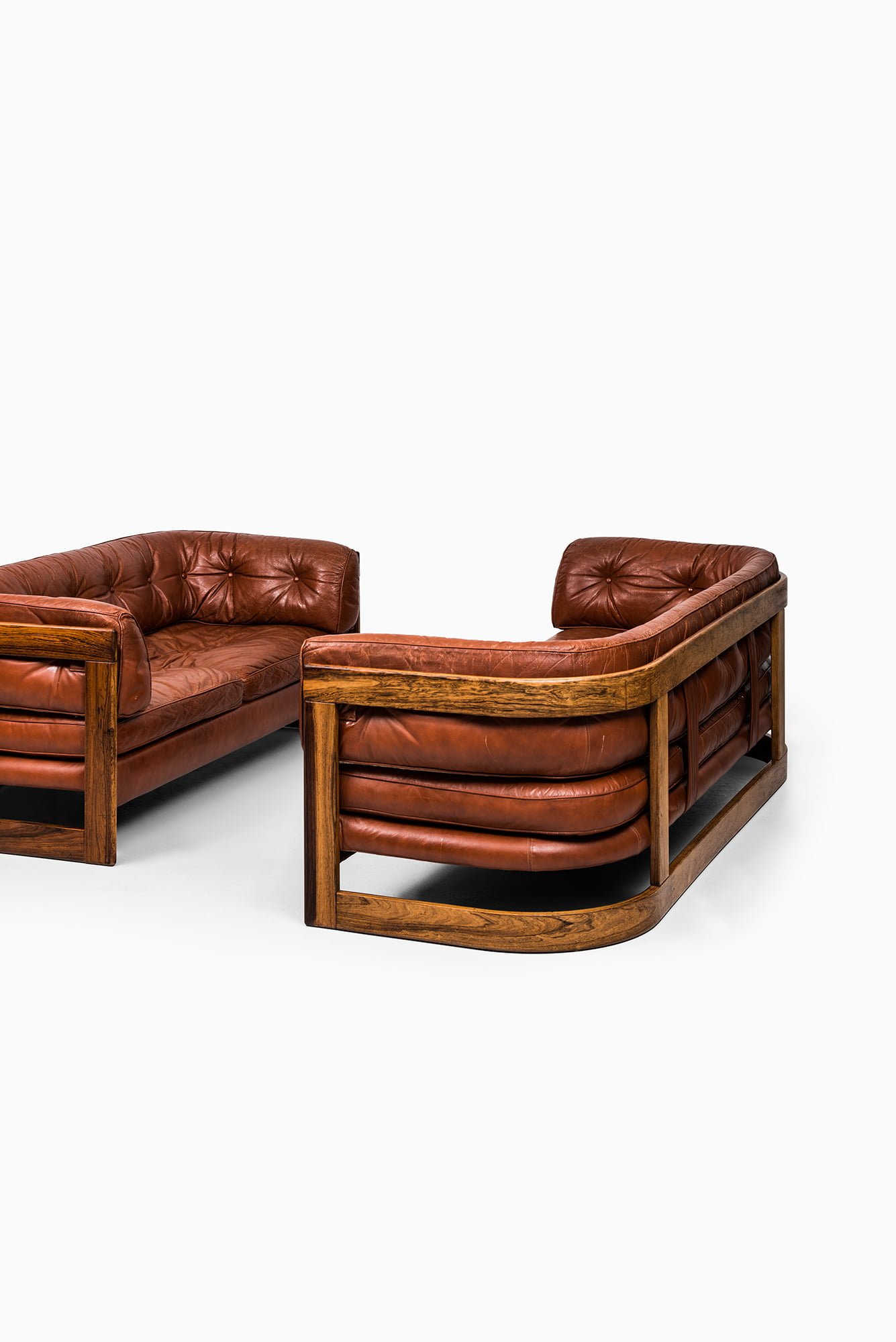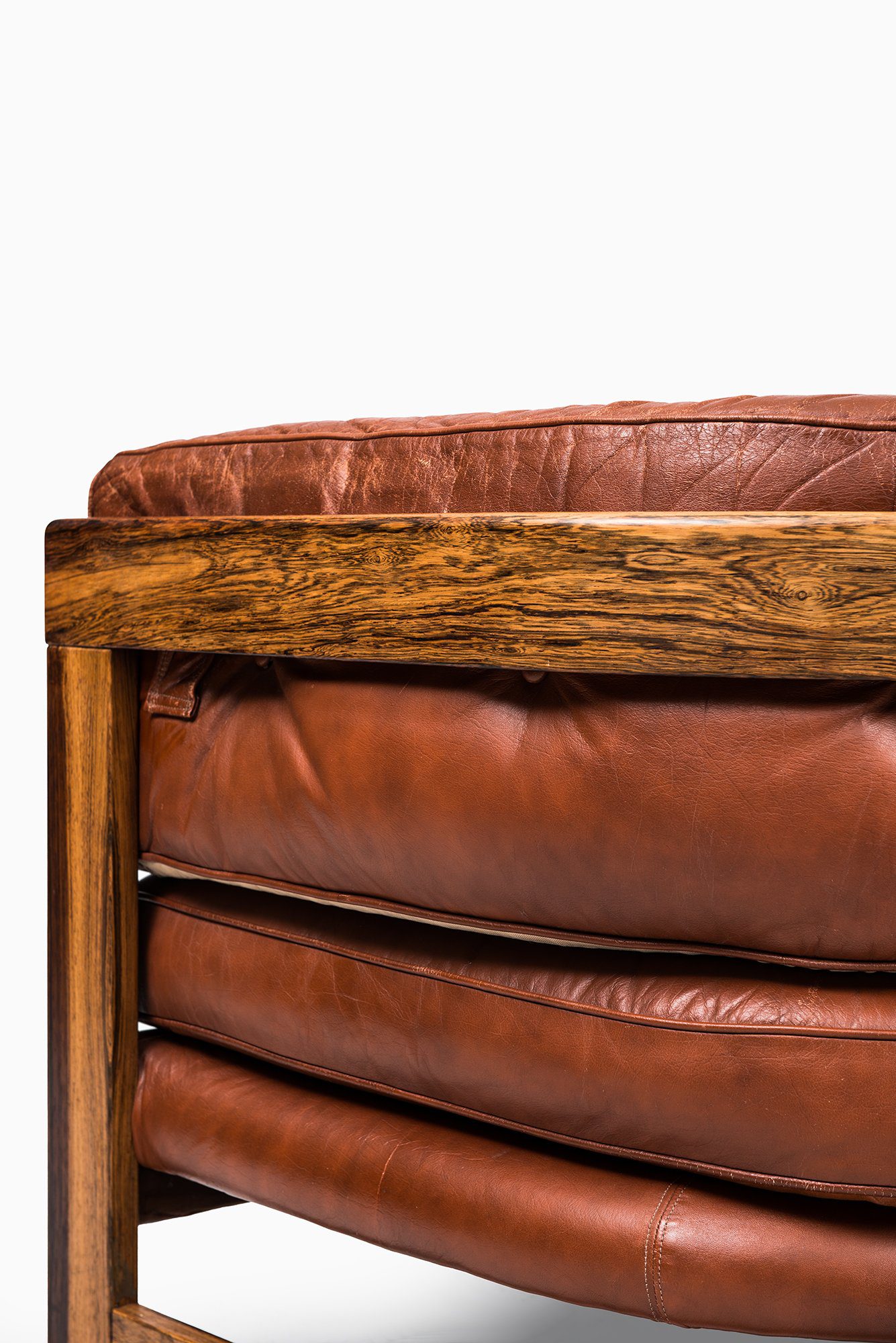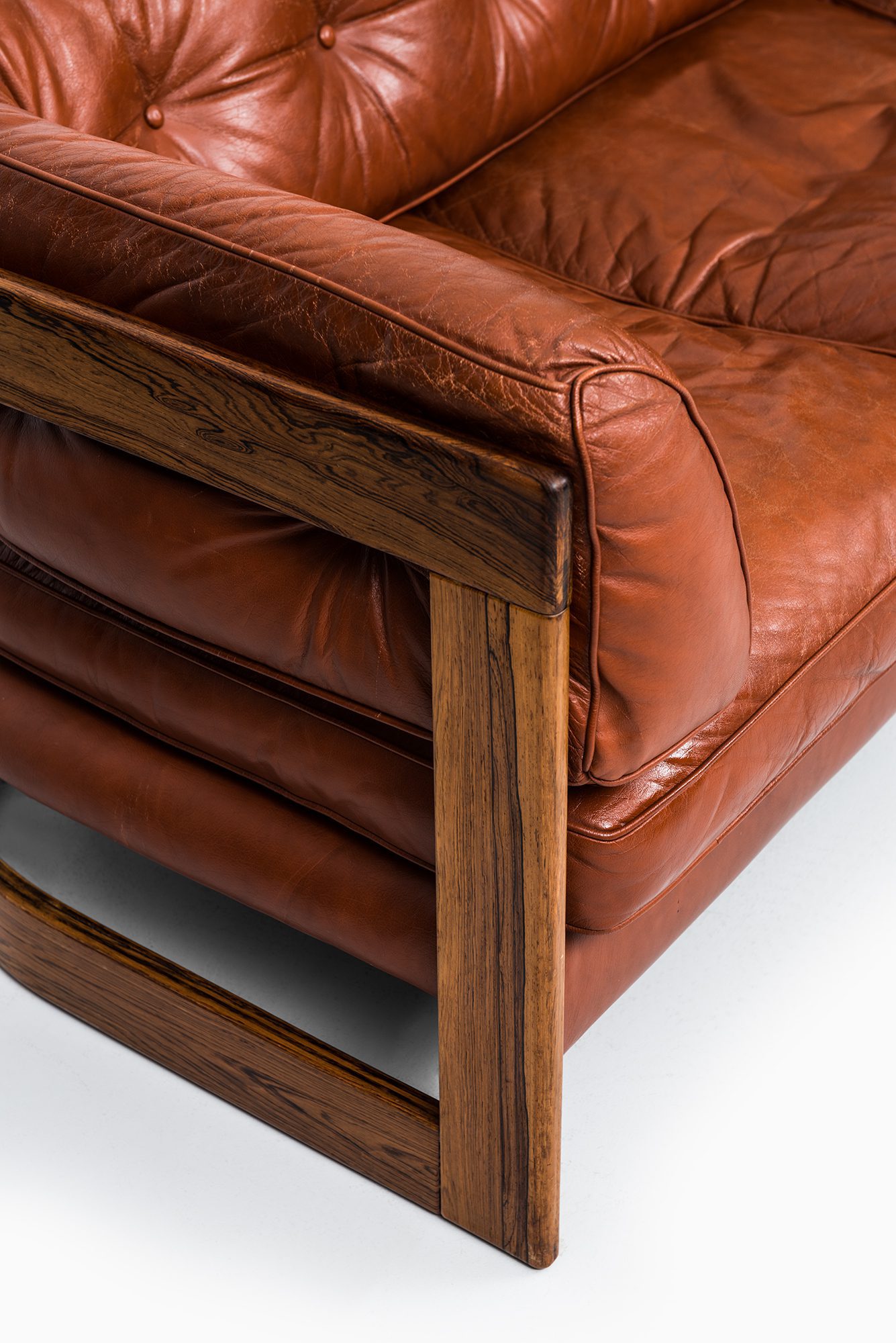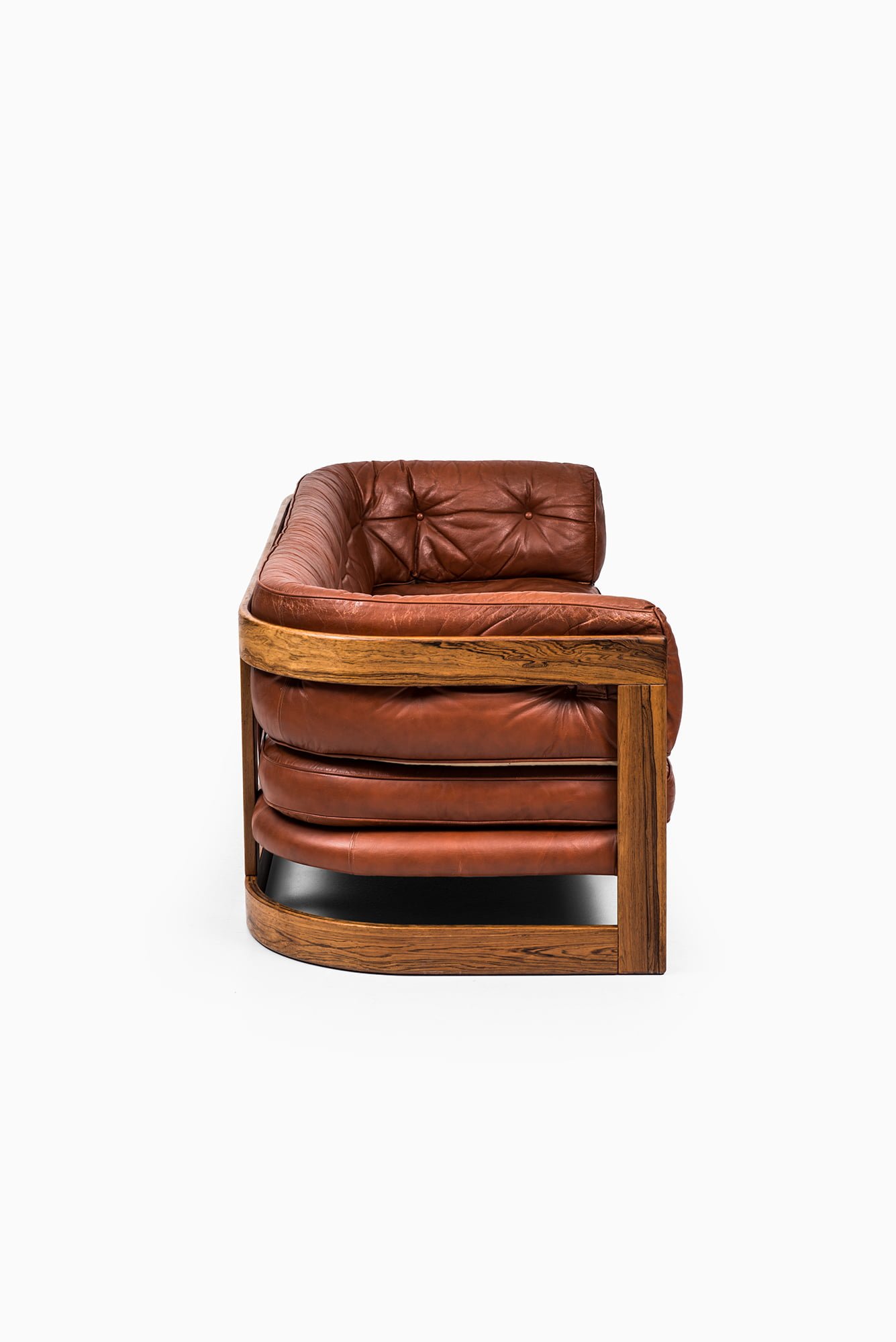 This rare three-seat sofa was designed by Lennart Bender and produced by Stjernmöbler in Herrljunga, Sweden, during the 1960s. The frame is crafted from solid rosewood with a rich, expressive grain that frames the sofa’s silhouette and adds a sculptural quality to the piece. The design is characterized by its continuous oval base and open frame structure, which supports the generously upholstered cushions.