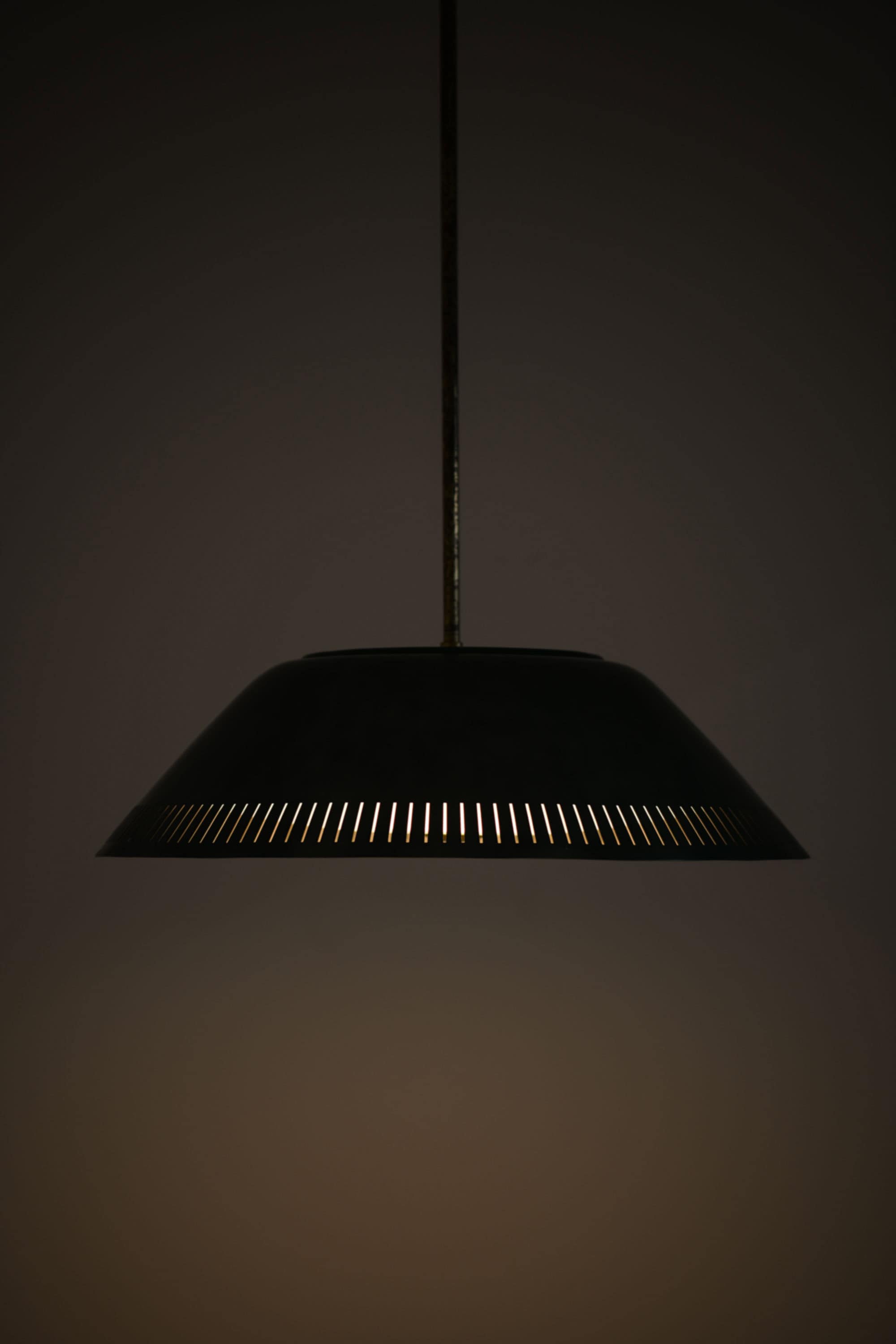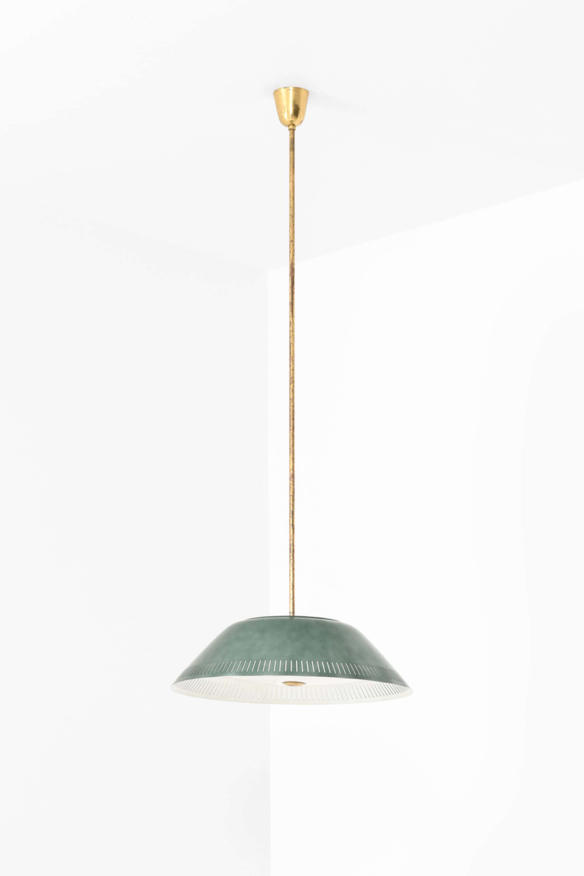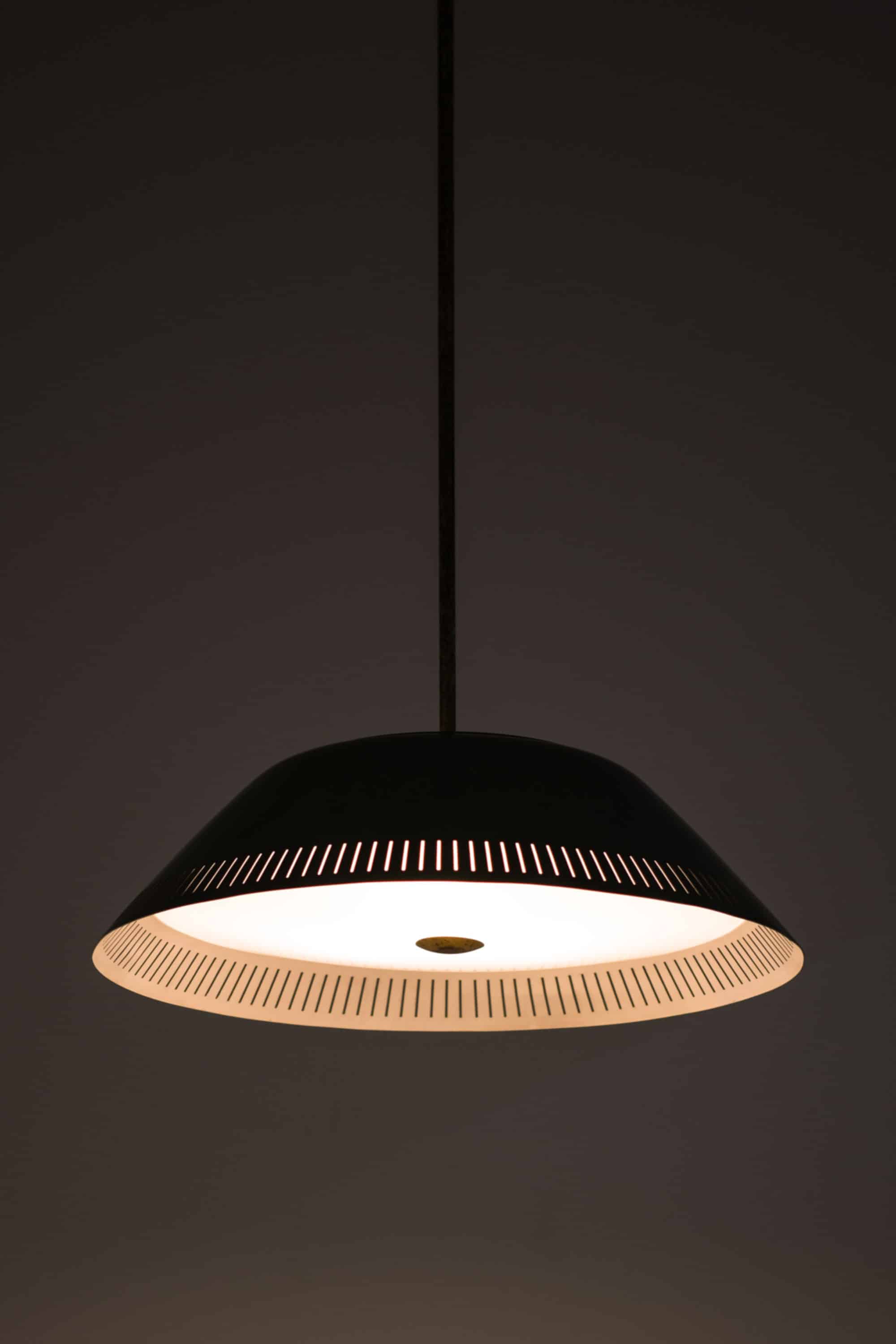 This ceiling lamp is composed of a conical green-lacquered metal shade with a circular cut pattern along its edge. The light is softly filtered through an opal plastic diffuser mounted beneath the shade, producing both direct downward illumination and a fine radiating glow through the perforations. The combination of metal, glass, and plastic elements reflects Johansson-Pape’s characteristic focus on light diffusion and visual balance, while the brass suspension rod and ceiling cup add a refined material contrast.