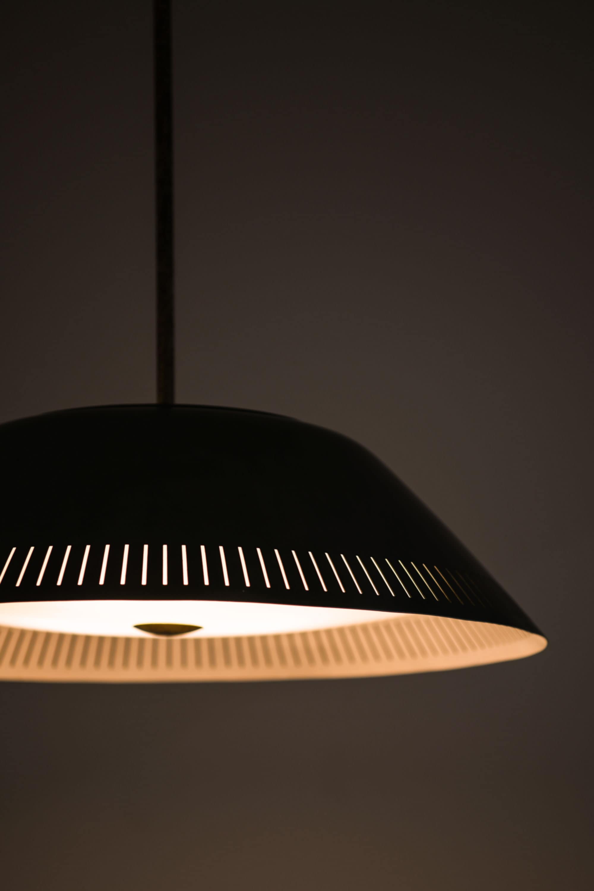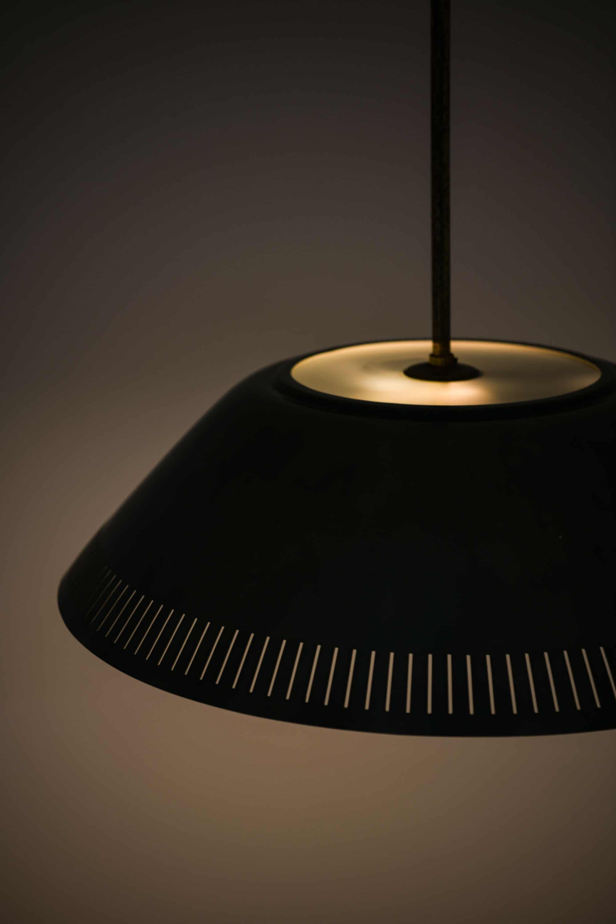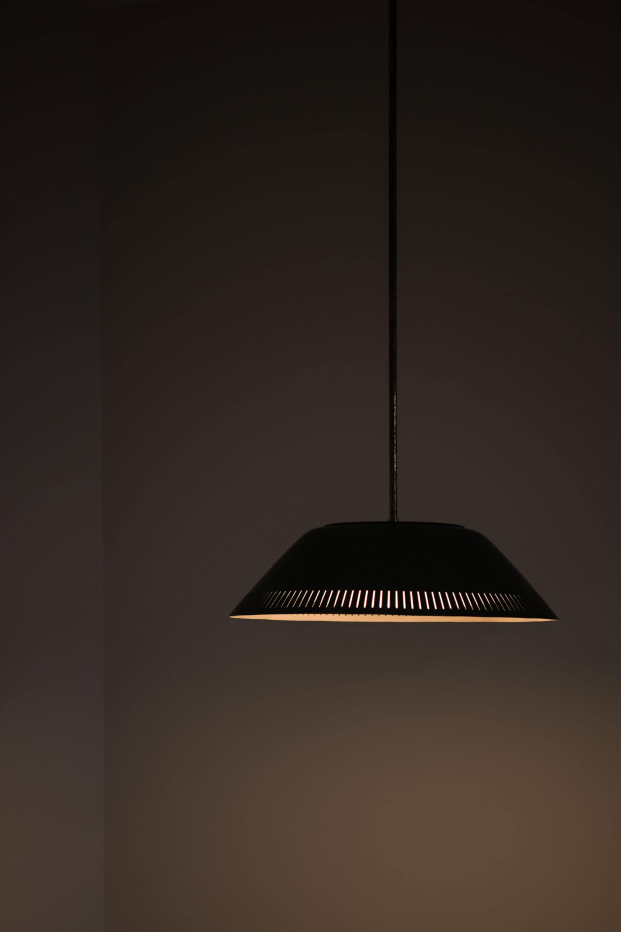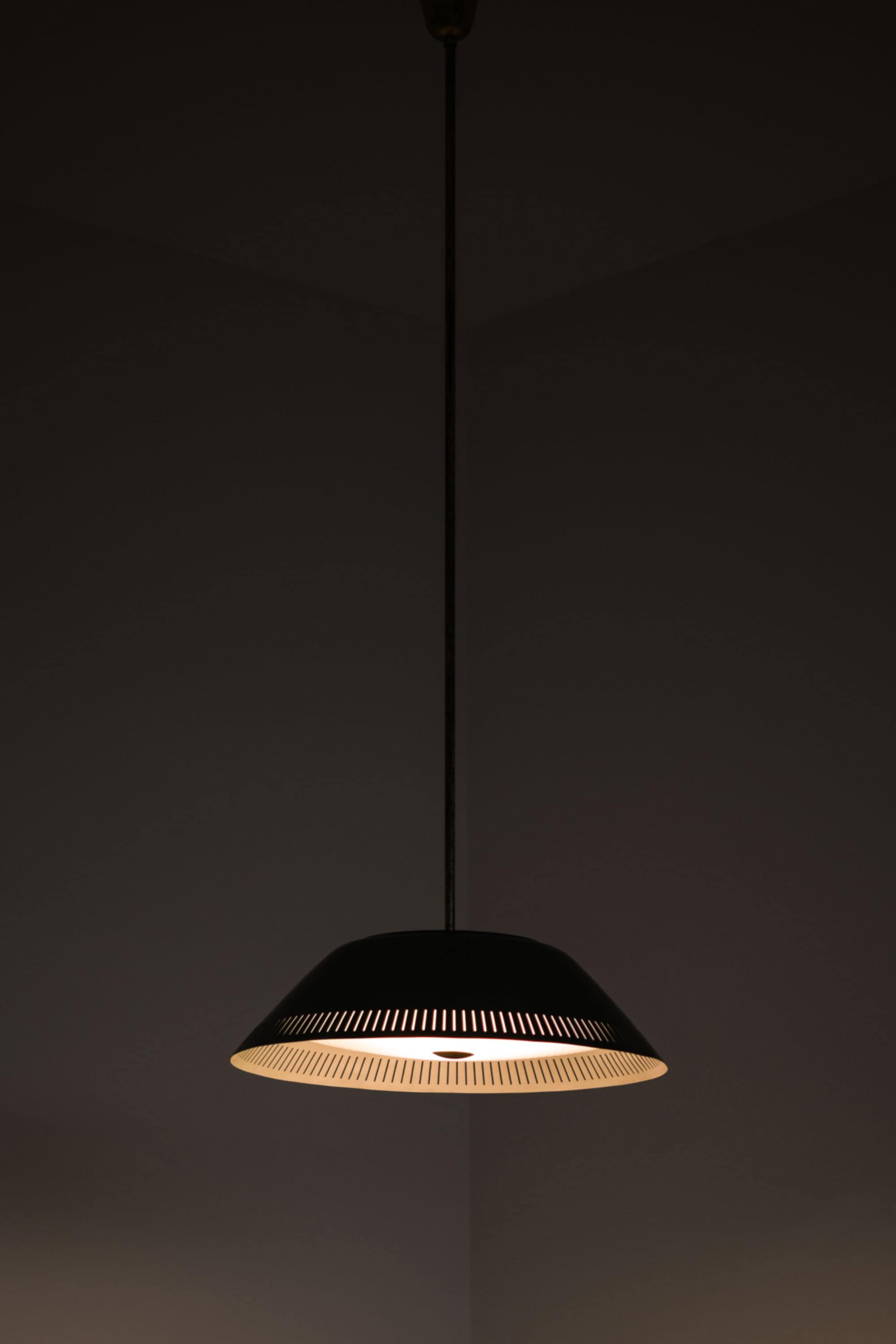 This ceiling lamp is composed of a conical green-lacquered metal shade with a circular cut pattern along its edge. The light is softly filtered through an opal plastic diffuser mounted beneath the shade, producing both direct downward illumination and a fine radiating glow through the perforations. The combination of metal, glass, and plastic elements reflects Johansson-Pape’s characteristic focus on light diffusion and visual balance, while the brass suspension rod and ceiling cup add a refined material contrast.