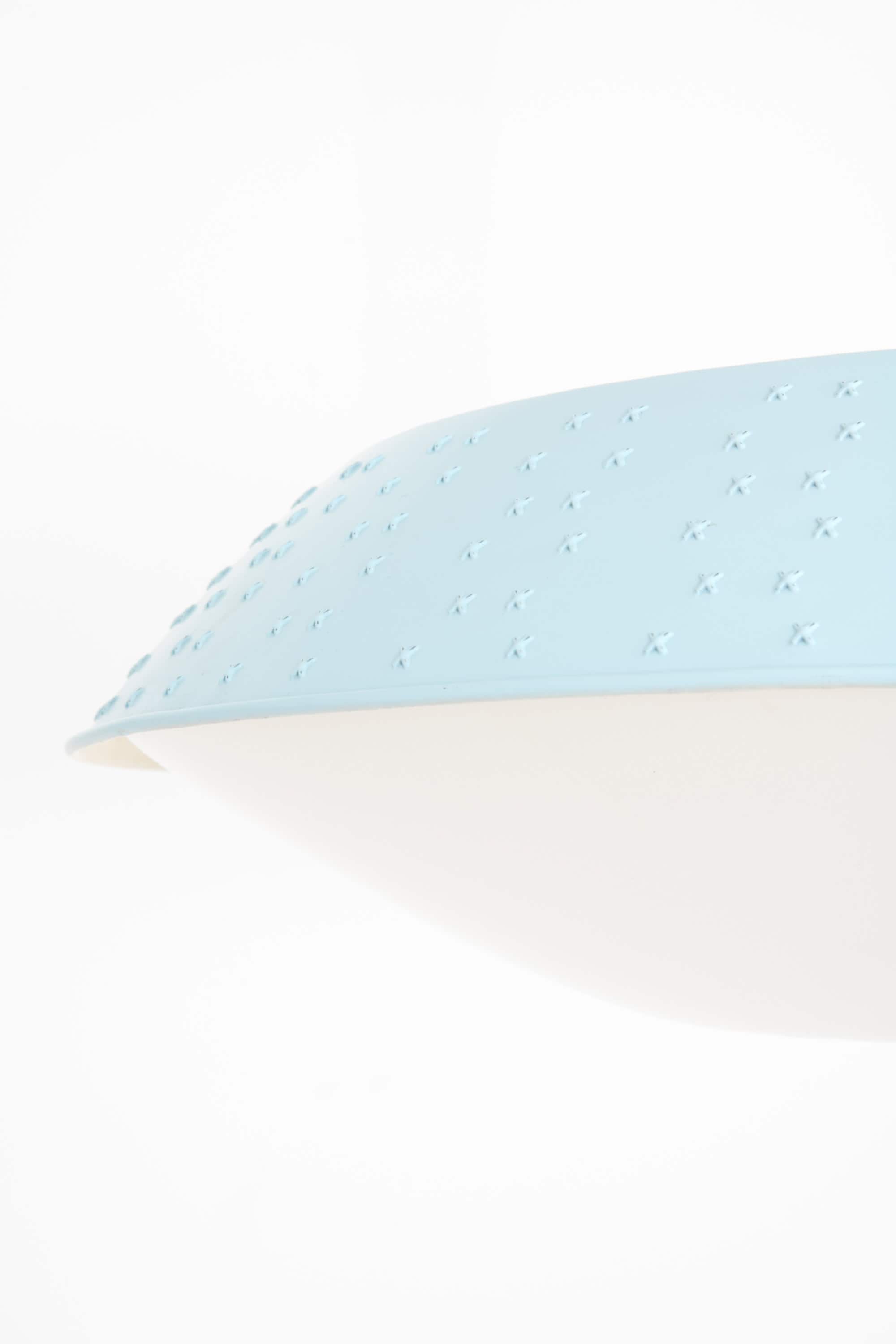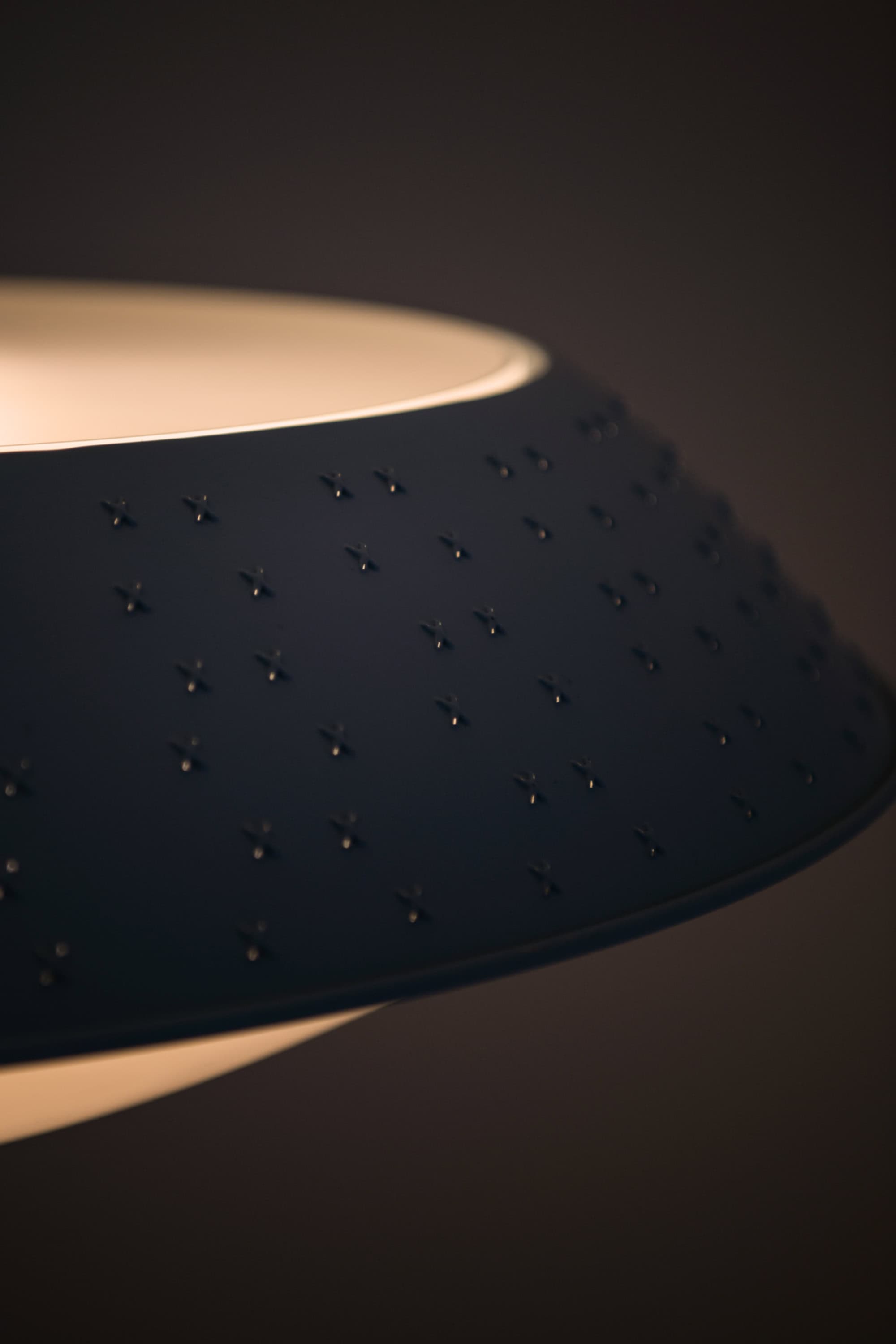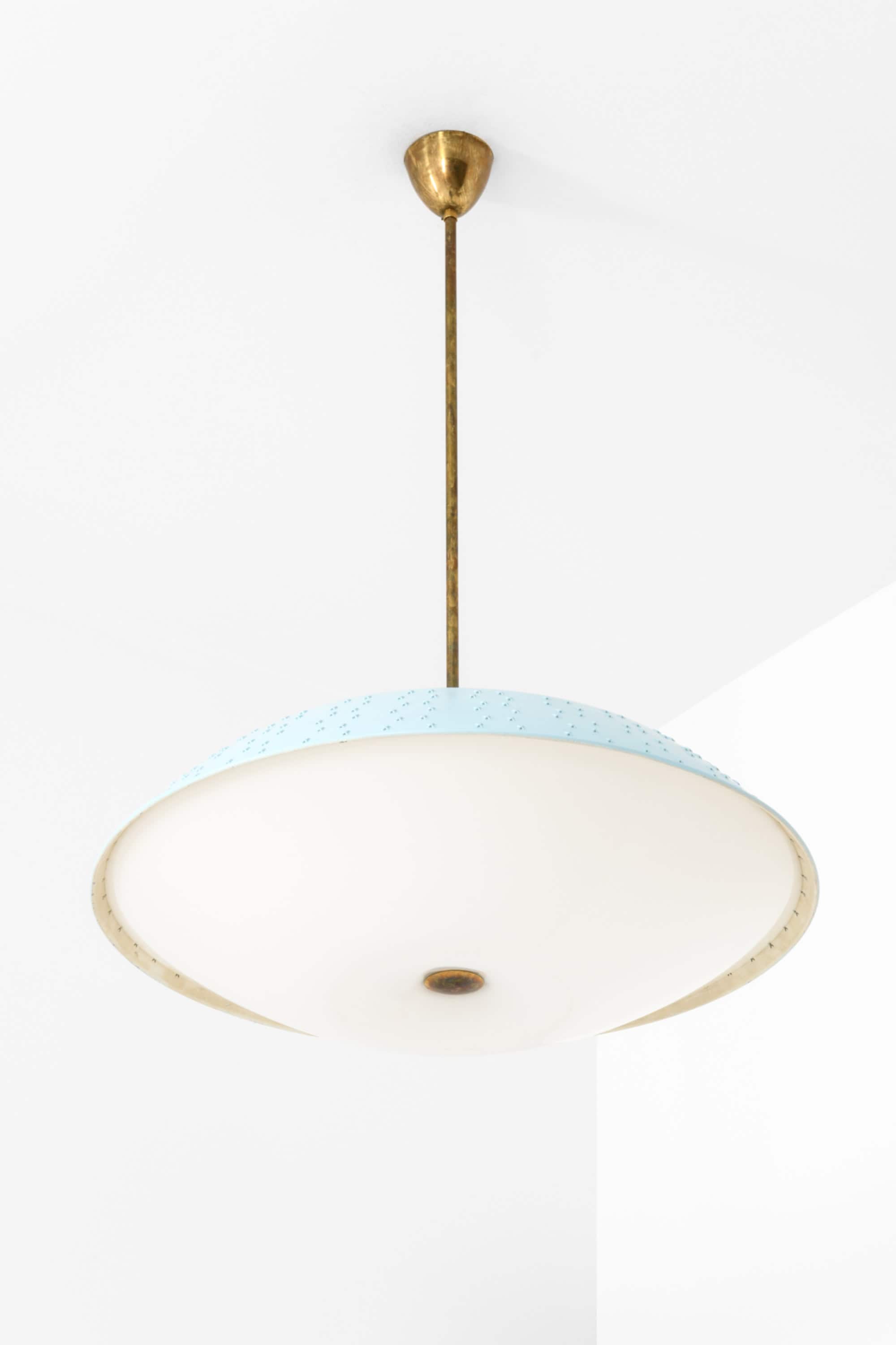 This ceiling lamp is constructed in brass, painted metal, glass, and a molded plastic diffuser, and was designed by Lisa Johansson-Pape for Stockmann-Orno in Finland during the 1960s. The upper shade is formed from light blue lacquered metal with a regular pattern of small embossed crosses distributed across the surface. This creates a textured appearance and allows controlled light spill when the lamp is illuminated. The lower diffuser is shaped in white plastic with a smooth, concave form that distributes the light evenly downward. A secondary glass diffuser sits above the main body of the lamp, assisting in upward light distribution and concealing the internal fittings.