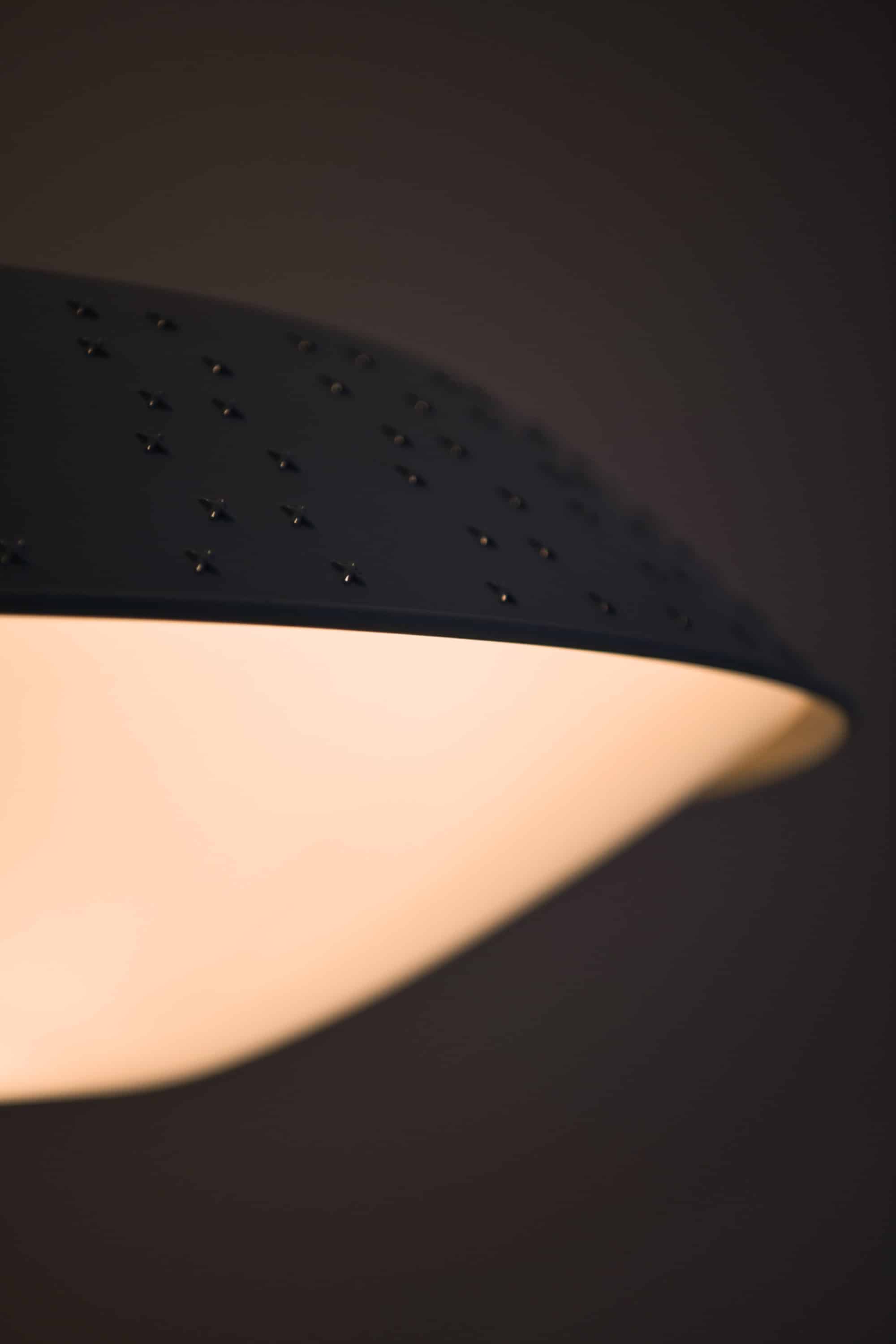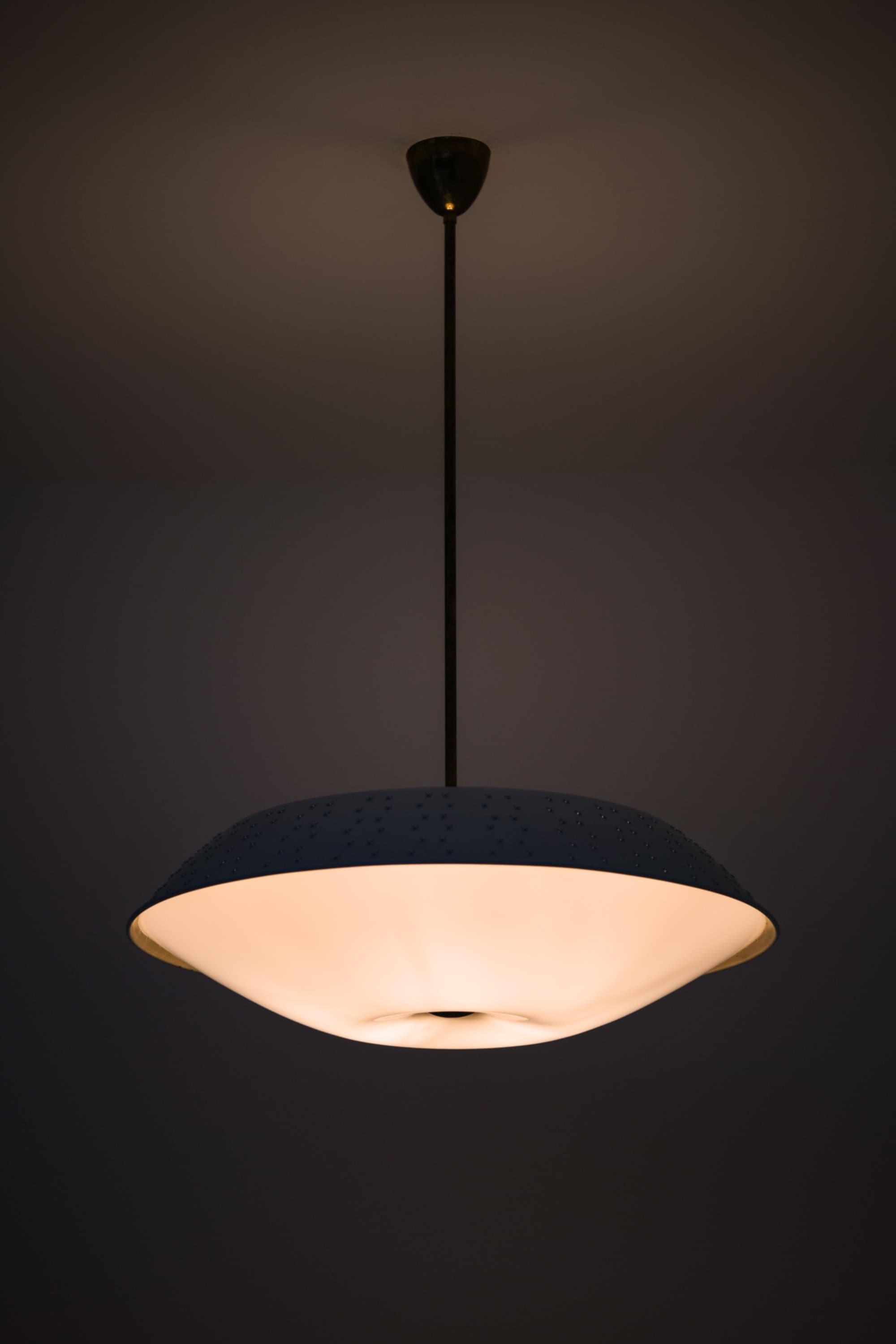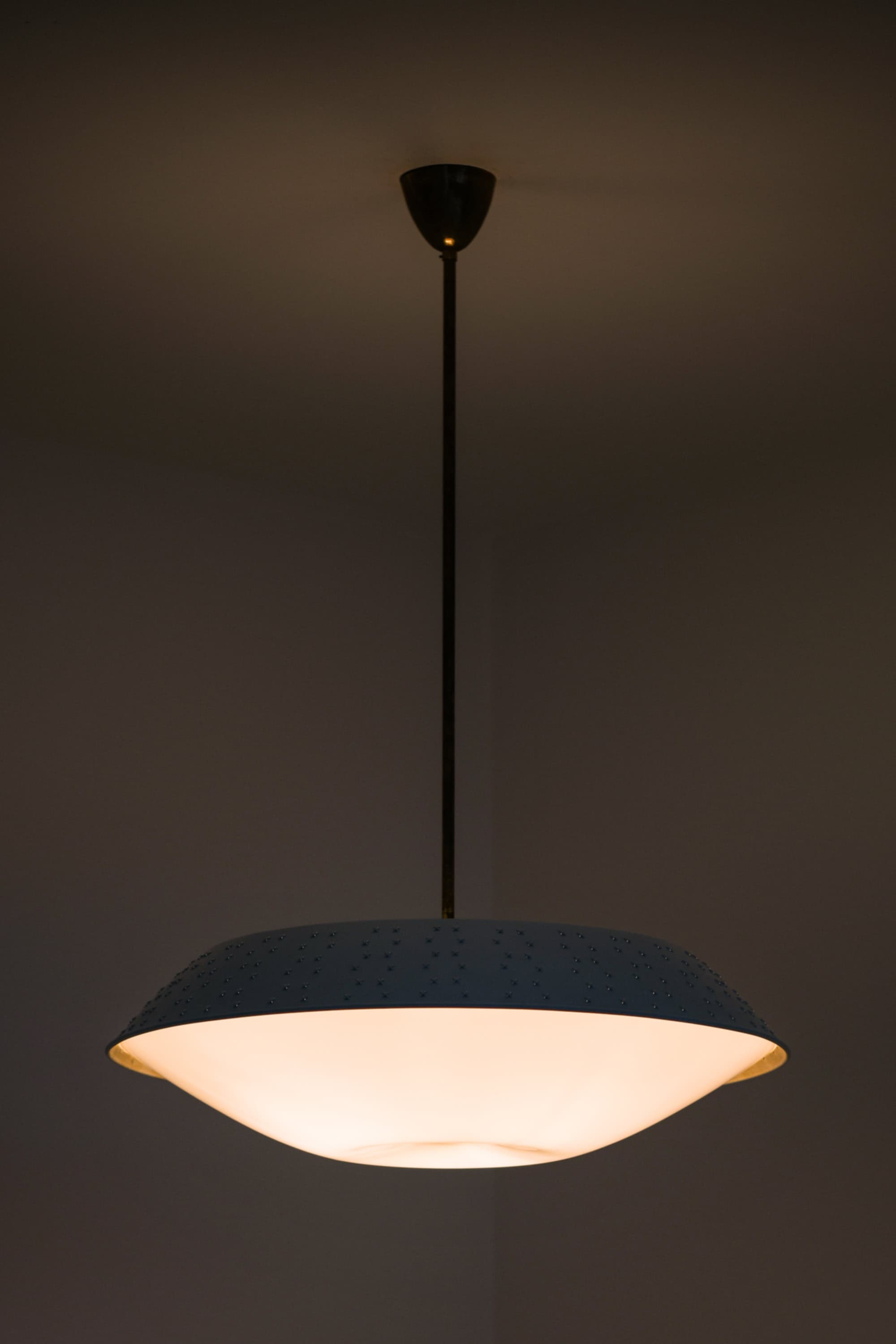 The lamp is suspended from a straight brass rod with a brass ceiling cup, all retaining an aged patina that reflects typical oxidation of the period. The combination of lacquered metal and warm brass contributes to the balanced palette often seen in Johansson-Pape’s work. Her designs were characterized by functional forms and careful attention to light quality, and Stockmann-Orno was the principal Finnish manufacturer responsible for producing her most important lighting collections. This model demonstrates her interest in broad, low silhouettes and diffused surfaces that create gentle, atmospheric illumination.