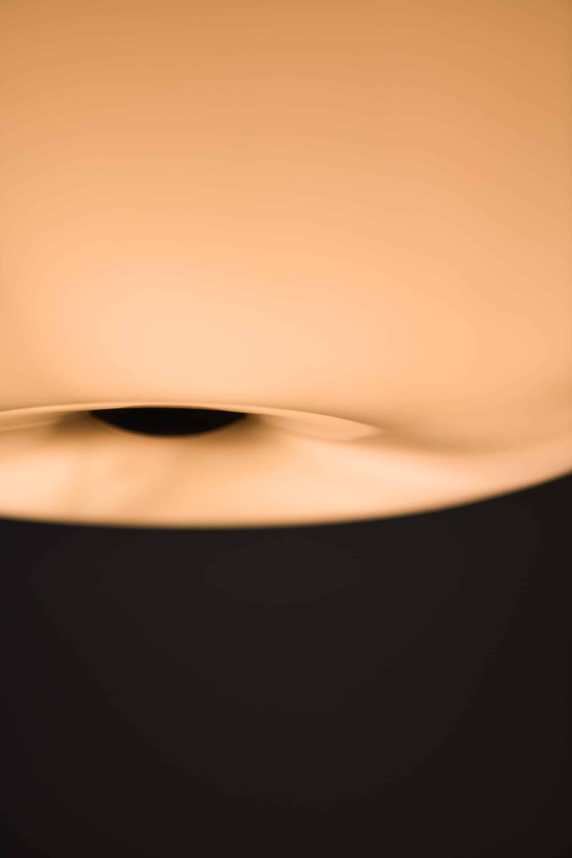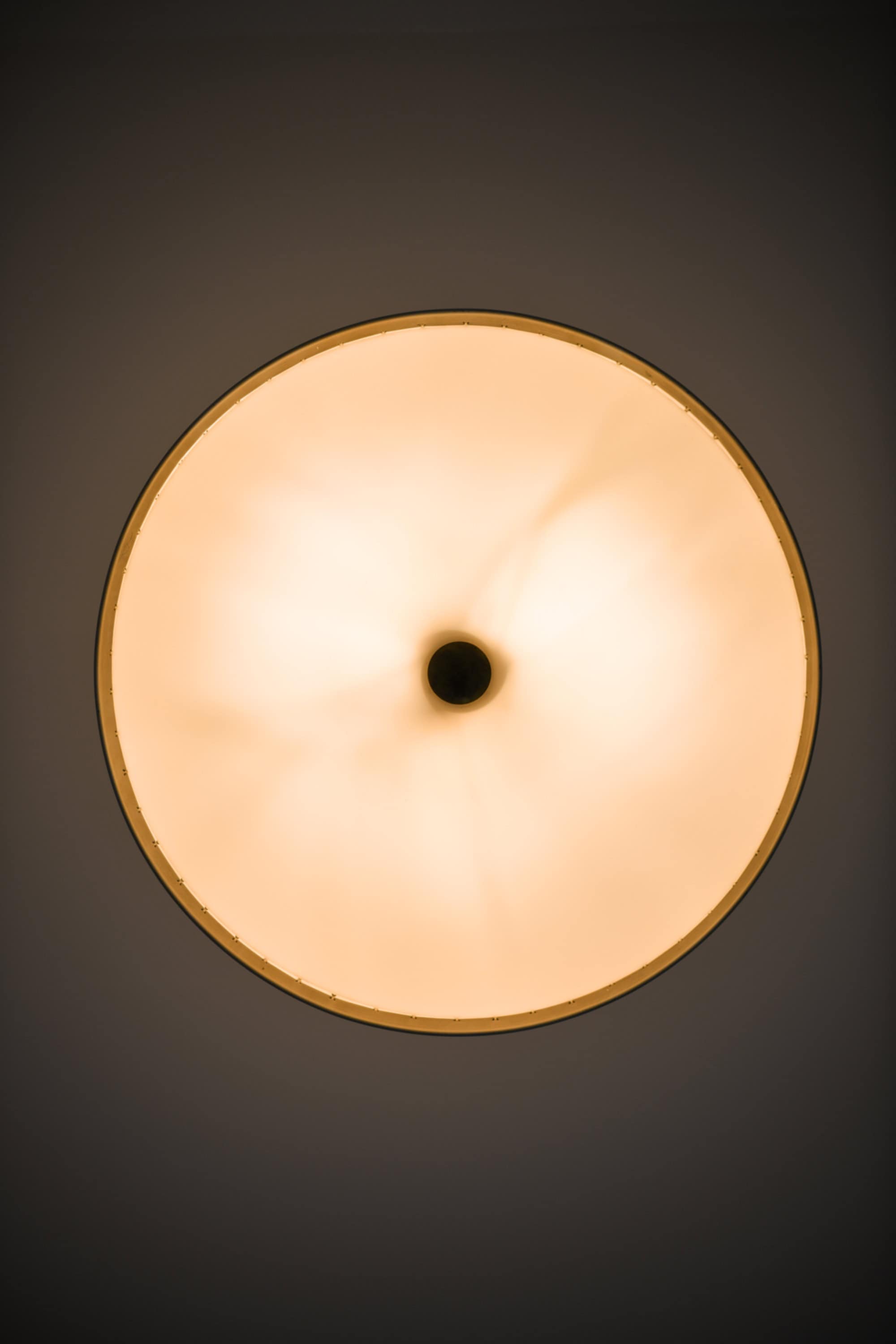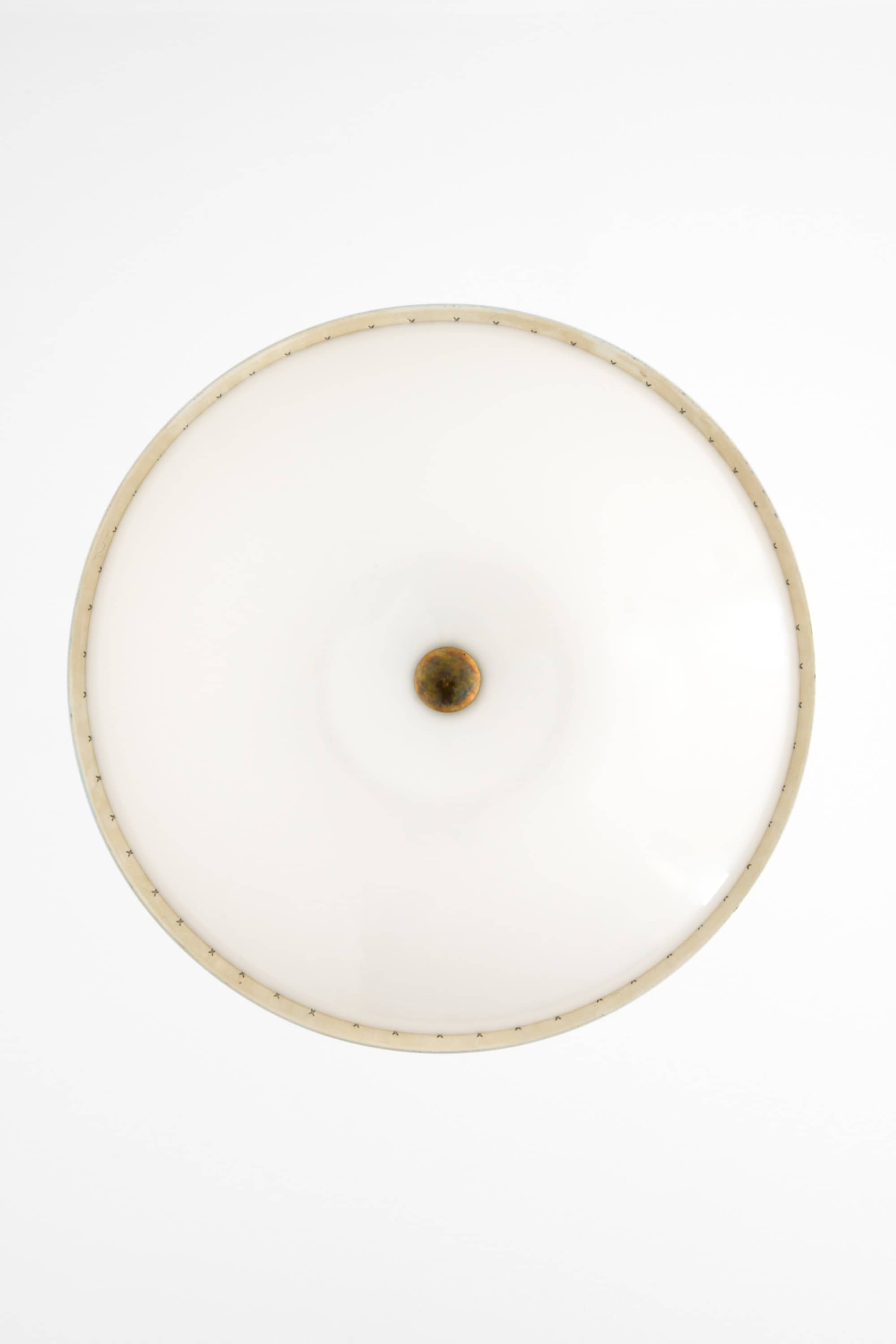 The lamp is suspended from a straight brass rod with a brass ceiling cup, all retaining an aged patina that reflects typical oxidation of the period. The combination of lacquered metal and warm brass contributes to the balanced palette often seen in Johansson-Pape’s work. Her designs were characterized by functional forms and careful attention to light quality, and Stockmann-Orno was the principal Finnish manufacturer responsible for producing her most important lighting collections. This model demonstrates her interest in broad, low silhouettes and diffused surfaces that create gentle, atmospheric illumination.