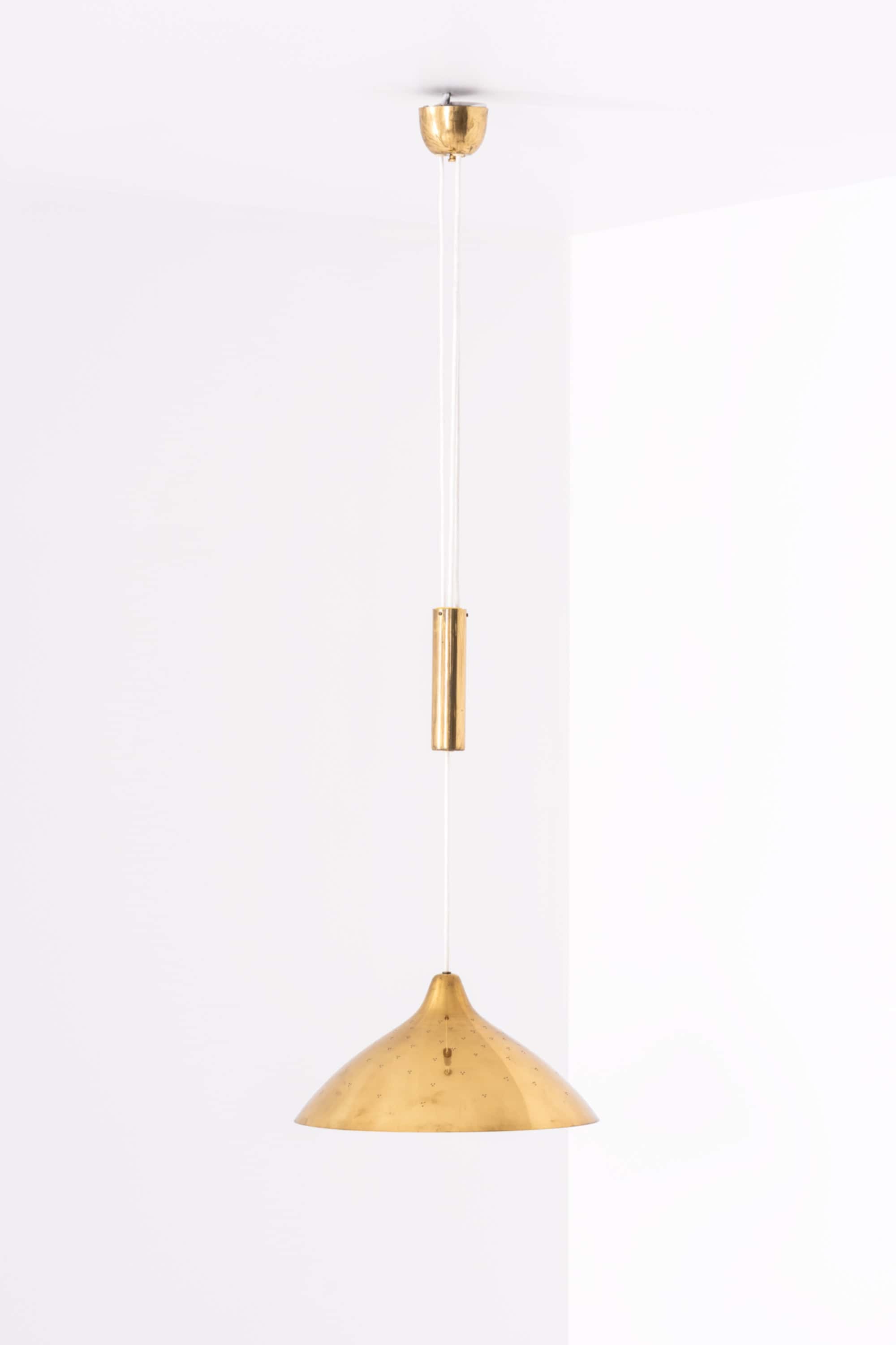 The lamp is suspended from a height-adjustable mechanism consisting of slender white cords and a cylindrical brass counterweight. This system allows the height to be easily regulated, combining practical functionality with a visually light and elegant suspension. The ceiling canopy is also executed in brass, maintaining material continuity throughout the design.