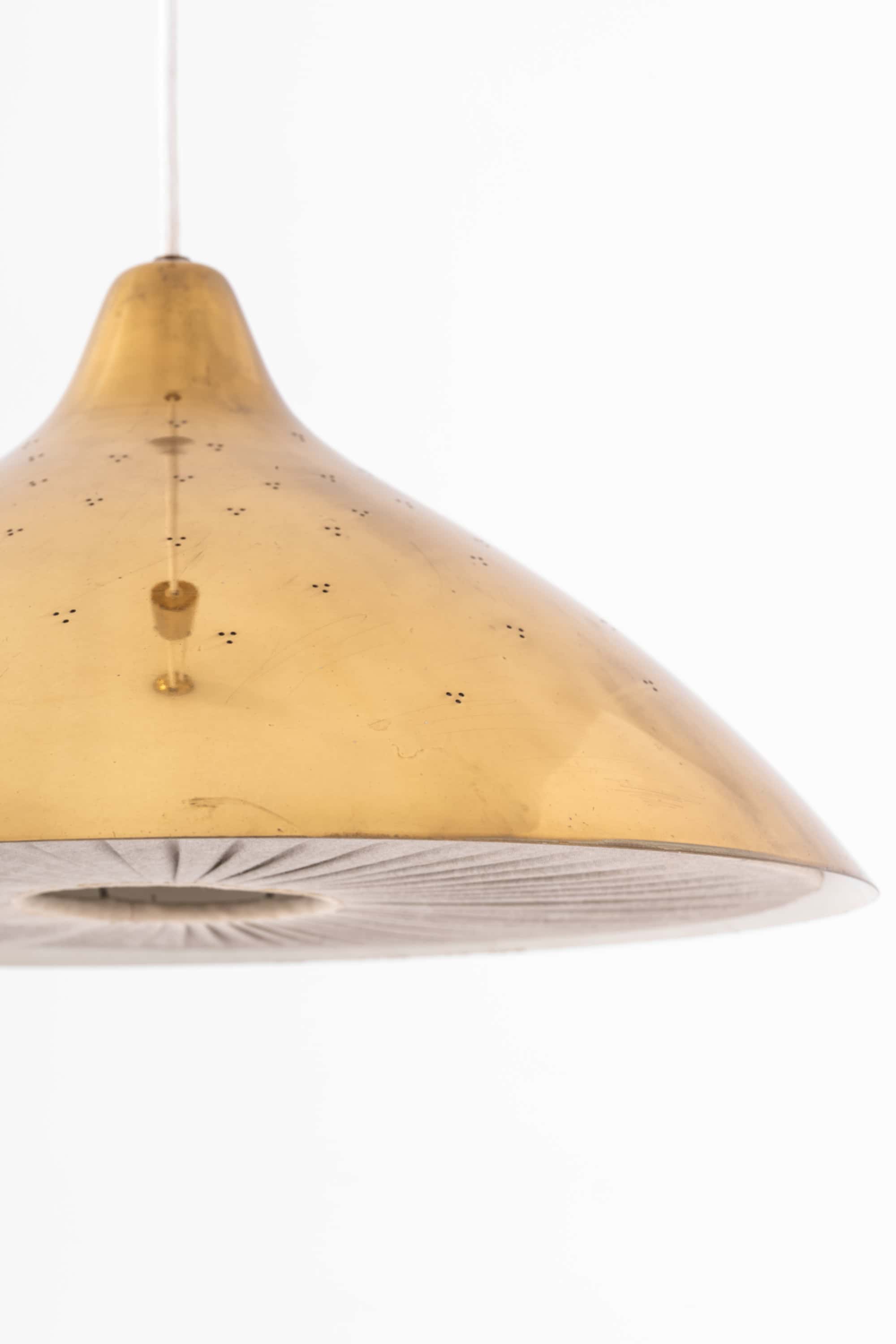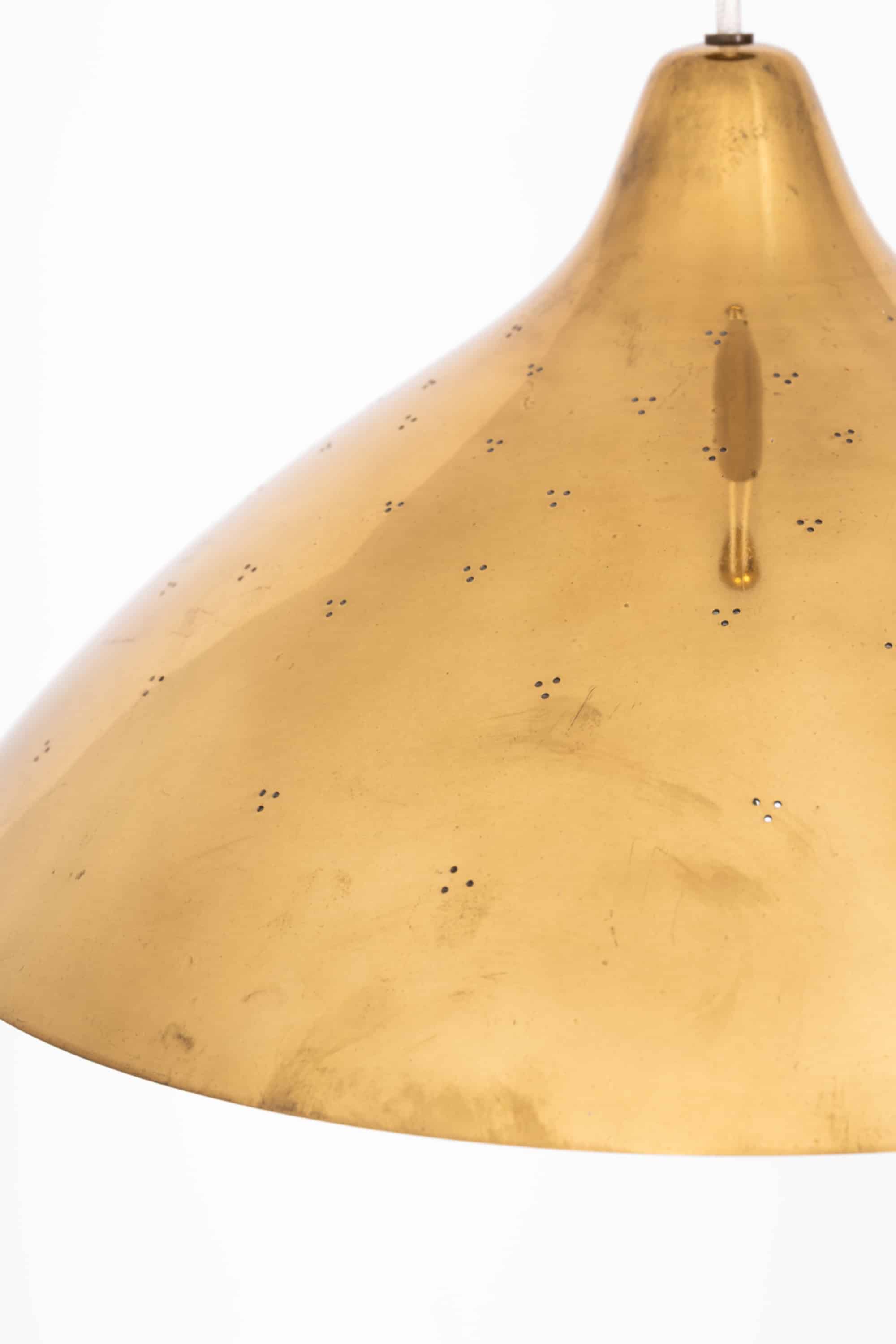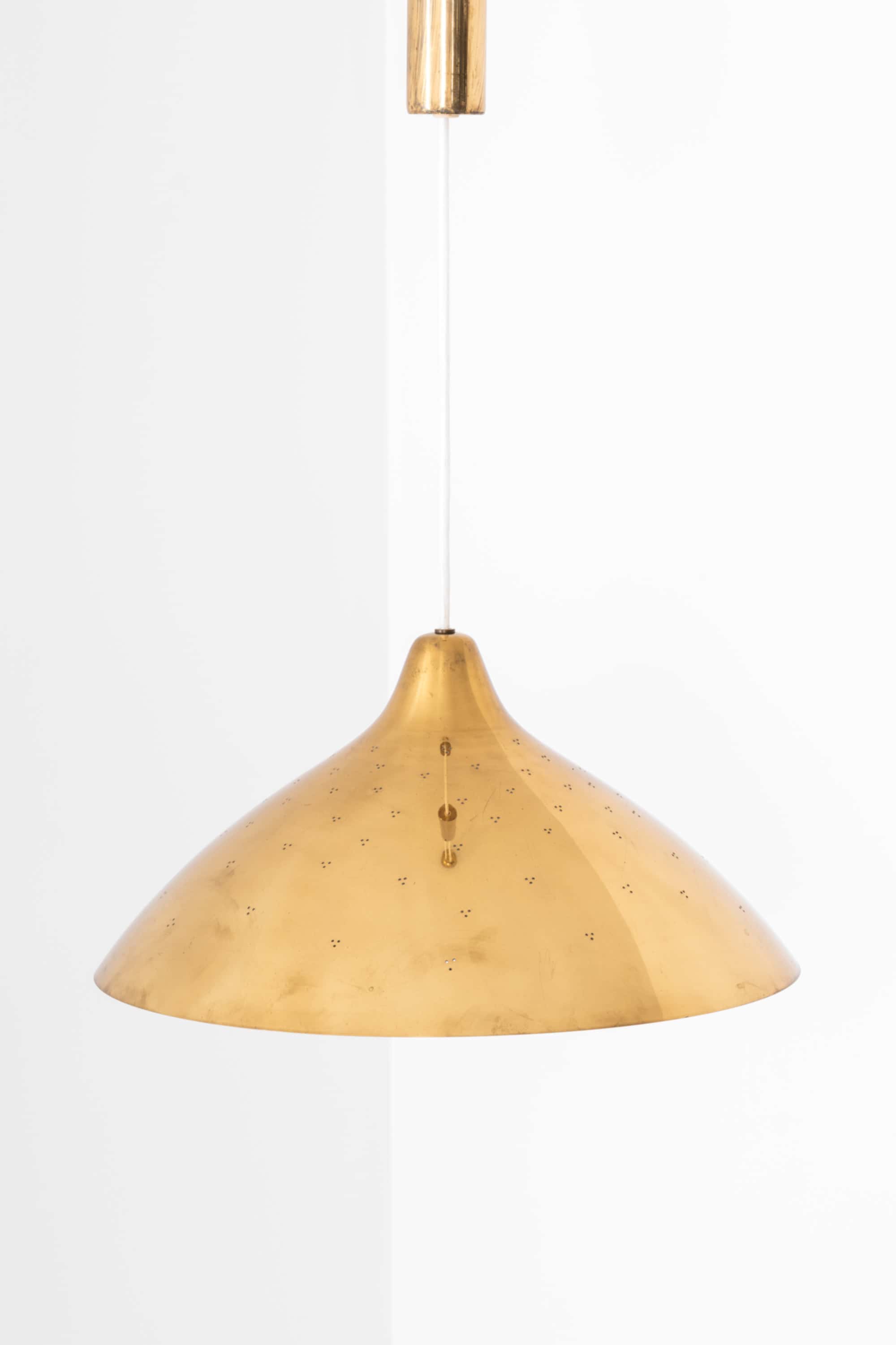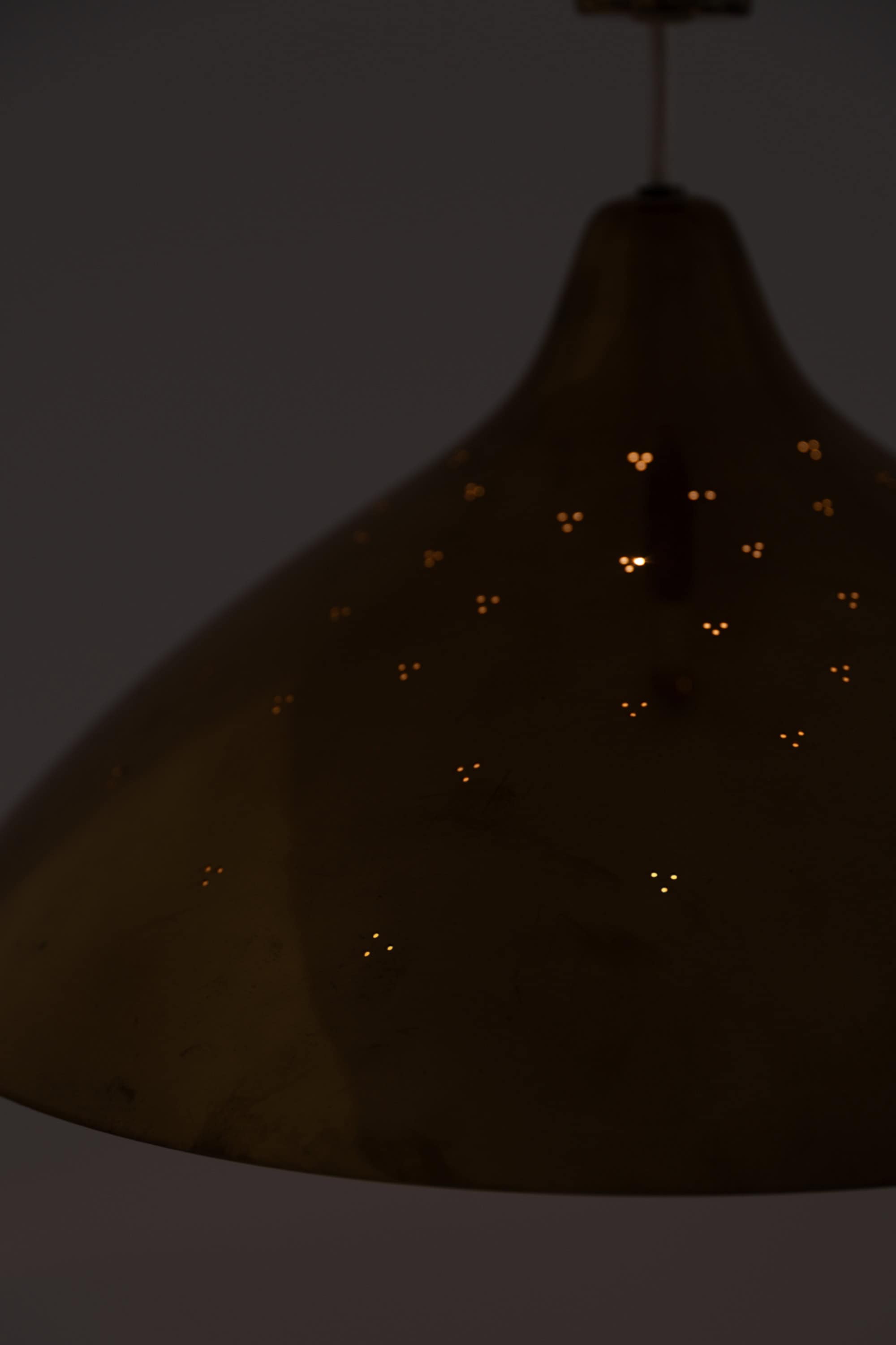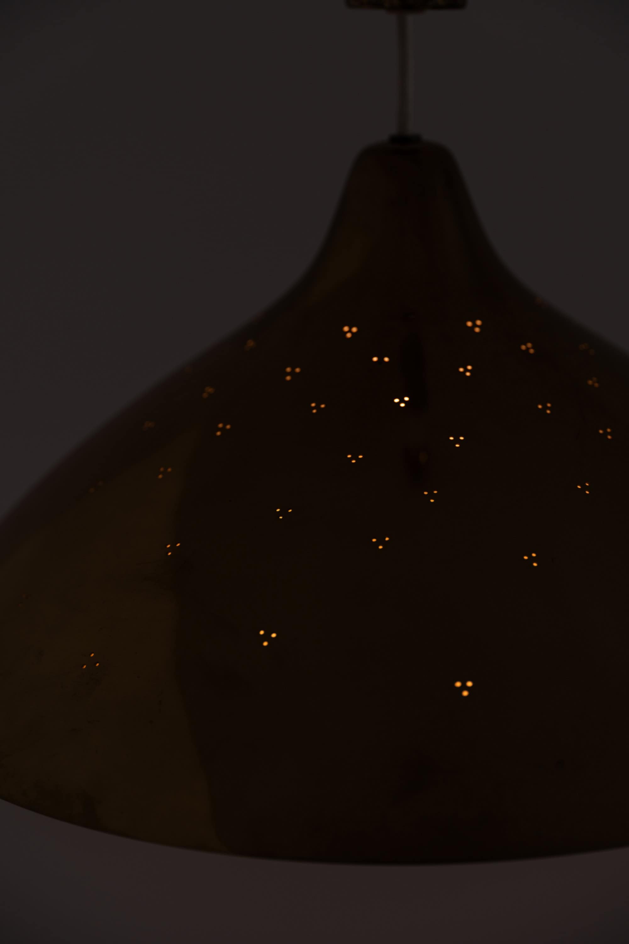 When lit, the lamp produces a warm, ambient illumination, with the perforations creating a subtle constellation-like effect across the brass surface, while the fabric diffuser emits a soft, even downward light. This interplay between direct and indirect light is a hallmark of Johansson-Pape’s designs.
