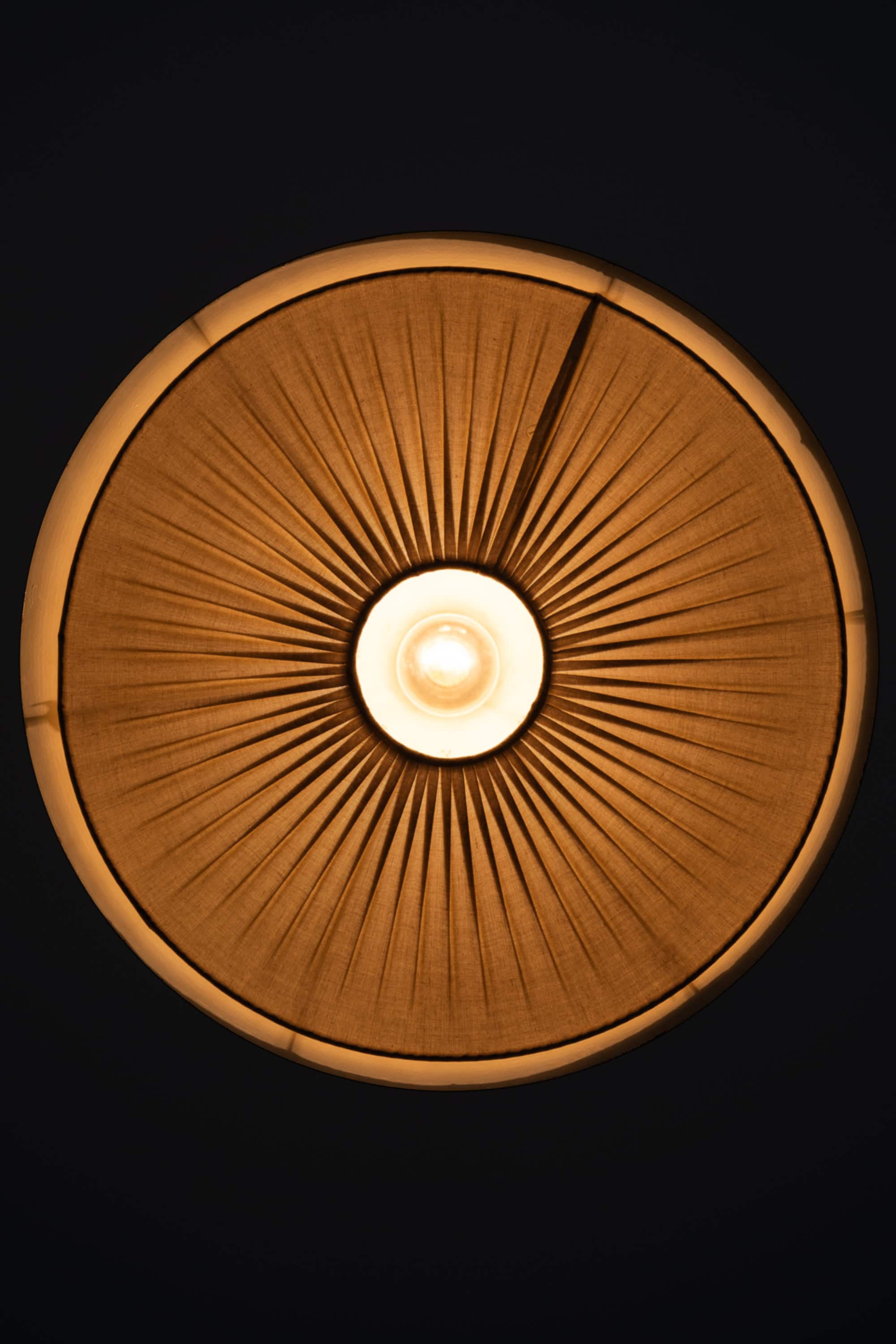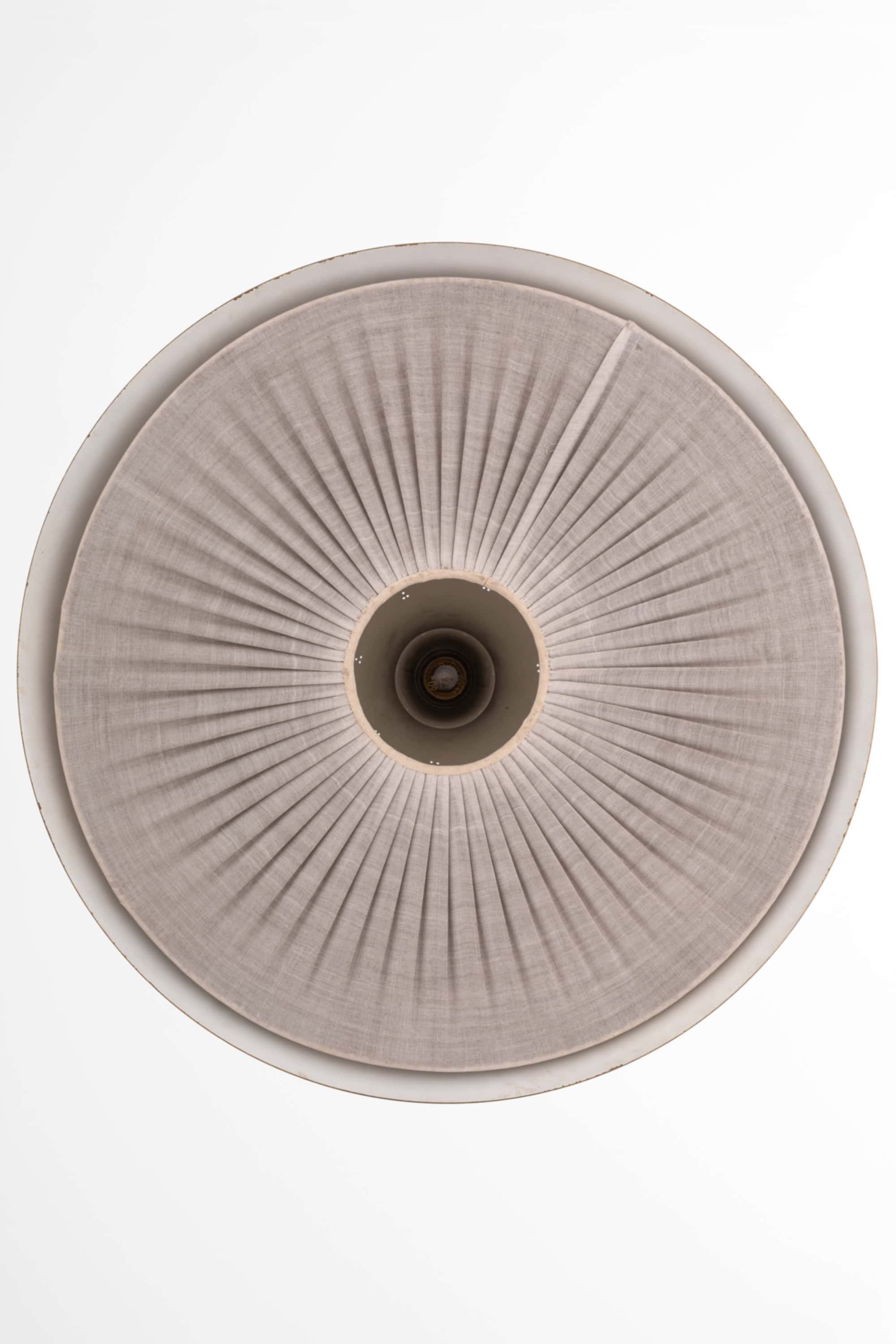 The underside reveals the original fabric diffuser, formed in a pleated, radial structure that softens and evenly distributes the light. This textile element introduces a tactile contrast to the metal exterior and contributes to the lamp’s characteristic warm and intimate glow. The central opening exposes the light source while maintaining a controlled diffusion.