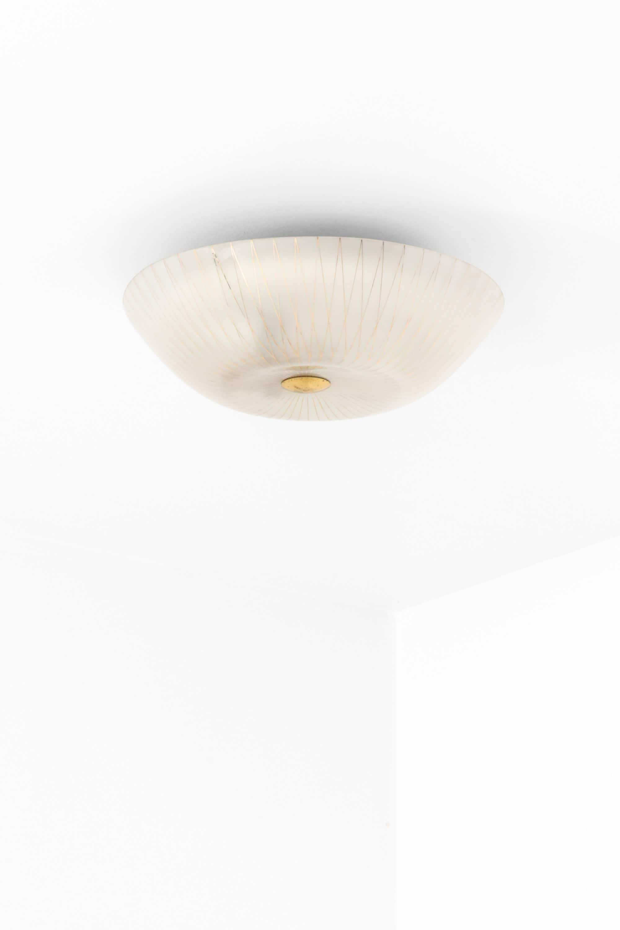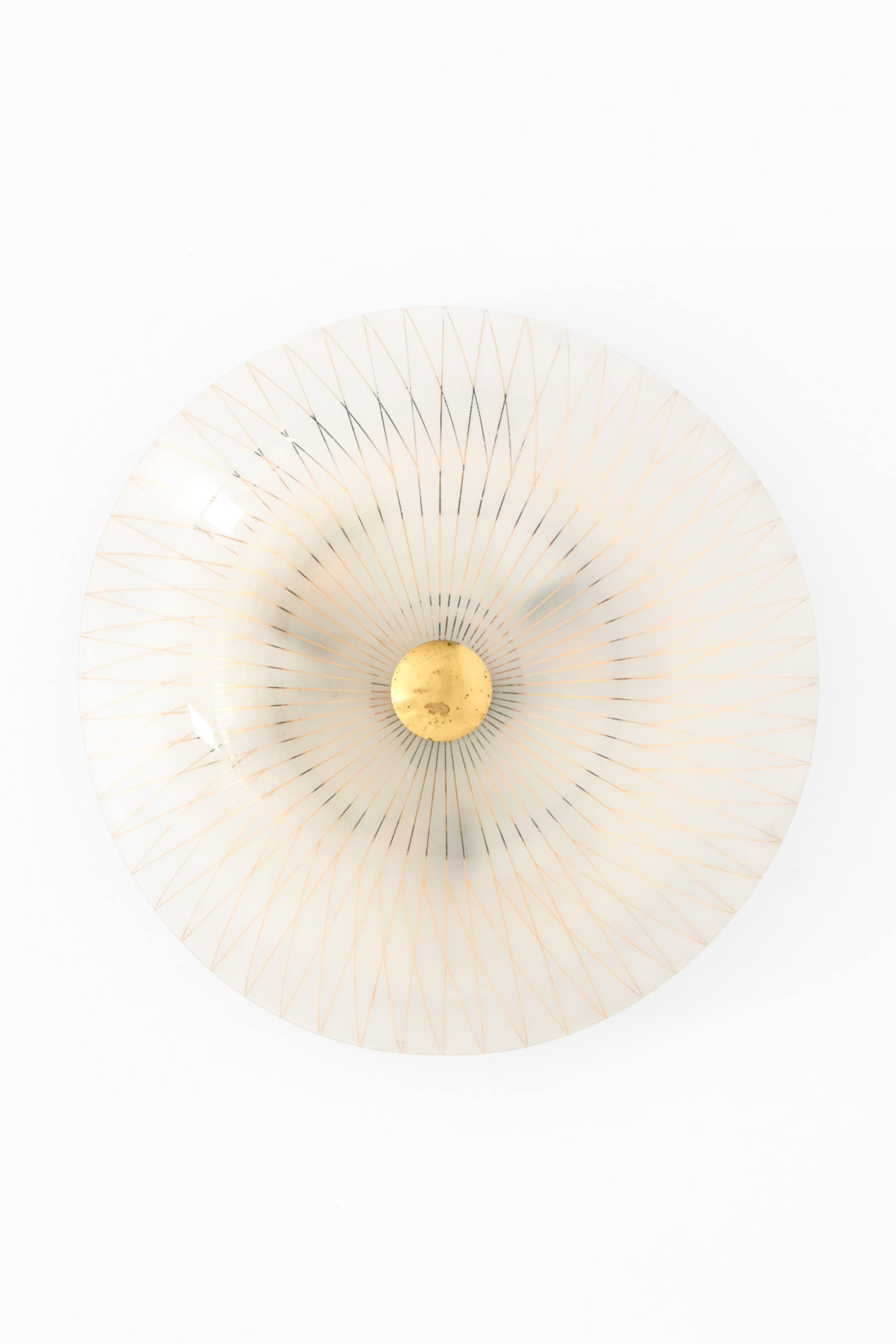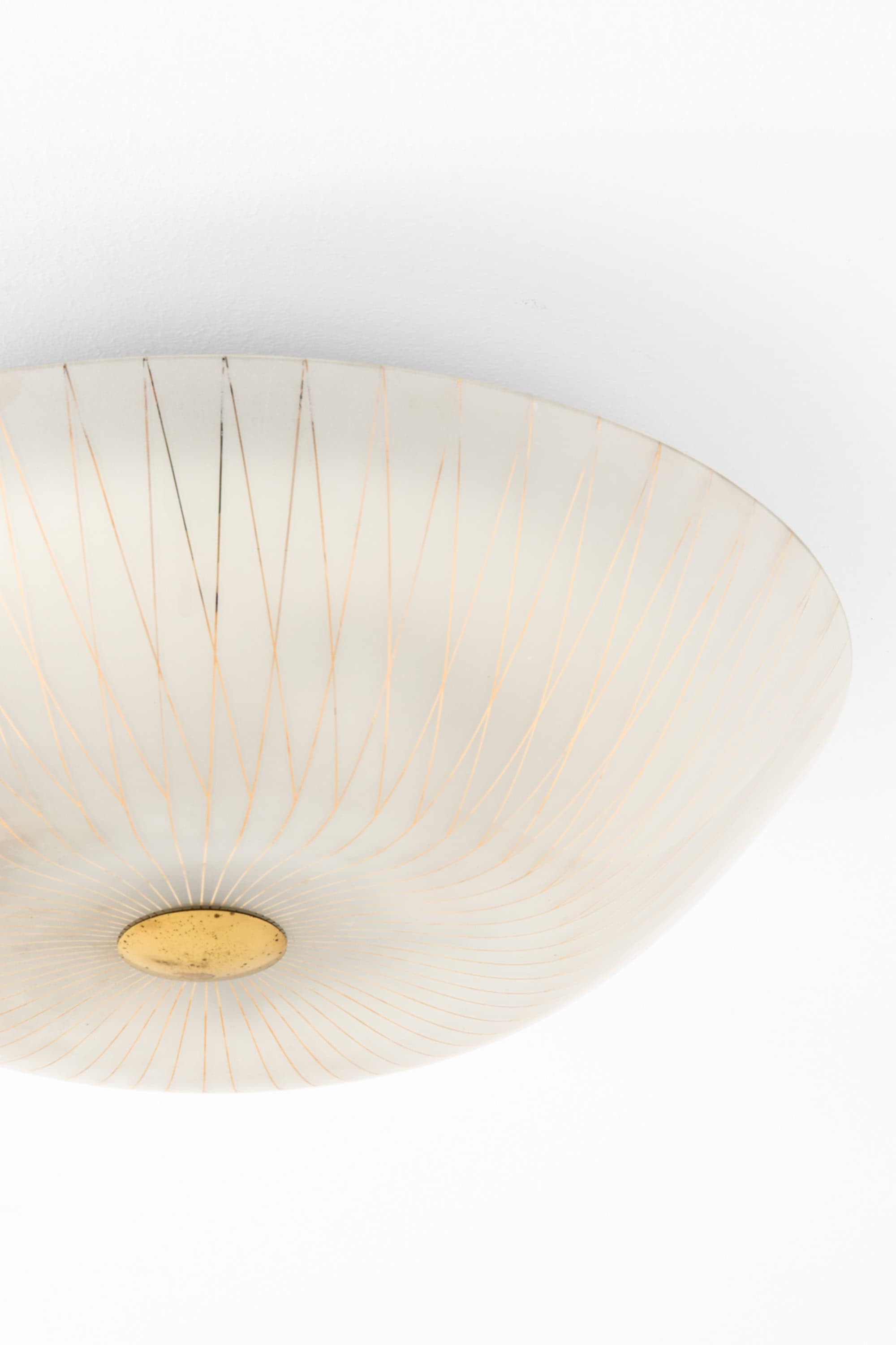 This rare flush mount ceiling lamp, model 71-005, was designed by Lisa Johansson-Pape and produced by Stockmann-Orno in Finland. The lamp consists of a circular glass shade with a slightly domed profile, decorated with fine gold lines radiating in a geometric pattern from the center. The glass is mounted with a central brass fitting, which secures it to the ceiling while adding a warm metallic accent.
