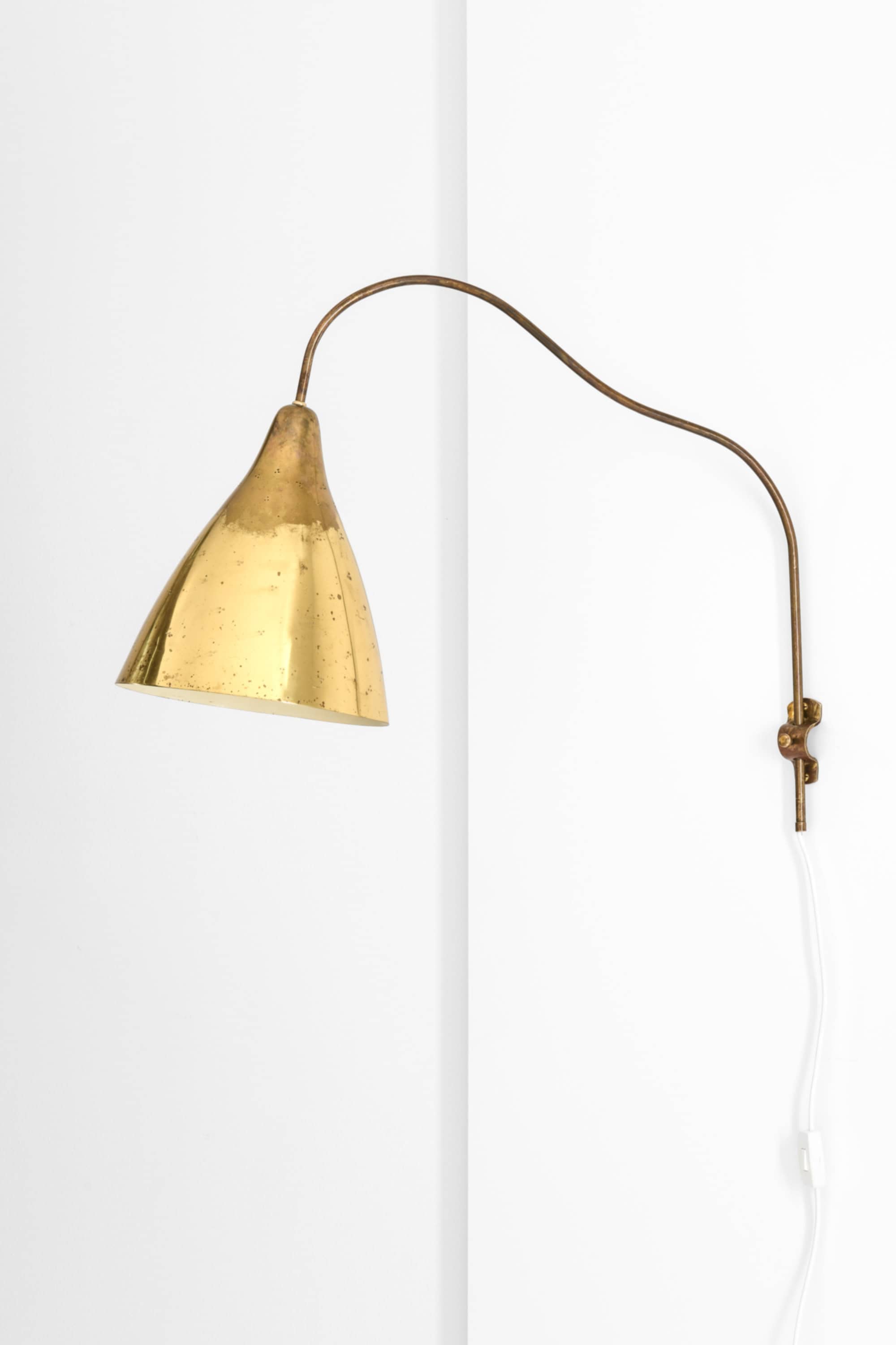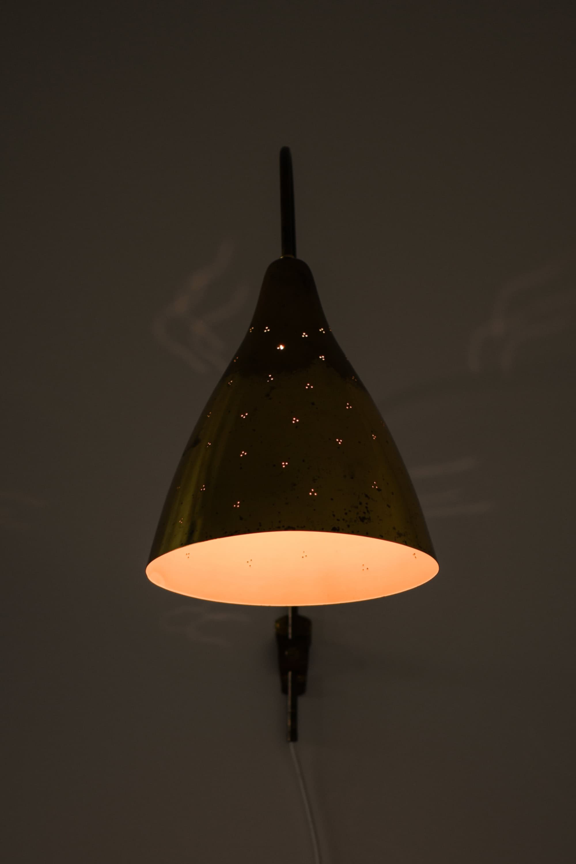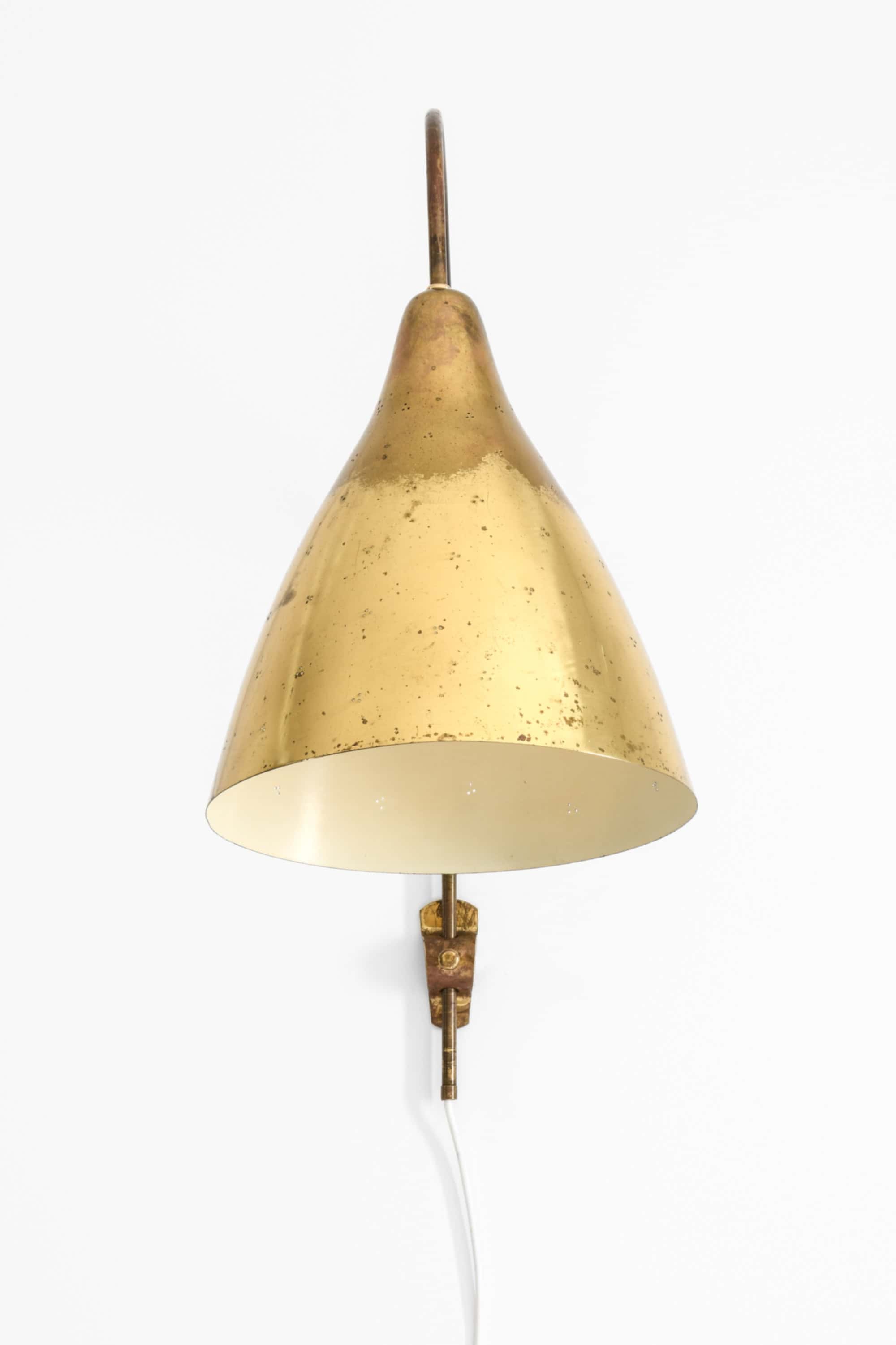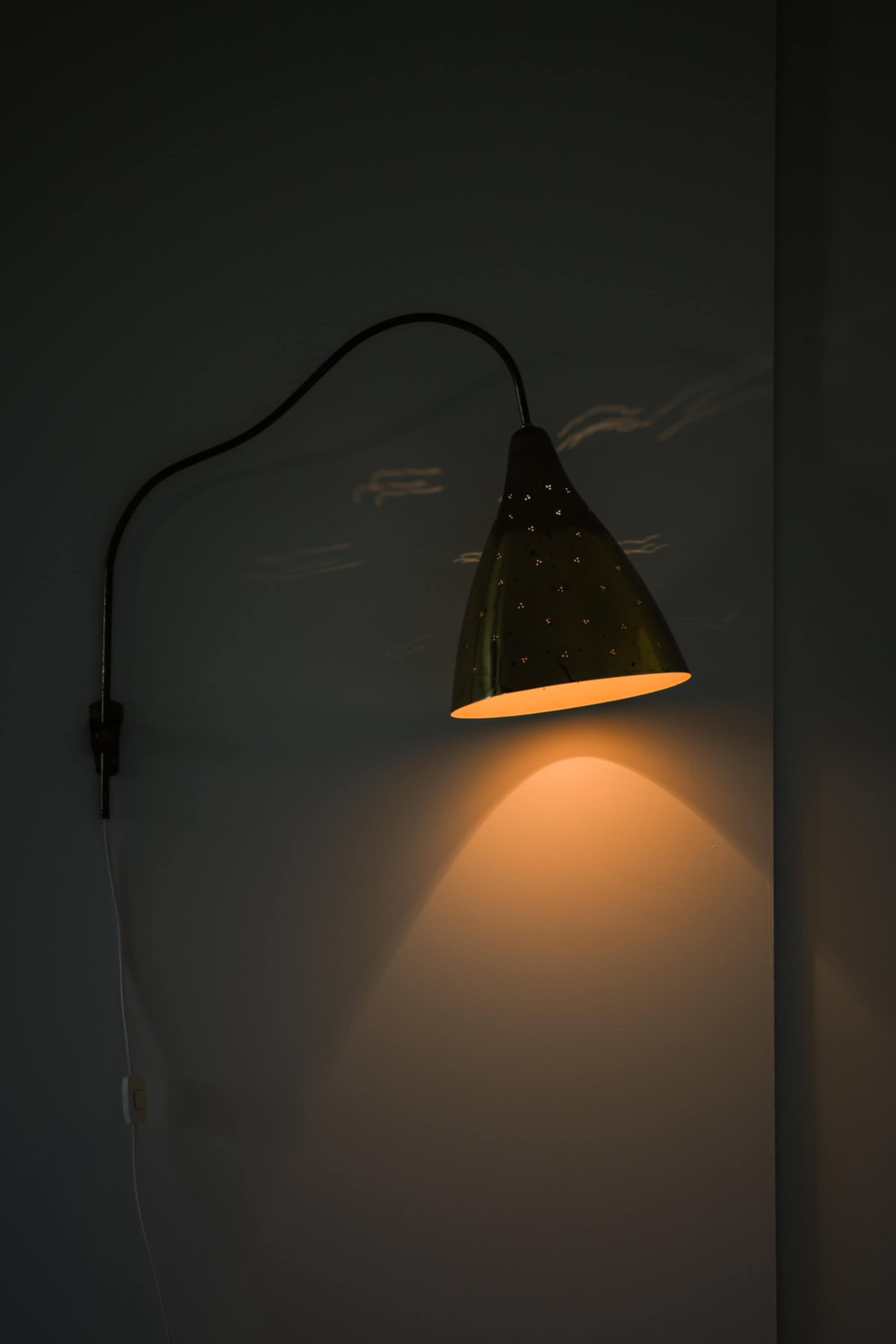 This wall lamp is composed of a brass shade and a slender, curved brass arm mounted on an adjustable vertical rod. The shade has a conical form that widens toward the lower edge, and its surface shows a naturally aged patina with scattered marks and oxidation typical of mid-century brass. The arm features a soft, elongated curve that allows the shade to project into the room while remaining visually light. Small perforations on the shade create a patterned light effect when illuminated.