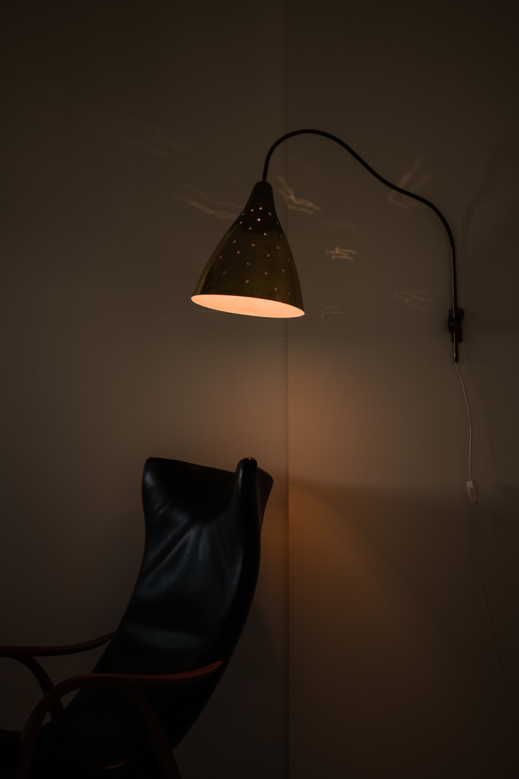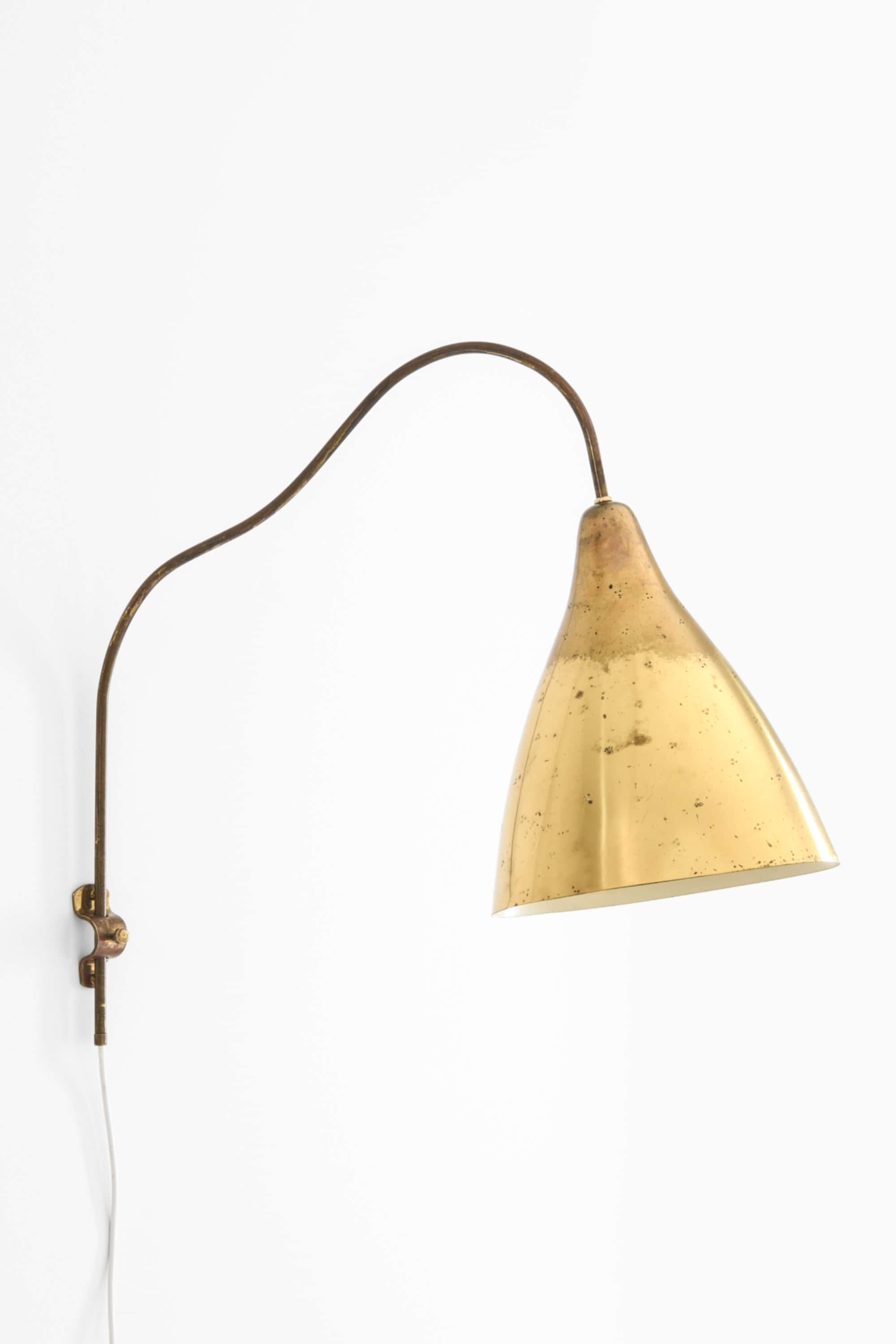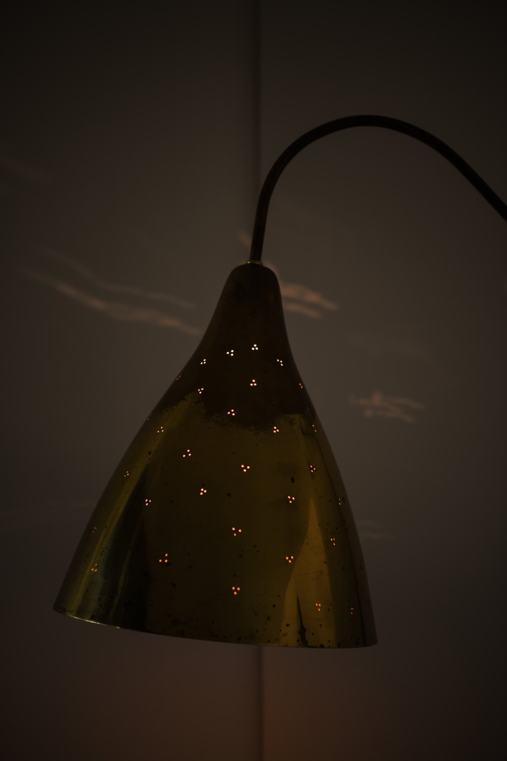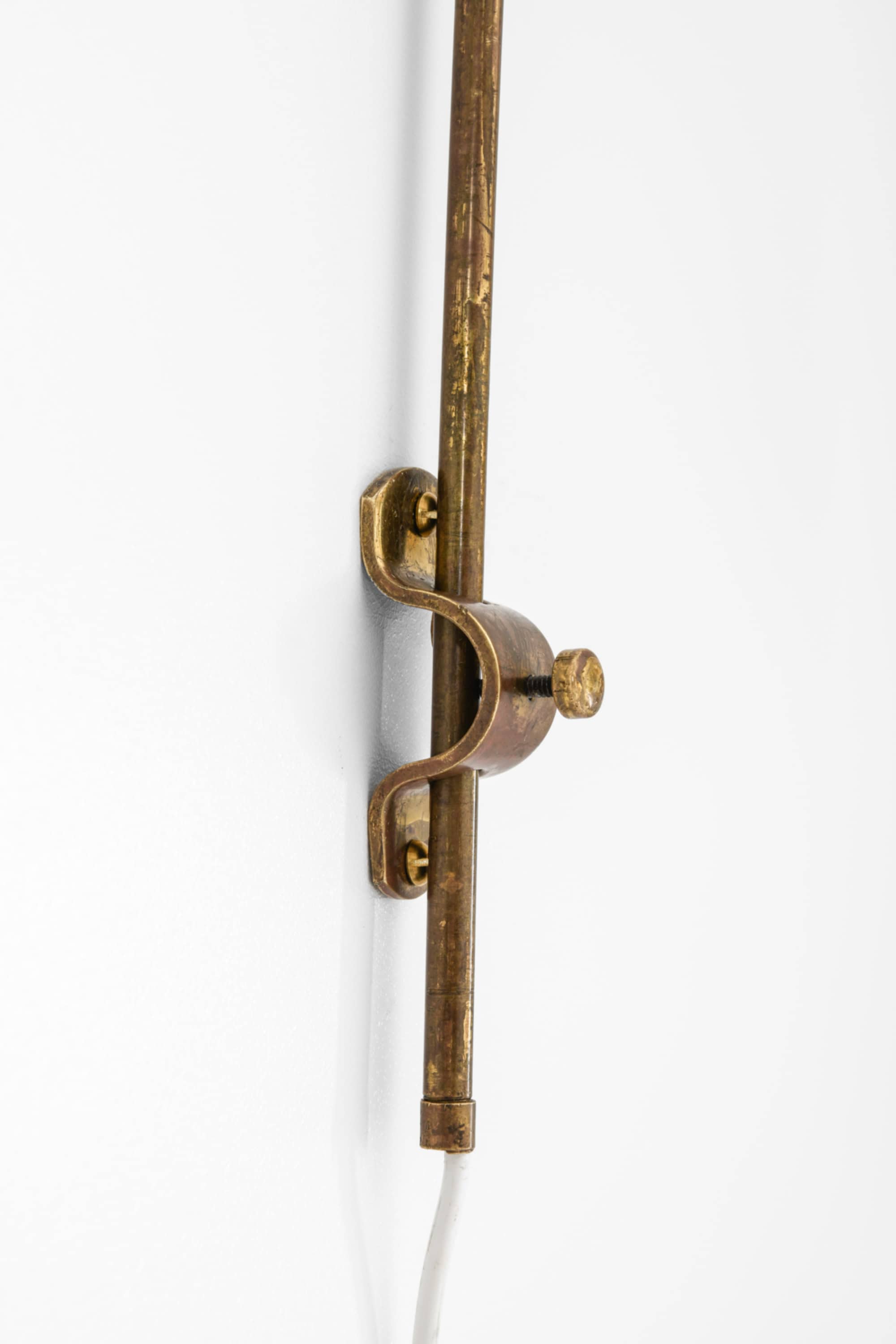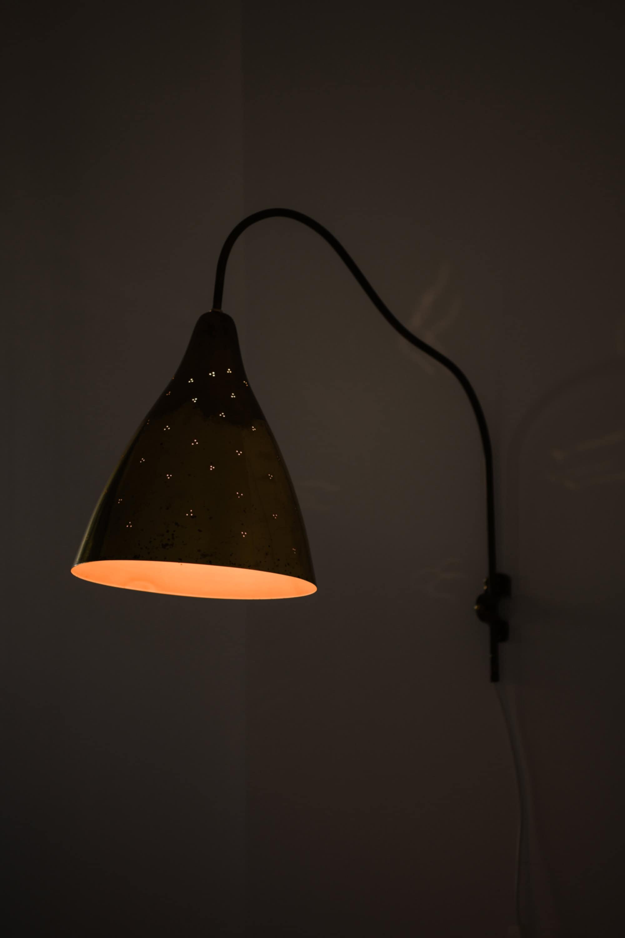 This wall lamp is composed of a brass shade and a slender, curved brass arm mounted on an adjustable vertical rod. The shade has a conical form that widens toward the lower edge, and its surface shows a naturally aged patina with scattered marks and oxidation typical of mid-century brass. The arm features a soft, elongated curve that allows the shade to project into the room while remaining visually light. Small perforations on the shade create a patterned light effect when illuminated.