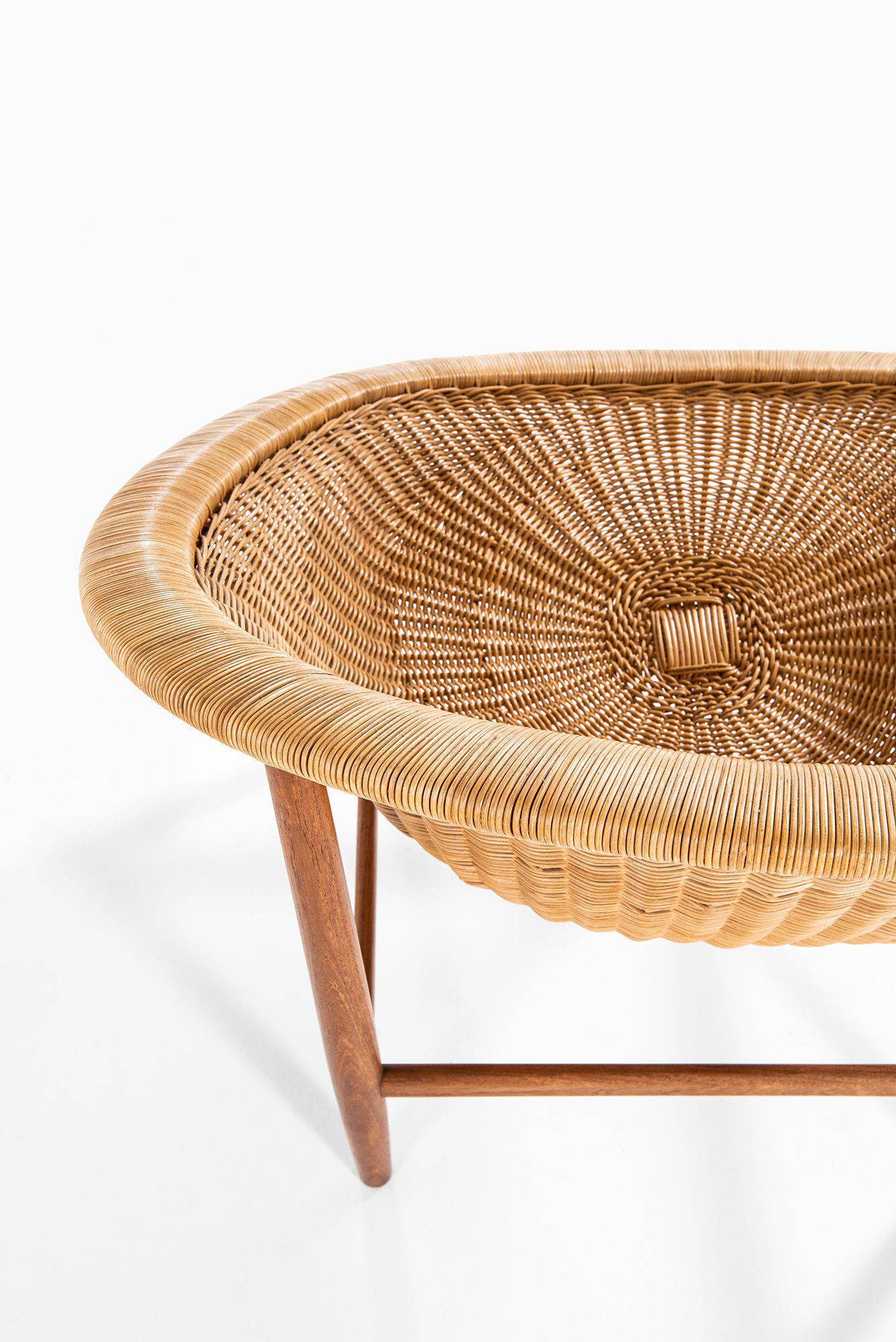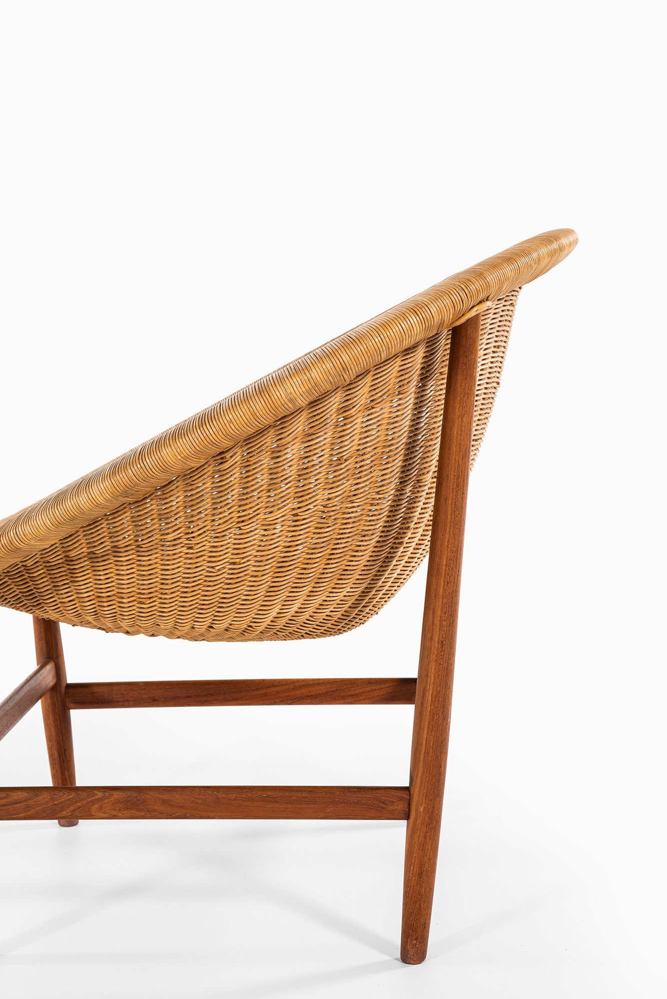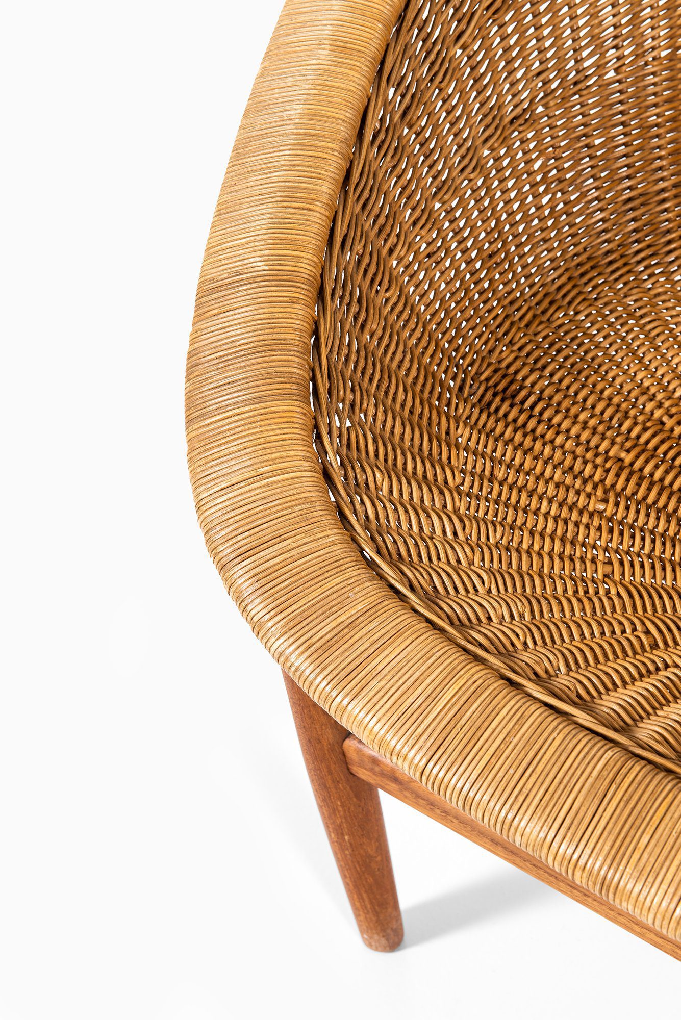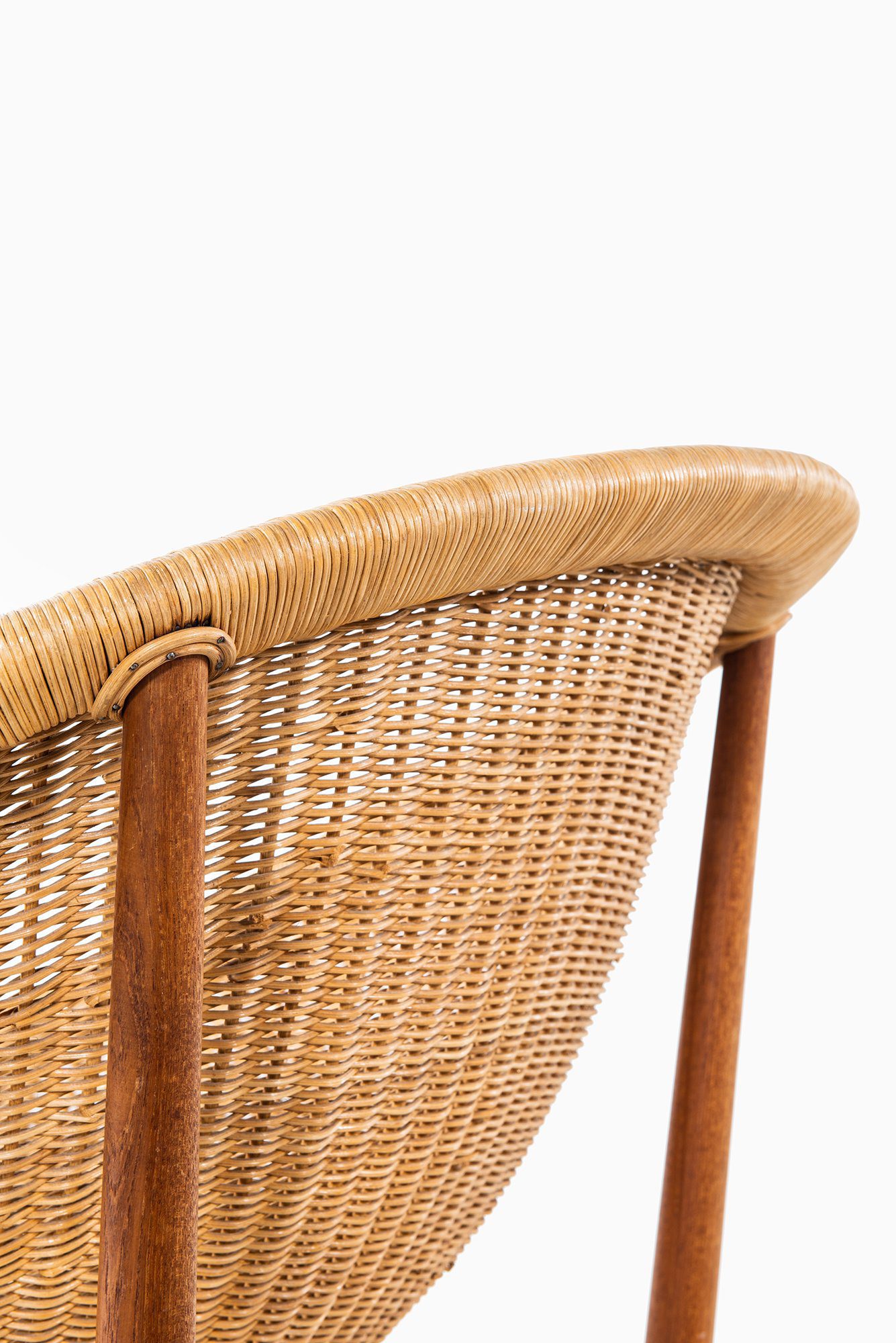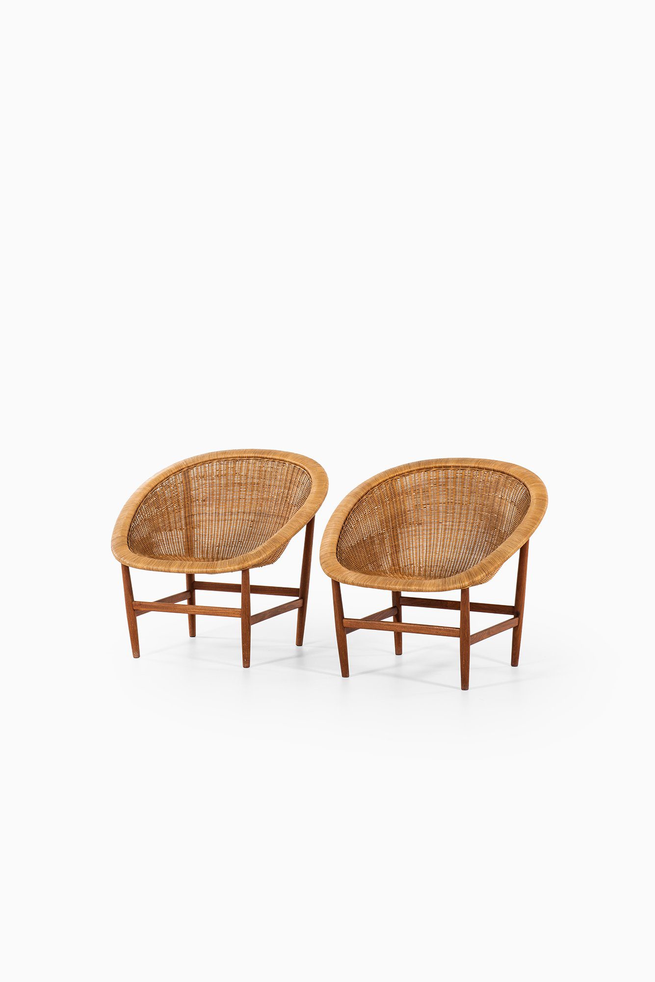 This very rare pair of easy chairs was designed by Nanna & Jørgen Ditzel and produced collaboratively by Ludvig Pontoppidan and R. Wengler in Denmark in 1950. The chairs are composed of solid teak frames supporting handwoven rattan shells that form deep, rounded seats. The circular, bowl-like construction and slightly tilted stance give the chairs a sculptural quality while maintaining comfort and lightness.