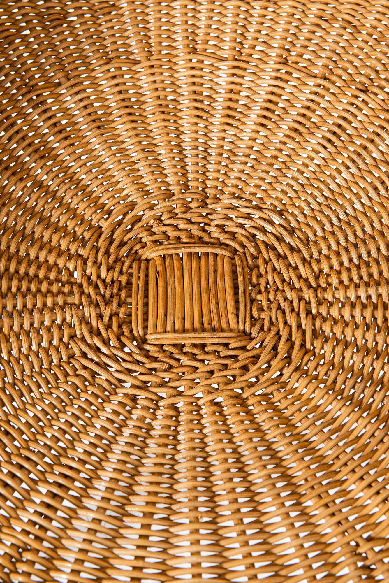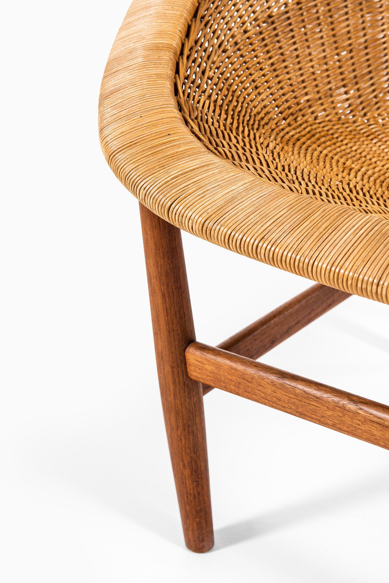 The rattan is tightly and skillfully woven, showing subtle variations in tone that emphasize its natural character. The teak base is elegantly proportioned, with softly rounded legs and structural crossbars that provide stability without compromising the sense of openness. Each chair expresses the Ditzels’ mastery of organic form and material integrity — a hallmark of their work within the Danish modern movement.