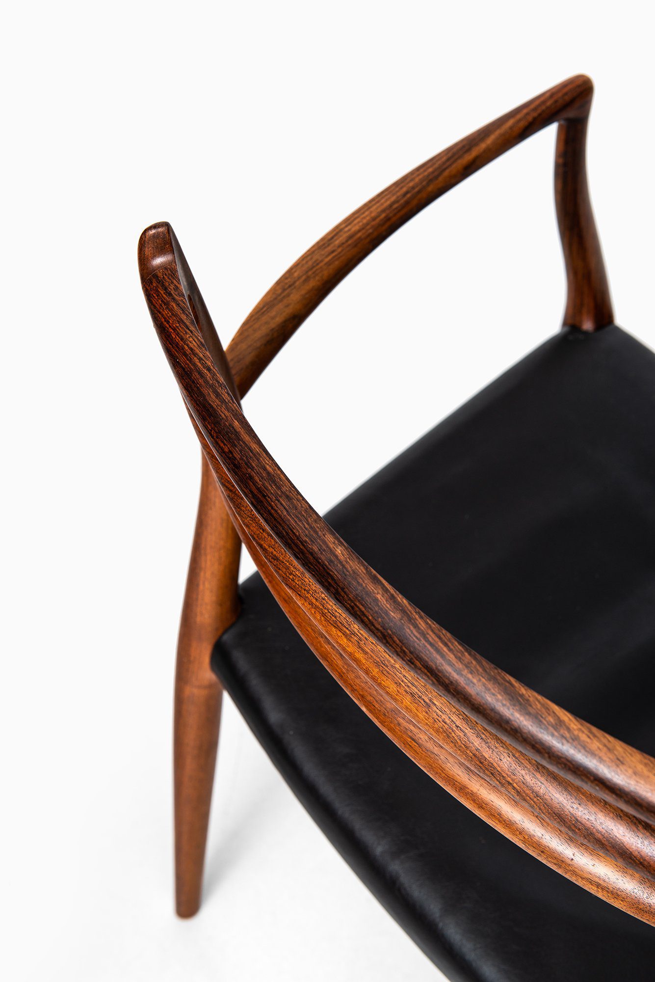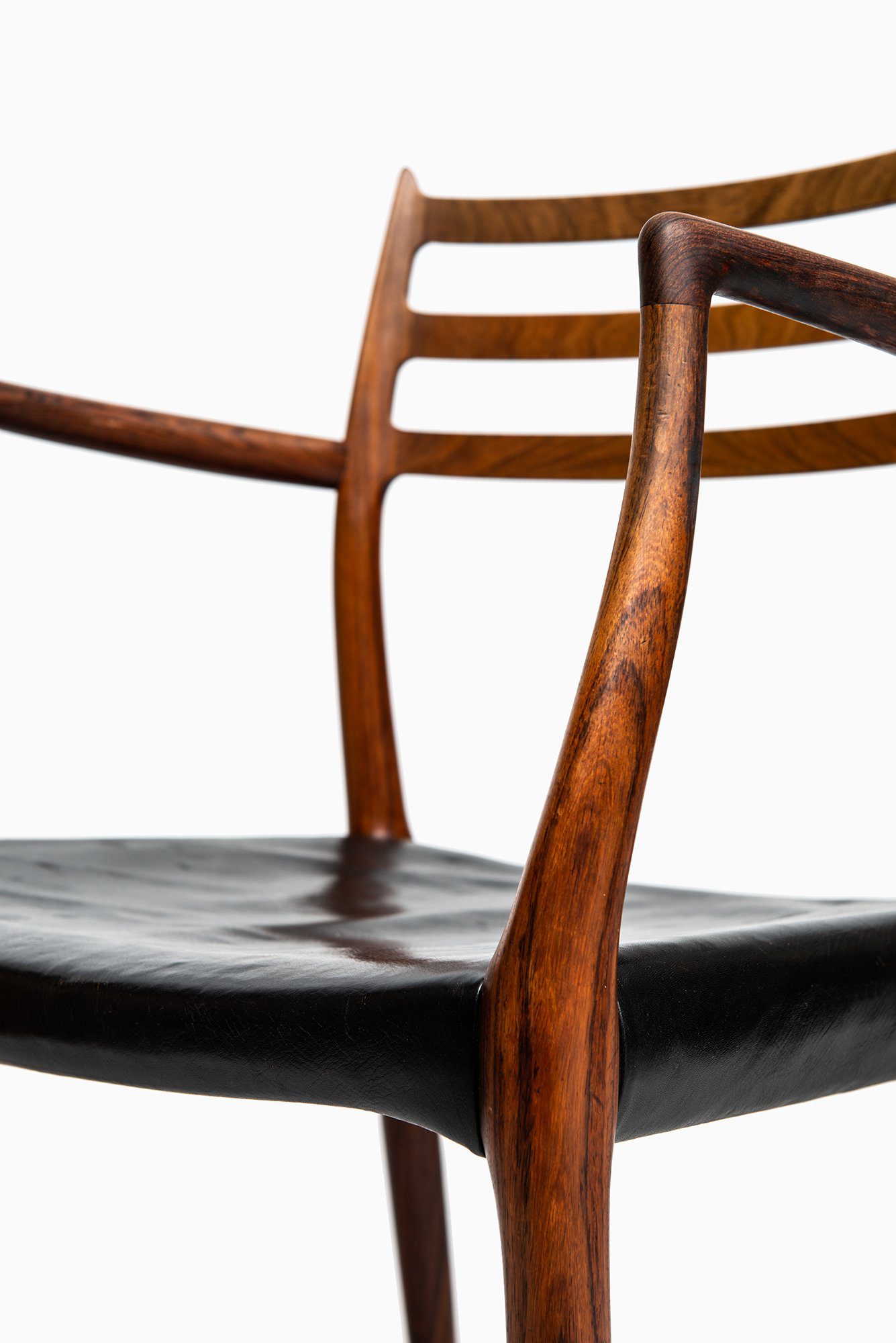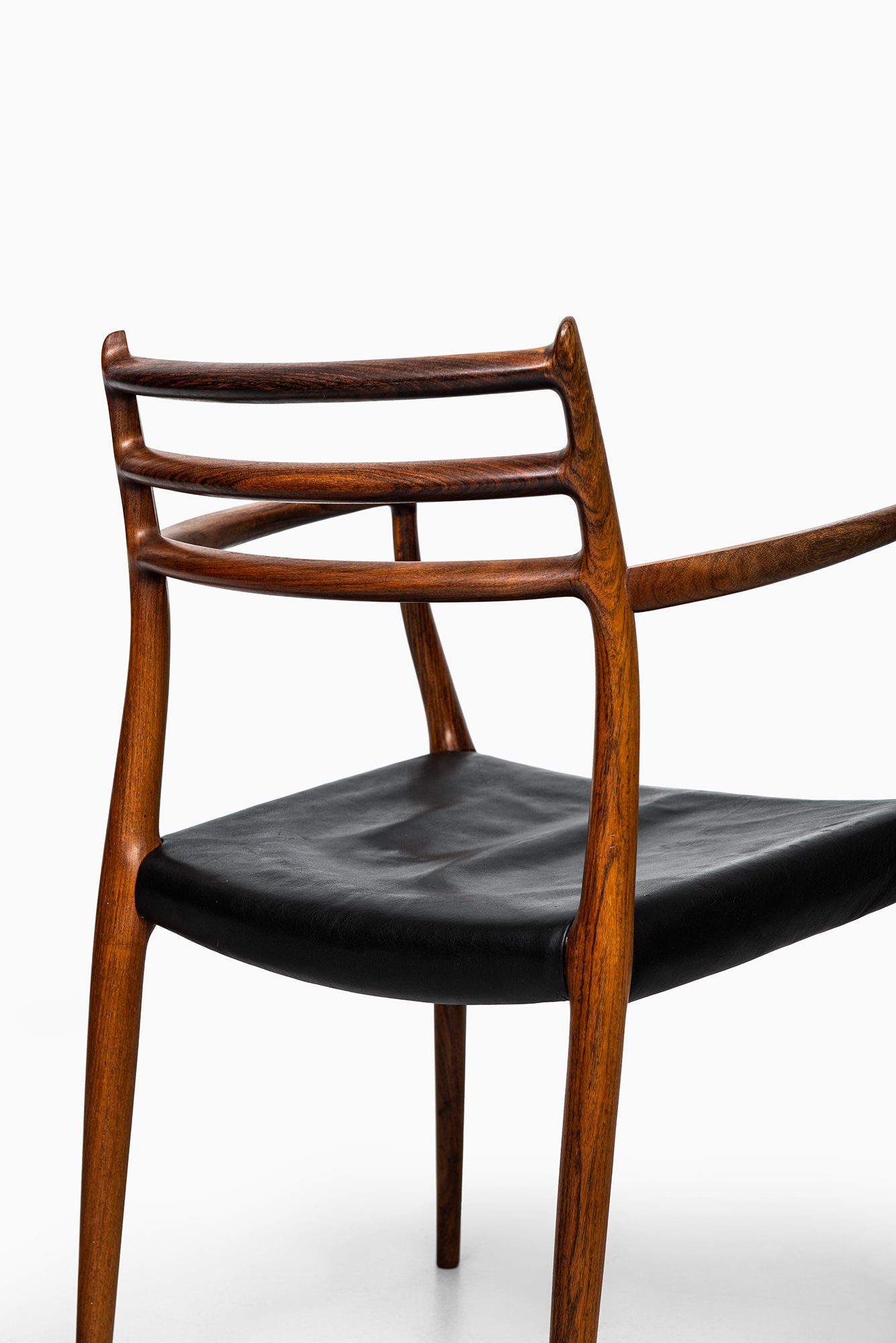 The design is defined by its sculptural frame and fluid lines, where the armrests and backrest merge seamlessly into the structure. The three horizontal back rails create a light, airy appearance while maintaining ergonomic support. The subtle curvature of the frame and the precision of the joinery highlight the meticulous hand-finishing for which Møller’s workshop became renowned. The original black leather seat complements the deep reddish-brown tone and expressive grain of the rosewood, emphasizing both comfort and material richness.
