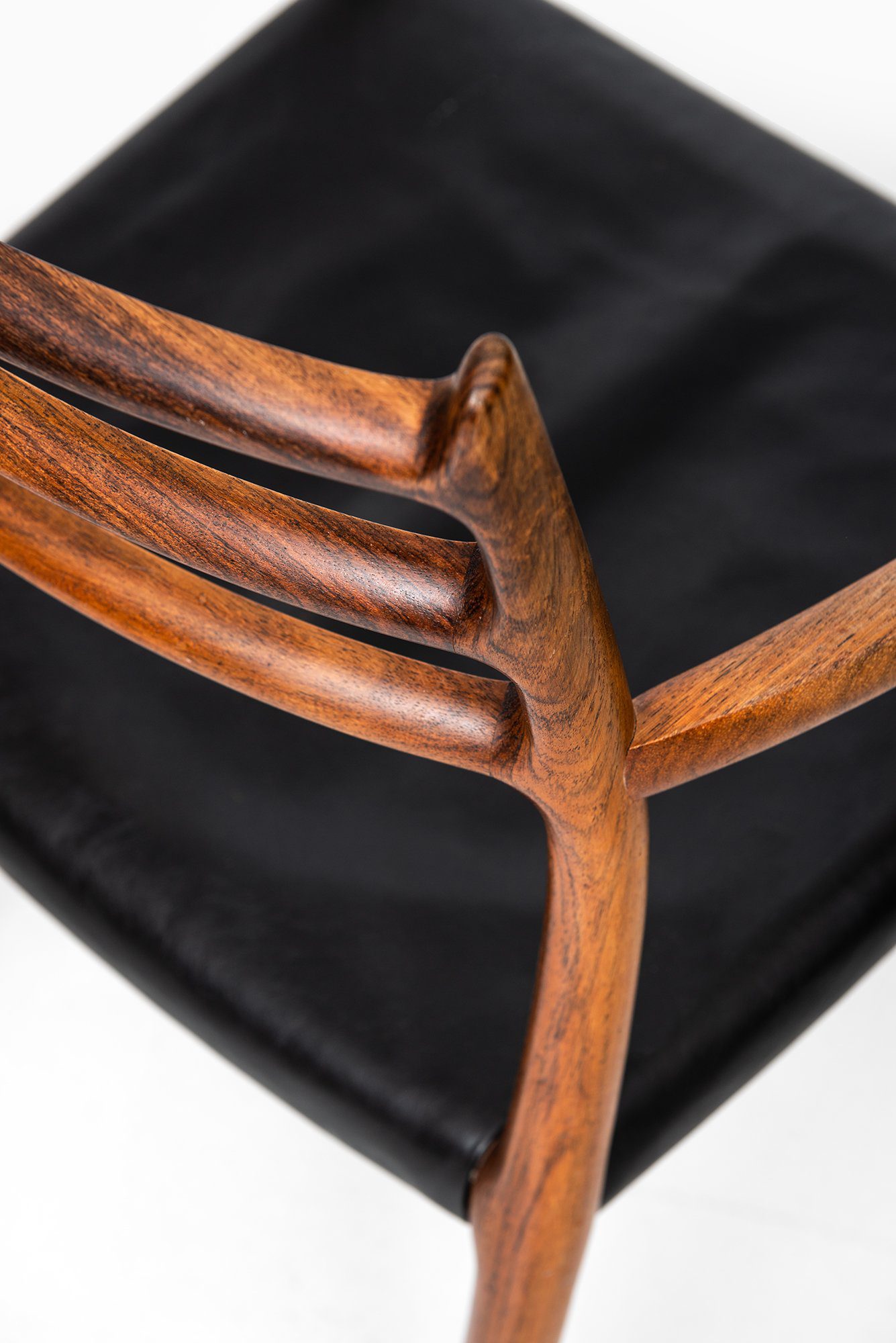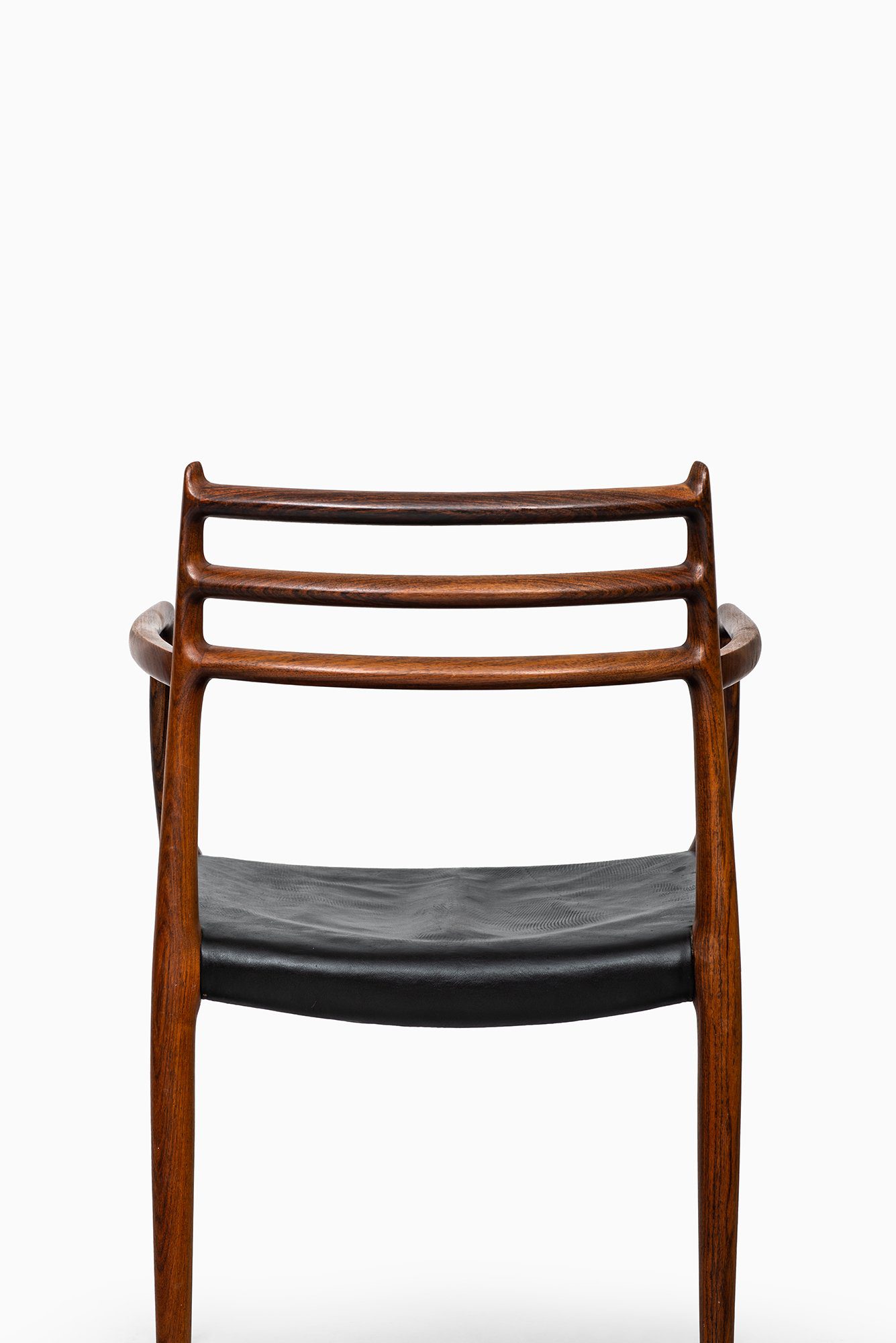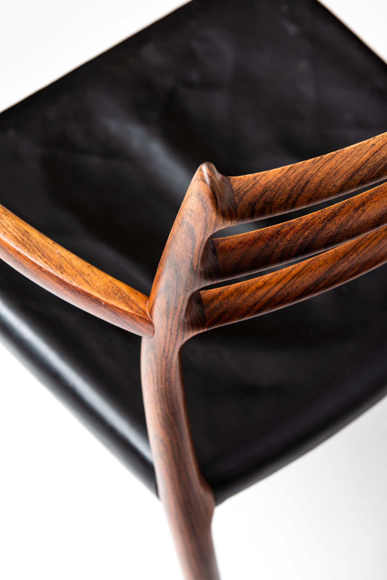 The design is defined by its sculptural frame and fluid lines, where the armrests and backrest merge seamlessly into the structure. The three horizontal back rails create a light, airy appearance while maintaining ergonomic support. The subtle curvature of the frame and the precision of the joinery highlight the meticulous hand-finishing for which Møller’s workshop became renowned. The original black leather seat complements the deep reddish-brown tone and expressive grain of the rosewood, emphasizing both comfort and material richness.