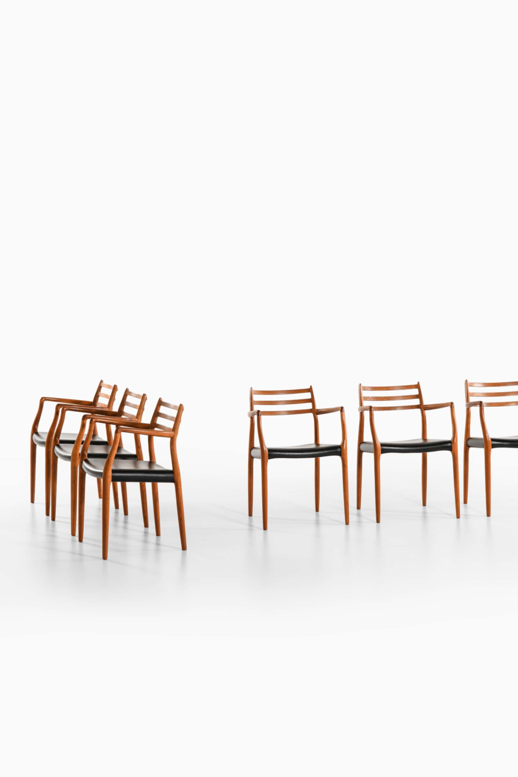 This rare set of six armchairs, model 62, was designed by Niels O. Møller and produced by J.L. Møllers Møbelfabrik in Denmark. Designed in 1962, the model reflects Møller’s refined approach to Danish modernism, characterized by sculptural shaping, seamless joinery, and a focus on tactile materials. Each chair is crafted in teak, a wood valued for its warm tone, dense structure, and ability to be shaped into fluid, organic forms.
