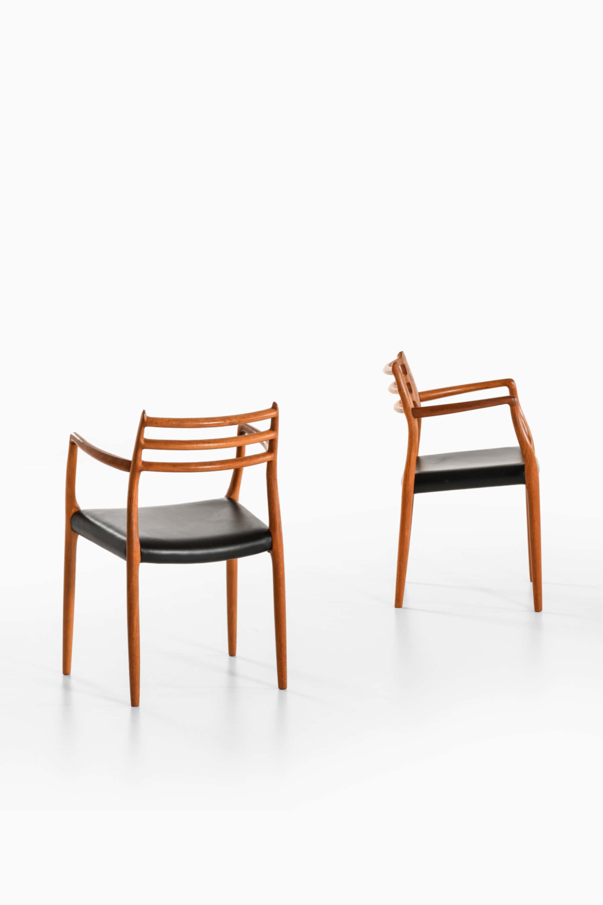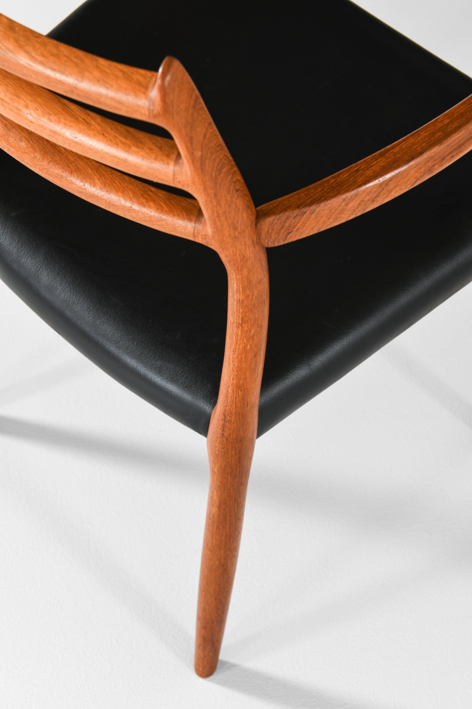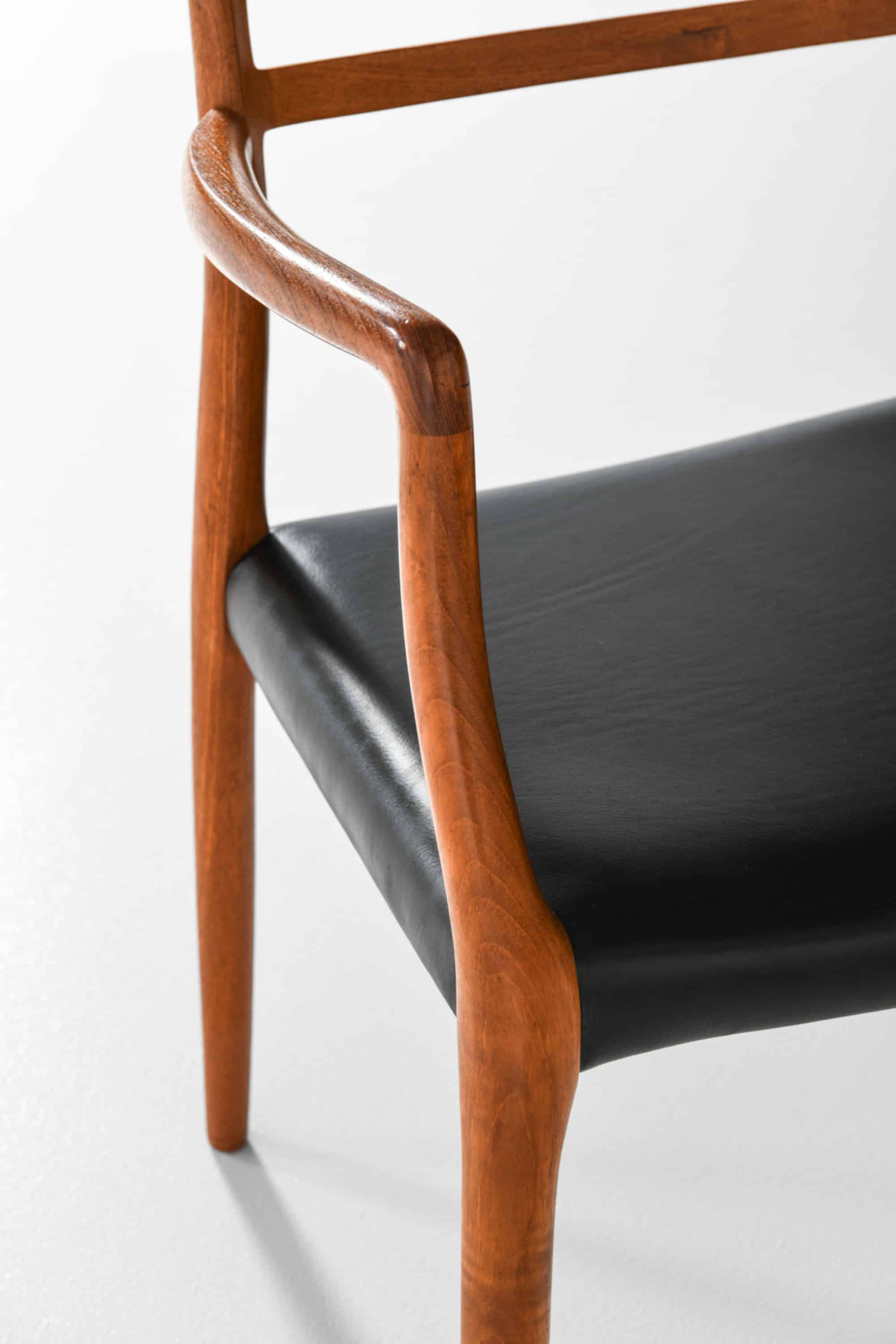 The frames display gently curved posts and armrests that transition smoothly into one another, demonstrating the high level of craftsmanship associated with Møller’s workshop. The backrest consists of three horizontal rails, each slightly rounded and tapering at the ends, creating a visually light structure that still offers firm support. The rear legs rise as continuous vertical lines, subtly angled to align with the posture of the seated body.