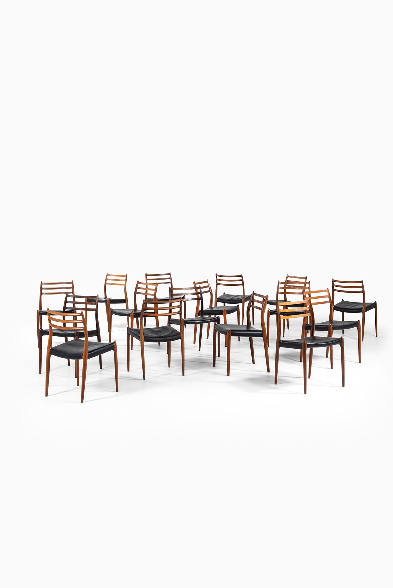 This rare set of sixteen dining chairs, model 78, was designed by Niels O. Møller in 1962 and produced by J.L. Møllers Møbelfabrik in Denmark. The design is one of Møller’s most refined and enduring creations, representing the peak of Danish Modern craftsmanship and organic minimalism. Known for his dedication to detail and uncompromising quality, Møller produced furniture that exemplifies the unity of structure, comfort, and material beauty.