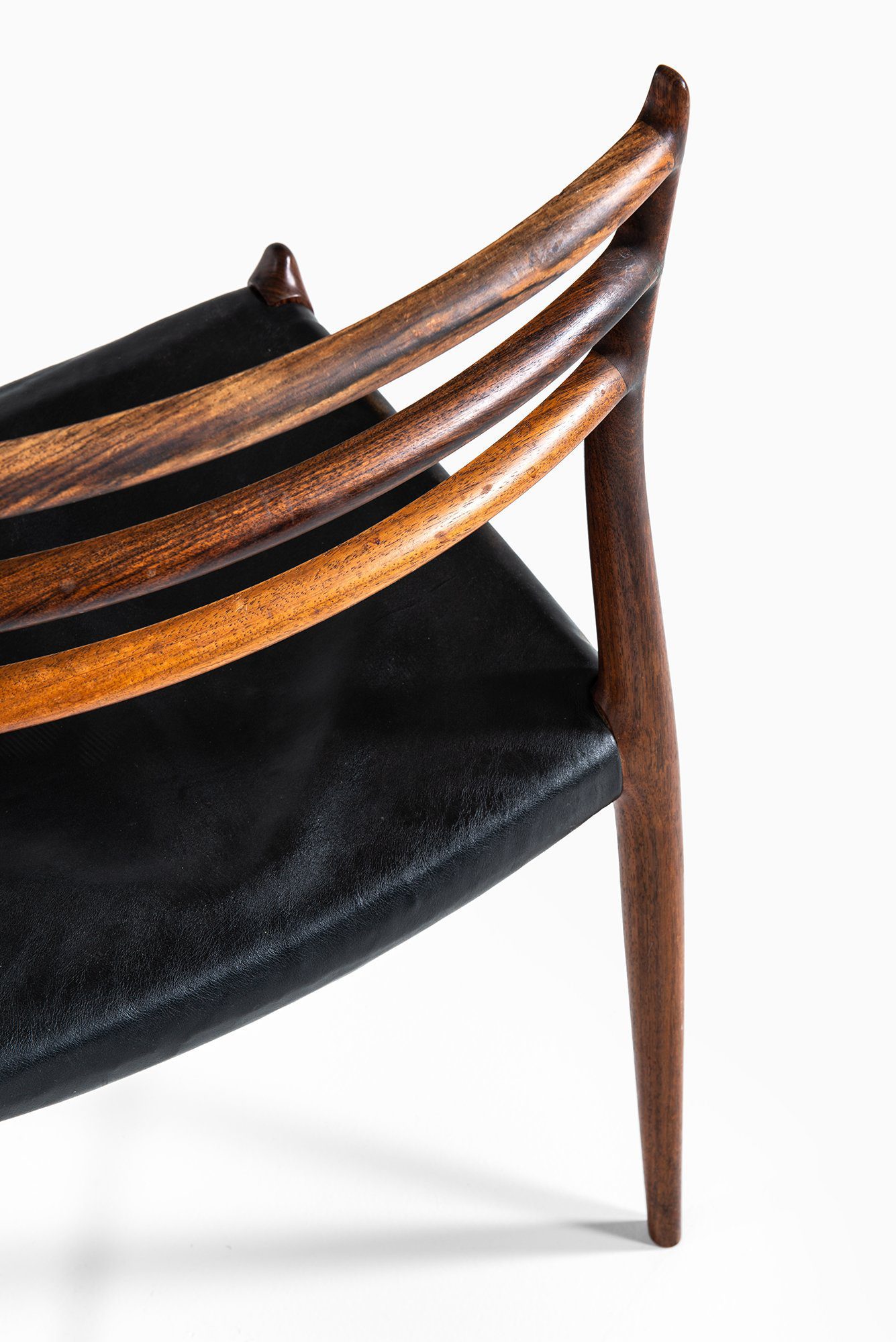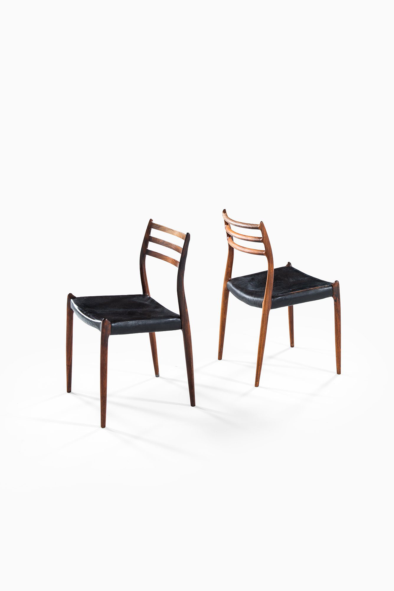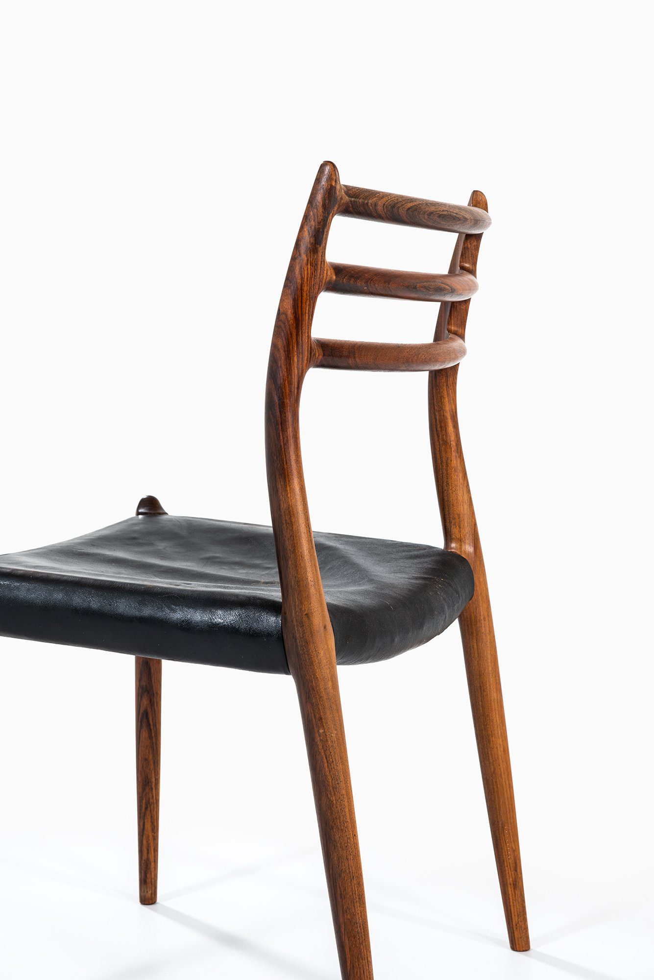 Each chair is crafted from solid rosewood, exhibiting rich and varied grain patterns with deep brown and reddish tones characteristic of the species. The frame is sculpturally composed with softly tapered legs and a seamless, flowing connection between the backrest and seat frame. The ladder-style backrest with three horizontal rails provides both ergonomic support and visual lightness. The seats retain their original black leather upholstery, now beautifully patinated and supple, complementing the warmth of the rosewood.