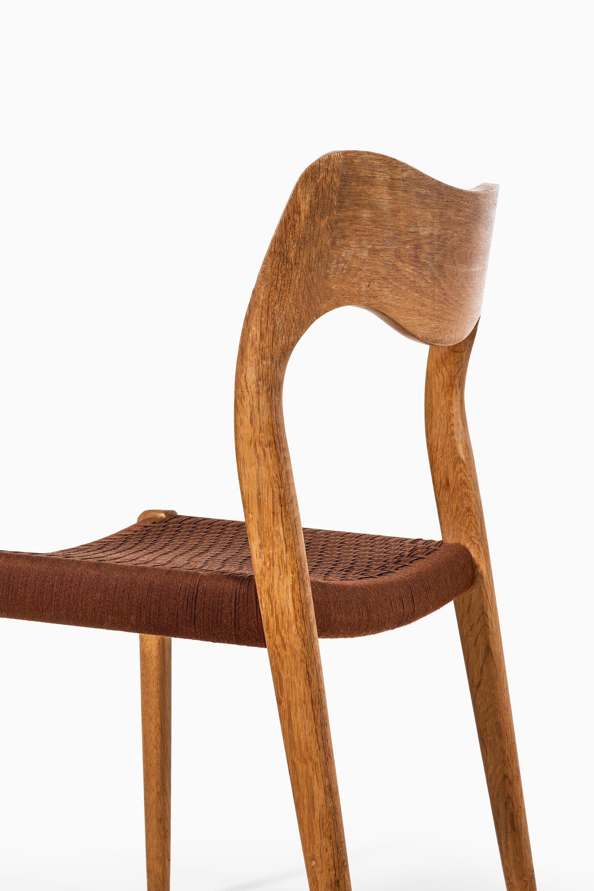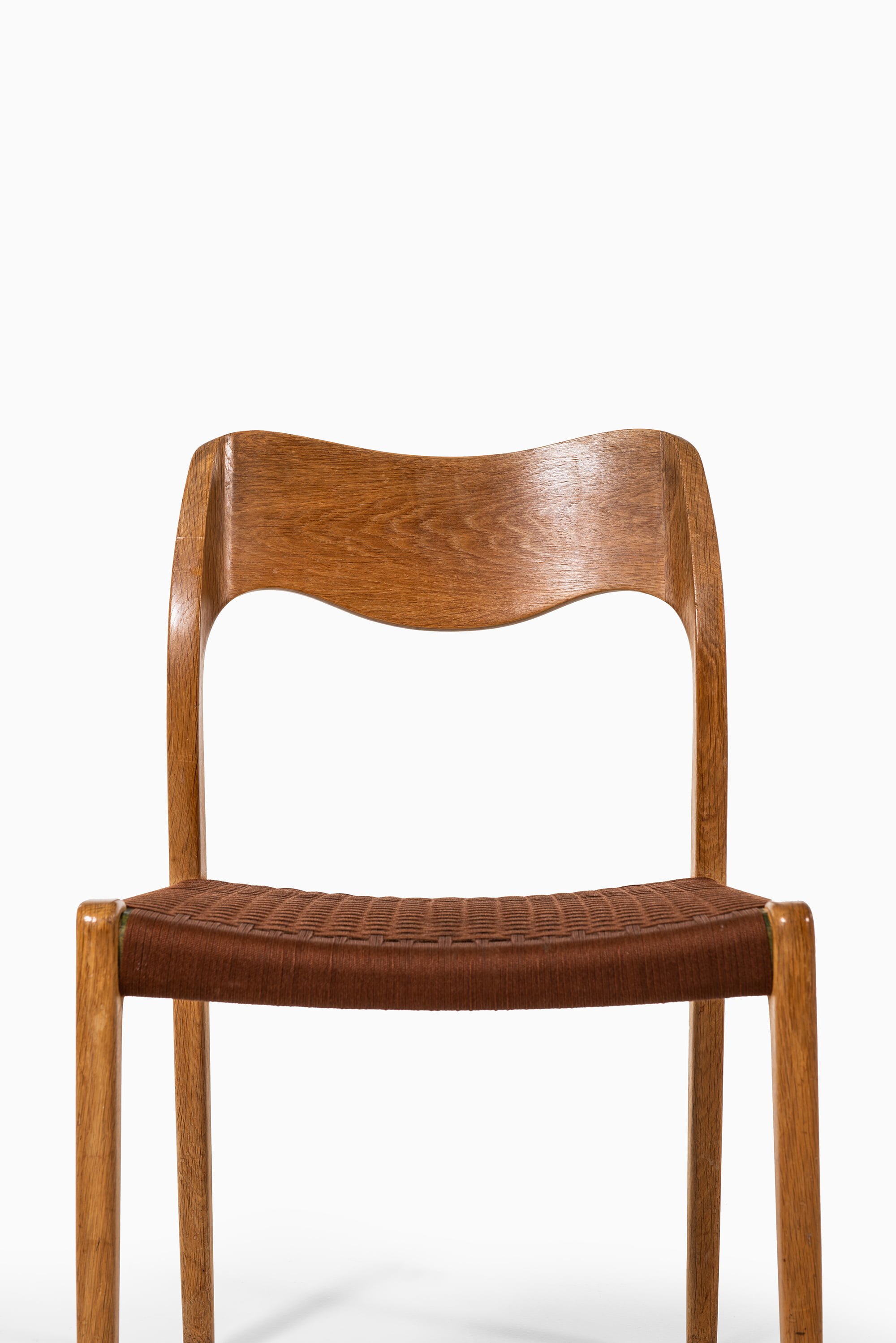 This set of six dining chairs, model 71, was designed by Niels O. Møller and produced by J.L. Møllers Møbelfabrik in Denmark. The chairs are made of solid oak with handwoven brown cotton cord seats. Their design reflects the functional elegance and fine craftsmanship characteristic of Danish modern furniture from the mid-twentieth century. The curved backrest and precisely joined frame demonstrate Møller’s mastery in creating pieces that are both sculptural and ergonomic.