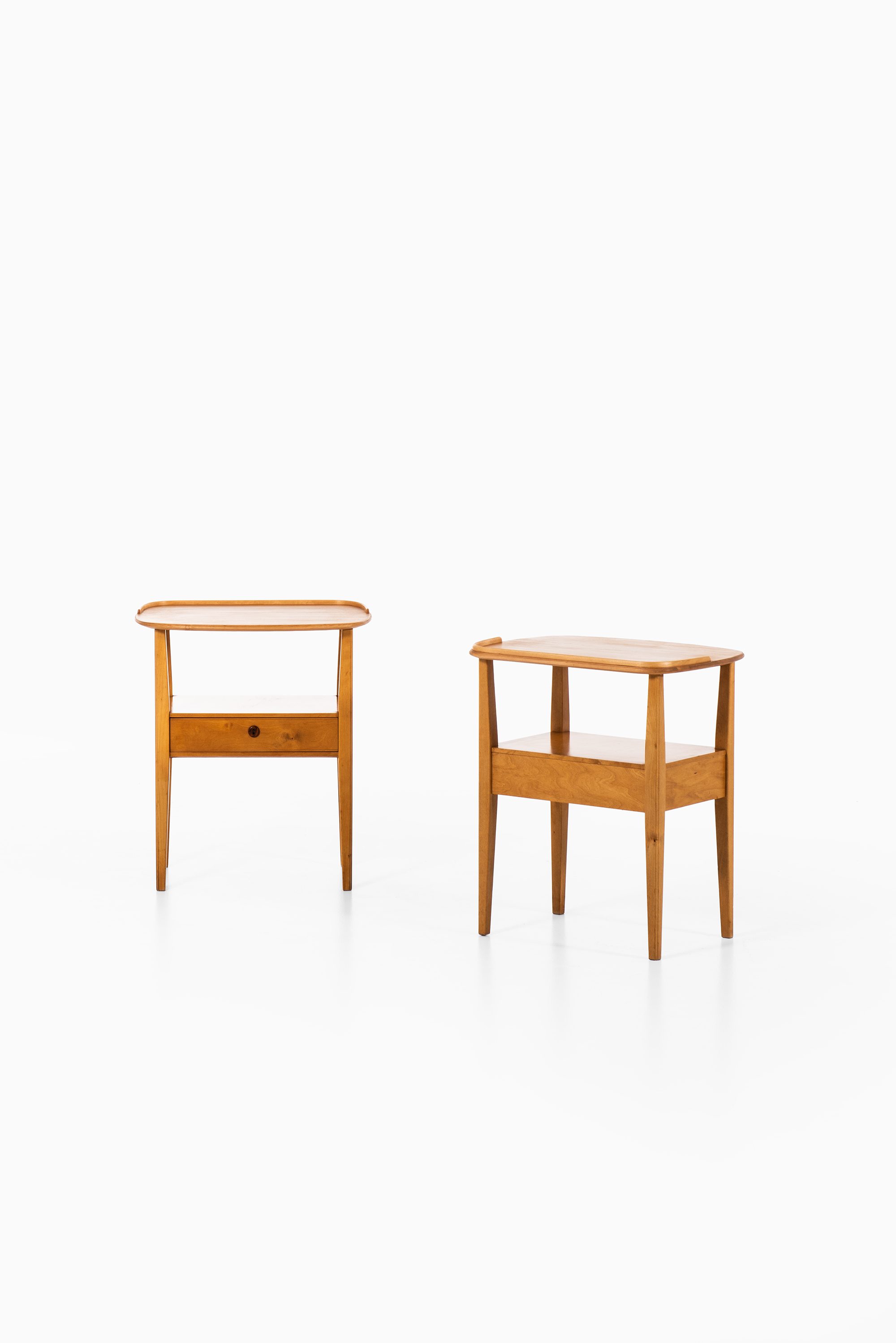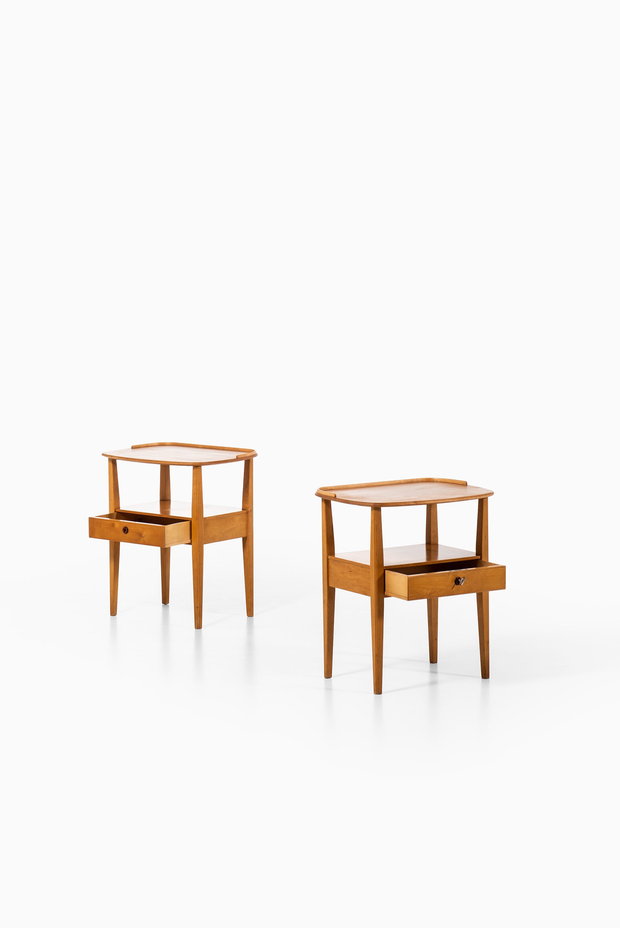 This pair of bedside or side tables was produced by NK, Nordiska Kompaniet, in Sweden during the 1950s. The tables are crafted in ash, a wood known for its light tone and straight grain, giving the pieces a warm golden hue with a subtle texture. The surfaces display a softly rounded rectangular form with slightly raised back edges, a detail that emphasizes the Scandinavian sensitivity to functional yet understated ornamentation. The legs are tapered and slightly splayed, contributing to a light and elegant silhouette.