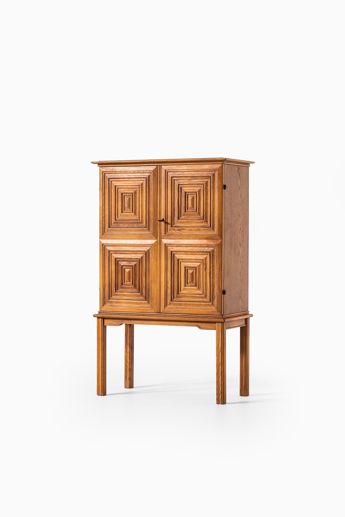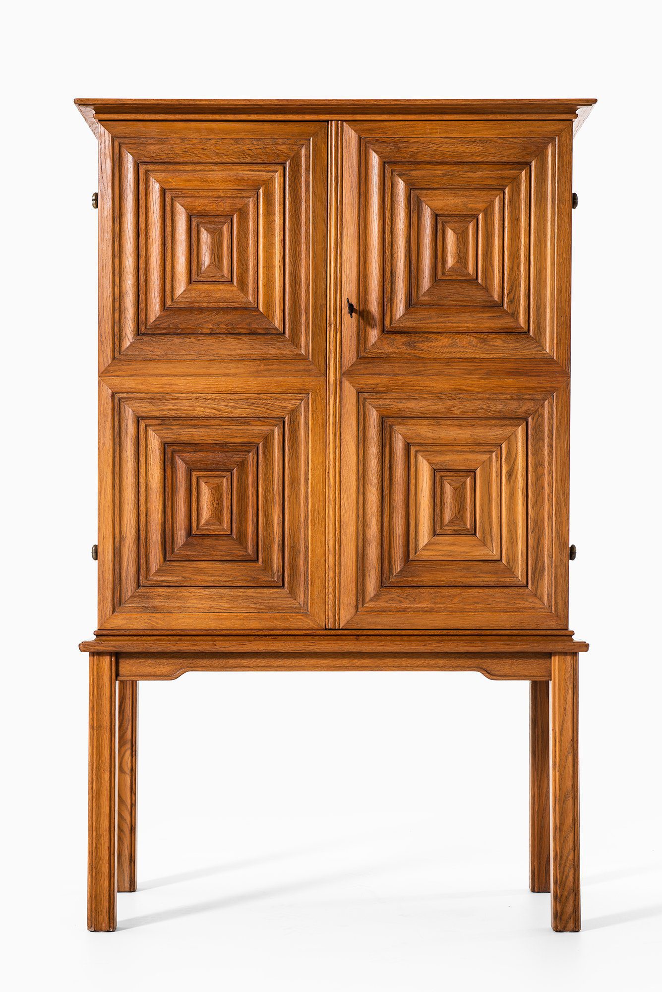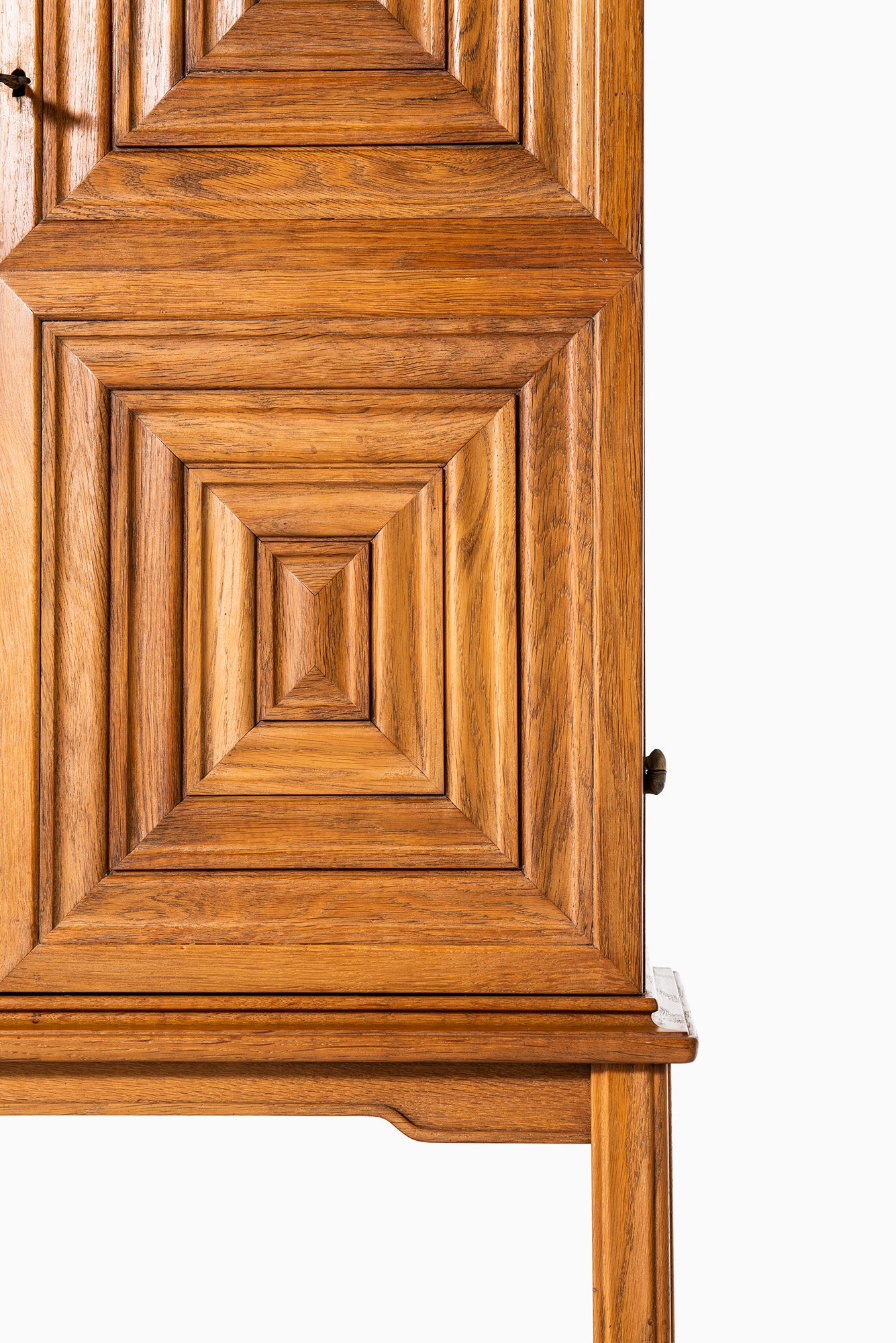 Very rare cabinet designed by Oscar Nilsson and produced in Sweden during the 1940s. Executed in solid oak with brass details, the cabinet demonstrates the refined geometric craftsmanship typical of Swedish furniture of the period. The front features intricately paneled doors, each composed of deeply recessed, concentric squares that create a strong architectural rhythm and sense of depth. The symmetrical relief pattern highlights the precision of the joinery and the natural grain variation of the oak.