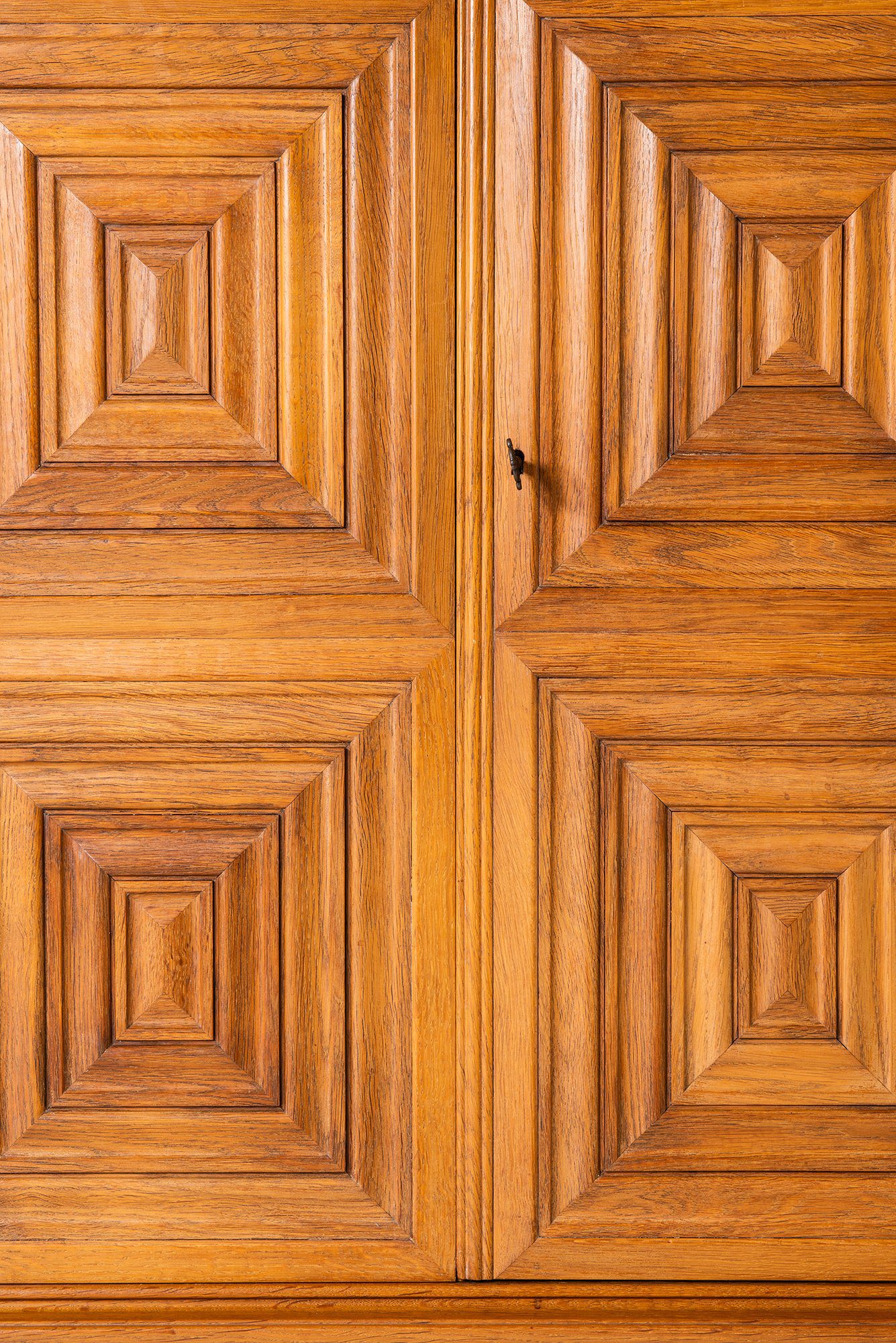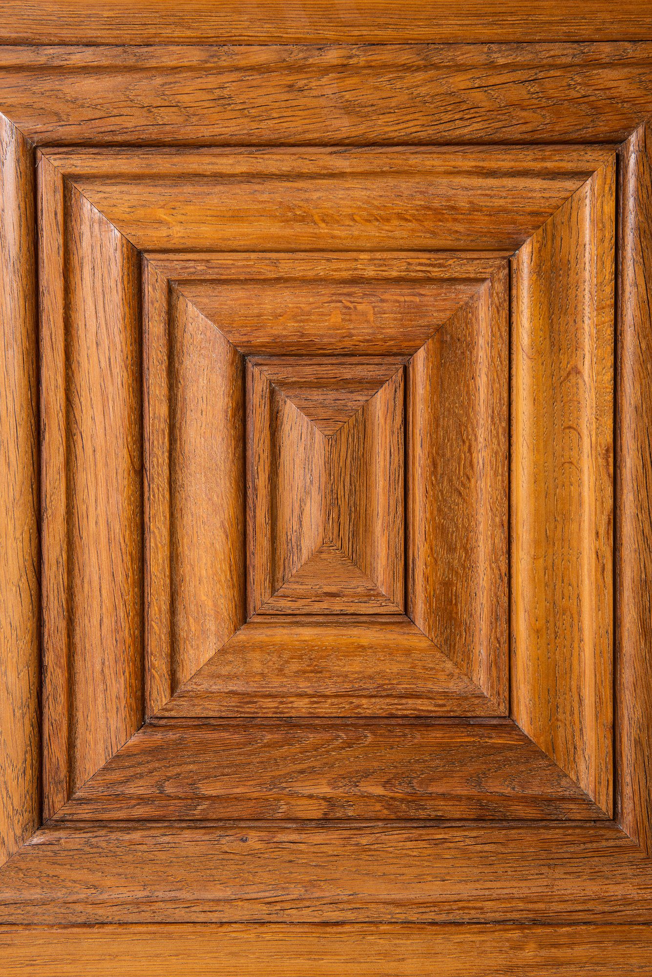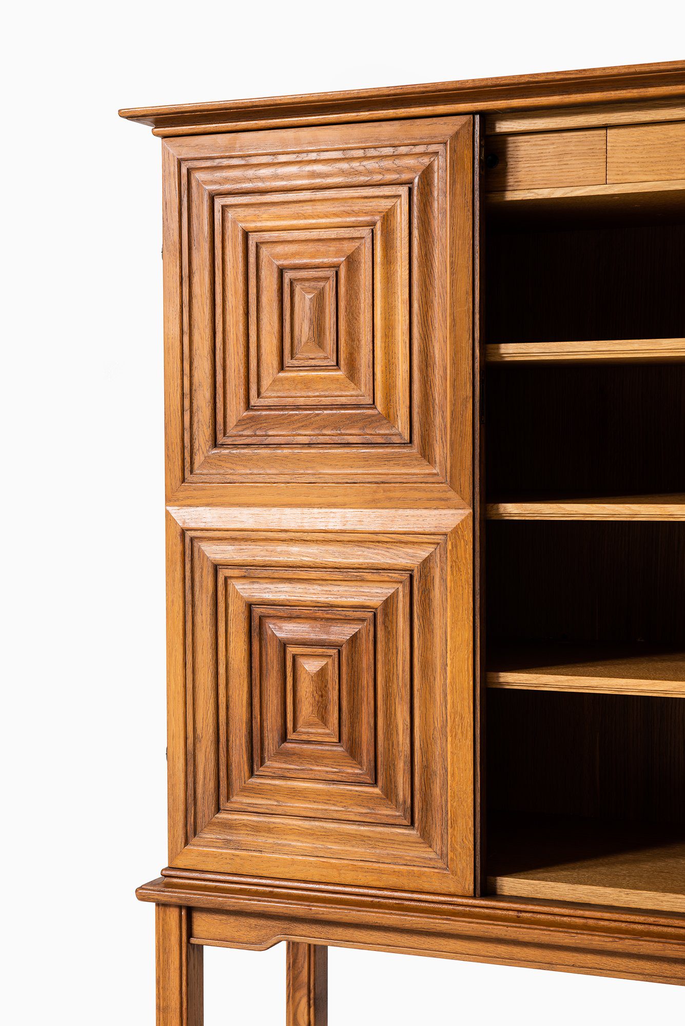 Very rare cabinet designed by Oscar Nilsson and produced in Sweden during the 1940s. Executed in solid oak with brass details, the cabinet demonstrates the refined geometric craftsmanship typical of Swedish furniture of the period. The front features intricately paneled doors, each composed of deeply recessed, concentric squares that create a strong architectural rhythm and sense of depth. The symmetrical relief pattern highlights the precision of the joinery and the natural grain variation of the oak.